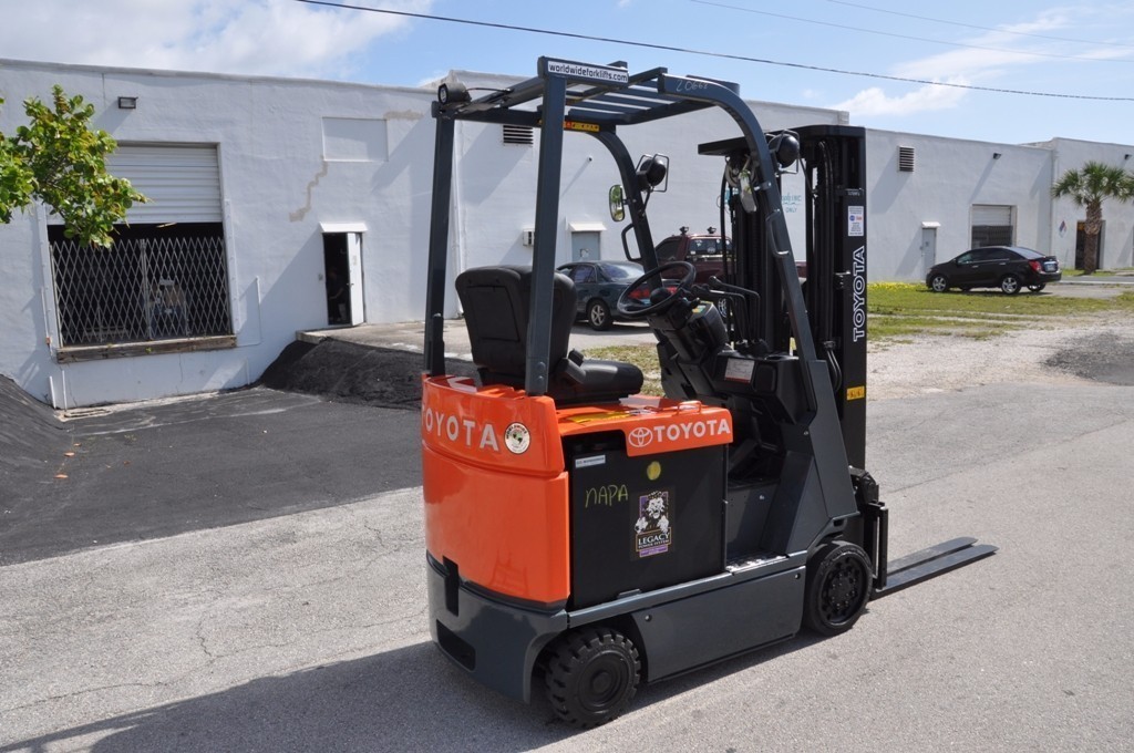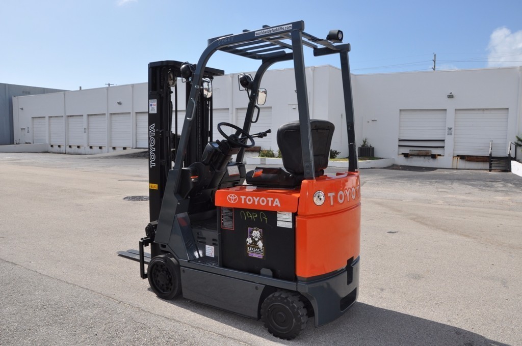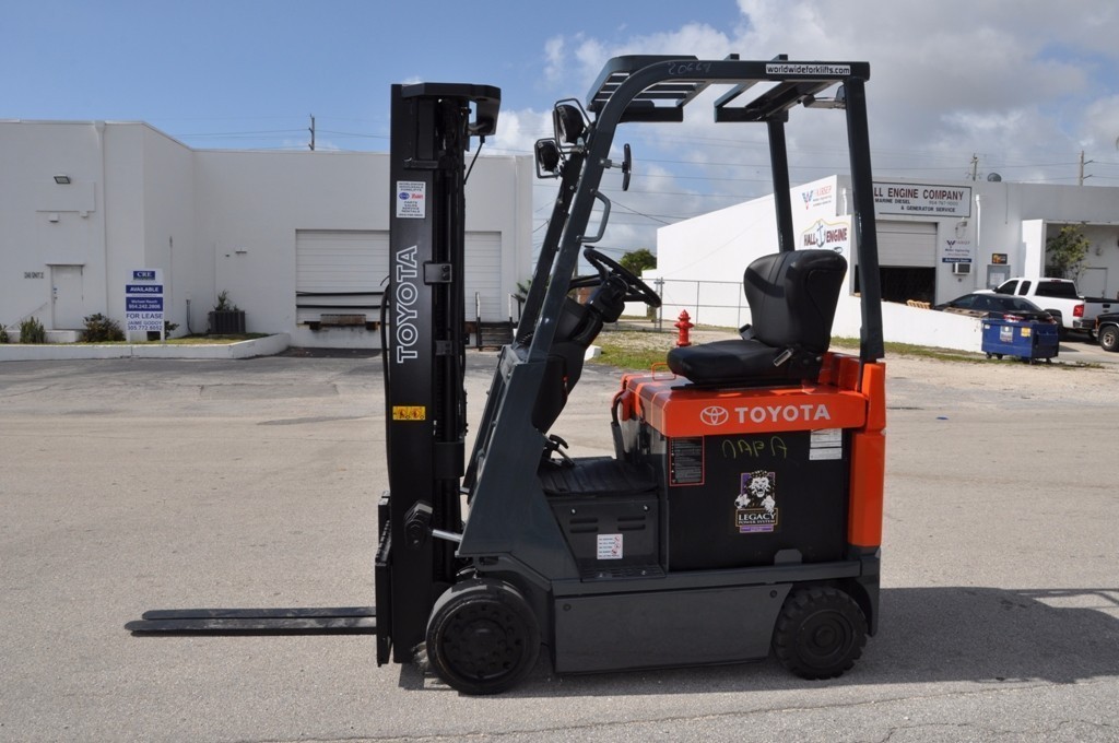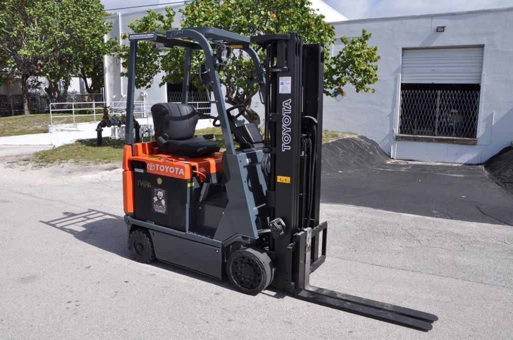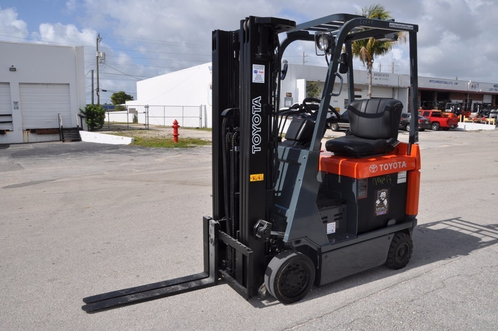 2009 TOYOTA 7FBCU15, Used Toyota Electric 3,000Lb forklift with 3 stage mast and side shifter. BU alarm, strobe, 42" forks. Fully serviced and reconditioned with new paint, tires, OEM, and OSHA decals. New battery and used charger. Options: Side Shift, Forks.