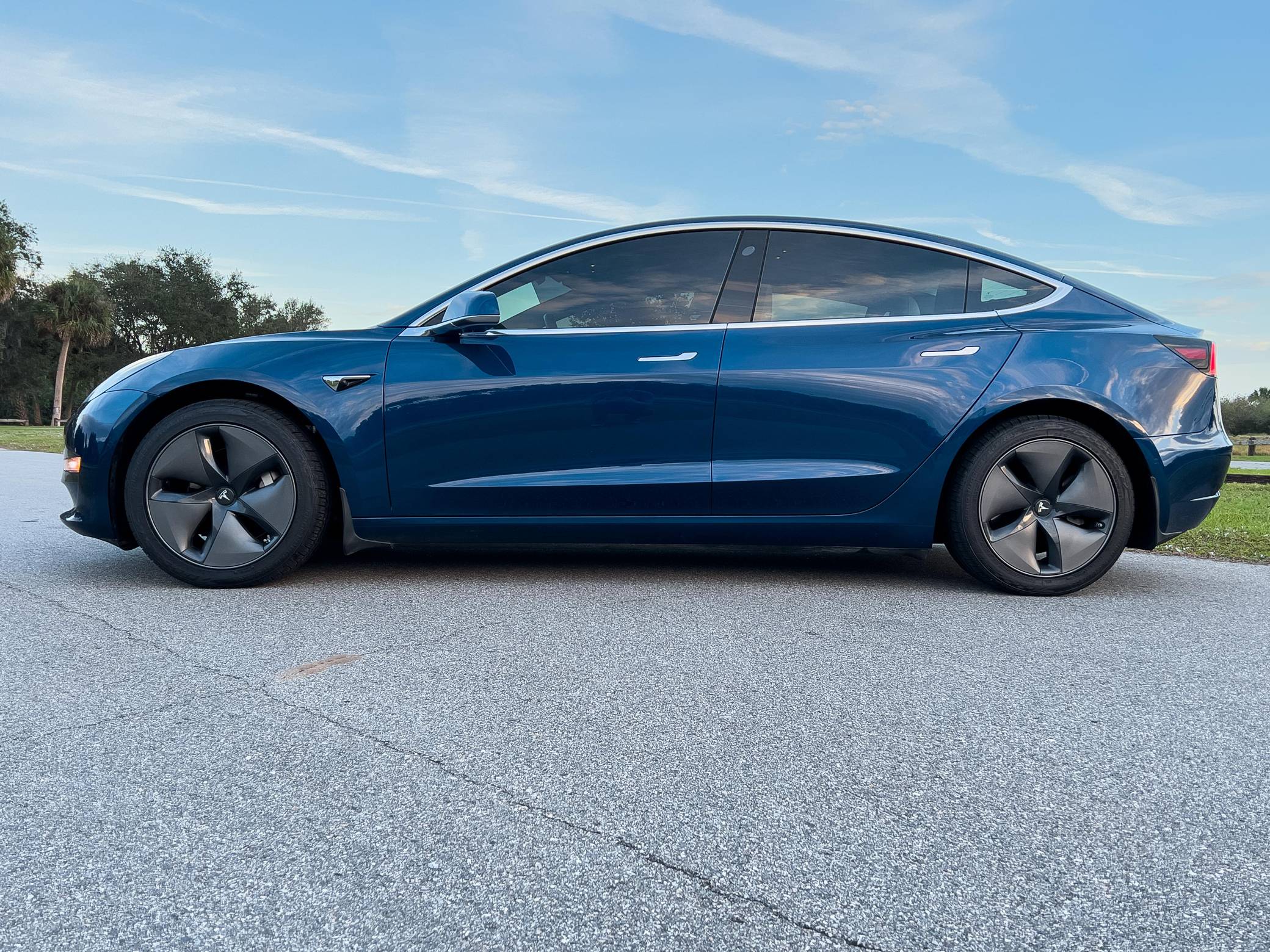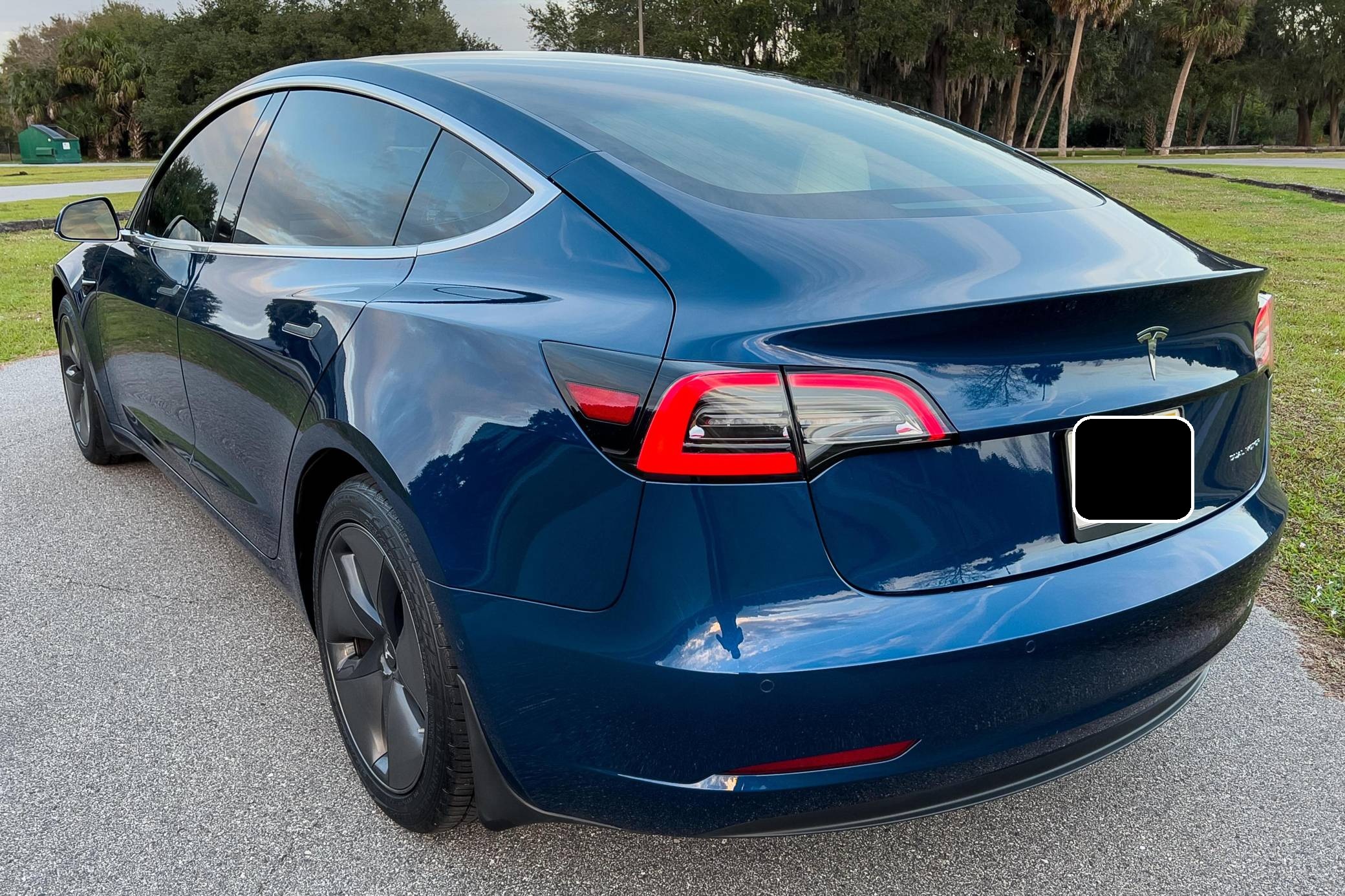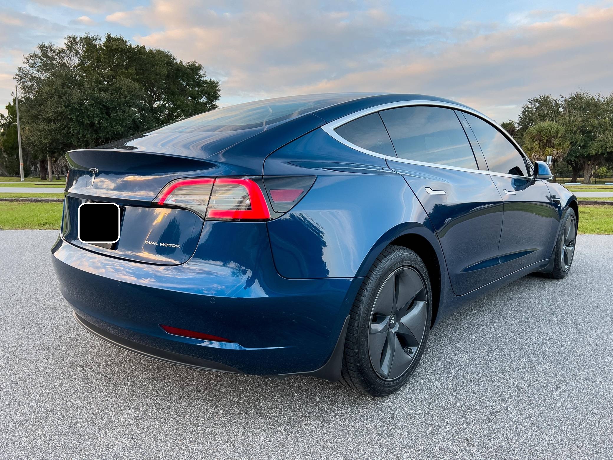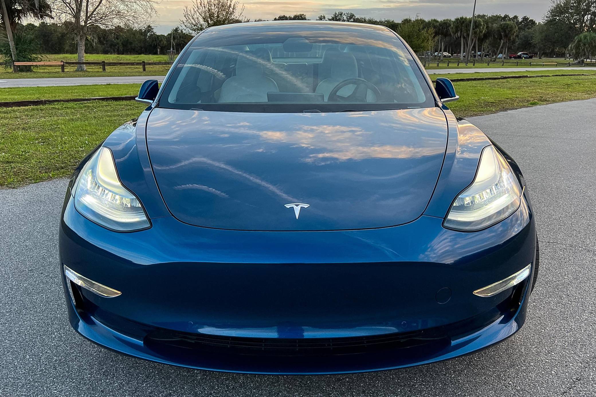 2019 Tesla Model 3 Long Range AWD, finished in Deep Blue Metallic with a white and black interior. Factory equipment includes Full Self-Driving Capability, 18-inch wheels, a panoramic roof, heated and power-adjustable front seats, heated rear seats, a 15-inch touchscreen, and Autopilot technology. Modifications reported by the seller include tinted windows, a kit that lets the driver tilt the infotainment system's touchscreen, and an anti-glare touchscreen protector. At launch, the Model 3 was presented as a premium EV with a usable driving range and respectable performance, all at a reasonably attainable price. It was Tesla's entry-level car. It's still available today, and it has gone through several evolutions (including many software updates) since its introduction. Power comes from a pair of electric motors that draw electricity from a 75-kilowatt-hour lithium-ion battery pack to zap the four wheels with 346 horsepower and 389 lb-ft of torque, according to third-party estimates. In 2019, the Long Range received a maximum driving range rating of 310 miles from the EPA, though the seller states that real-world range is closer to 290 miles.