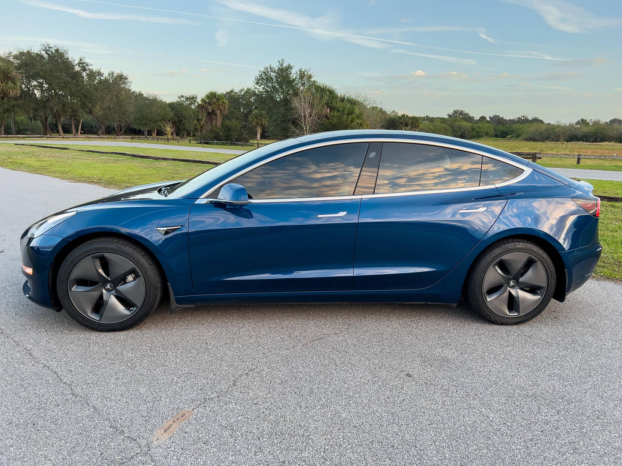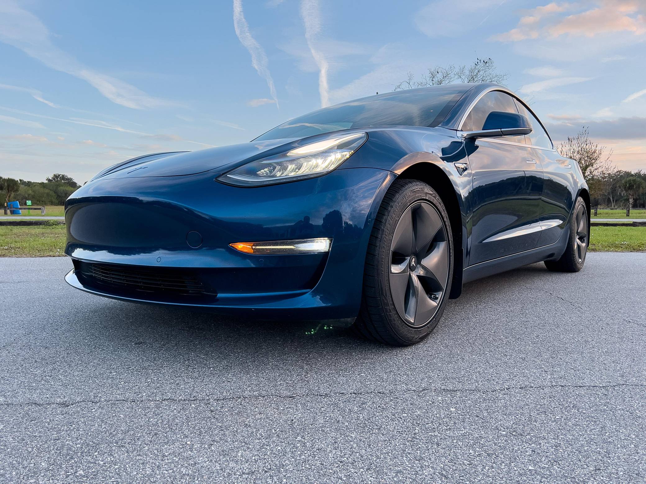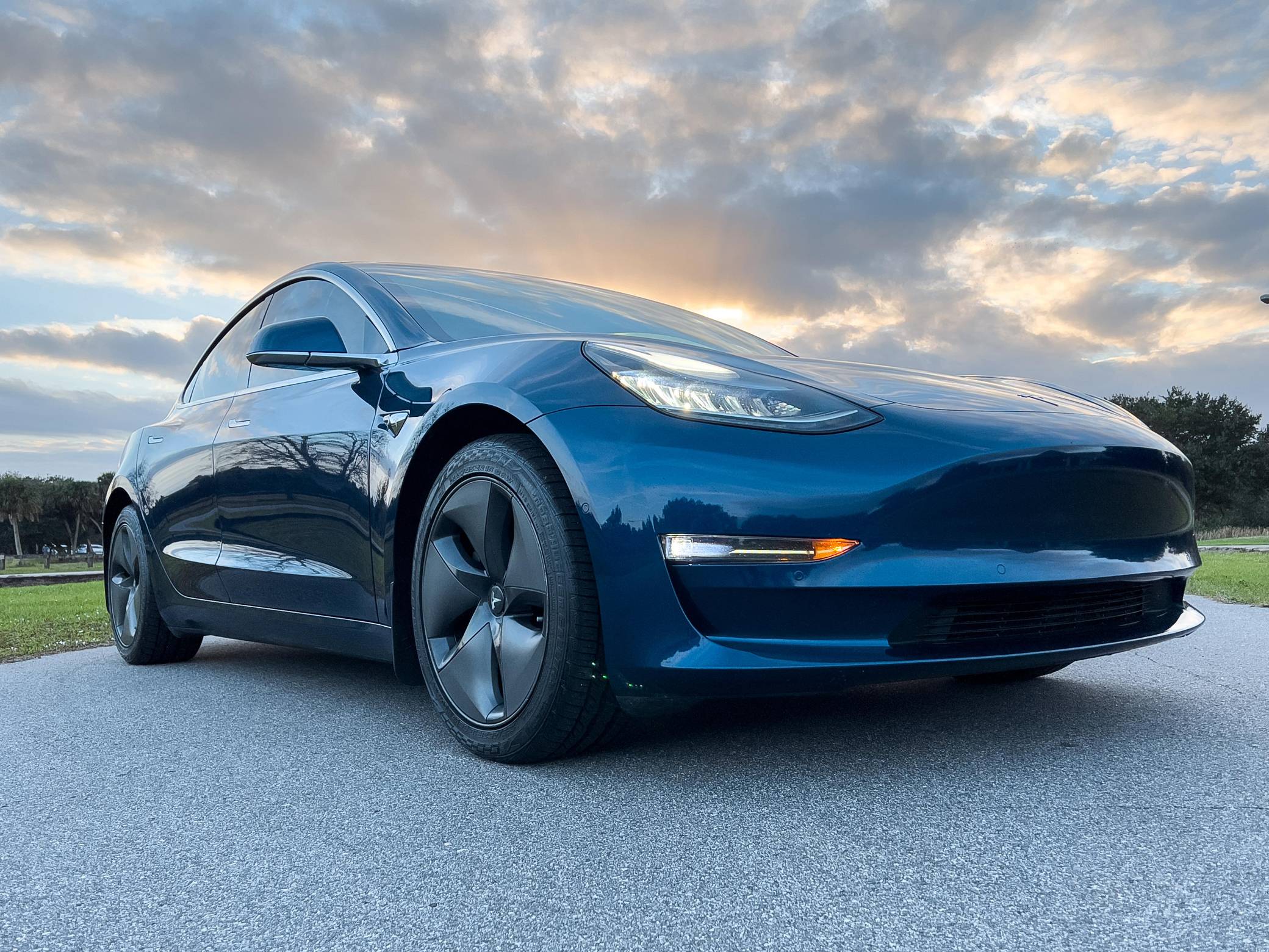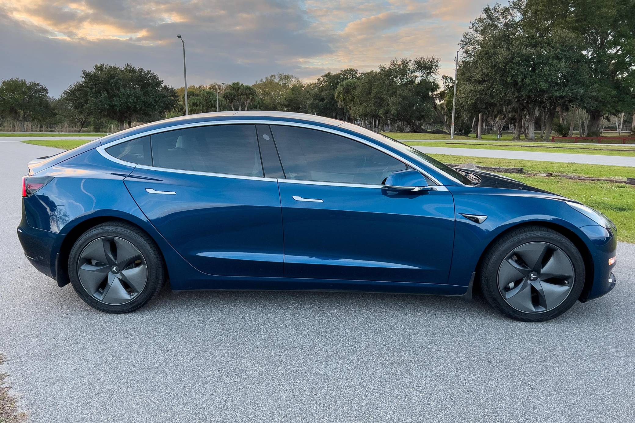 2019 Tesla Model 3 Long Range AWD, finished in Deep Blue Metallic with a white and black interior. Factory equipment includes Full Self-Driving Capability, 18-inch wheels, a panoramic roof, heated and power-adjustable front seats, heated rear seats, a 15-inch touchscreen, and Autopilot technology. Modifications reported by the seller include tinted windows, a kit that lets the driver tilt the infotainment system's touchscreen, and an anti-glare touchscreen protector. At launch, the Model 3 was presented as a premium EV with a usable driving range and respectable performance, all at a reasonably attainable price. It was Tesla's entry-level car. It's still available today, and it has gone through several evolutions (including many software updates) since its introduction. Power comes from a pair of electric motors that draw electricity from a 75-kilowatt-hour lithium-ion battery pack to zap the four wheels with 346 horsepower and 389 lb-ft of torque, according to third-party estimates. In 2019, the Long Range received a maximum driving range rating of 310 miles from the EPA, though the seller states that real-world range is closer to 290 miles.