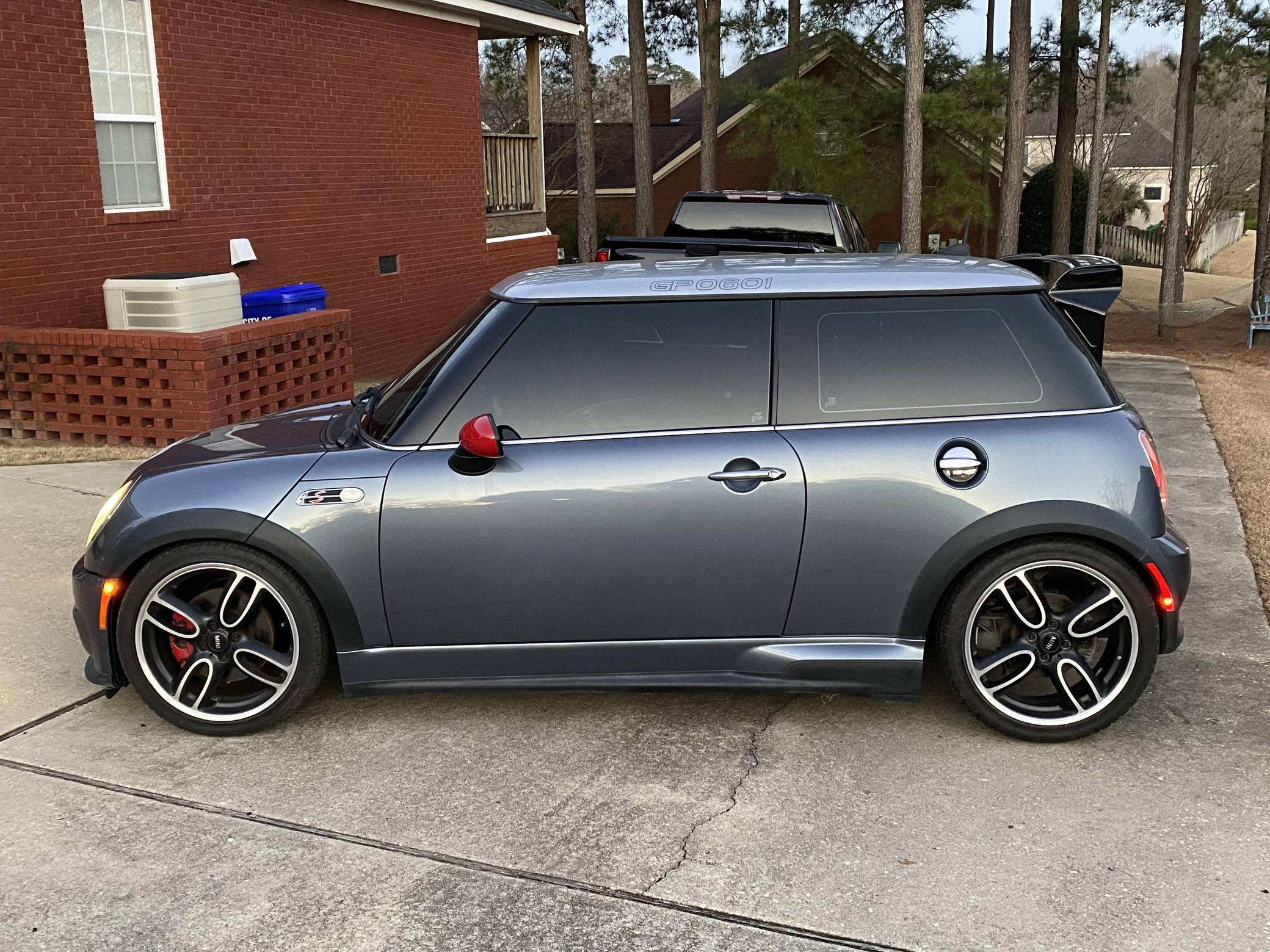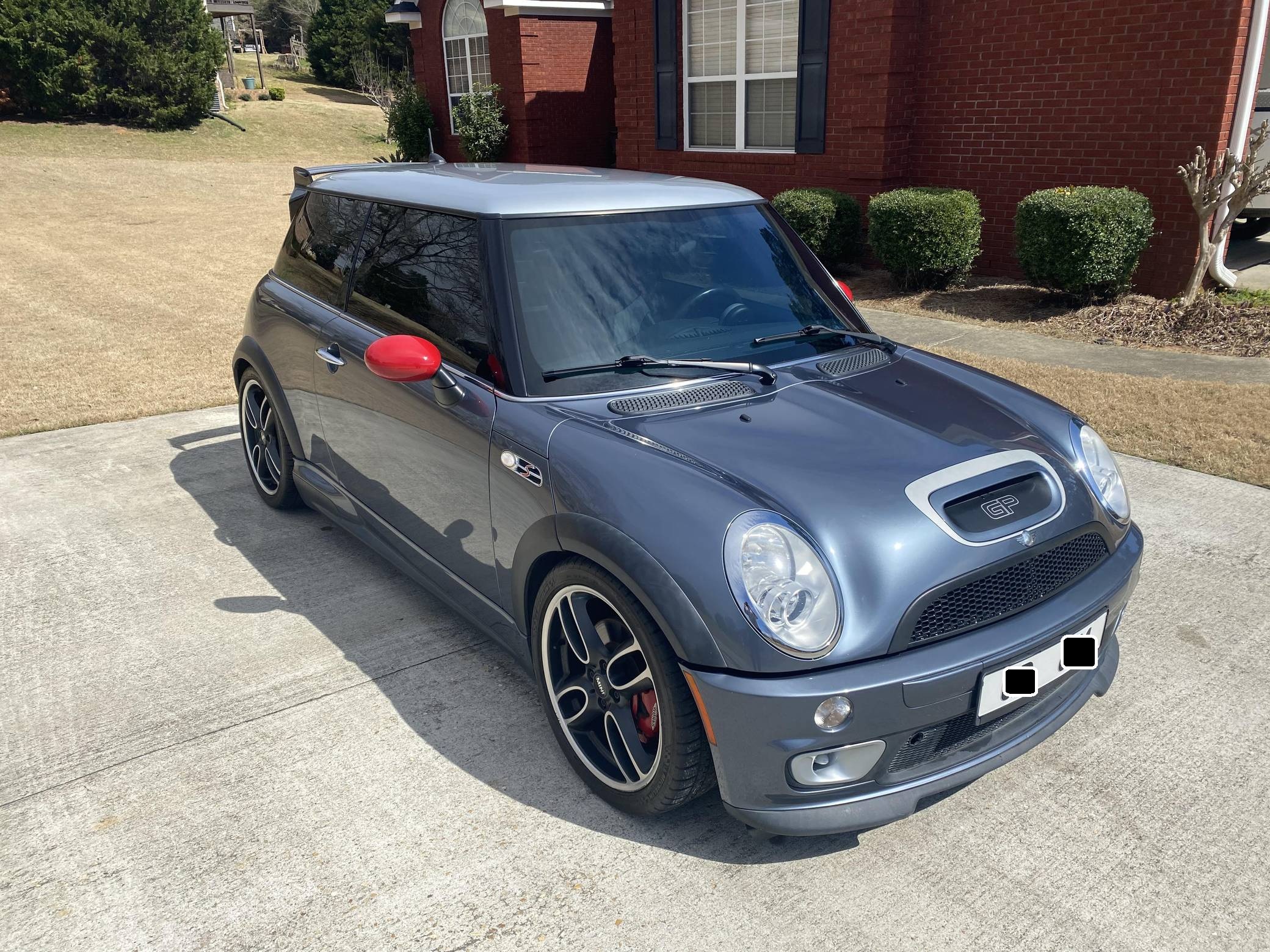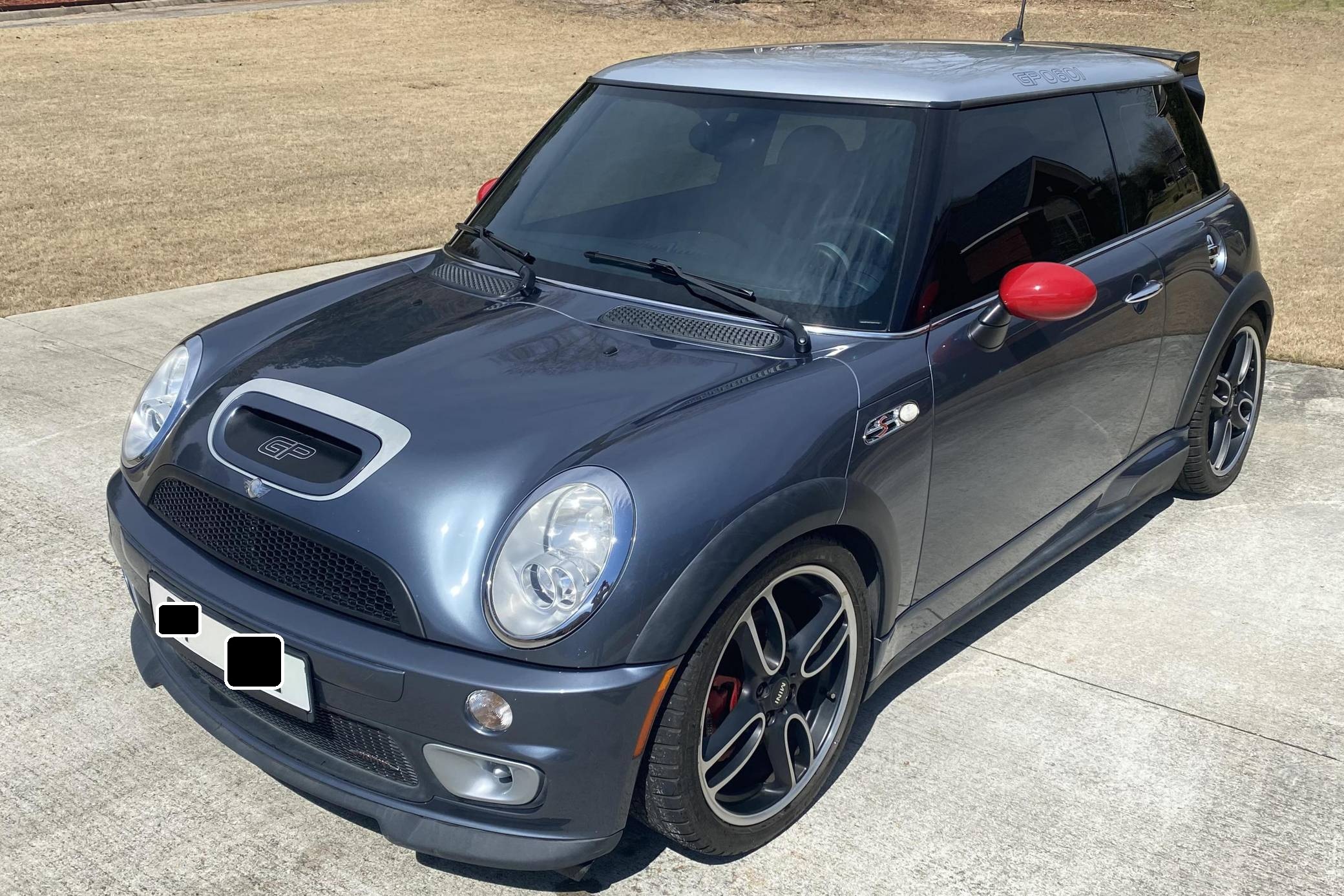 2006 Mini Cooper John Cooper Works GP, finished in Thunder Blue Metallic with a black and gray interior. This Mini GP is equipped with the desirable 6-speed manual transmission, and its odometer indicates about 63,100 miles. Equipment includes 18-inch GP Design alloy wheels, a limited-slip differential, a John Cooper Works Aero Kit, checkmate cloth and leather seats, heated front seats, and more as detailed below. Modifications reported by the seller include a PRW FluidGel crank pulley, Way Motor Works strut tower brace, a black honeycomb front grille, a Valeo clutch and single-mass flywheel, and more listed below. The Mini GP is a race-inspired hot hatch with a limited production run of 2,000 cars, only 415 of which were imported to America. Mini tasked Bertone in Italy with final assembly of the GP -- which, as the most hardcore R53 ever created, had the rear seats removed (with a brace taking their place), and gained a mechanical limited-slip differential, lowered suspension, a more powerful engine, and a special body kit to help it stand out. This GP is reported to be #601 of 2,000. Power comes from a 1. 6-liter inline-4 engine, rated at 214 horsepower and 184 lb-ft of torque. Output is sent to the front wheels via a 6-speed manual transmission.