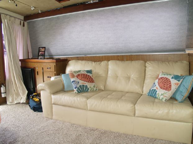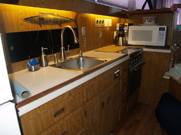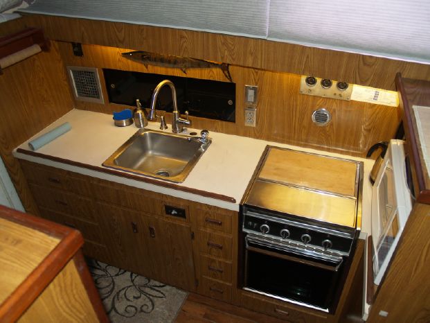 Galley: Upright refrigerator/freezer, Princess three-burner stove, and oven, Formica countertops with built-in stainless sink, electric water heater, microwave oven.