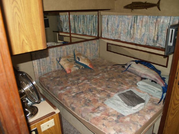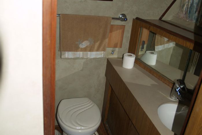 Interior: Features the standard two-stateroom, two head layout with the V-berth stateroom forward and guest head to starboard. The master stateroom is to port, with a queen-sized bed and a private full head with a separate stall shower forward. The mid-level full galley is to starboard with the spacious salon aft and up to two steps. The sofa is too port and the entertainment center is too starboard. The décor is Bertram's original Formica, wall coverings with teak trim and cabinetry throughout, beige carpet, beige leather sofa and barrel chair, duet blind, swing door to the cockpit.