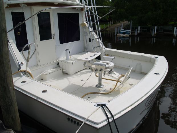 Deck & Fishing: Radar arch with hardtop, aft bridge rail riding seat, stainless steel rails, fiberglass cockpit deck, Rupp triple spreader outriggers with collapsible back bars and center rigger, built-in tackle storage over engine access, large Scopinich fighting chair with four gang rocket launcher backrest, cockpit coaming pads, four-rod holders on pilasters, Scopinich ladder back helm and companion chairs, bow pulpit with electric anchor windlass and Danforth anchor, transom door, four gunwale rod holders.