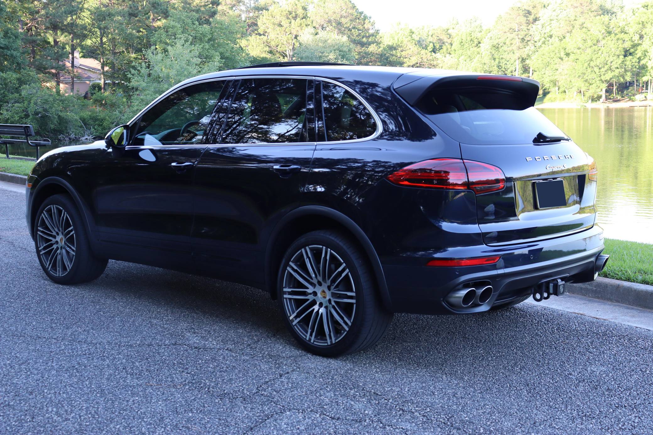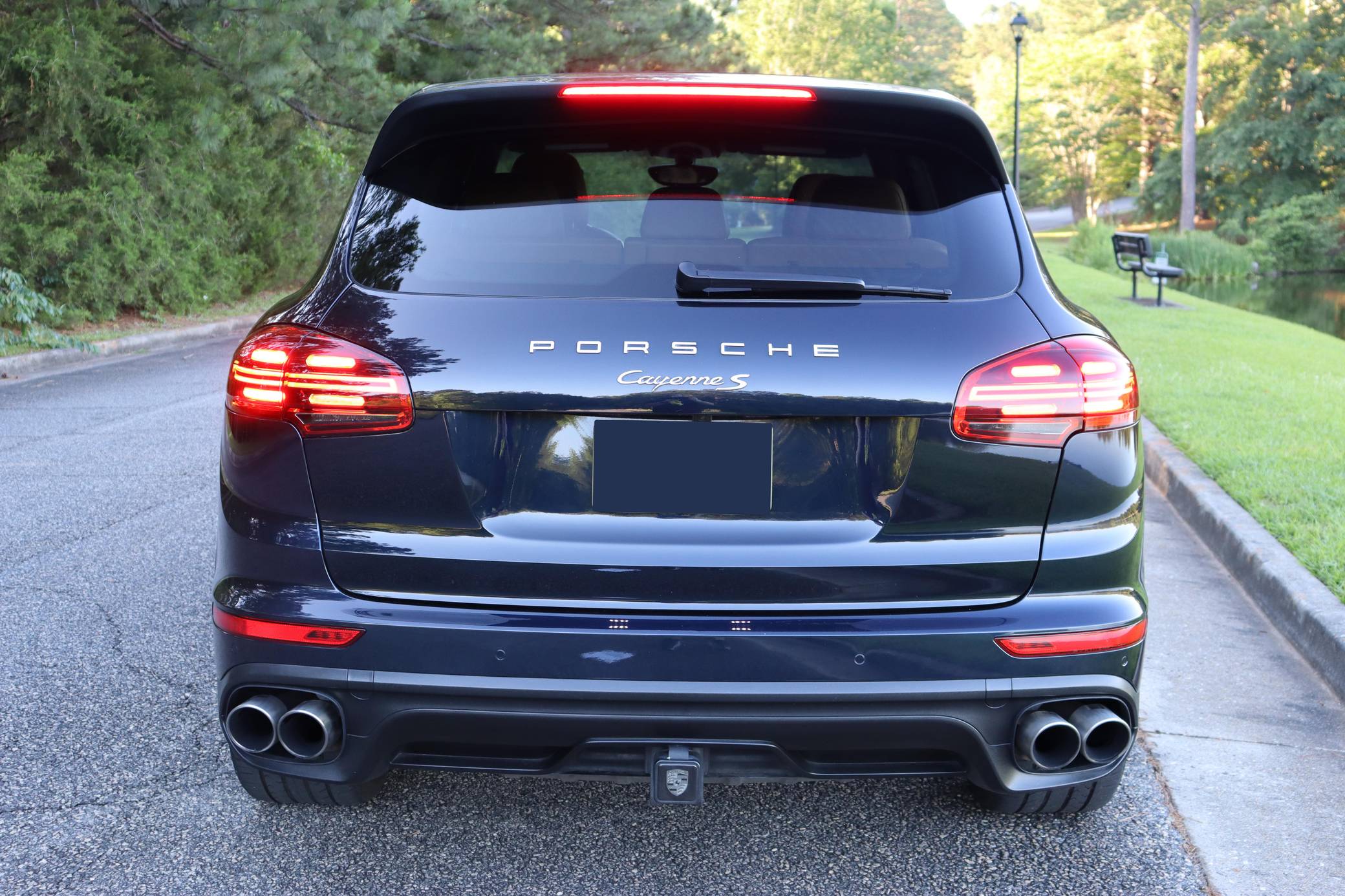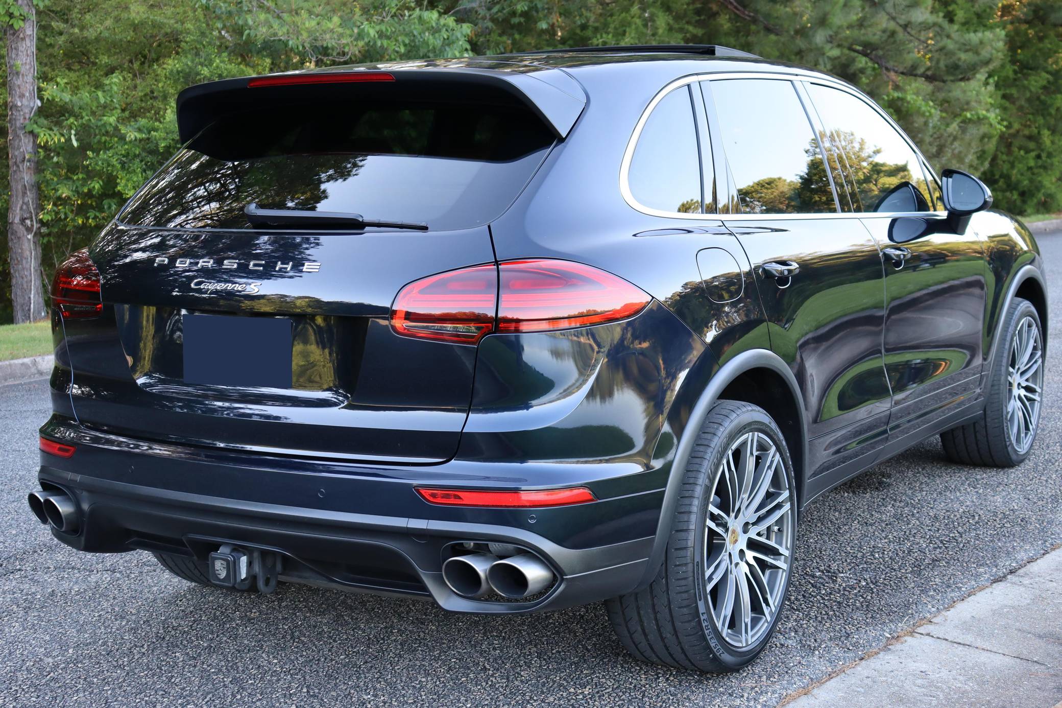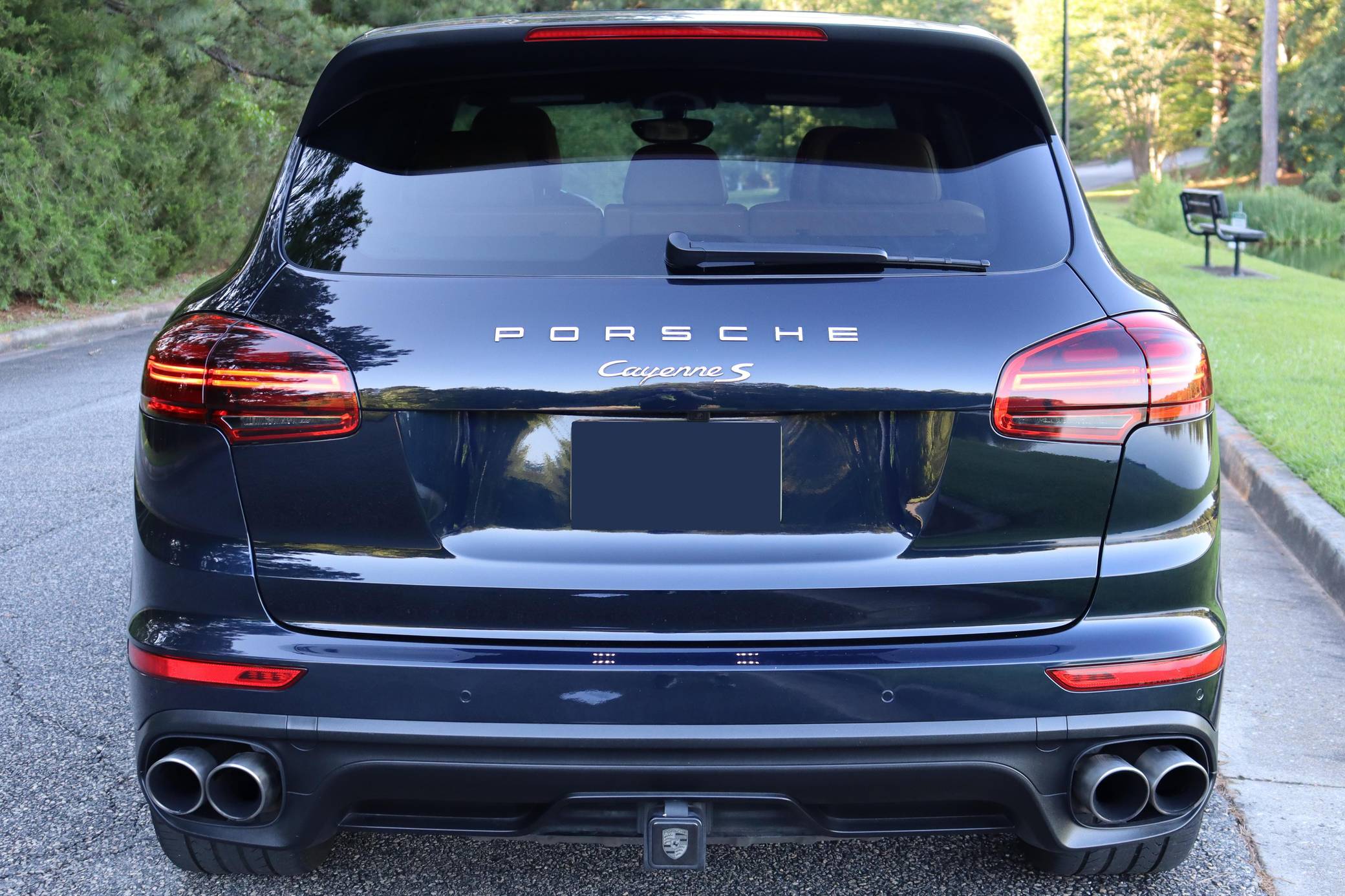 2016 Porsche Cayenne S, finished in Moonlight Blue Metallic with an Espresso and Cognac interior. Factory equipment includes the Premium Package (Power Steering Plus, panoramic roof, auto-dimming exterior and interior mirrors, comfort lighting package, 14-way power-adjustable front seats with memory function, heated and ventilated front seats, front and rear ParkAssist with reversing camera), 21-inch Turbo Design wheels, two-tone leather upholstery, dual-zone automatic climate control, a Porsche Communication Management (PCM) infotainment system, and Lane Change Assist. Modifications reported by the seller are limited to tinted windows. Released for the 2011 model year, the second-generation Cayenne (called "958" internally) was slightly bigger and significantly lighter than its predecessor. It offered a smoother ride thanks to additional technology and luxury features, it was just as capable off-road, and critics agreed it was noticeably sportier than the first-generation model. Production ended in 2017. Power comes from a 3. 6-liter twin-turbocharged V6 engine, rated at 420 horsepower and 406 lb-ft of torque. Output is sent to all four wheels via an 8-speed automatic transmission.