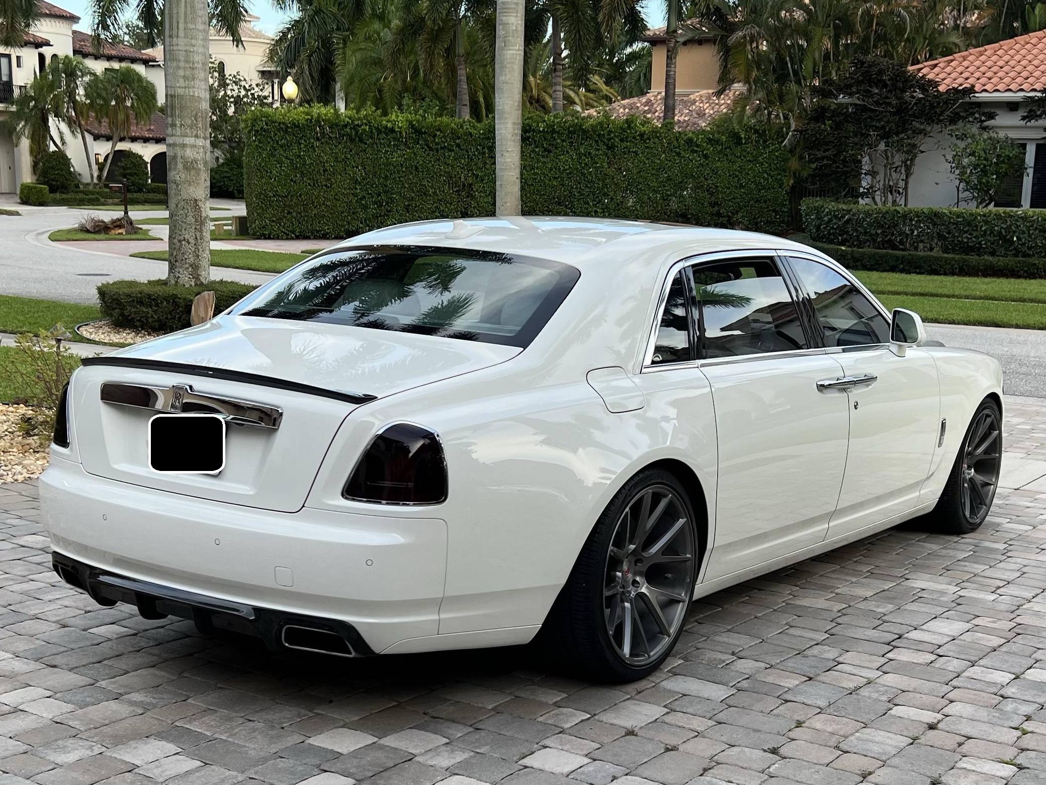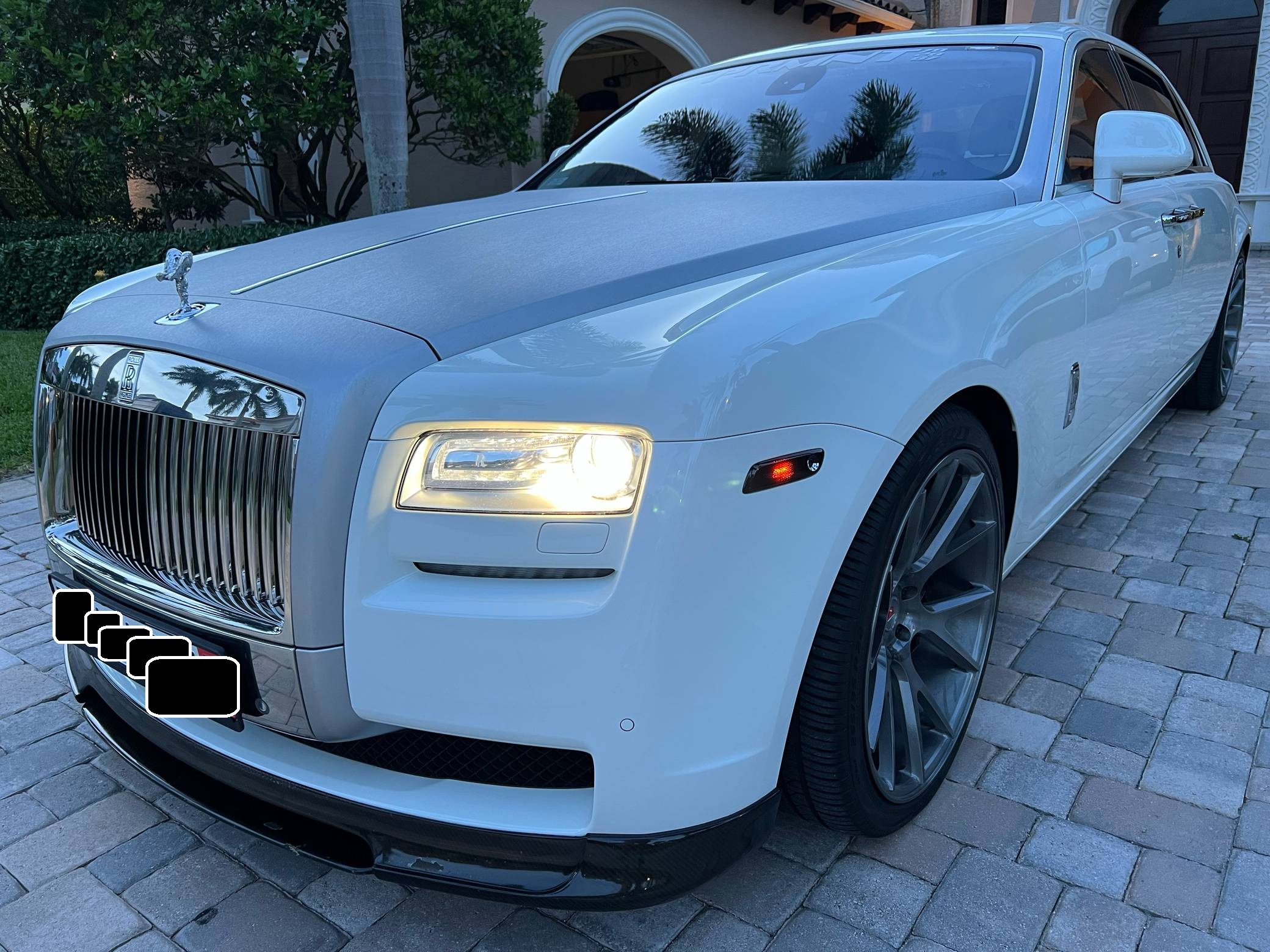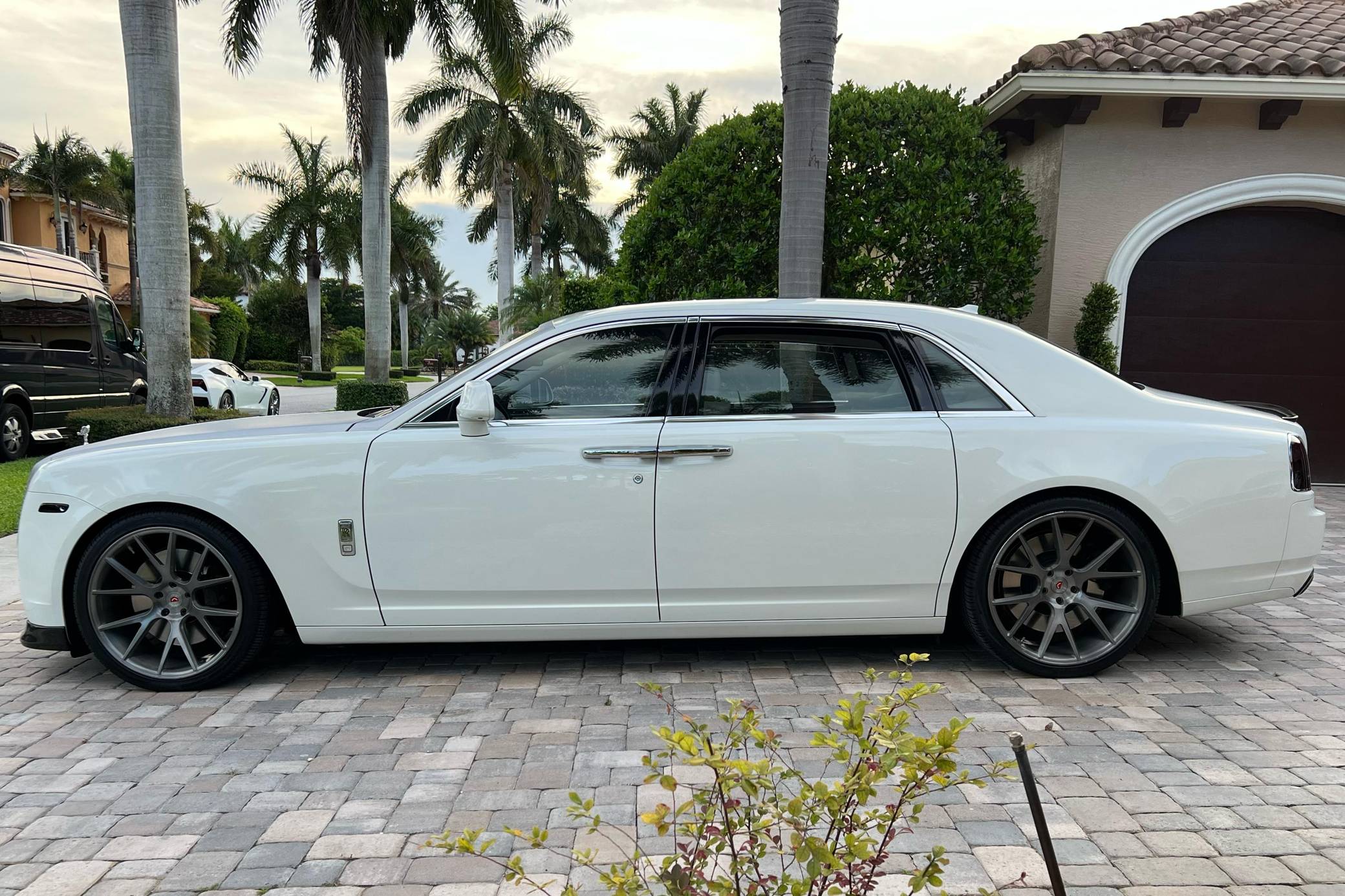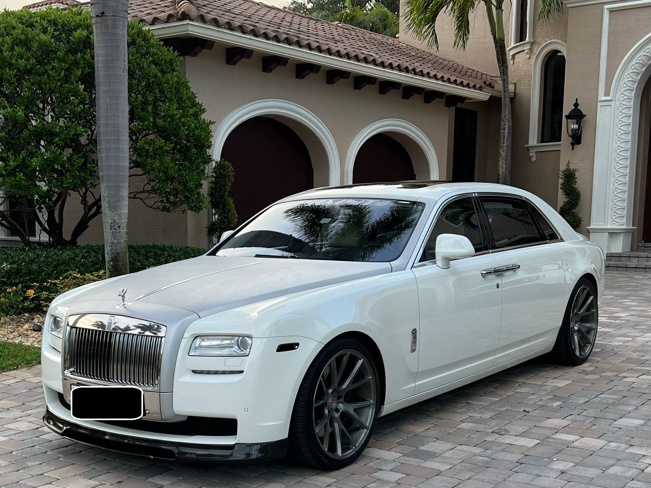 2012 Rolls-Royce Ghost Extended Wheelbase, finished in white with a white interior. The odometer currently displays approximately 21,000 miles. Factory equipment includes adaptive air suspension, a power-retractable Spirit of Ecstasy hood ornament, a power-operated sunroof, leather upholstery, wood interior trim, power-adjustable heated and ventilated front and rear seats, rear picnic trays, a rear-seat entertainment system, and more as listed below. Modifications reported by the seller include a set of 22-inch Vossen wheels, a Vorsteiner V-GR Aero front splitter, rear diffuser, and decklid spoiler, a silver wrap on the hood, windshield surround, and front grille surround, and more as detailed below. Rolls-Royce released the BMW 7 Series-derived Ghost for 2011 as its entry-level sedan, and it launched the Extended Wheelbase (EWB) model the following year. The EWB offered rear-seat passengers up to 49 inches of leg room thanks to a wheelbase stretched by 6. 7 inches. While it was cheaper and smaller than the Phantom, the Ghost nonetheless stood proud as one of the world's most luxurious cars. Power comes from a 6. 6-liter twin-turbocharged V12, rated at 563 horsepower and 575 lb-ft of torque. Output is sent to the rear wheels via an 8-speed automatic transmission.