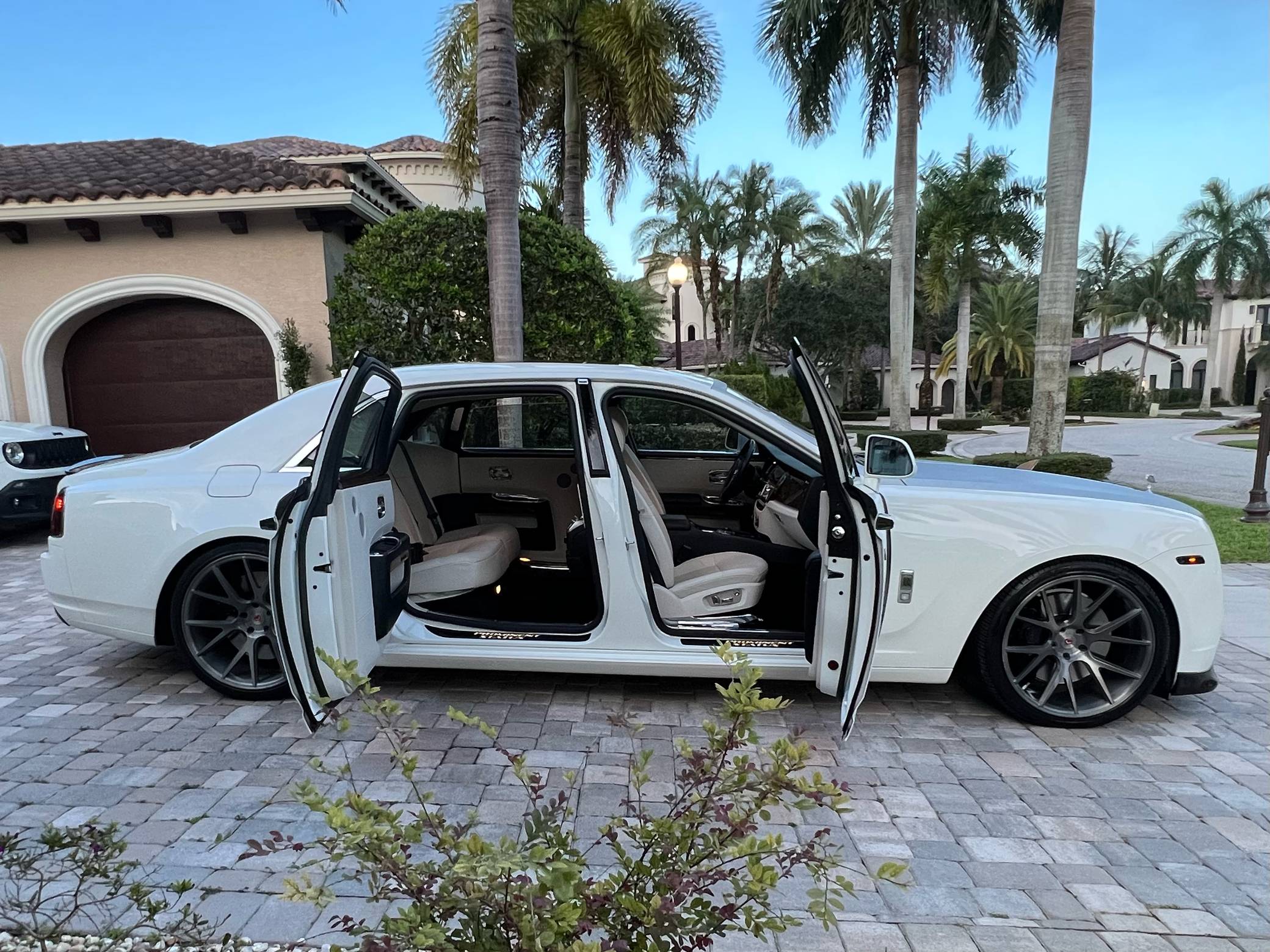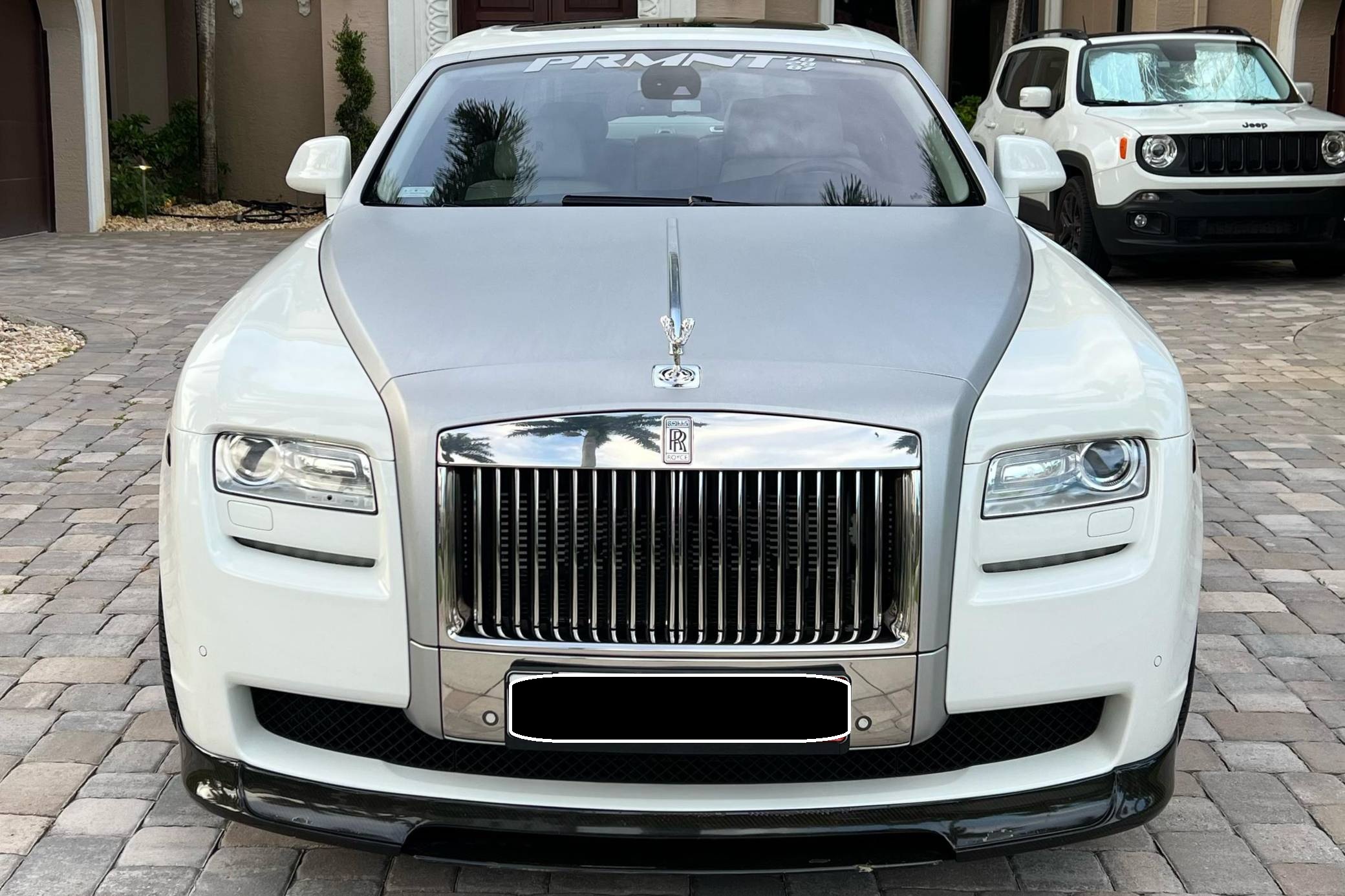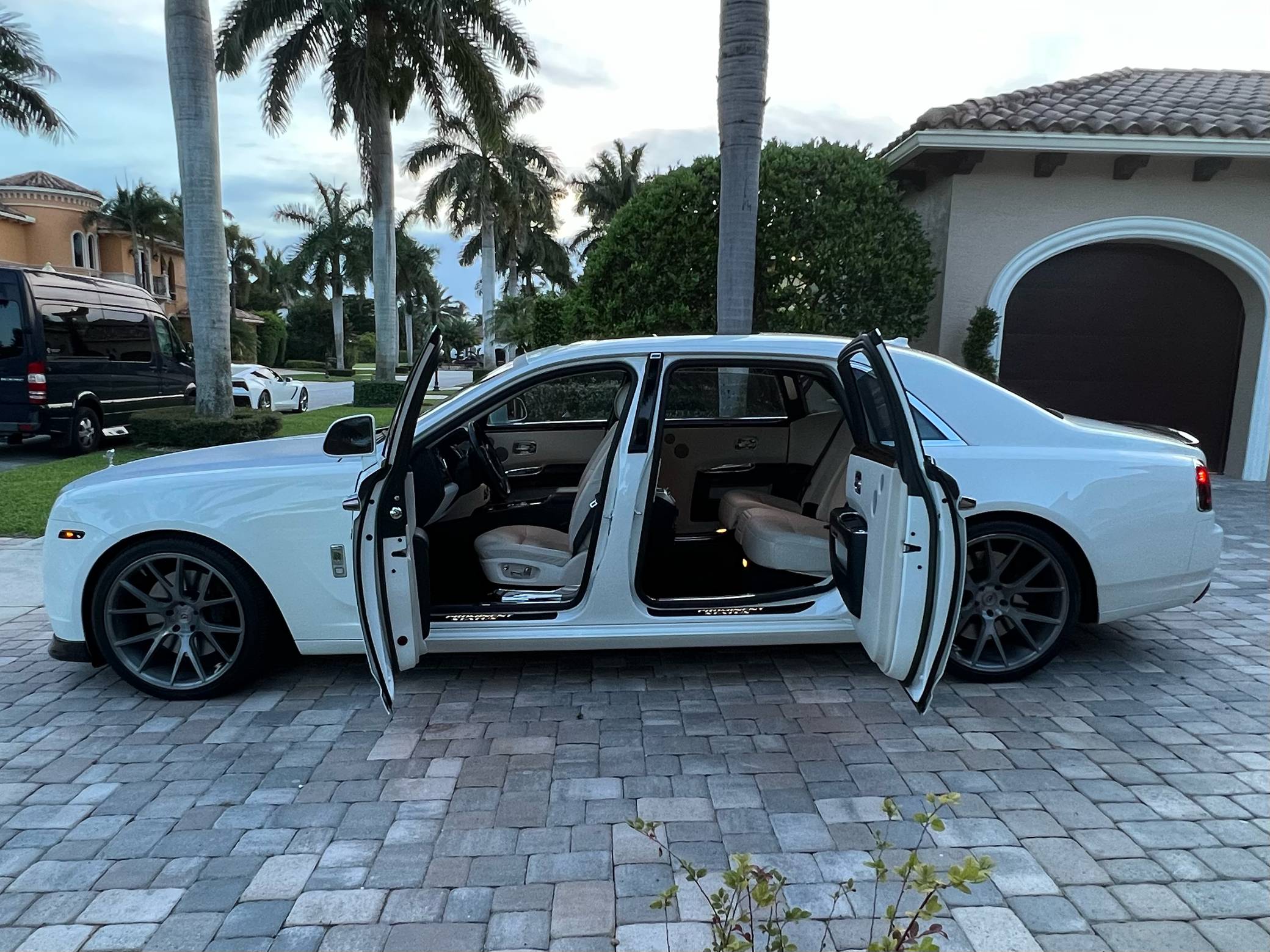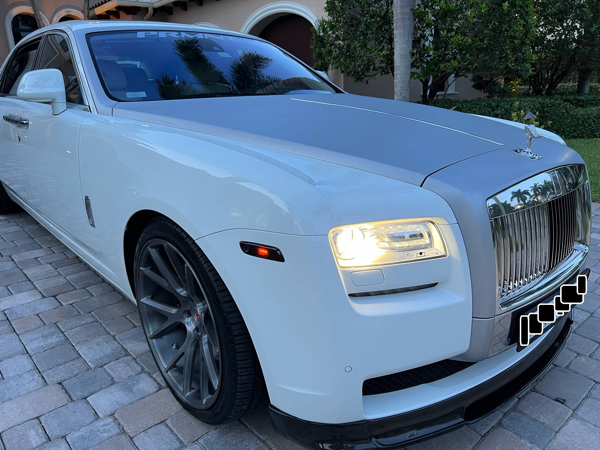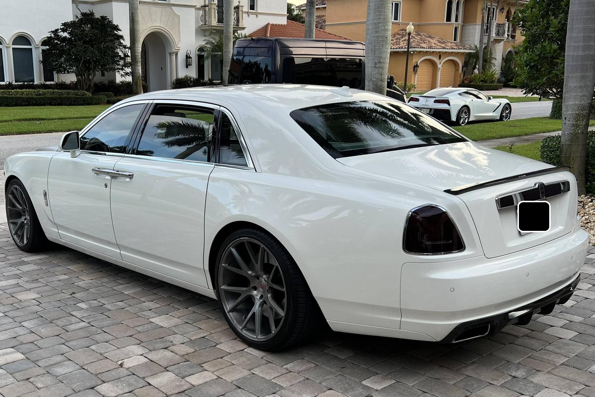 2012 Rolls-Royce Ghost Extended Wheelbase, finished in white with a white interior. The odometer currently displays approximately 21,000 miles. Factory equipment includes adaptive air suspension, a power-retractable Spirit of Ecstasy hood ornament, a power-operated sunroof, leather upholstery, wood interior trim, power-adjustable heated and ventilated front and rear seats, rear picnic trays, a rear-seat entertainment system, and more as listed below. Modifications reported by the seller include a set of 22-inch Vossen wheels, a Vorsteiner V-GR Aero front splitter, rear diffuser, and decklid spoiler, a silver wrap on the hood, windshield surround, and front grille surround, and more as detailed below. Rolls-Royce released the BMW 7 Series-derived Ghost for 2011 as its entry-level sedan, and it launched the Extended Wheelbase (EWB) model the following year. The EWB offered rear-seat passengers up to 49 inches of leg room thanks to a wheelbase stretched by 6. 7 inches. While it was cheaper and smaller than the Phantom, the Ghost nonetheless stood proud as one of the world's most luxurious cars. Power comes from a 6. 6-liter twin-turbocharged V12, rated at 563 horsepower and 575 lb-ft of torque. Output is sent to the rear wheels via an 8-speed automatic transmission.