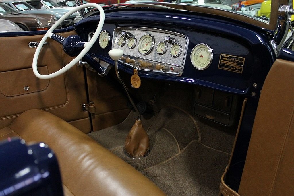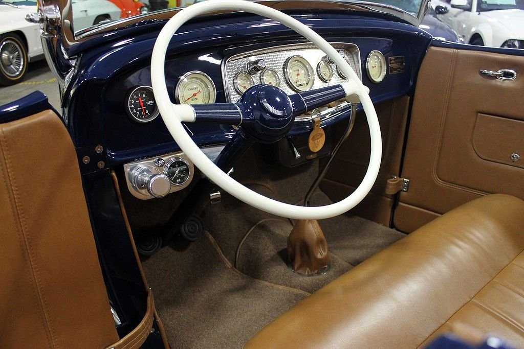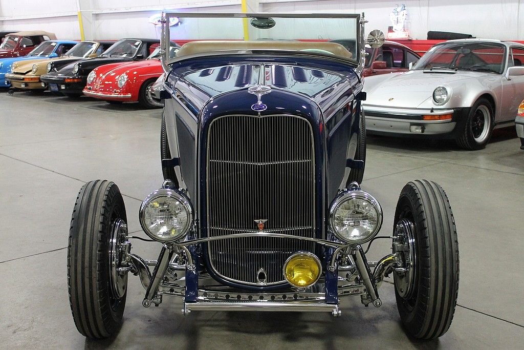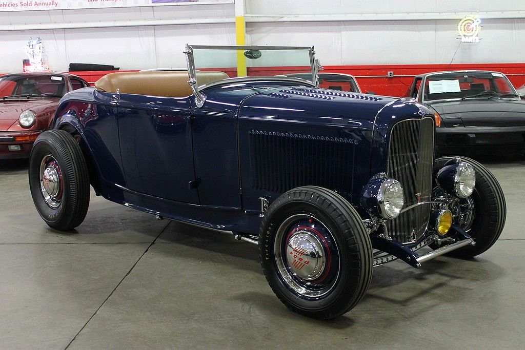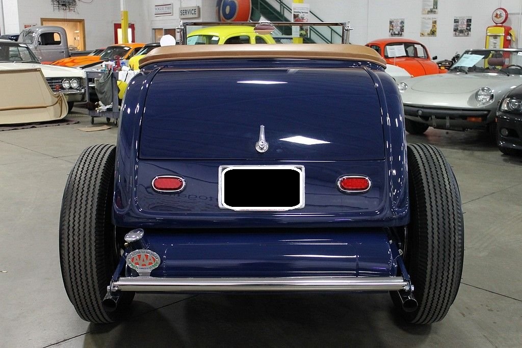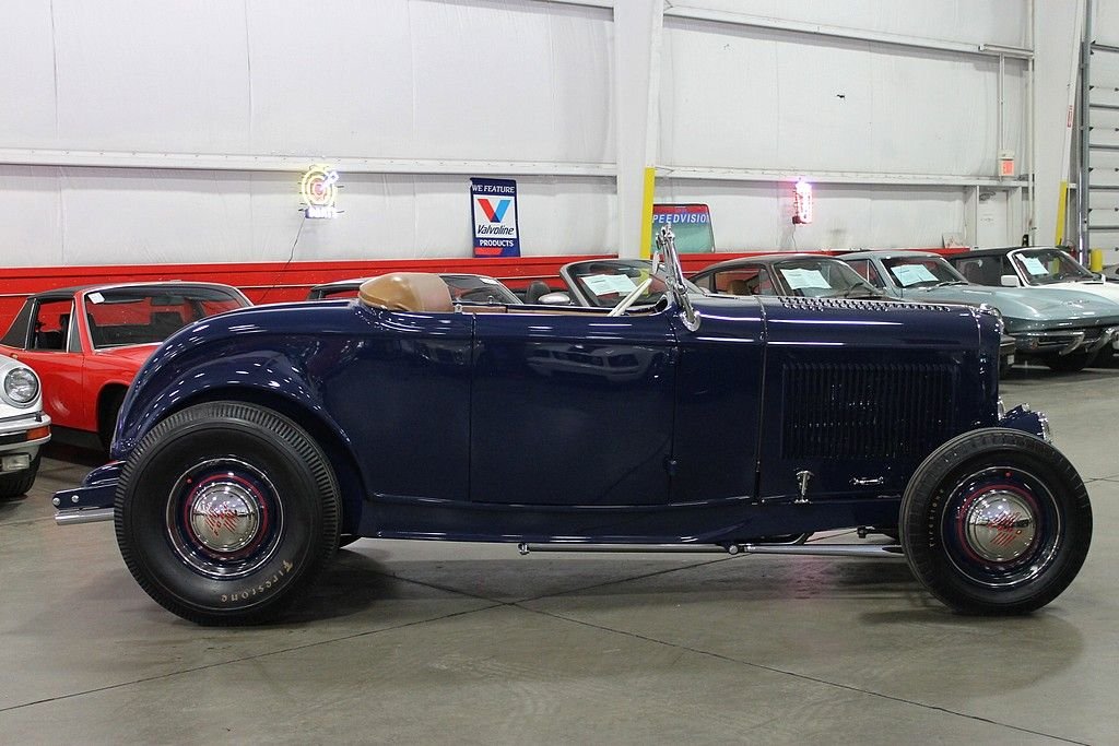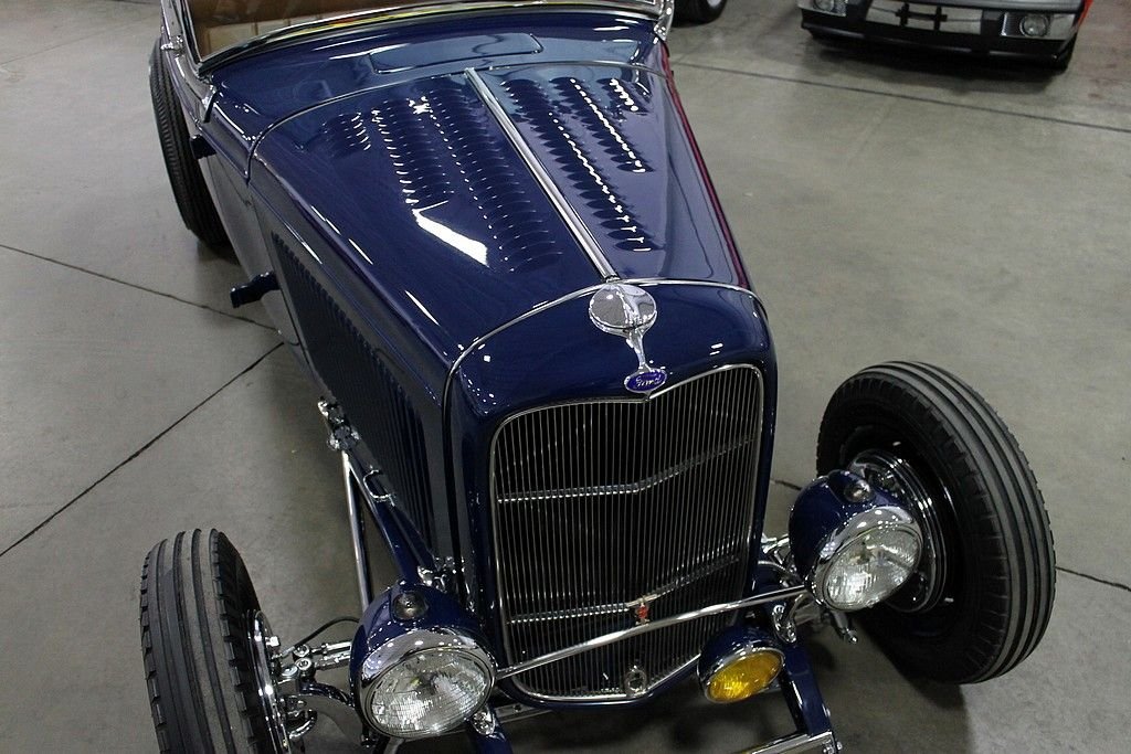 “This is a deuce highboy roadster, code for a 1932 Ford with the fenders tossed but the roadster body still high atop the frame just where ol' Henry put it. It's a traditional form, the archetypal hot rod, the basic unit of post–World War II, Southern California, returning-serviceman car exuberance. A roadster was light, and the rodders made it lighter still by throwing away all the nonessentials. Then they did their homemade best with the available flathead V-8s and looked for opponents on the road or on California's dry lakes.”* - caranddriver.com This 1932 Ford Roadster offered here is an award winner several times over and was built by the Riddler Award winning team at Mid-American Motorsports! It won the 2012 Detroit Autorama and the Cassie Award at the 2013 Autorama! Everything on this '32 Ford is top of the line, no expense spared. The body is a Downs fiberglass body that has been stretched 2 inches for extra leg room, with a hand formed Auburn dash with classic gauges and a clock, a hand fuel pump with gauge, saddle brown leather, German short weave carpet, a 48 Ford heater made into a glove box, Swan shifter, Limelight steering column, and a beautiful 40 Ford steering wheel. The exterior is painted in a stunning deep blue with coordinating Carson saddle brown style lift off top, over $4,000 in chrome, Dry Lake louvers, side panels with louvers, Firestone Dirt Track ribbed tires on 40 Ford four inch wheels, and the rears are Firestones on 41 Ford wheels, all are pinstriped for that extra appeal! The underside of this 1932 Ford for sale is as nice as the top side and everything is painted, polished, or chrome. The jewel of the underside is the Winners V8 Quick Change rear end with 3.70 gears! Under the hood lies a monster that is ready to propel this hot rod down the street! According to the previous owner, it houses a 1970 Pontiac 455 that has been bored .060 over with Jahns pistons, 10.15:1 compression, Pontiac forged rods, 7/16 bolts, stock depth oil pan with high volume TRW pump, windage tray, topped off with Pontiac 4x heads with screw in studs, 1.5 ratio rockers, 2.11 intake, 1.77 exhaust, stainless steel Ferrea valves, Ram Air III cam, Offenhauser quad manifold with twin Edelbrock 500 carburetors that have been dyed to look like the early Carter AFBs, Moon finned valve covers, Moon breathers, early SD water pump pulleys, early distributor with locked out advance, custom headers with lake pipes, complete exhaust is chromed, frame has Ford X member, and everything is nicely tucked away for a show quality finish. If you want a 50's style hot rod, look no further! The performance of the vehicle is outstanding, the sound is tremendous and the look is more than words can describe. It's very clear there was many hours and dollars invested in the near immaculate Roadster!
