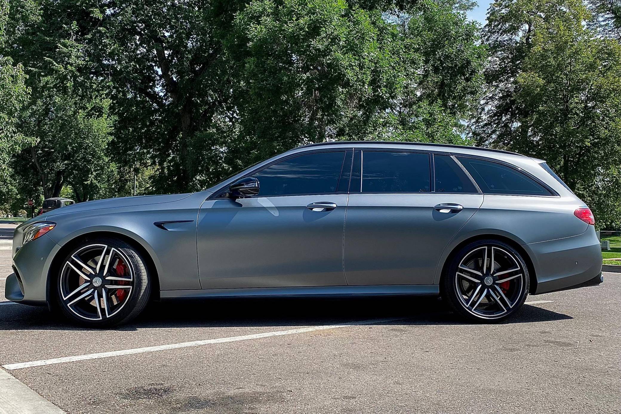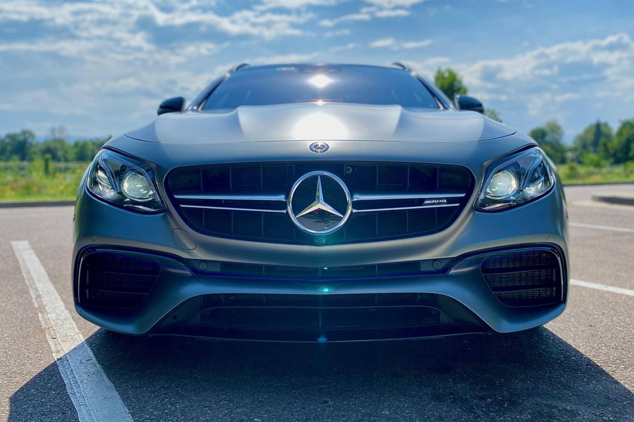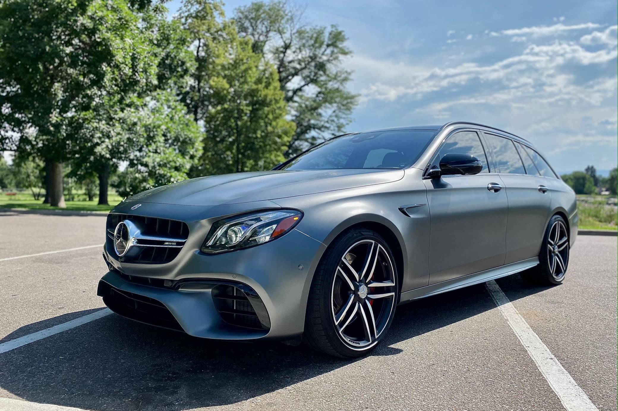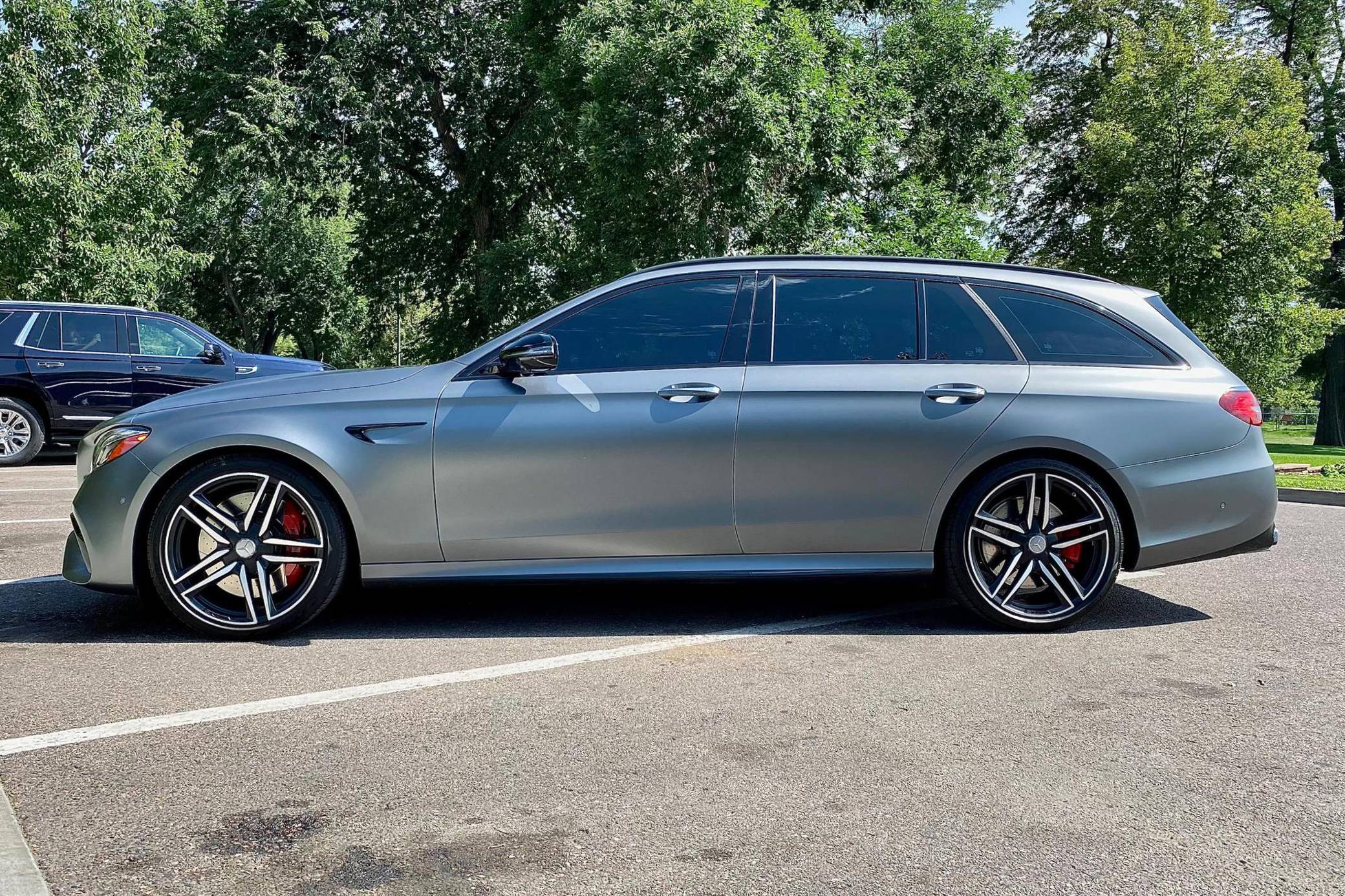 2019 Mercedes-AMG E63 S Wagon, finished in Designo Selenite Grey Magno with a black interior. The build sheet pictured in the gallery reveals that this wagon cost $120,325 when new. Highly optioned, it's equipped with Acoustic Comfort, Exterior lighting, Warmth and Comfort, AMG Night, and Driver Assistance Packages, 20-inch AMG Twin 5-Spoke wheels, remote start, red brake calipers, a sunroof, Nappa leather and Dinamica upholstery, power-operated heated and ventilated front seats, heated rear seats, Natural Grain Black Ash wood trim, and Apple CarPlay and Android Auto capabilities. Modifications reported by the seller include XPEL paint protection film, fender badges deleted, and window tint. Released for 2018, the "W213"-based E63 and E63 S arrived with a more fluid design, a smaller yet more powerful engine, and a drift mode that can send 100% of the engine's torque to the rear wheels. The wagon variant (called "S213" internally) was exclusively offered in S tune, so it landed as the most expensive member of the E-Class range. Power comes from a twin-turbocharged 4. 0-liter V8, rated at 603 horsepower and 627 lb-ft of torque. Hand-built, it spins the four wheels via a 9-speed automatic transmission and Mercedes-Benz's 4Matic+ permanent all-wheel-drive system.