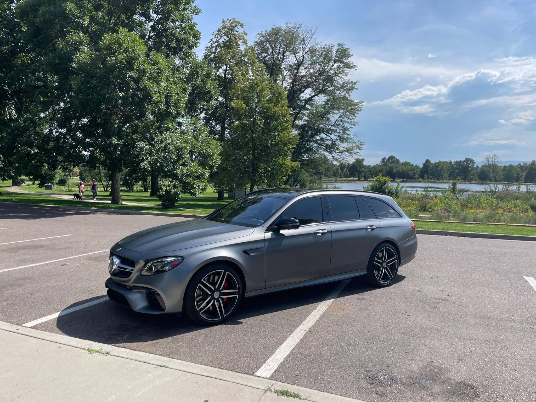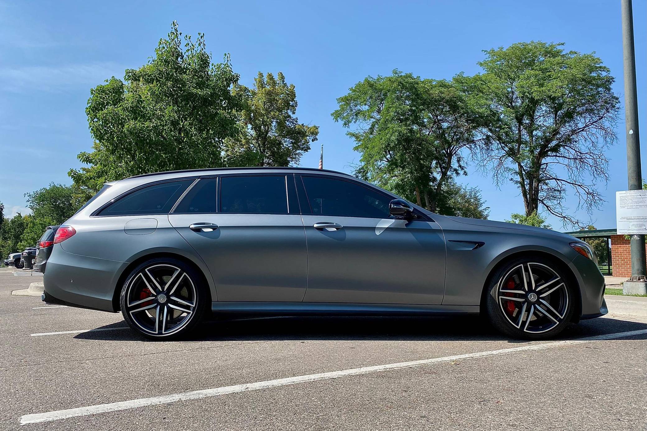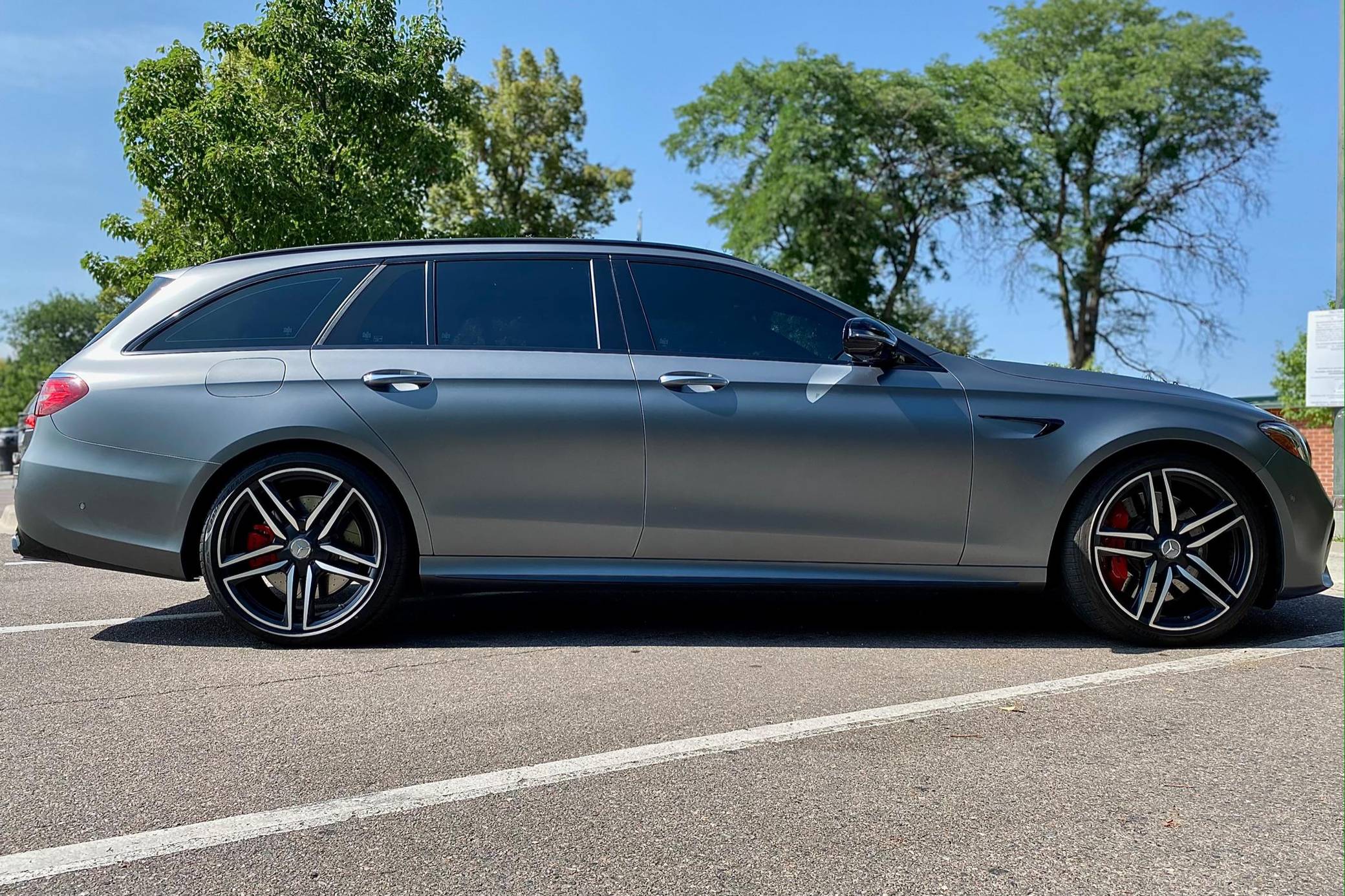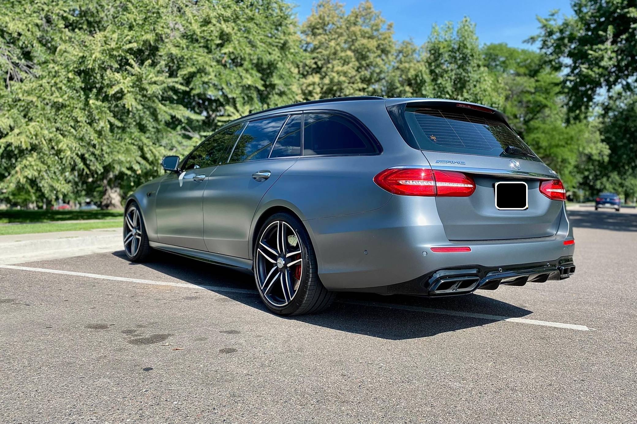 2019 Mercedes-AMG E63 S Wagon, finished in Designo Selenite Grey Magno with a black interior. The build sheet pictured in the gallery reveals that this wagon cost $120,325 when new. Highly optioned, it's equipped with Acoustic Comfort, Exterior lighting, Warmth and Comfort, AMG Night, and Driver Assistance Packages, 20-inch AMG Twin 5-Spoke wheels, remote start, red brake calipers, a sunroof, Nappa leather and Dinamica upholstery, power-operated heated and ventilated front seats, heated rear seats, Natural Grain Black Ash wood trim, and Apple CarPlay and Android Auto capabilities. Modifications reported by the seller include XPEL paint protection film, fender badges deleted, and window tint. Released for 2018, the "W213"-based E63 and E63 S arrived with a more fluid design, a smaller yet more powerful engine, and a drift mode that can send 100% of the engine's torque to the rear wheels. The wagon variant (called "S213" internally) was exclusively offered in S tune, so it landed as the most expensive member of the E-Class range. Power comes from a twin-turbocharged 4. 0-liter V8, rated at 603 horsepower and 627 lb-ft of torque. Hand-built, it spins the four wheels via a 9-speed automatic transmission and Mercedes-Benz's 4Matic+ permanent all-wheel-drive system.