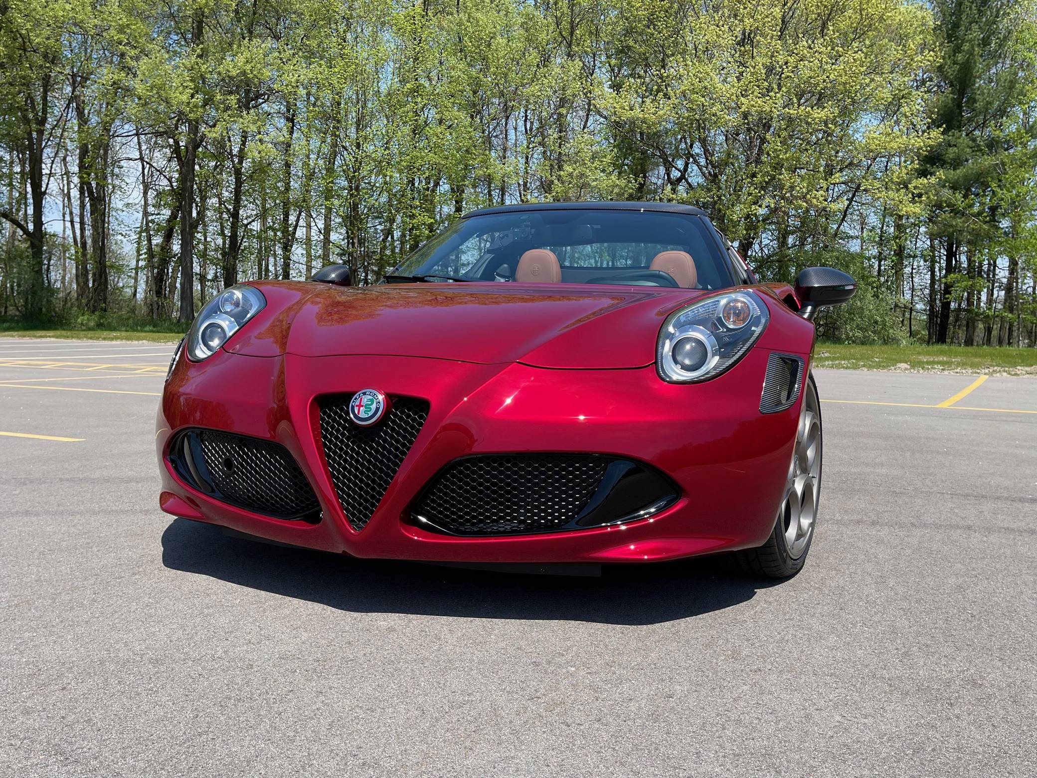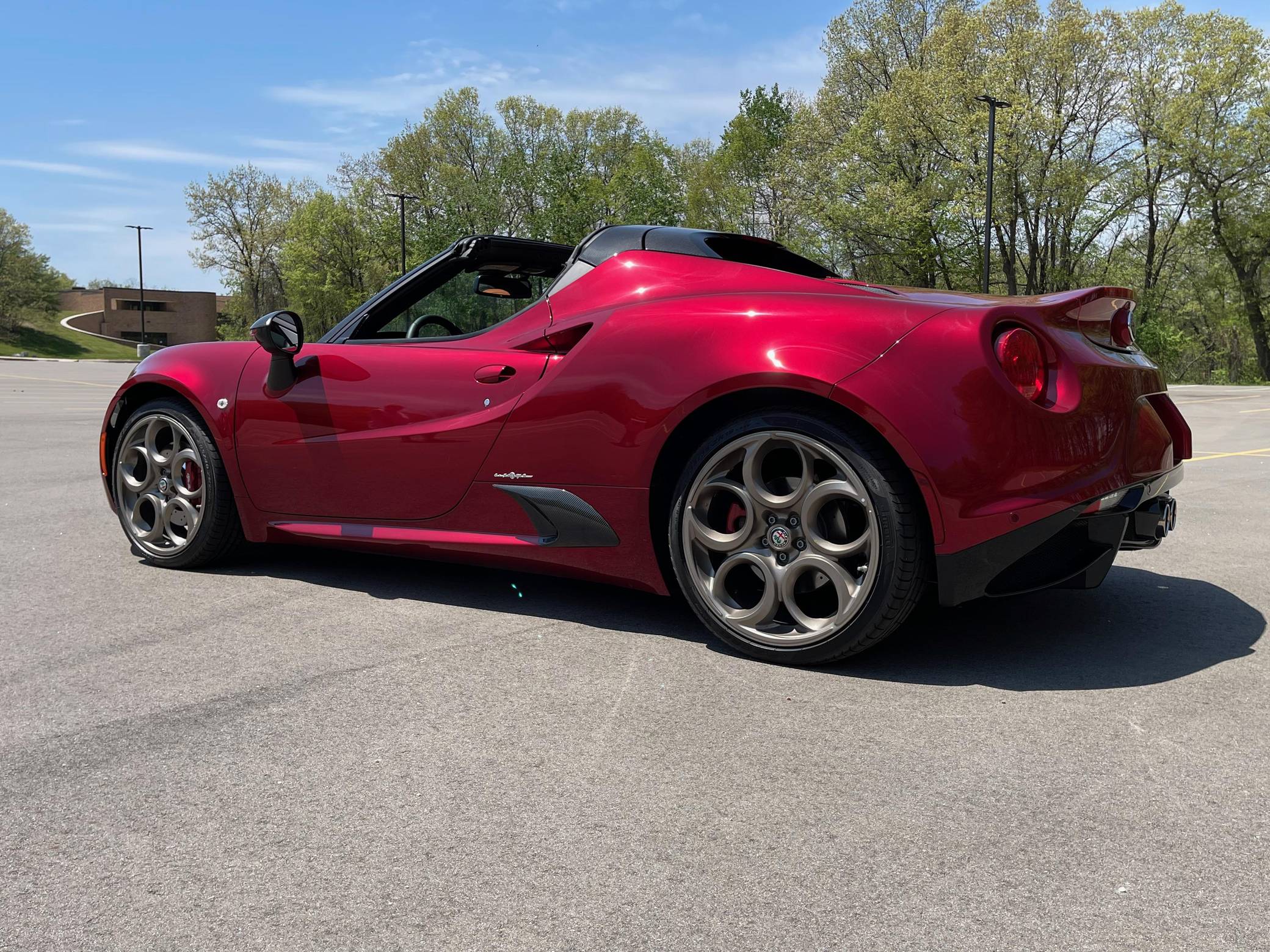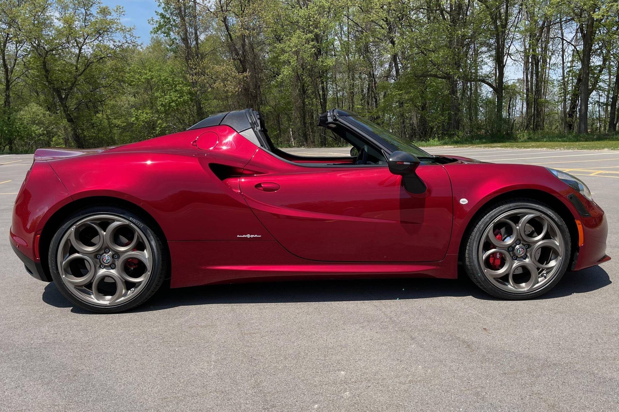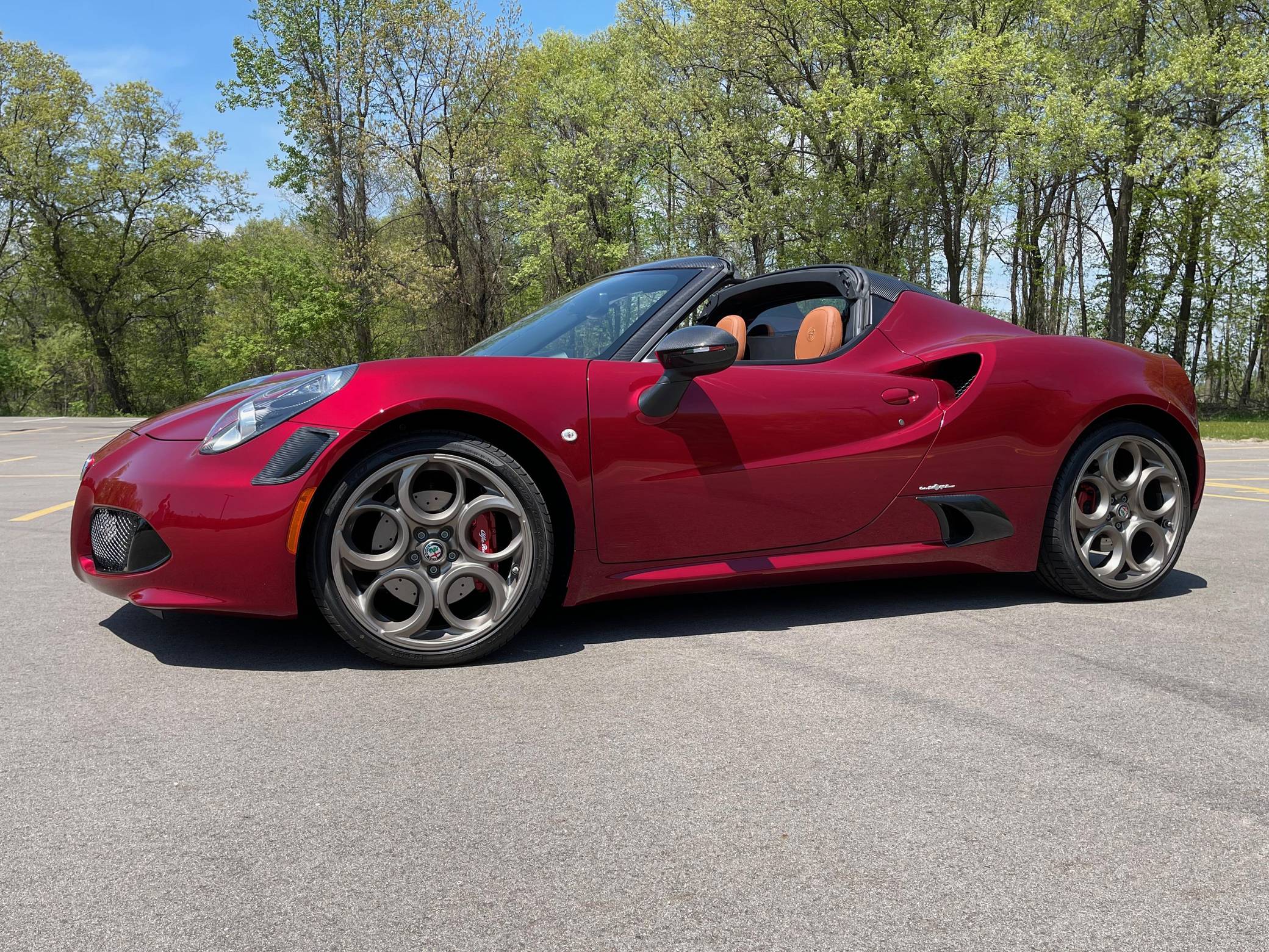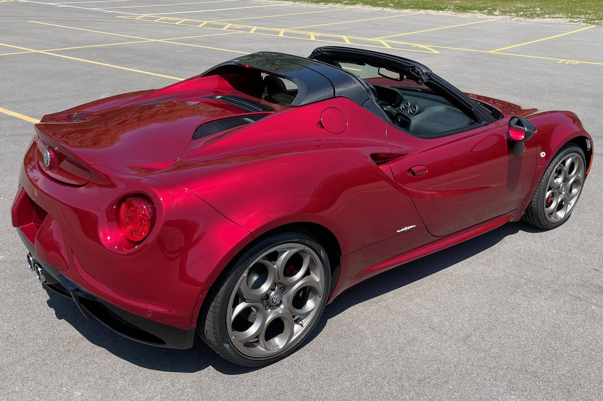2020 Alfa Romeo 4C Spider 33 Stradale Tributo, finished in Rosso Villa D’Este with a black soft top and a black/tobacco interior. This 4C Spider is a limited 33 Stradale Tributo model, and is one of 33 numbered examples for North America. Its odometer currently displays about 450 miles. Modifications reported by the seller are limited to paint-protection film on the front fascia, hood, fenders, headlights, mirror caps, windshield surround, and halo. Alfa Romeo launched the 4C for the 2015 model year to spearhead its long-awaited return to the American market. Offered as a coupe and as a Spider, it arrived as a hand-assembled two-seater built around a carbon-fiber tub. Low weight was this car's design brief, and at under 2,500 pounds, it didn't even need power steering. The special 33 Stradale Tributo edition was launched as a final edition of the small Italian sports car, paying tribute at the same time to the iconic 33 Stradale of the 1960s. Each one of the 33 examples produced is finished in tri-coat Rosso Villa D’Este over a black/tobacco interior, and featured gray-gold 5-hole wheels. This limited edition is also the only 4C Spider ever to be offered with a red-finish carbon fiber tub. Power for this 4C comes from a turbocharged 1. 8-liter inline-4, rated at 237 horsepower and 258 lb-ft of torque. Output is sent to the rear wheels via a 6-speed automatic transmission.