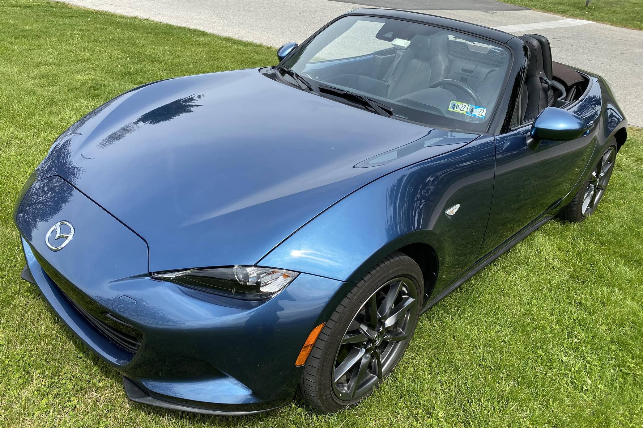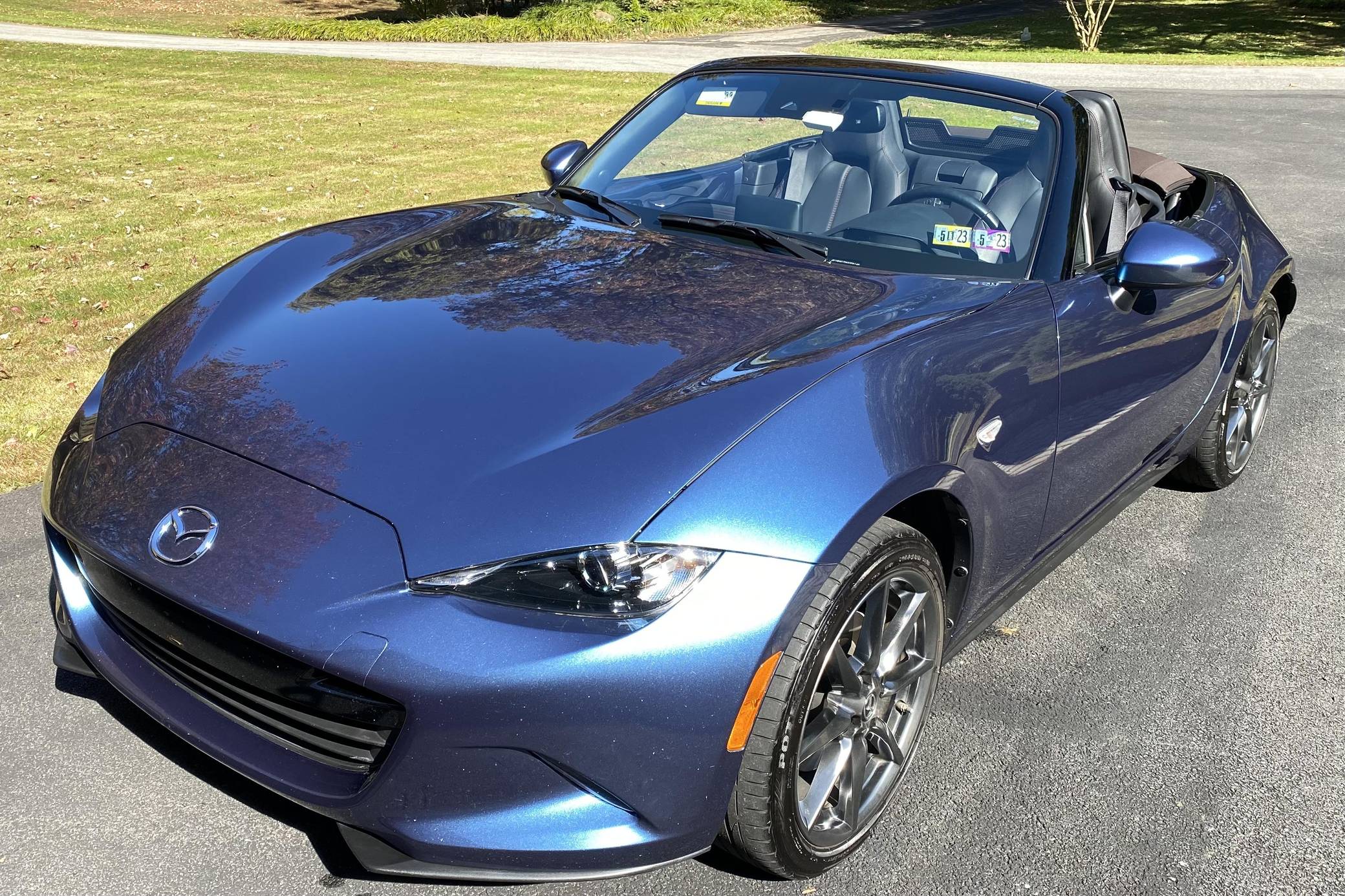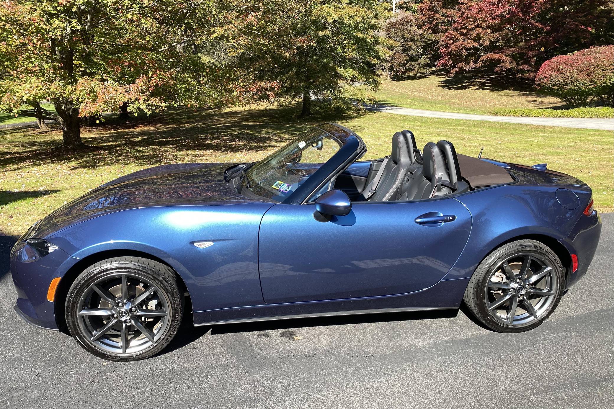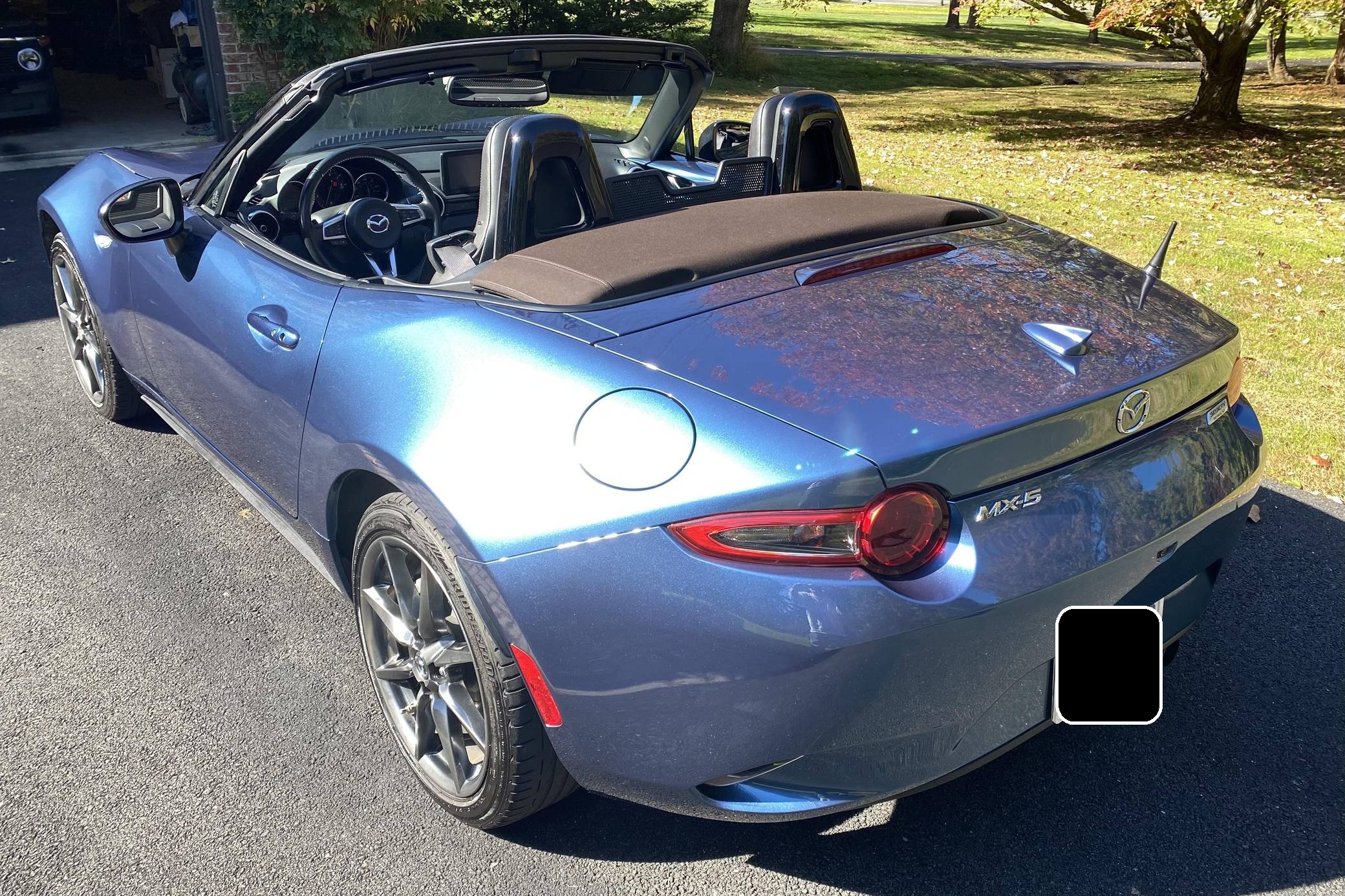 THIS… is a 2019 Mazda MX-5 Miata Grand Touring, finished in Eternal Blue with a brown soft top and a black interior. This Miata features the desirable 6-speed manual transmission. Modifications reported by the seller are limited to a CravenSpeed stubby antenna, a center console shelf, an Apple CarPlay/Android Auto compatibility kit, a warning timer for the turn signals with a footwell light, an ACC power controller, and an automatic roll-up windows controller for the key fob. The ND generation of the Mazda MX-5 Miata debuted for the 2016 model year, and it strikes a balance as a modern, nicely-appointed roadster that still maintains the intended nature of a Miata as a fun, uncomplicated, lightweight sports car at an accessible price. The "ND2" model debuted for the 2019 model year and included revisions to the engine with more power and a higher redline, a telescoping steering column, revised seat controls, a new cupholder, reverse camera, and a redesigned door handle mechanism. Power comes from a 2. 0-liter inline-4 engine, rated at 181 horsepower and 151 lb-ft of torque. Output is sent to the rear wheels via a 6-speed manual transmission.