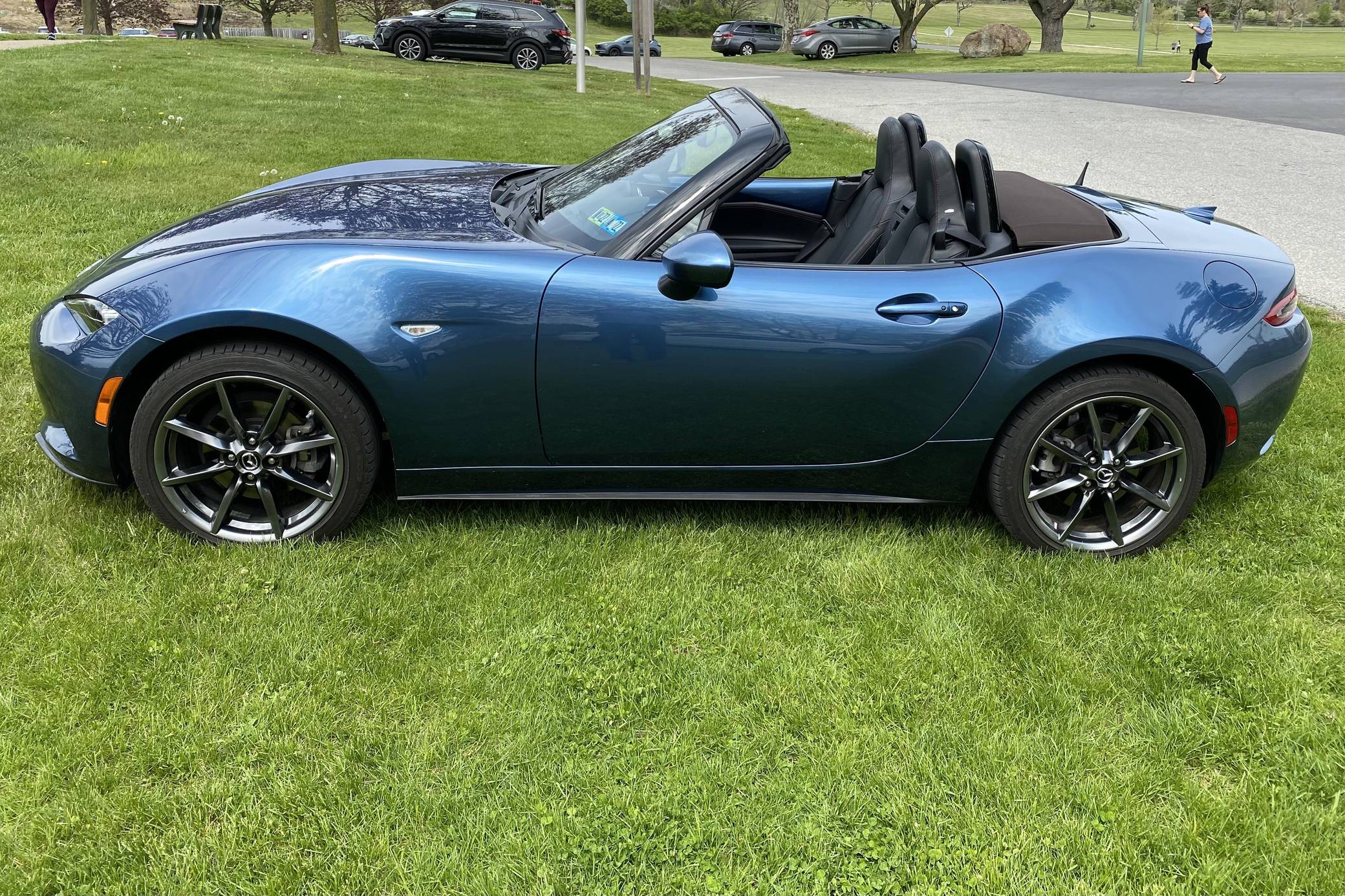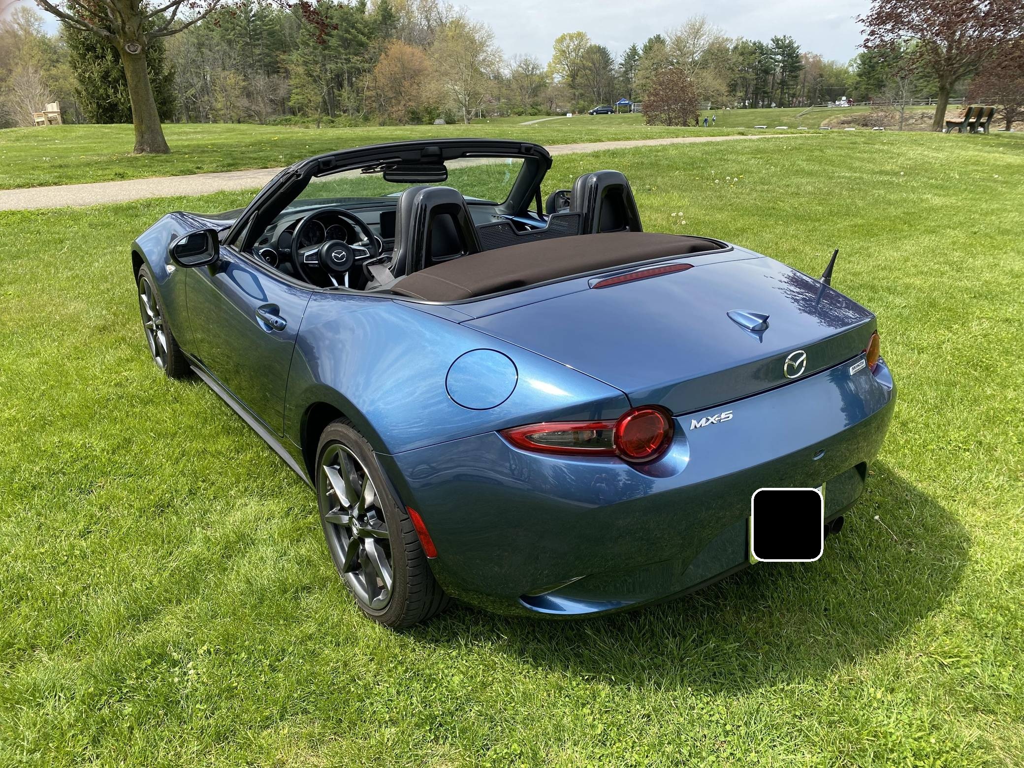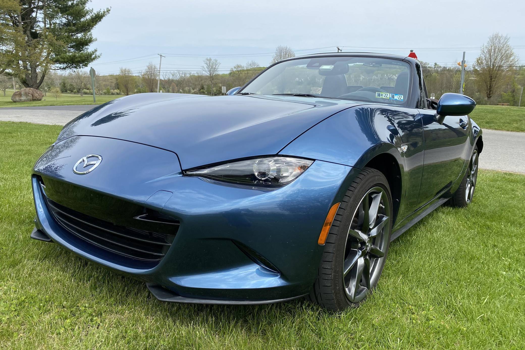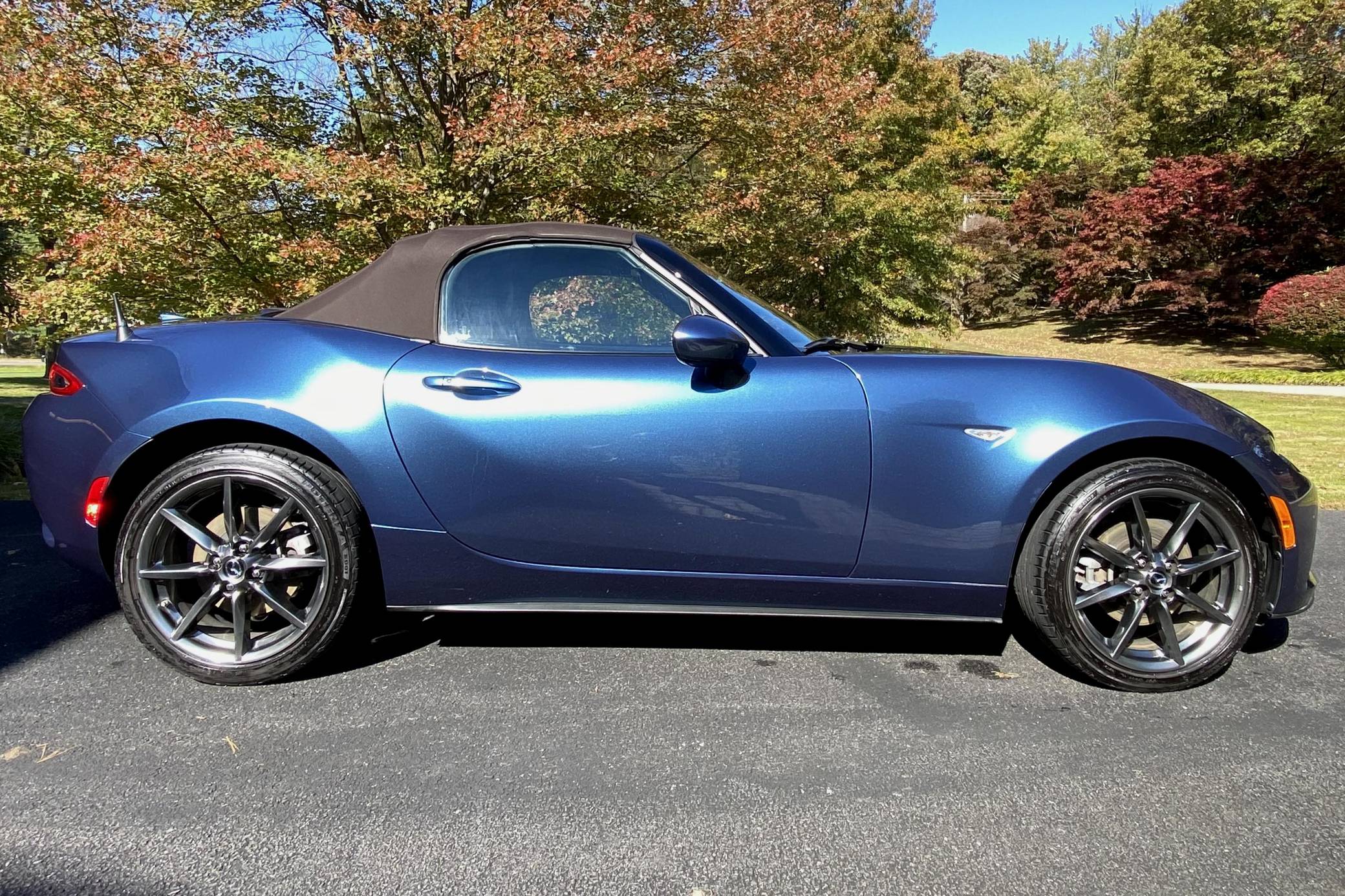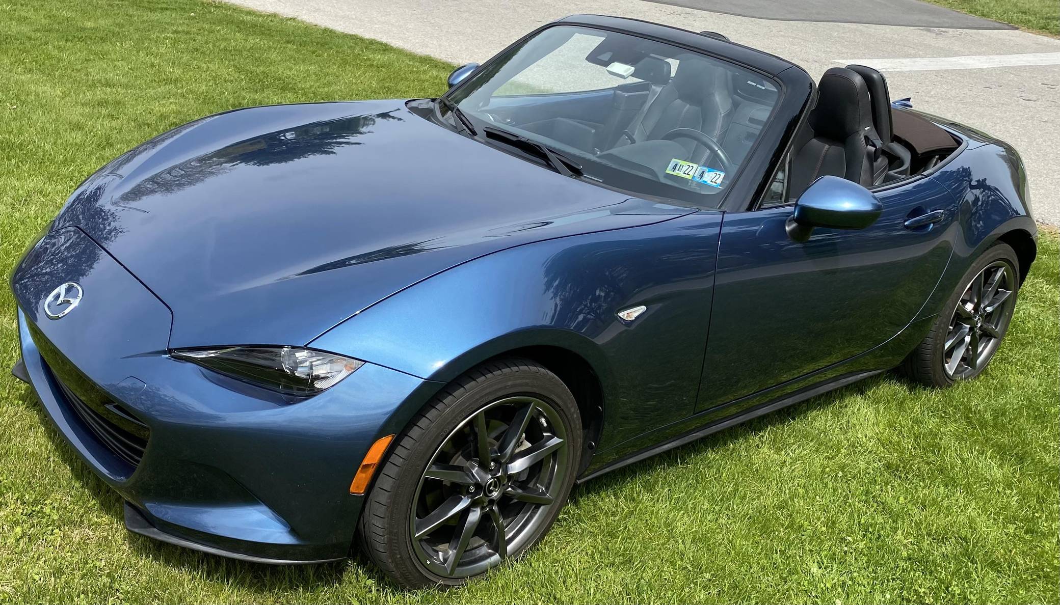 THIS… is a 2019 Mazda MX-5 Miata Grand Touring, finished in Eternal Blue with a brown soft top and a black interior. This Miata features the desirable 6-speed manual transmission. Modifications reported by the seller are limited to a CravenSpeed stubby antenna, a center console shelf, an Apple CarPlay/Android Auto compatibility kit, a warning timer for the turn signals with a footwell light, an ACC power controller, and an automatic roll-up windows controller for the key fob. The ND generation of the Mazda MX-5 Miata debuted for the 2016 model year, and it strikes a balance as a modern, nicely-appointed roadster that still maintains the intended nature of a Miata as a fun, uncomplicated, lightweight sports car at an accessible price. The "ND2" model debuted for the 2019 model year and included revisions to the engine with more power and a higher redline, a telescoping steering column, revised seat controls, a new cupholder, reverse camera, and a redesigned door handle mechanism. Power comes from a 2. 0-liter inline-4 engine, rated at 181 horsepower and 151 lb-ft of torque. Output is sent to the rear wheels via a 6-speed manual transmission.
