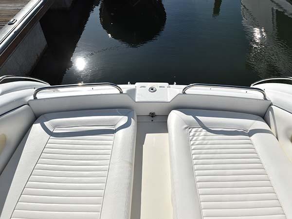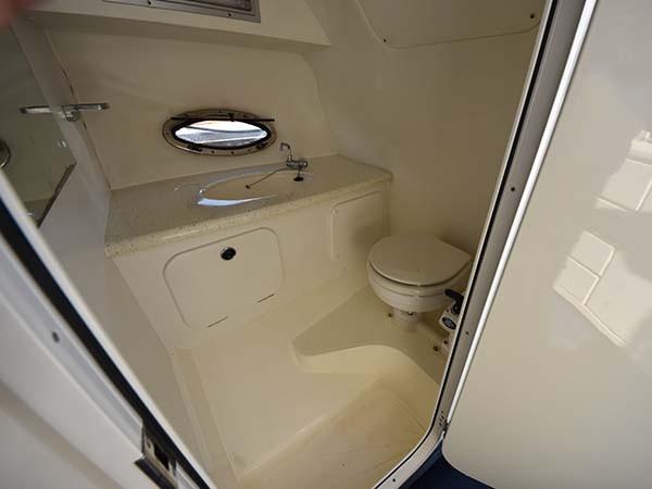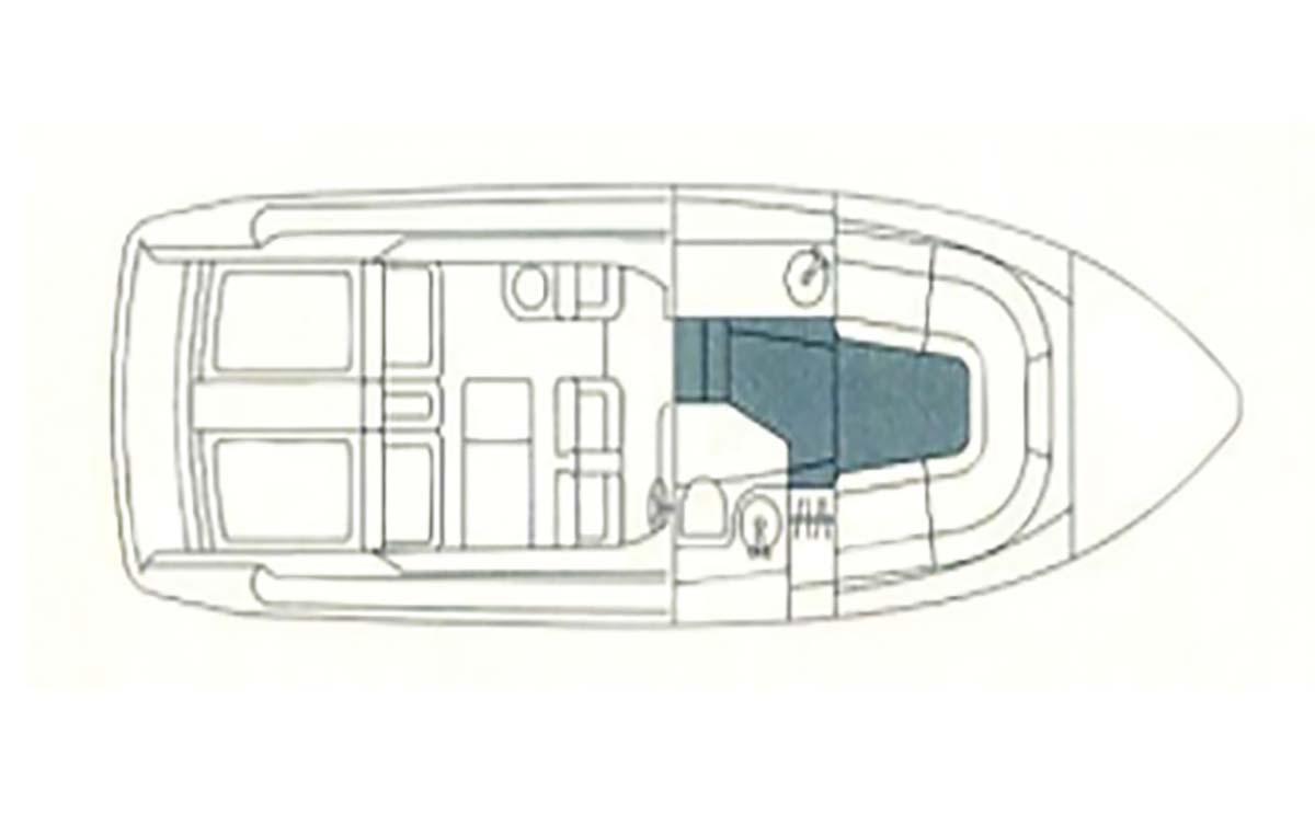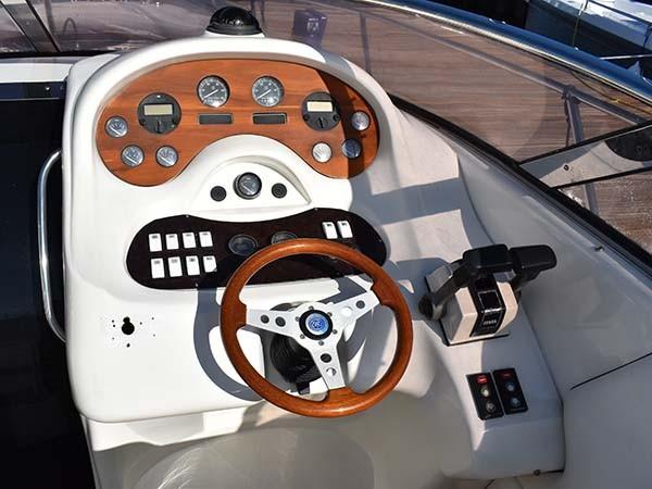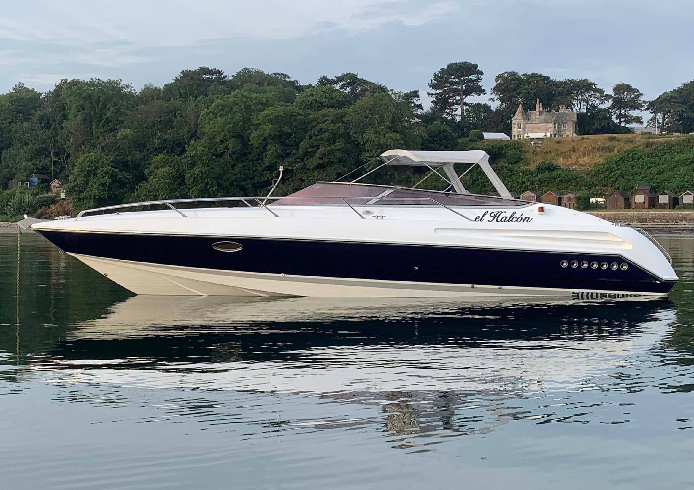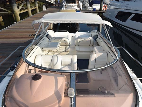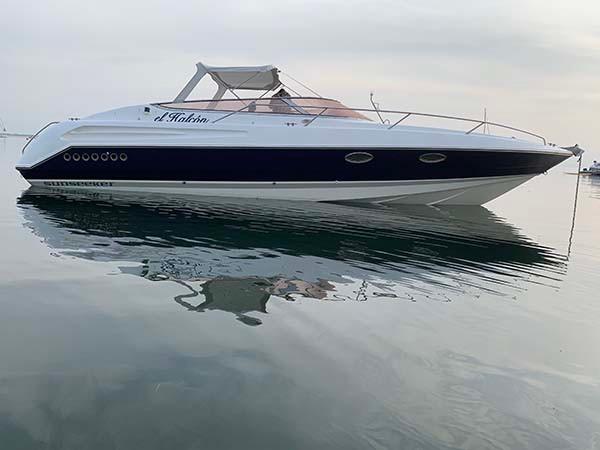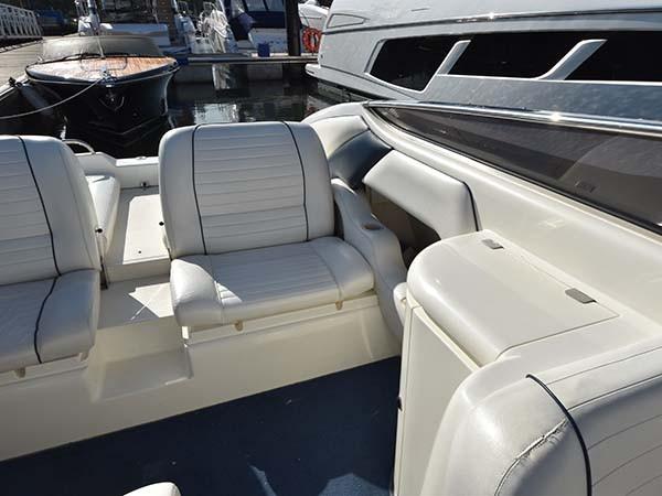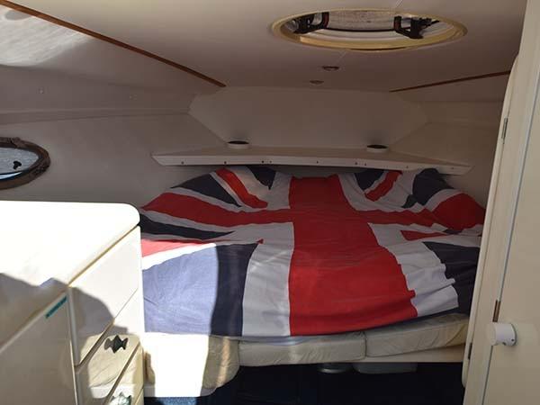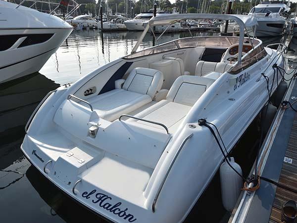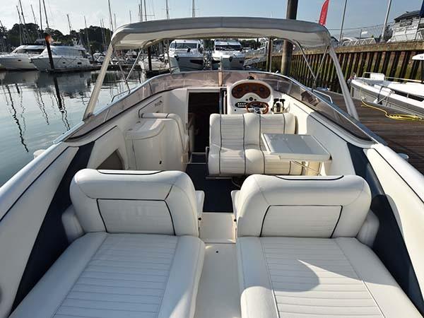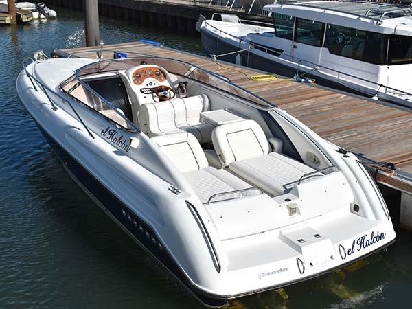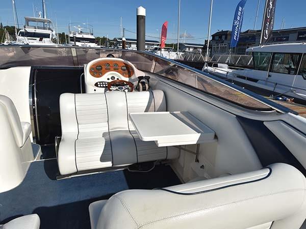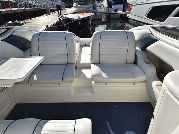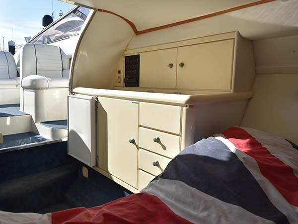 Sunseeker Hawk 31. She is probably one of the best examples of how flexible a Sunseeker can be. She is a lively performer, making her an exciting ski boat but cruising at 23 knots, she has a cruising range of 200 nautical miles, making her a perfect weekender too! This particular example is well-presented and has benefited from an extensive engine and outdrive overhaul, along with recent antifouling. The cleverly designed seating around the dining table in the saloon below converts into a comfortable double berth. Hanging wardrobe, reading lights, opening portholes, and a deck hatch. Galley with a cold pressurized water system, 2-ring hob, stainless steel sink, refrigerator, and cupboards. Heads compartment with manual sea toilet, freshwater, washbasin, mirror, toothbrush and glass holder, towel ring, overhead lights, and opening porthole with mosquito screen. In the cockpit, the headrests on the double aft sun-loungers are reversible, forming two comfortable seats around the folding dining table. There is a wet bar, swimming ladder, and aft shower, so for seeking the sun, she is just about perfect!