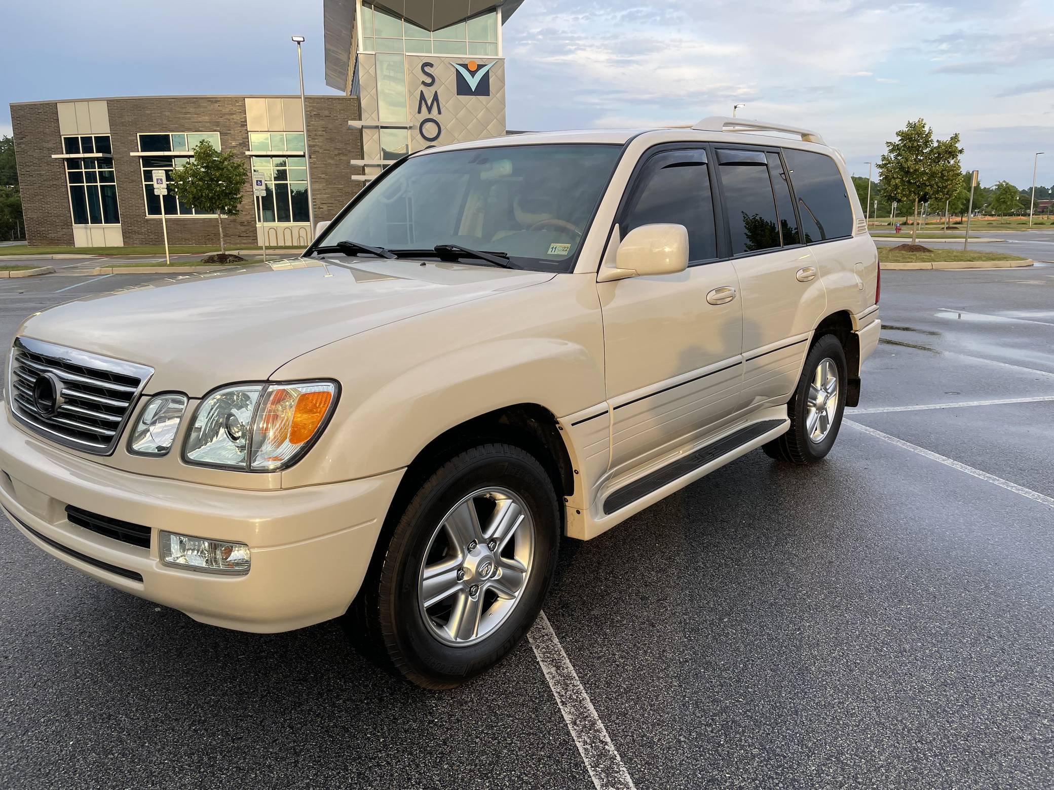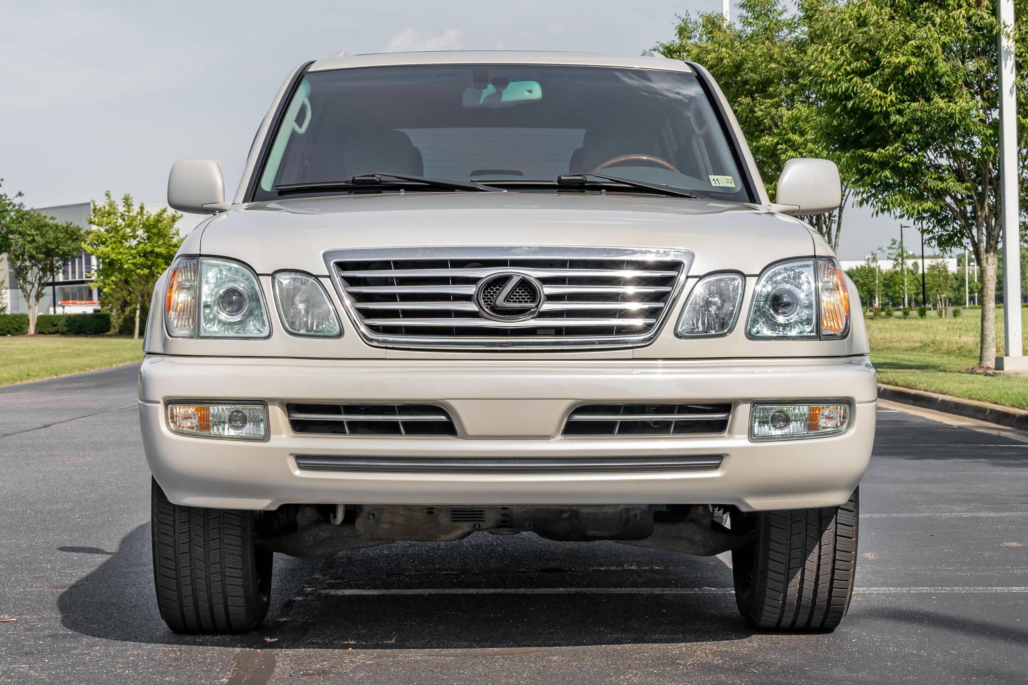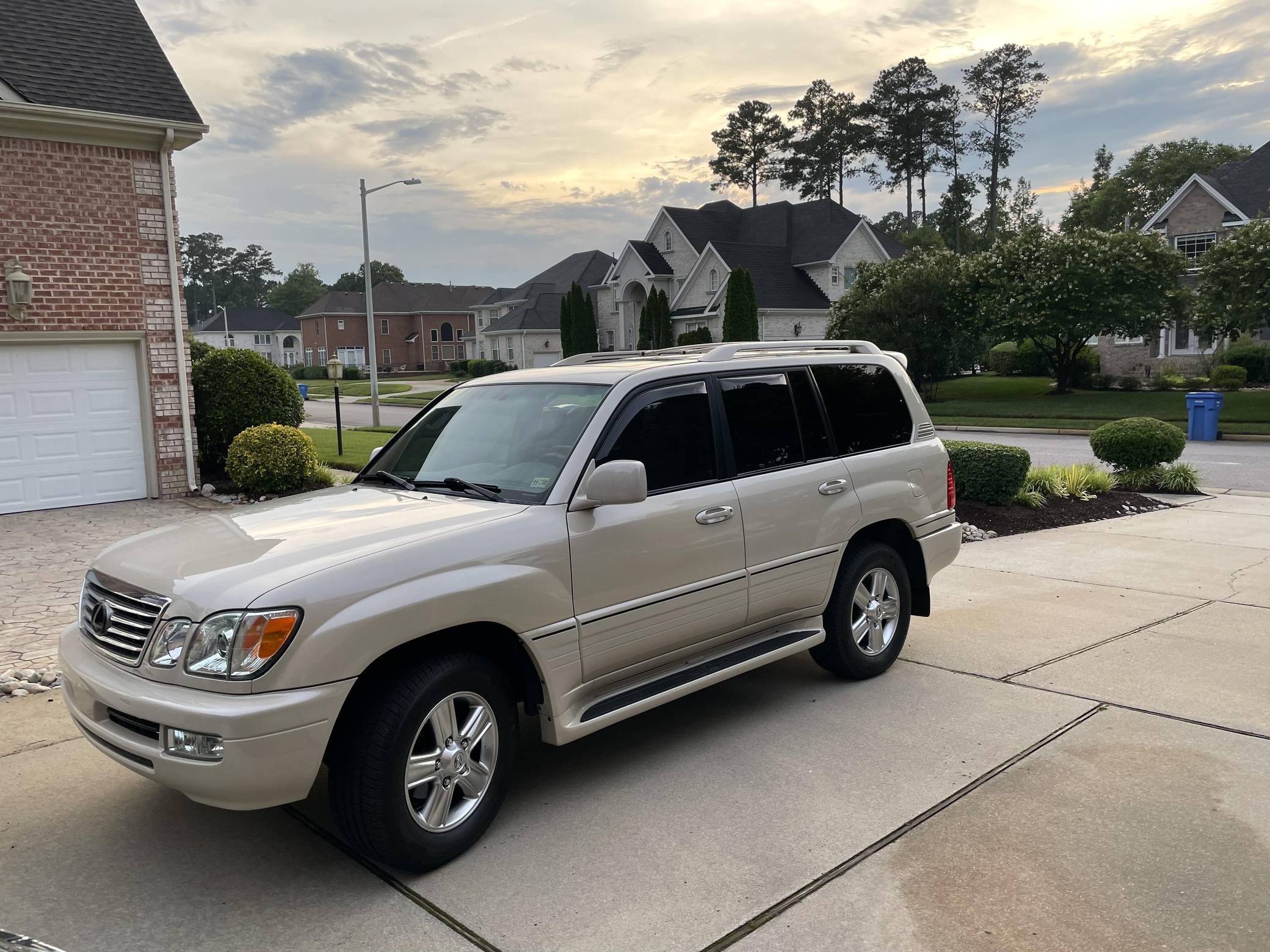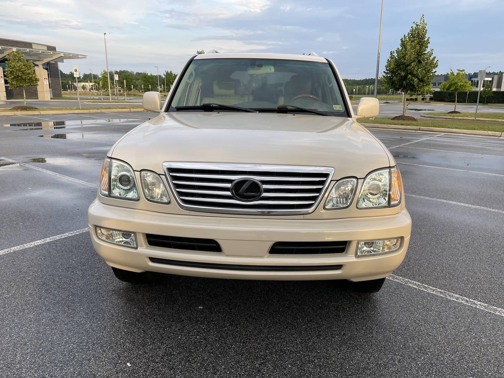 2006 Lexus LX 470, finished in Sand Dollar Pearl with an Ivory interior. The odometer currently displays approximately 83,100 miles. According to the build sheet provided in the gallery, factory equipment includes a locking center differential, Adjustable Height Control (AHC), body-colored running boards, leather upholstery, wooden interior trim, front and rear automatic climate control, and a Mark Levinson audio system. Modifications reported by the seller are limited to tinted windows, WeatherTech side window rain guards, and black plasti dip on the front and rear emblems as well as the side trim strips. Lexus introduced the second-generation LX for the 1998 model year. Like its predecessor, the LX 470 was a more upmarket evolution of the Toyota Land Cruiser that offered a well-balanced blend of on-road comfort and off-road capacity, plus unique exterior styling cues (like quad headlights) and a luxurious interior. It remained in production until 2007. Power comes from a "2UZ-FE" 4. 7-liter V8, rated at 275 horsepower and 332 lb-ft of torque. Output is sent to all four wheels through a 5-speed automatic transmission and a 2-speed transfer case.
