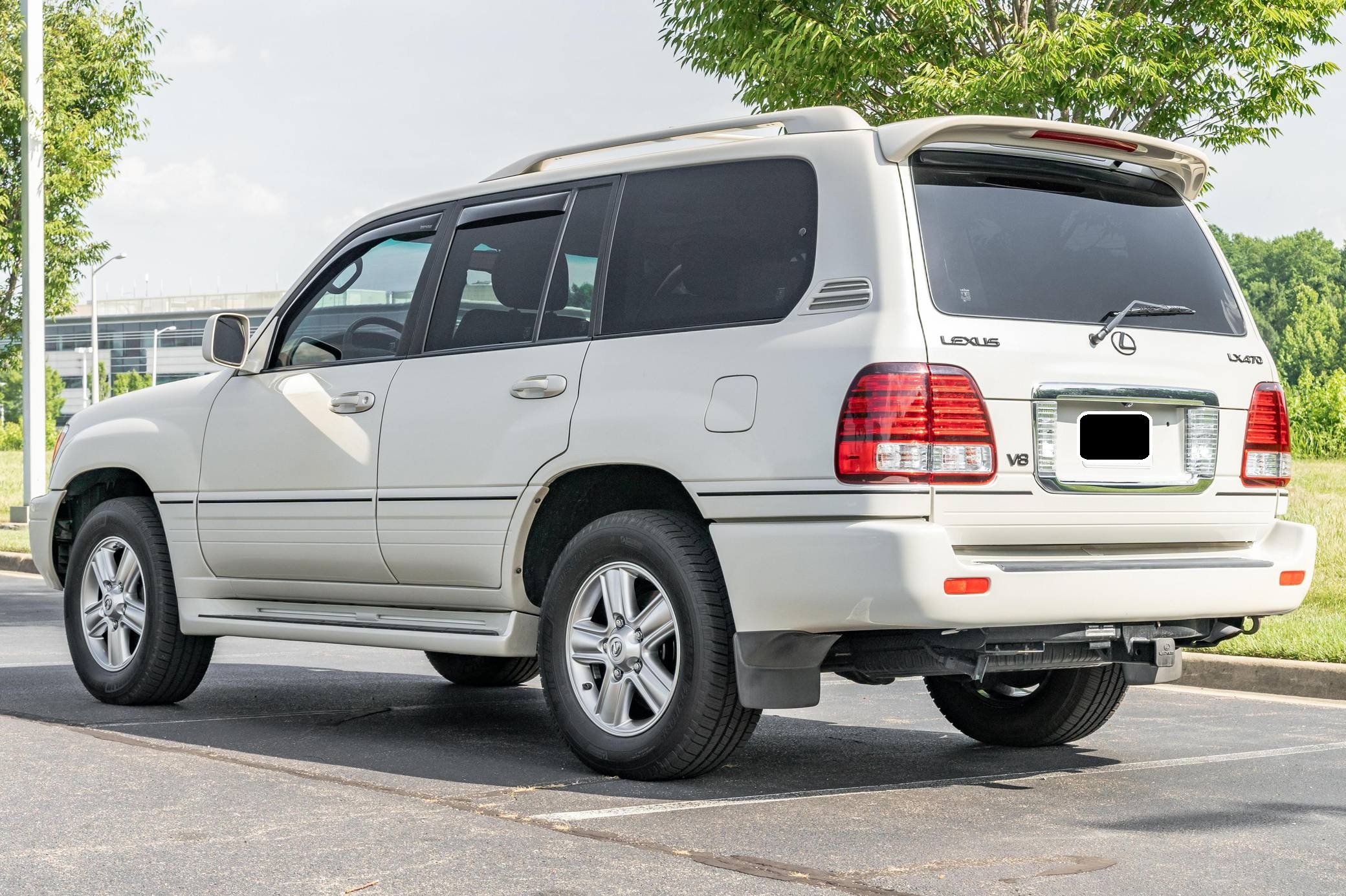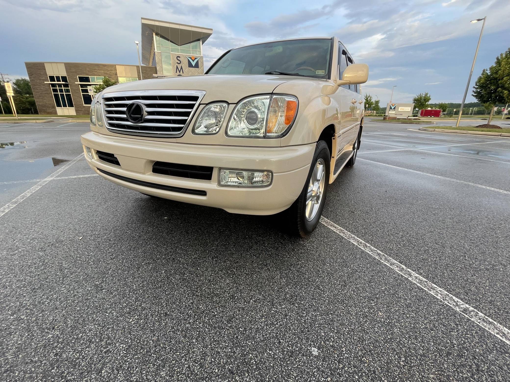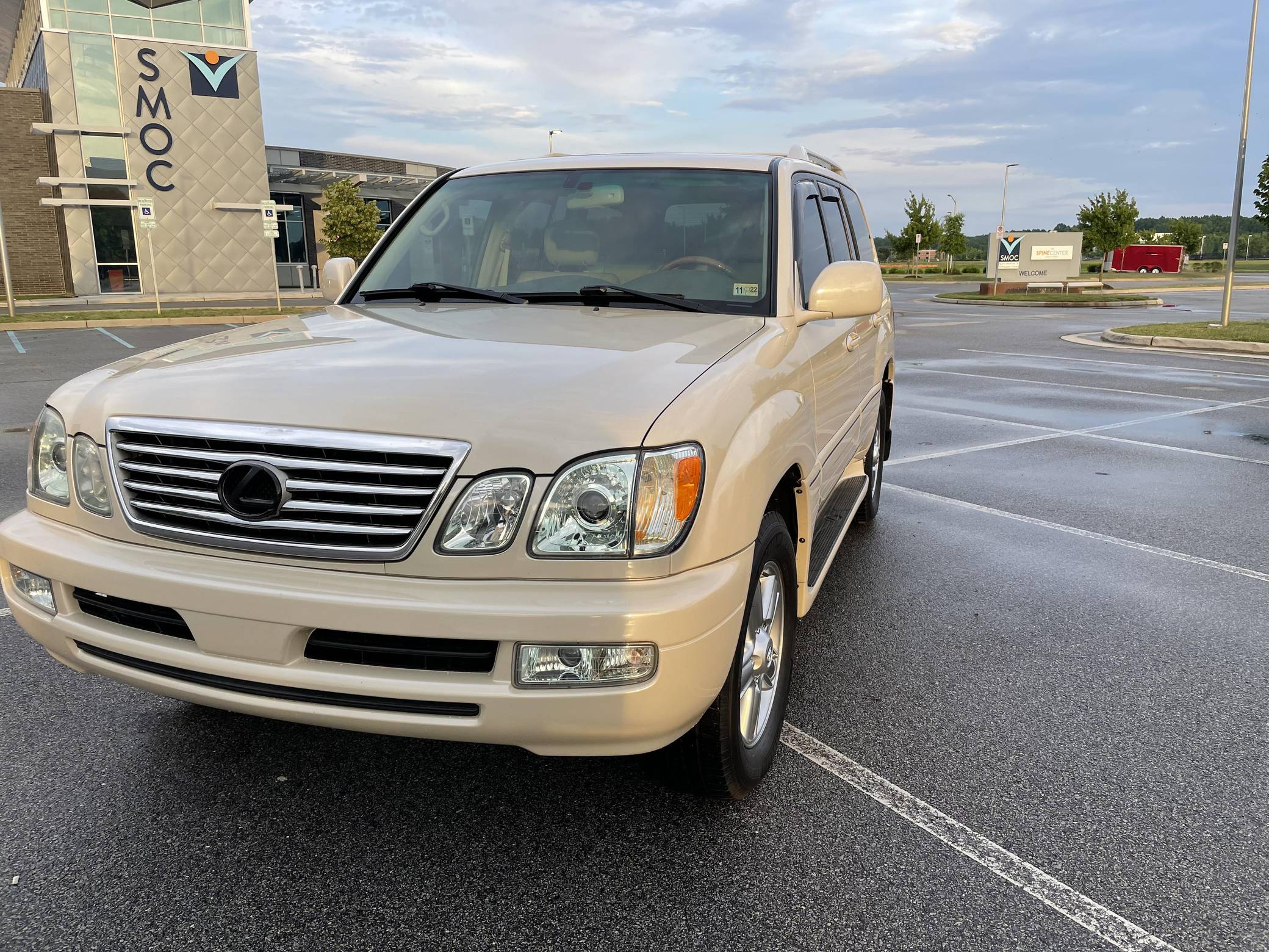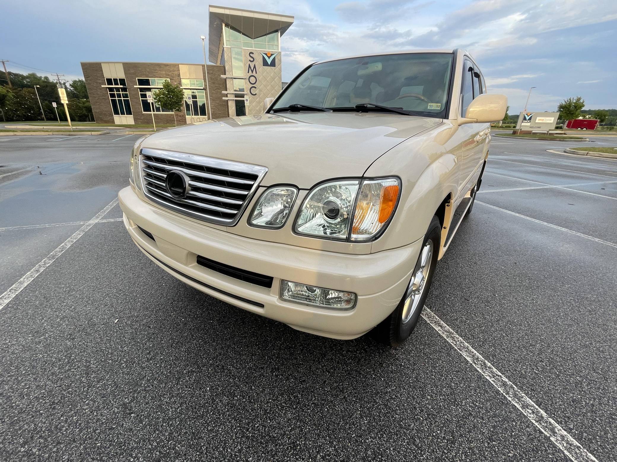 2006 Lexus LX 470, finished in Sand Dollar Pearl with an Ivory interior. The odometer currently displays approximately 83,100 miles. According to the build sheet provided in the gallery, factory equipment includes a locking center differential, Adjustable Height Control (AHC), body-colored running boards, leather upholstery, wooden interior trim, front and rear automatic climate control, and a Mark Levinson audio system. Modifications reported by the seller are limited to tinted windows, WeatherTech side window rain guards, and black plasti dip on the front and rear emblems as well as the side trim strips. Lexus introduced the second-generation LX for the 1998 model year. Like its predecessor, the LX 470 was a more upmarket evolution of the Toyota Land Cruiser that offered a well-balanced blend of on-road comfort and off-road capacity, plus unique exterior styling cues (like quad headlights) and a luxurious interior. It remained in production until 2007. Power comes from a "2UZ-FE" 4. 7-liter V8, rated at 275 horsepower and 332 lb-ft of torque. Output is sent to all four wheels through a 5-speed automatic transmission and a 2-speed transfer case.