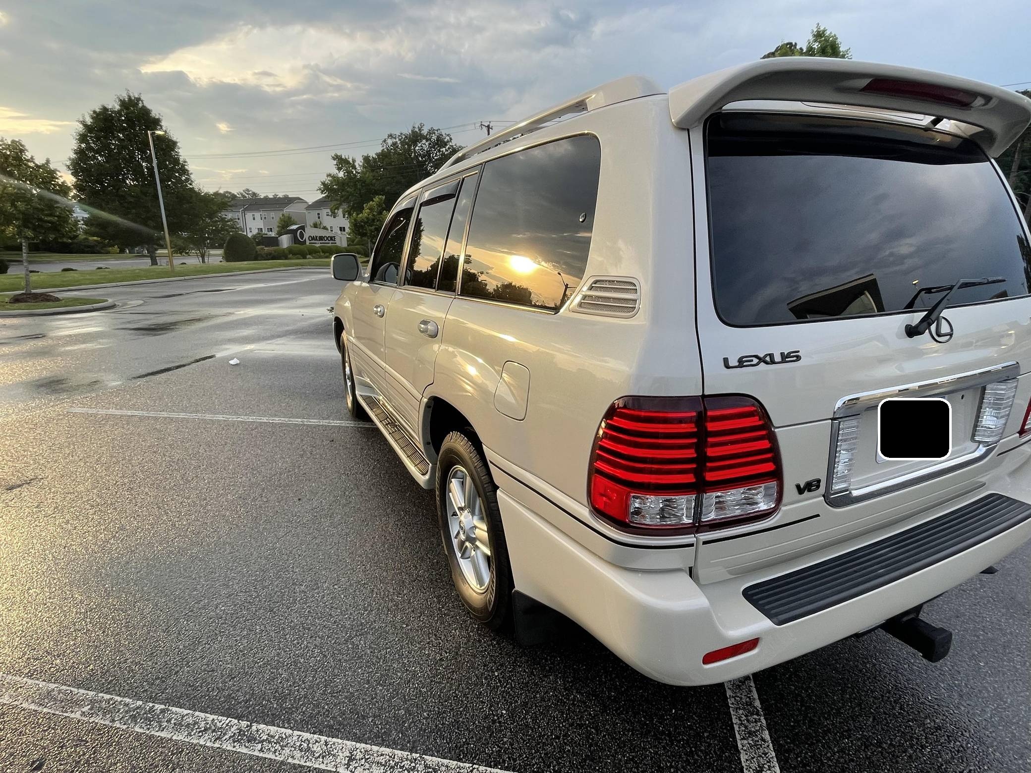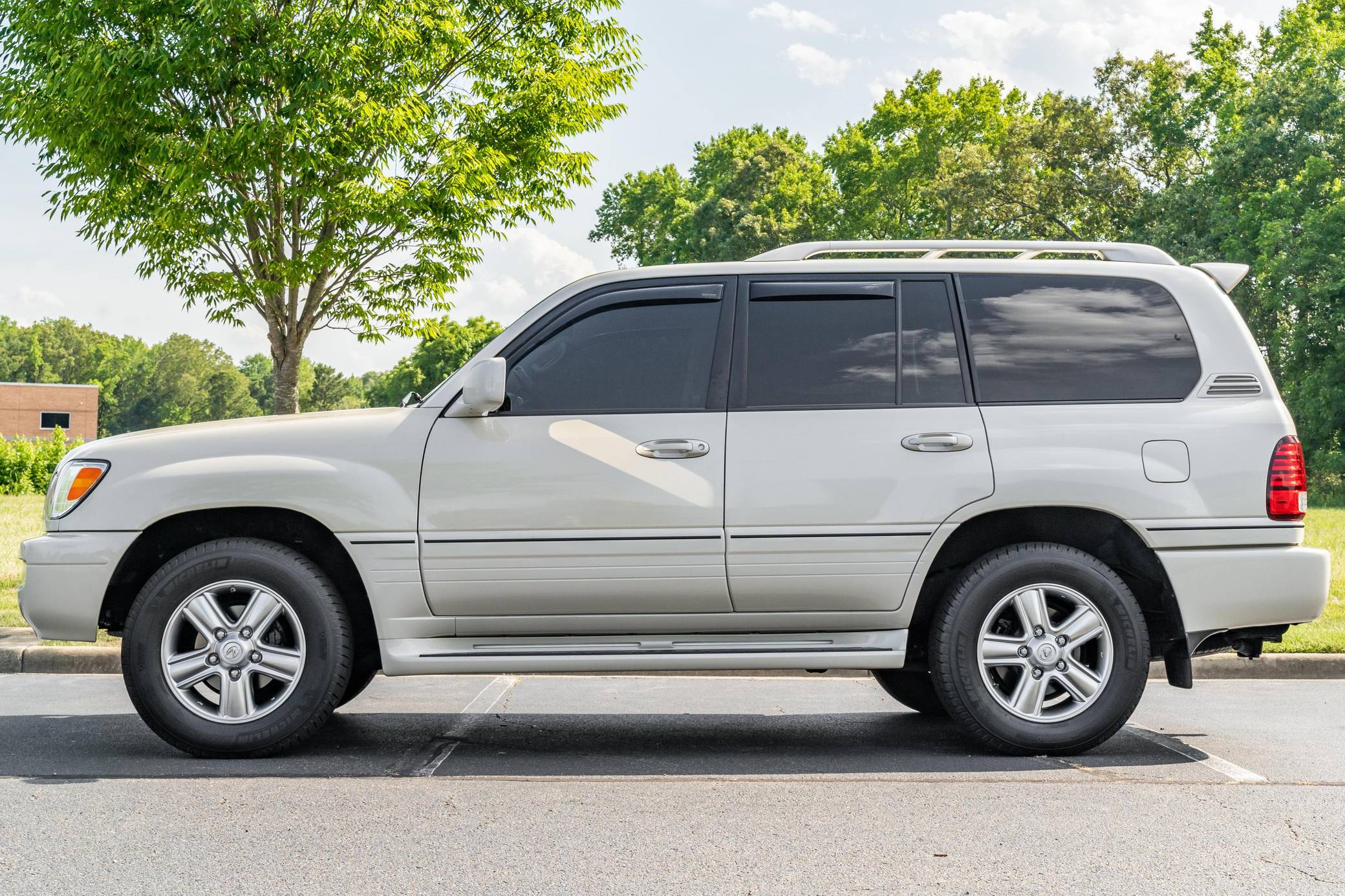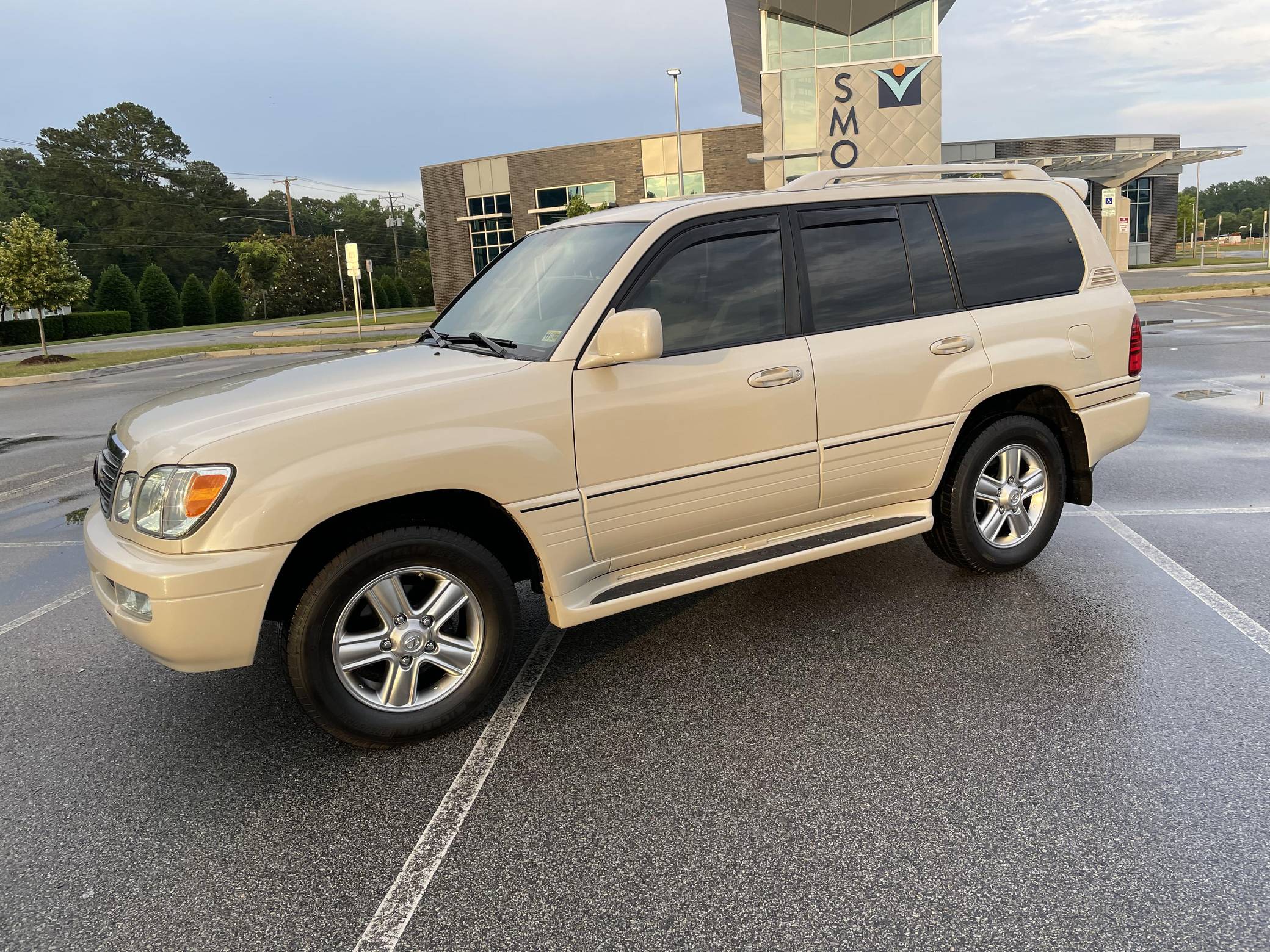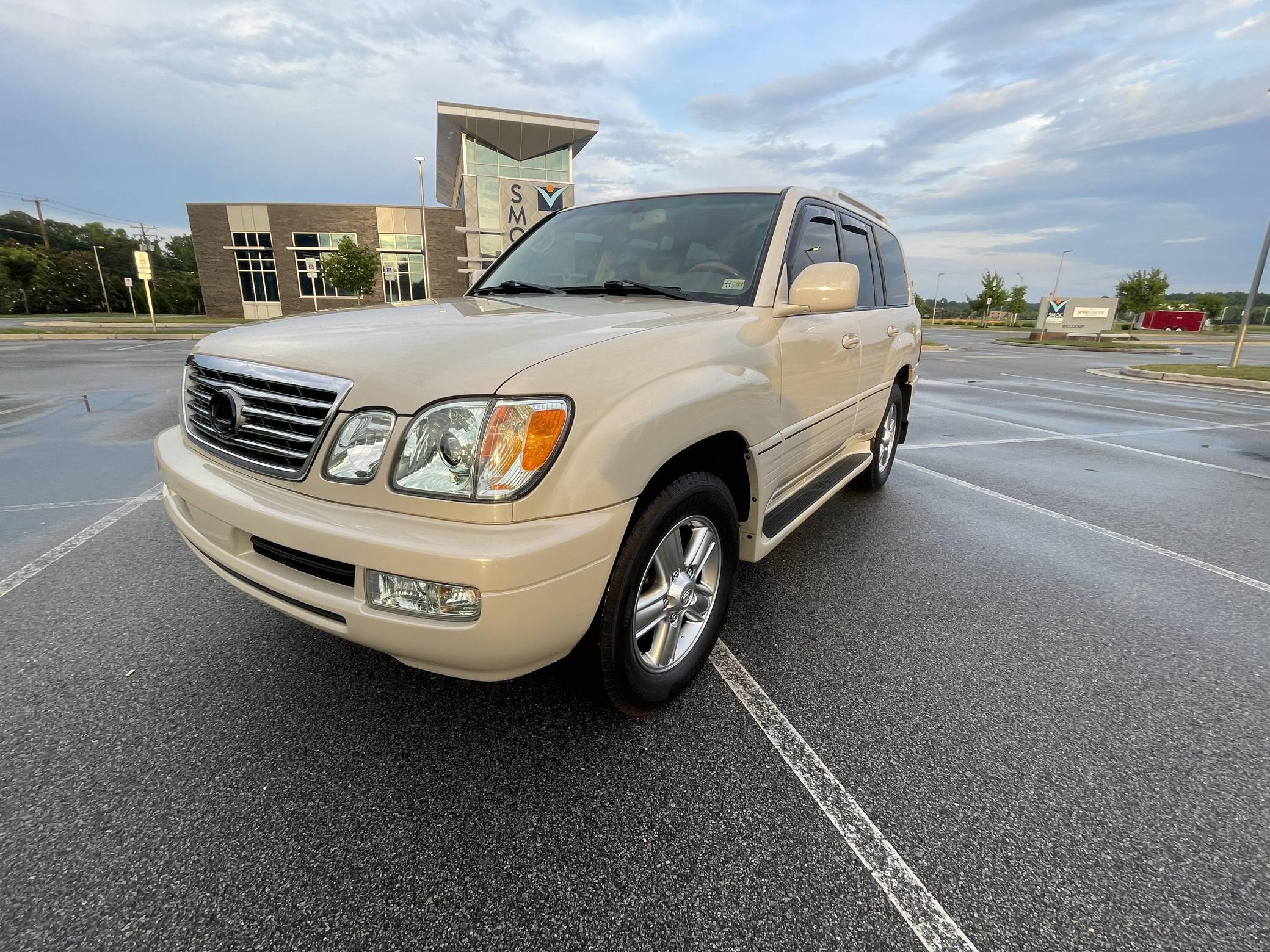 2006 Lexus LX 470, finished in Sand Dollar Pearl with an Ivory interior. The odometer currently displays approximately 83,100 miles. According to the build sheet provided in the gallery, factory equipment includes a locking center differential, Adjustable Height Control (AHC), body-colored running boards, leather upholstery, wooden interior trim, front and rear automatic climate control, and a Mark Levinson audio system. Modifications reported by the seller are limited to tinted windows, WeatherTech side window rain guards, and black plasti dip on the front and rear emblems as well as the side trim strips. Lexus introduced the second-generation LX for the 1998 model year. Like its predecessor, the LX 470 was a more upmarket evolution of the Toyota Land Cruiser that offered a well-balanced blend of on-road comfort and off-road capacity, plus unique exterior styling cues (like quad headlights) and a luxurious interior. It remained in production until 2007. Power comes from a "2UZ-FE" 4. 7-liter V8, rated at 275 horsepower and 332 lb-ft of torque. Output is sent to all four wheels through a 5-speed automatic transmission and a 2-speed transfer case.