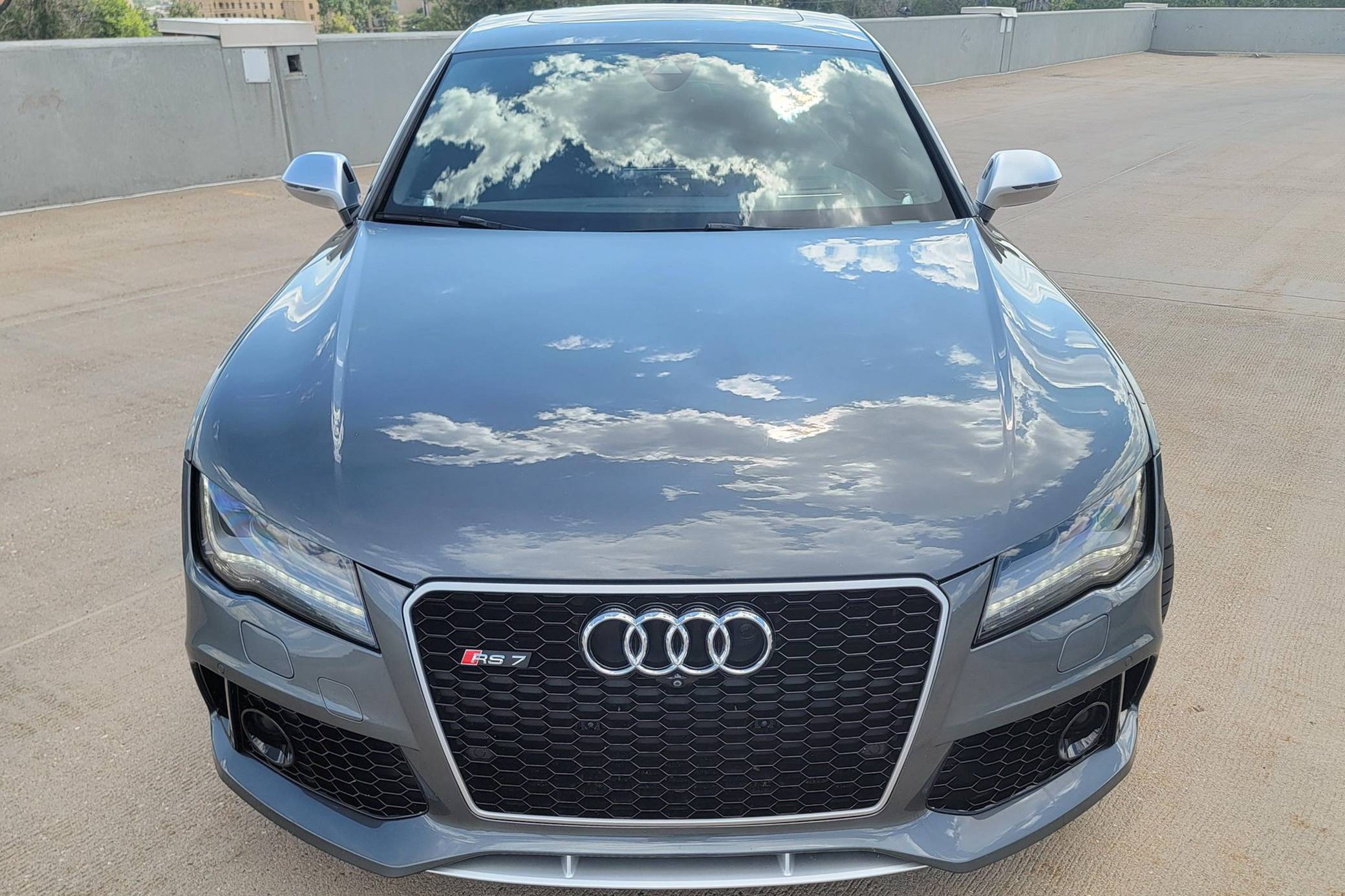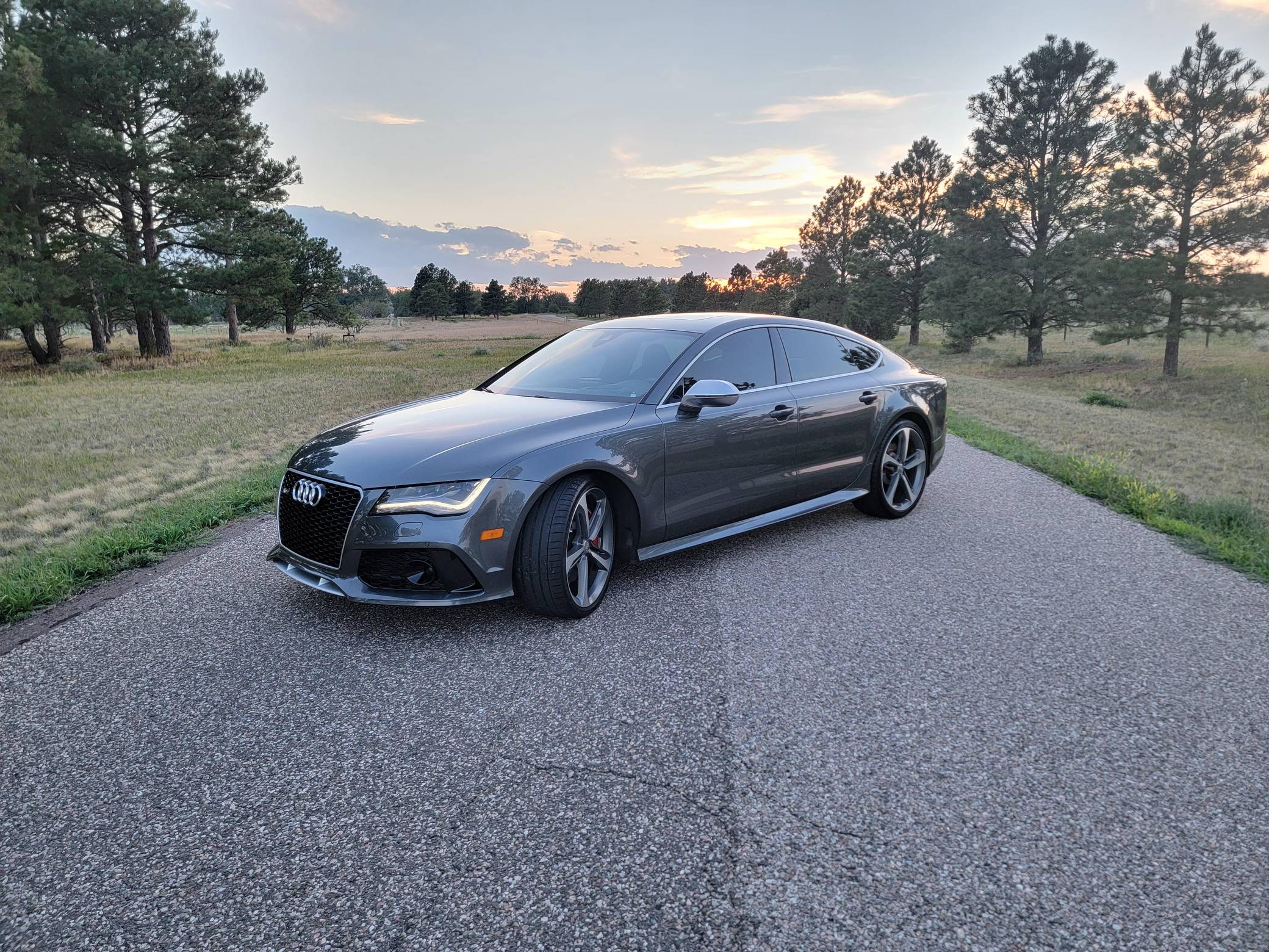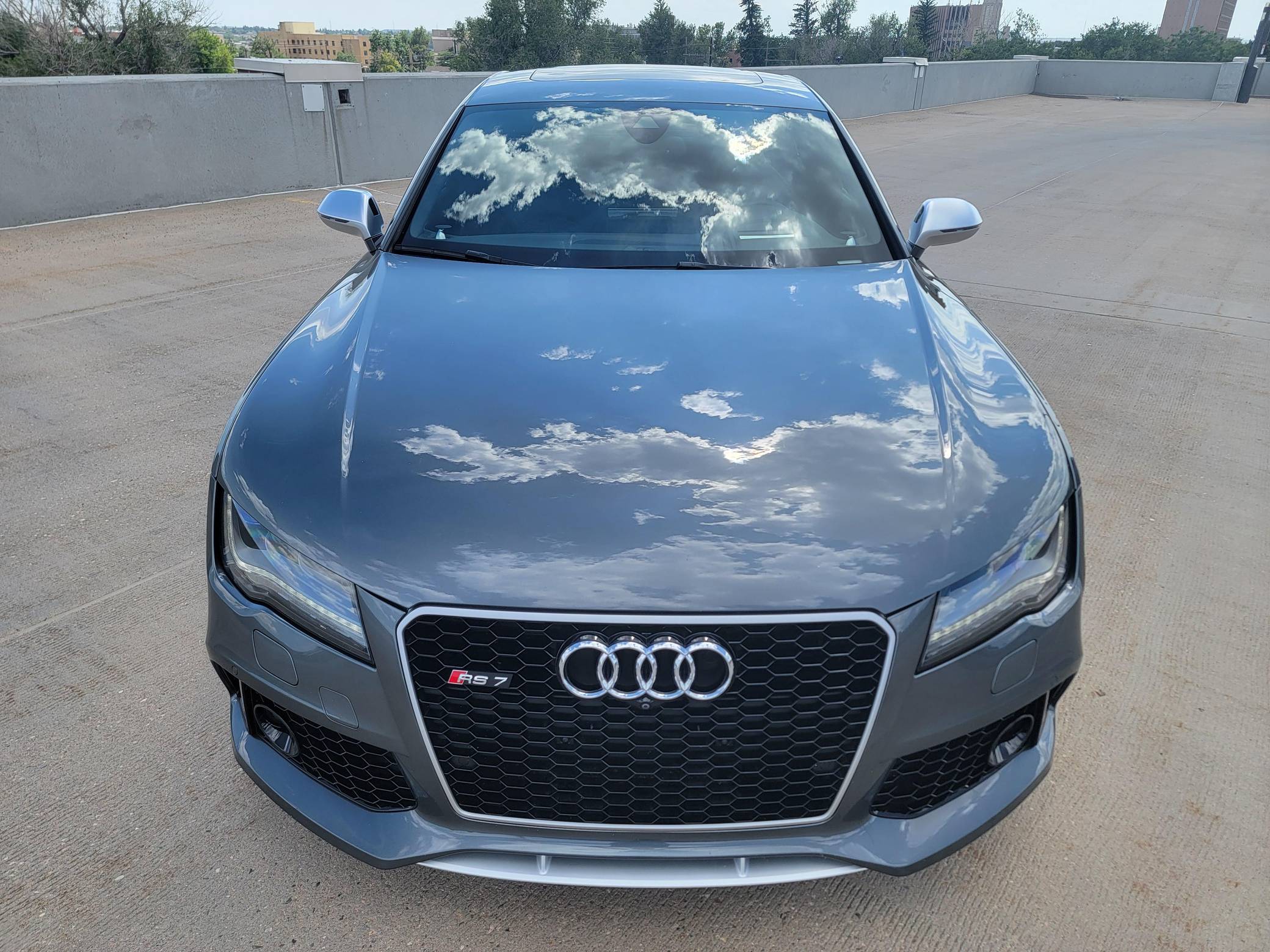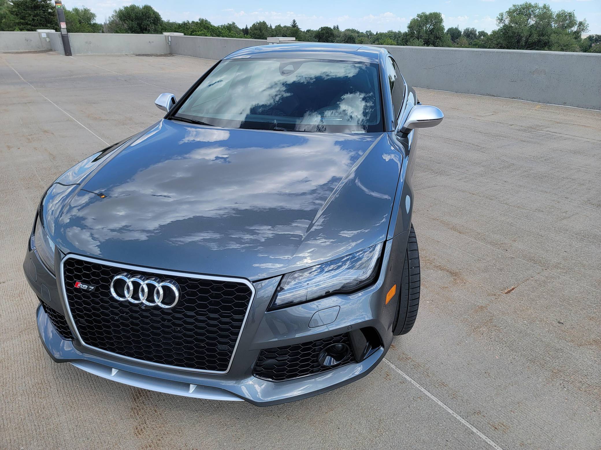 THIS… is a 2014 Audi RS7, finished in Daytona Gray Pearl Effect with a black interior. Factory equipment includes the RS7 Dynamic, Driver Assistance, and Innovation Packages, 21-inch 5-spoke Blade Design wheels, leather upholstery, carbon fiber interior trim, power-adjustable front seats, a Bang & Olufsen advanced sound system, and an Audi MMI Navigation Plus system with MMI Touch. Modifications are limited to tinted windows. Audi introduced the "Type 4G8" A7 in 2010, and the range-topping RS7 variant arrived in 2013. In addition to power upgrades, Audi also added a myriad of high-performance equipment such as 15-inch front brake rotors with 6-piston calipers, Quattro all-wheel-drive with torque vectoring, and a locking center differential, among other RS-specific features. Power comes from a "TFSI" 4. 0-liter twin-turbocharged V8, rated at 560 horsepower and 516 lb-ft of torque. Output is sent to all four wheels via an 8-speed automatic transmission and Audi's Quattro permanent all-wheel-drive system.
