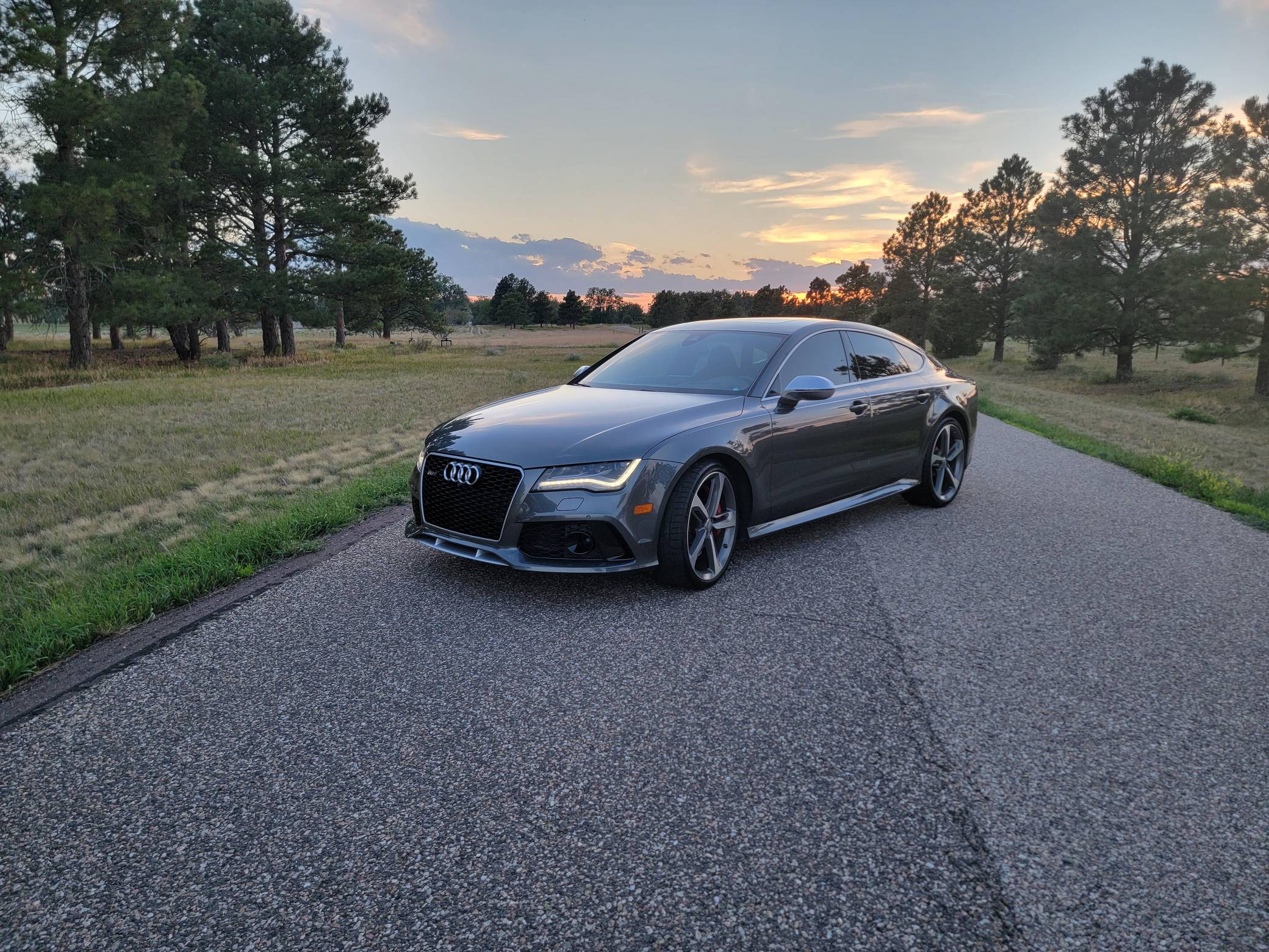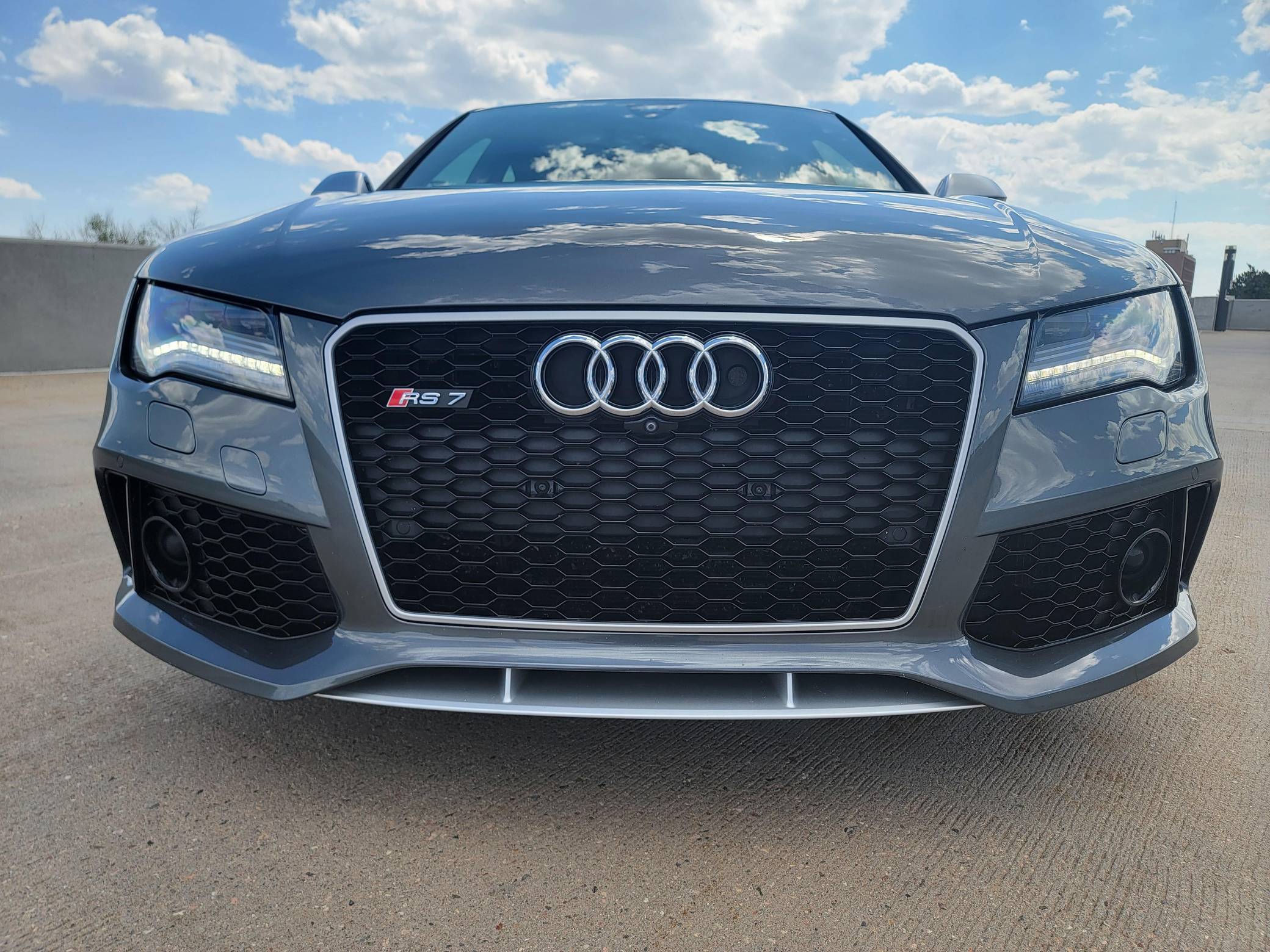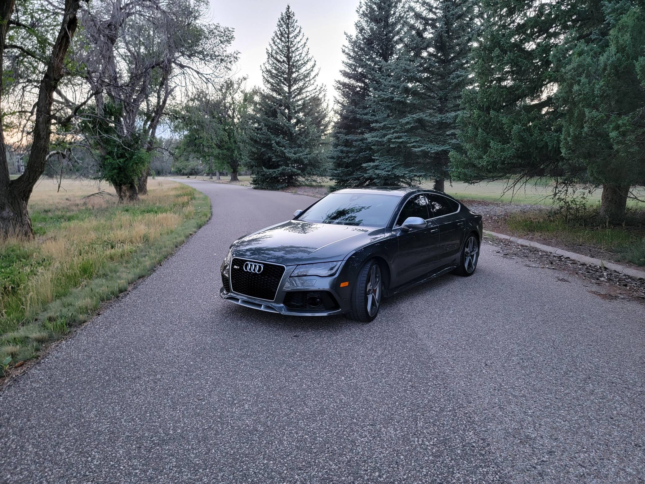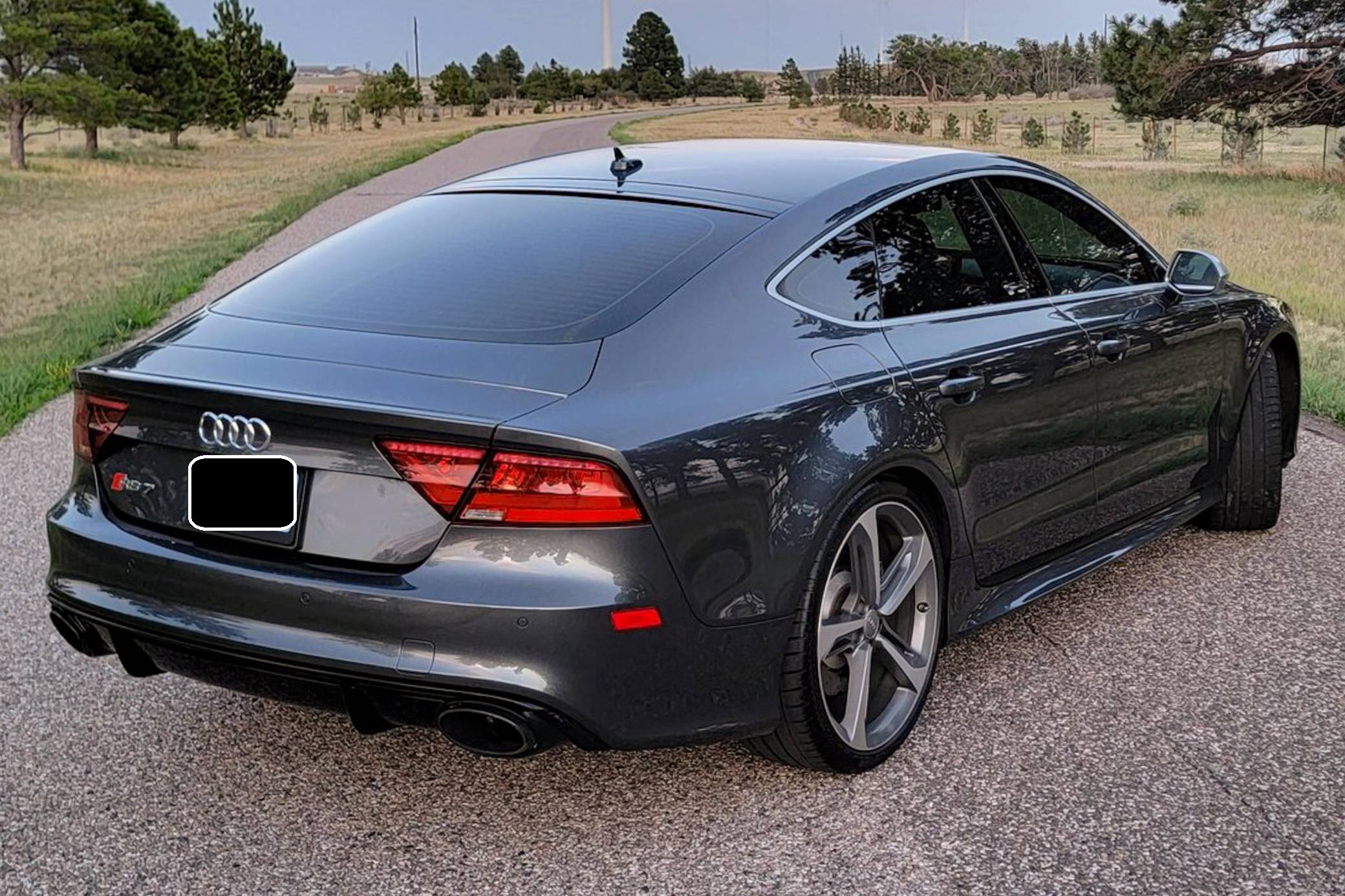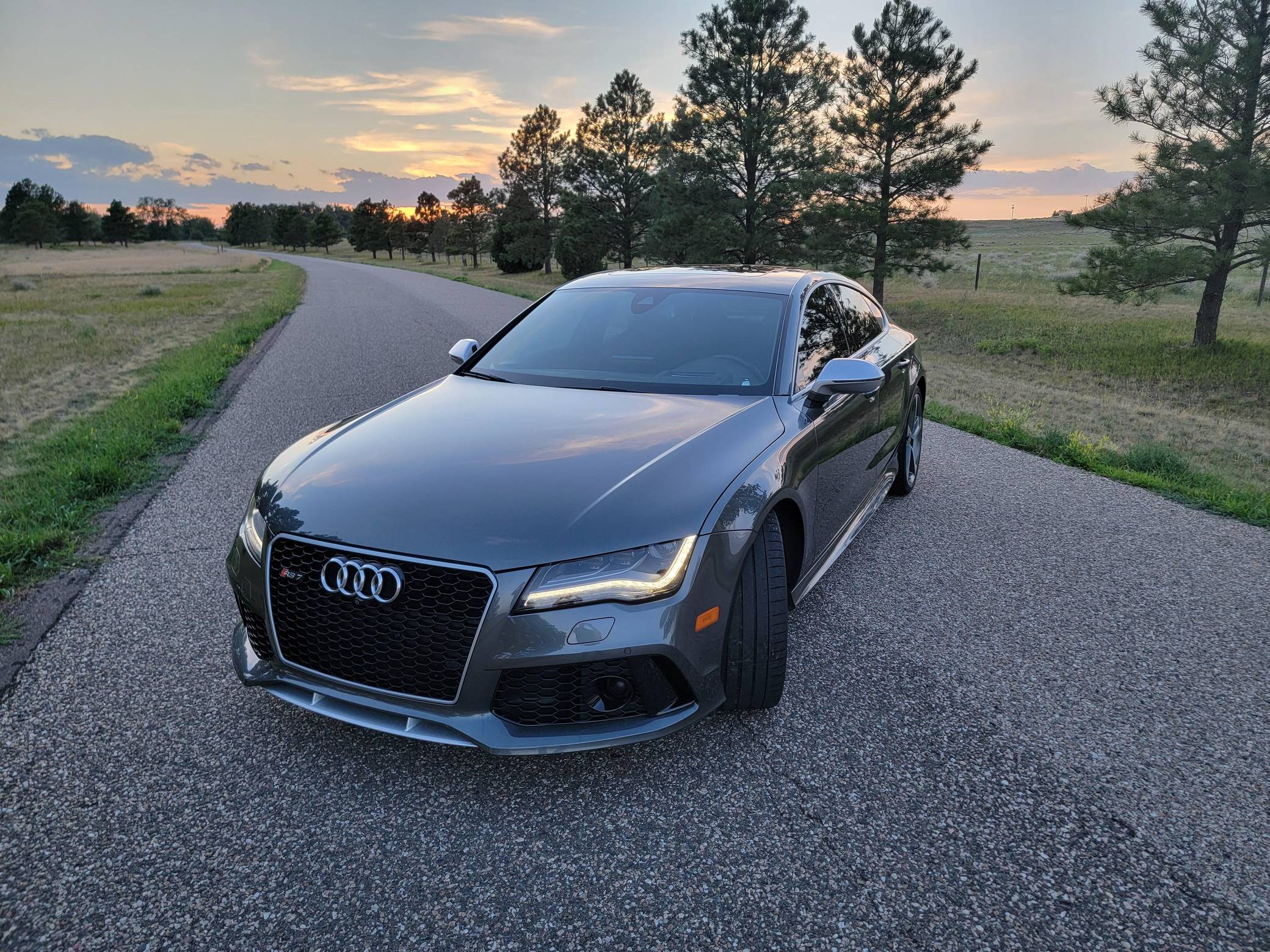 THIS… is a 2014 Audi RS7, finished in Daytona Gray Pearl Effect with a black interior. Factory equipment includes the RS7 Dynamic, Driver Assistance, and Innovation Packages, 21-inch 5-spoke Blade Design wheels, leather upholstery, carbon fiber interior trim, power-adjustable front seats, a Bang & Olufsen advanced sound system, and an Audi MMI Navigation Plus system with MMI Touch. Modifications are limited to tinted windows. Audi introduced the "Type 4G8" A7 in 2010, and the range-topping RS7 variant arrived in 2013. In addition to power upgrades, Audi also added a myriad of high-performance equipment such as 15-inch front brake rotors with 6-piston calipers, Quattro all-wheel-drive with torque vectoring, and a locking center differential, among other RS-specific features. Power comes from a "TFSI" 4. 0-liter twin-turbocharged V8, rated at 560 horsepower and 516 lb-ft of torque. Output is sent to all four wheels via an 8-speed automatic transmission and Audi's Quattro permanent all-wheel-drive system.