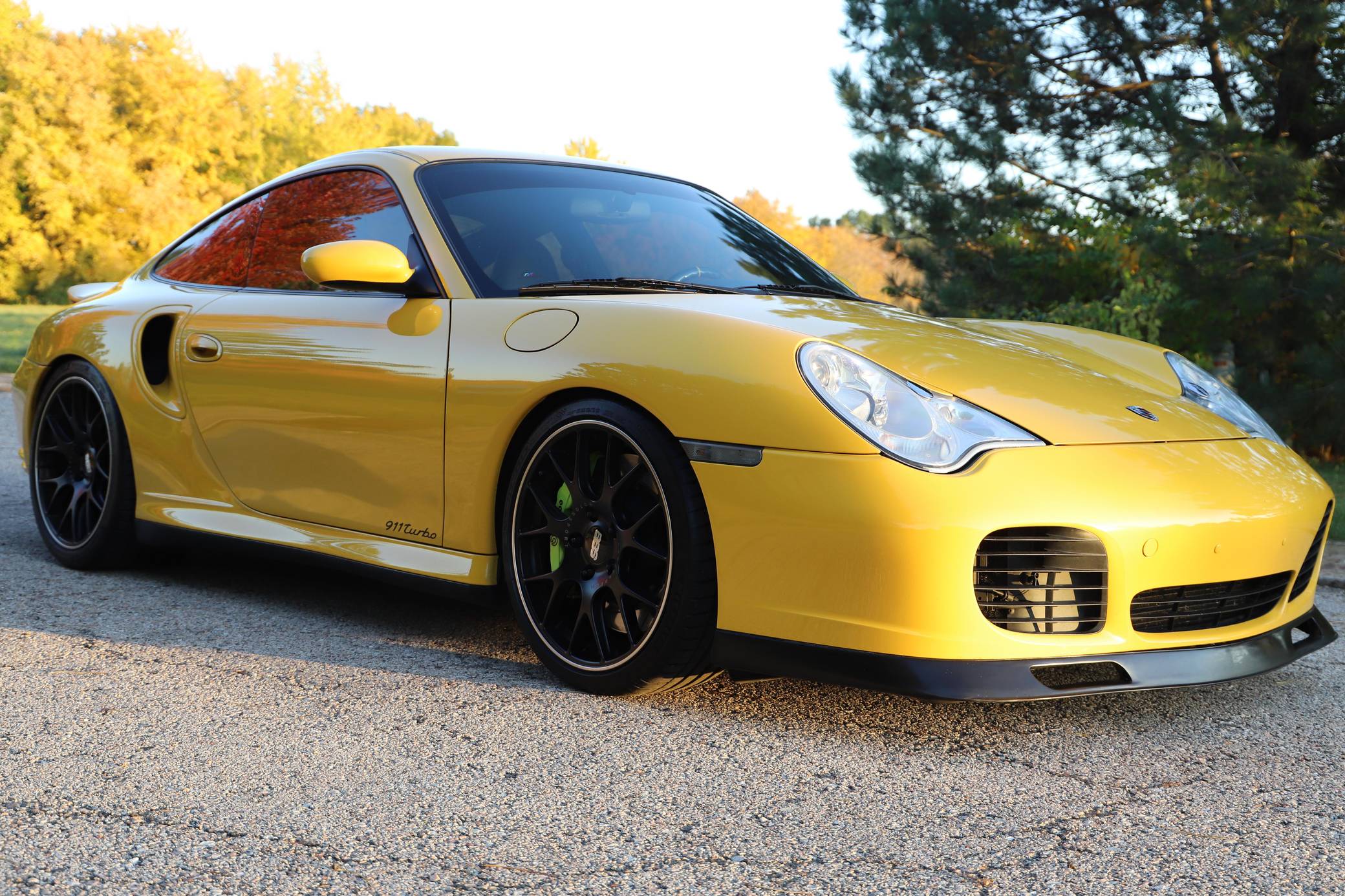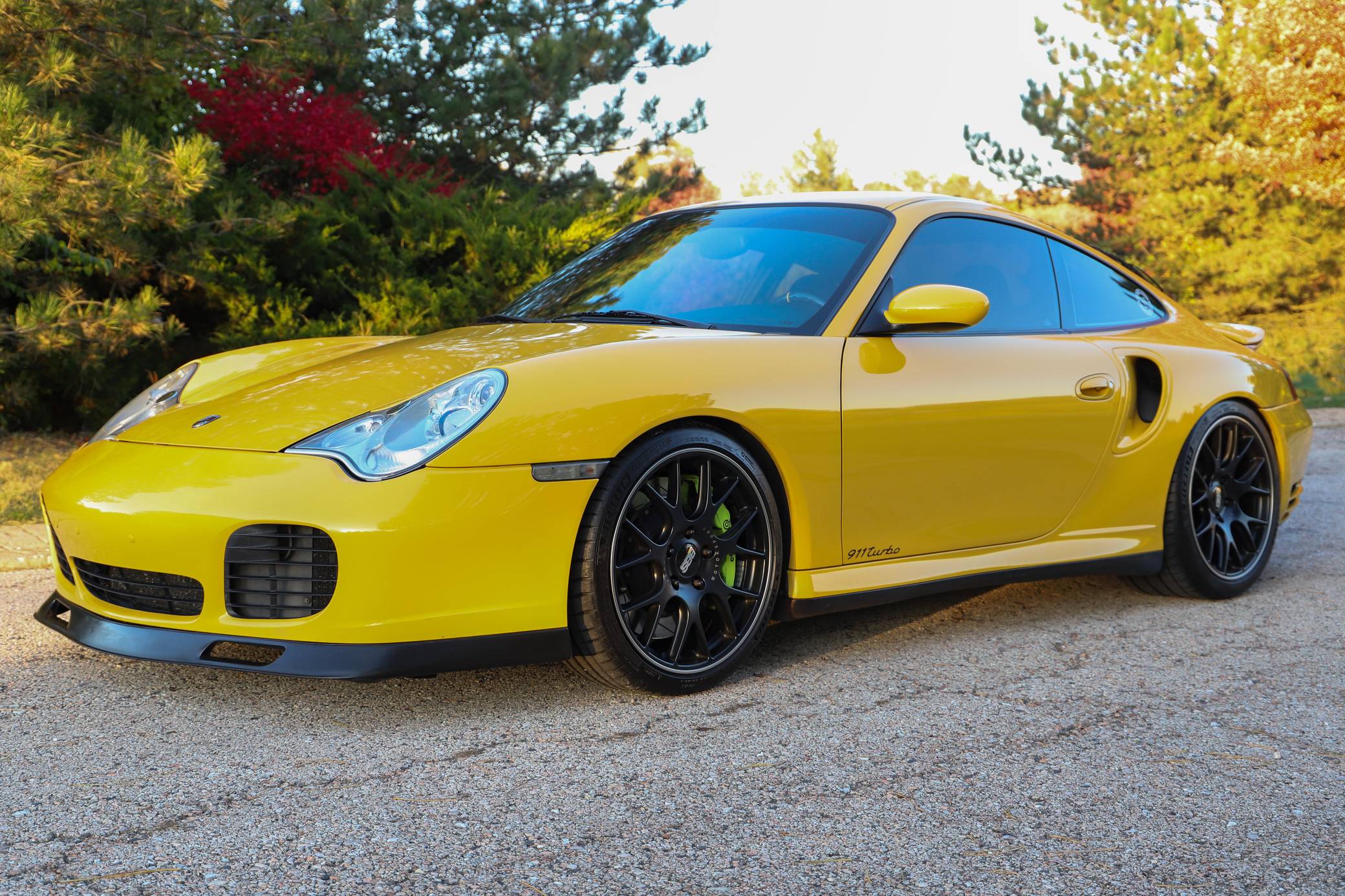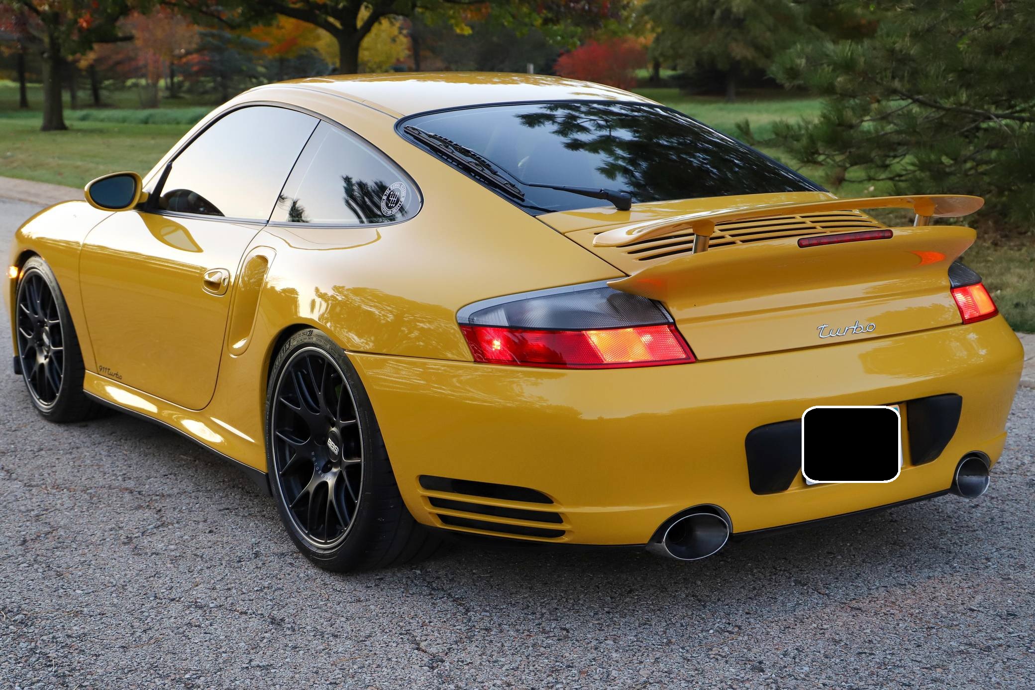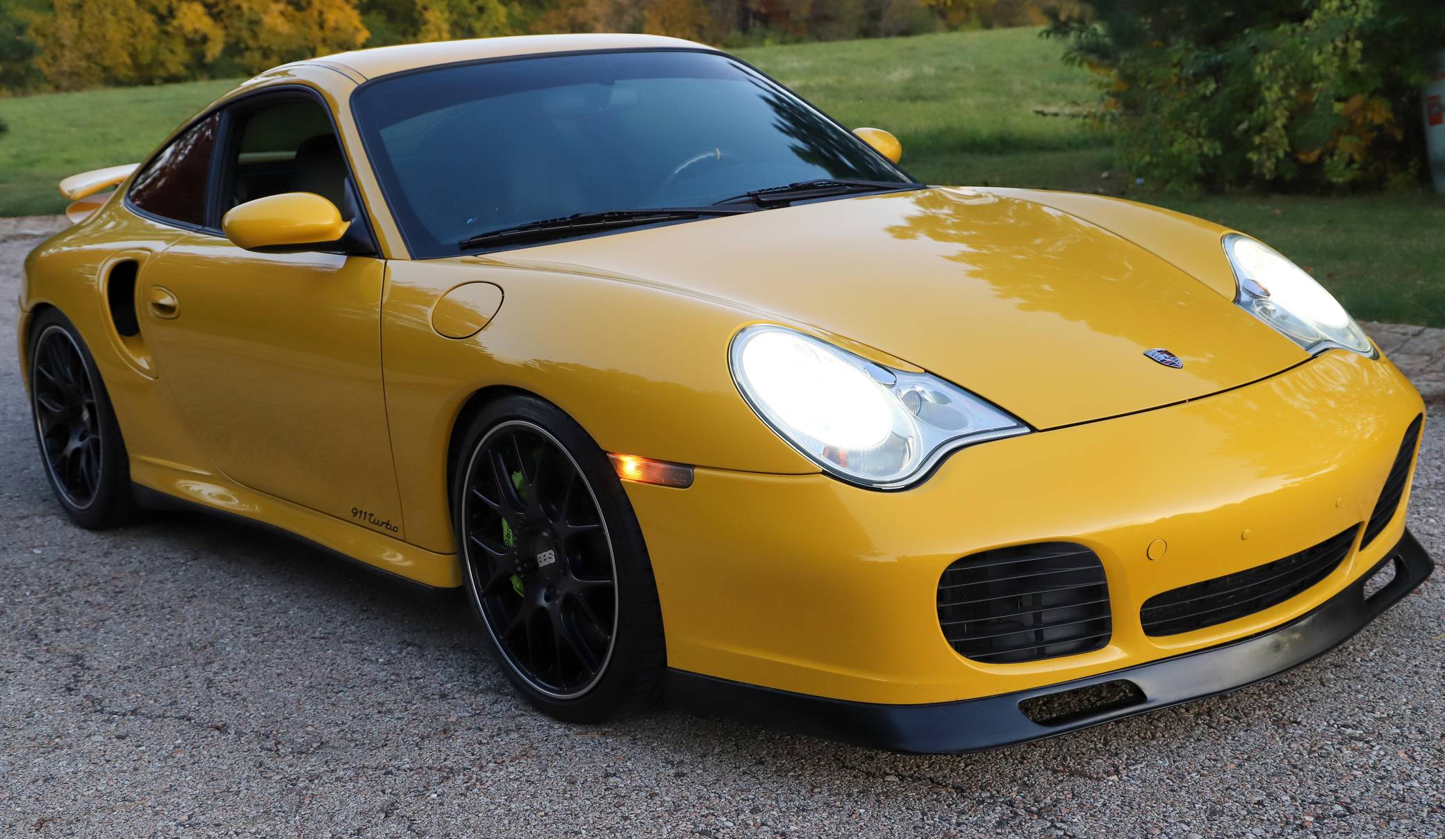 THIS. . . is a 2001 Porsche 911 Turbo, finished in Speed Yellow with a black interior. This 911 Turbo is equipped with the desirable 6-speed manual transmission. Factory equipment includes bi-xenon headlights, a Turbo-specific body kit, a sunroof, a rear wiper, a rear spoiler, leather upholstery, power-adjustable front seats, automatic climate control, and cruise control, among others listed below. Modifications reported by the seller include 19-inch BBS CH-R wheels, Brembo GT brakes, an aftermarket clutch and flywheel, GT2 clutch slave cylinder, Tubi Style exhaust, Injen Technology Evolution air intake, aftermarket ECU engine tune, Champion Motorsport lowering springs, H&R adjustable sway bars, aftermarket 15-millimeter spacers, clear fender lights, window tint, Numeric Racing short shifter, carbon fiber steering wheel, aftermarket speakers and an Alpine head unit with Apple CarPlay and a backup camera. Porsche introduced the 996-generation 911 for the 1999 model year. It was the first water-cooled 911, and it stood out from its predecessors with a new-look front end. The line-up grew to include coupe, convertible, and Targa models plus a wide panoply of variants ranging from the base Carrera to the track-ready GT2. The long-awaited Turbo variant arrived in America for the 2001 model year. Wide, low, and extremely quick, it was marketed as the fastest street-legal 911 ever built. Power for this 911 comes from a twin-turbocharged "Mezger" 3. 6-liter flat-6, rated at 415 horsepower and 413 lb-ft of torque. This engine may be making more power as a result of the modifications, though a dyno sheet is not included. Output is sent to all four wheels via a 6-speed manual transmission.