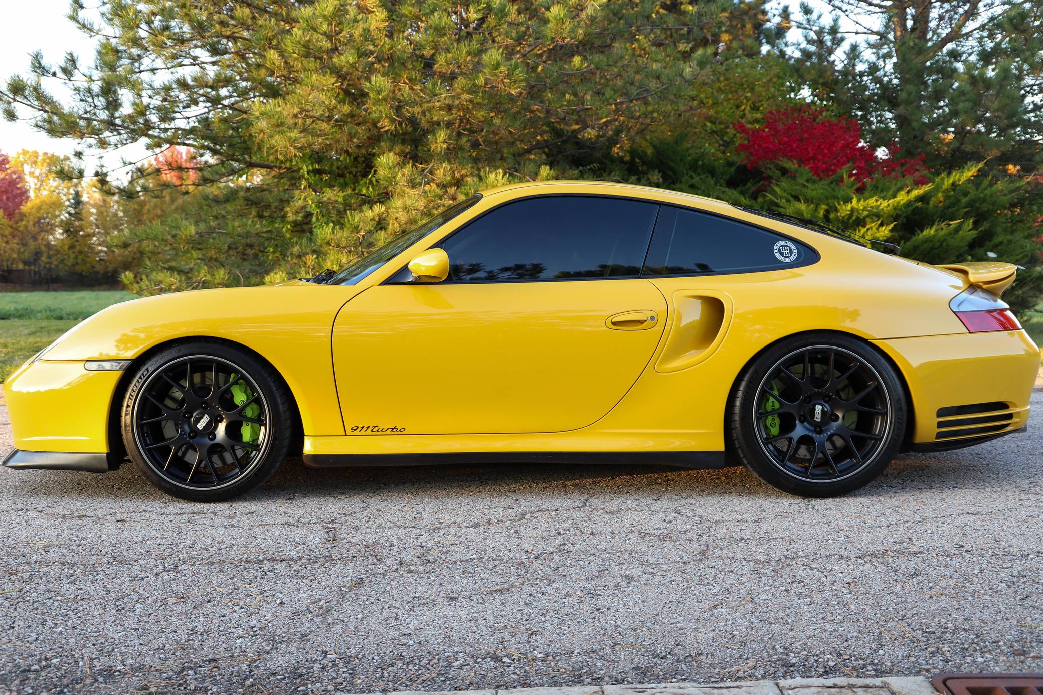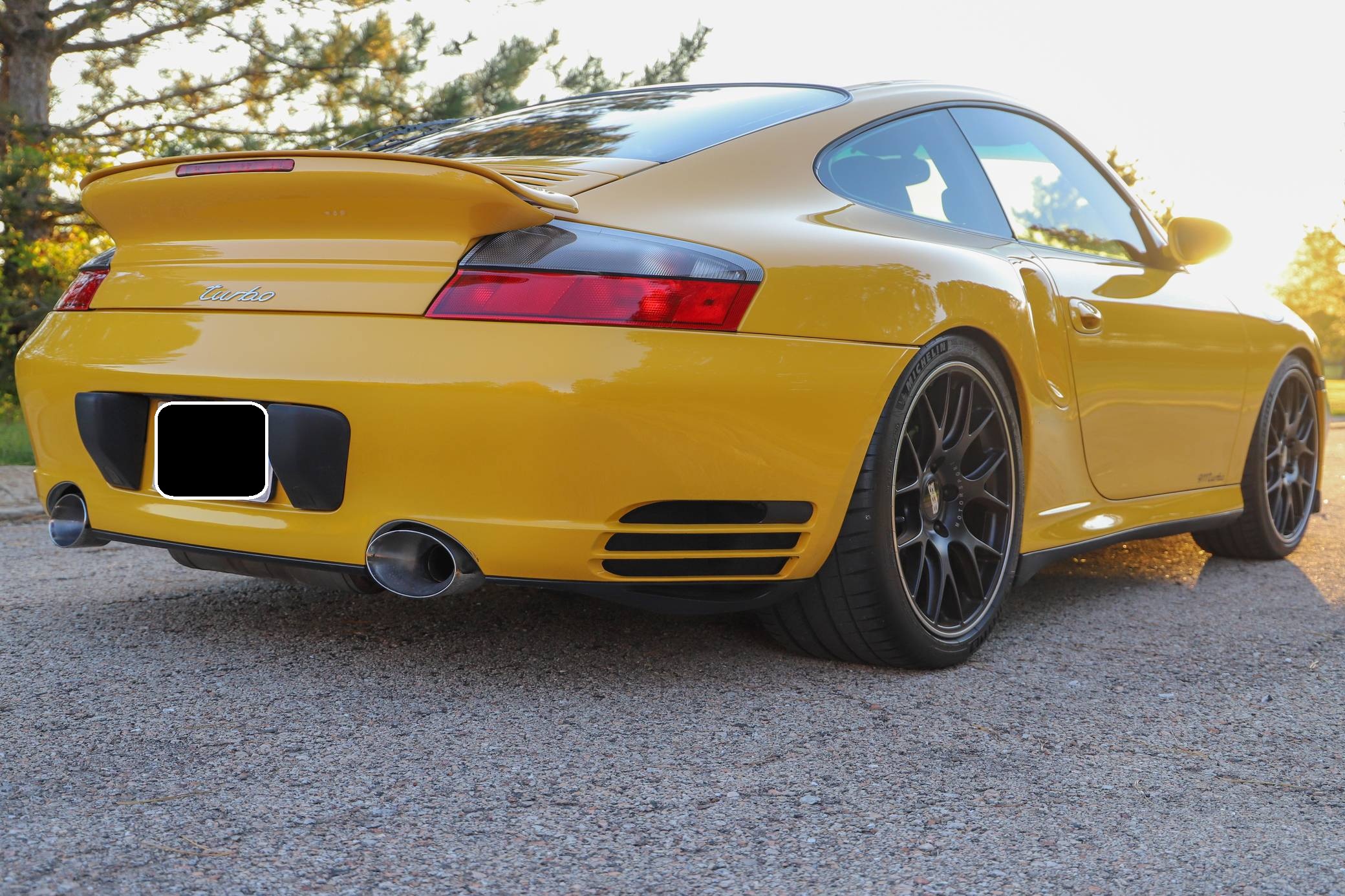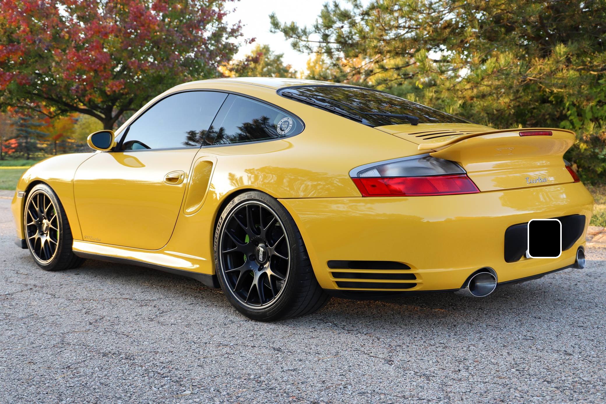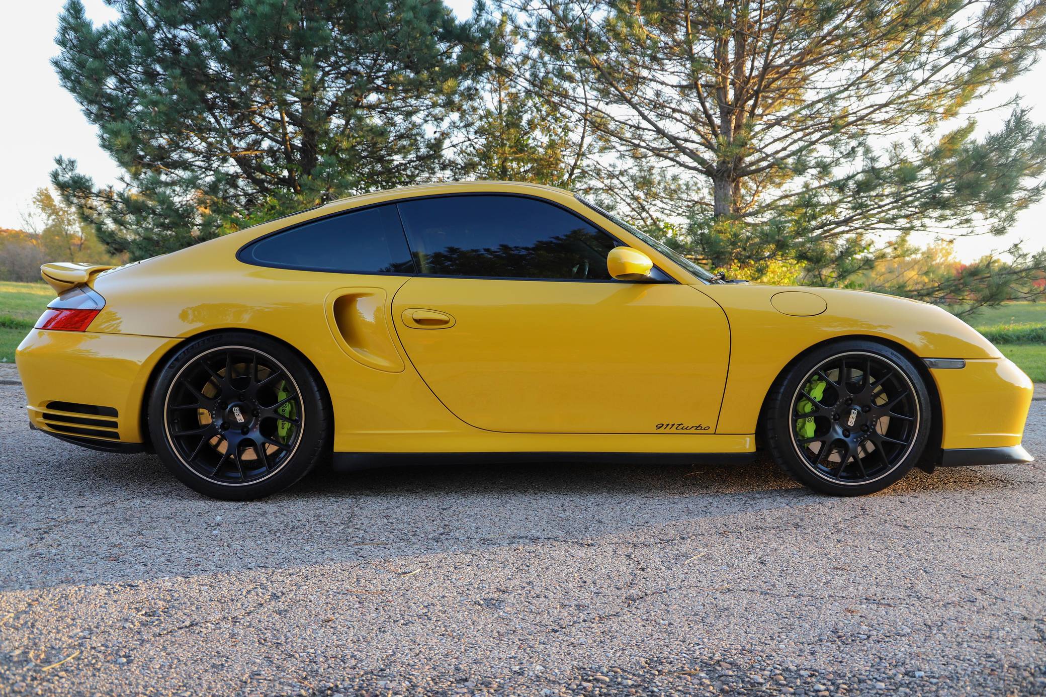 THIS. . . is a 2001 Porsche 911 Turbo, finished in Speed Yellow with a black interior. This 911 Turbo is equipped with the desirable 6-speed manual transmission. Factory equipment includes bi-xenon headlights, a Turbo-specific body kit, a sunroof, a rear wiper, a rear spoiler, leather upholstery, power-adjustable front seats, automatic climate control, and cruise control, among others listed below. Modifications reported by the seller include 19-inch BBS CH-R wheels, Brembo GT brakes, an aftermarket clutch and flywheel, GT2 clutch slave cylinder, Tubi Style exhaust, Injen Technology Evolution air intake, aftermarket ECU engine tune, Champion Motorsport lowering springs, H&R adjustable sway bars, aftermarket 15-millimeter spacers, clear fender lights, window tint, Numeric Racing short shifter, carbon fiber steering wheel, aftermarket speakers and an Alpine head unit with Apple CarPlay and a backup camera. Porsche introduced the 996-generation 911 for the 1999 model year. It was the first water-cooled 911, and it stood out from its predecessors with a new-look front end. The line-up grew to include coupe, convertible, and Targa models plus a wide panoply of variants ranging from the base Carrera to the track-ready GT2. The long-awaited Turbo variant arrived in America for the 2001 model year. Wide, low, and extremely quick, it was marketed as the fastest street-legal 911 ever built. Power for this 911 comes from a twin-turbocharged "Mezger" 3. 6-liter flat-6, rated at 415 horsepower and 413 lb-ft of torque. This engine may be making more power as a result of the modifications, though a dyno sheet is not included. Output is sent to all four wheels via a 6-speed manual transmission.