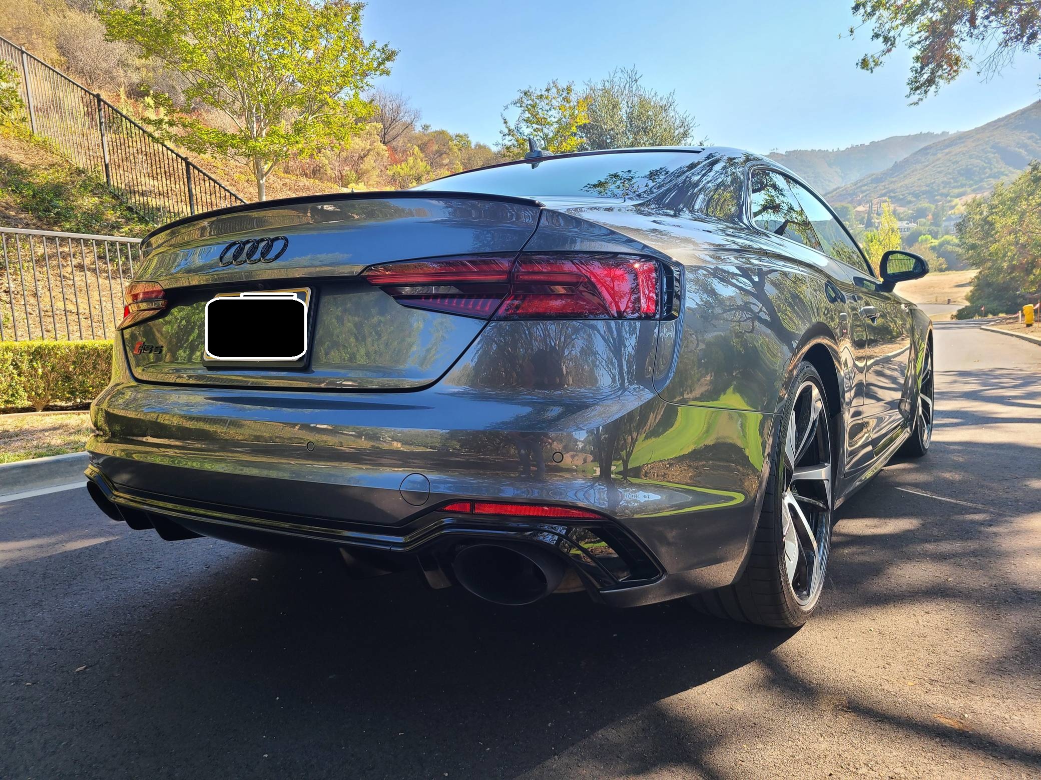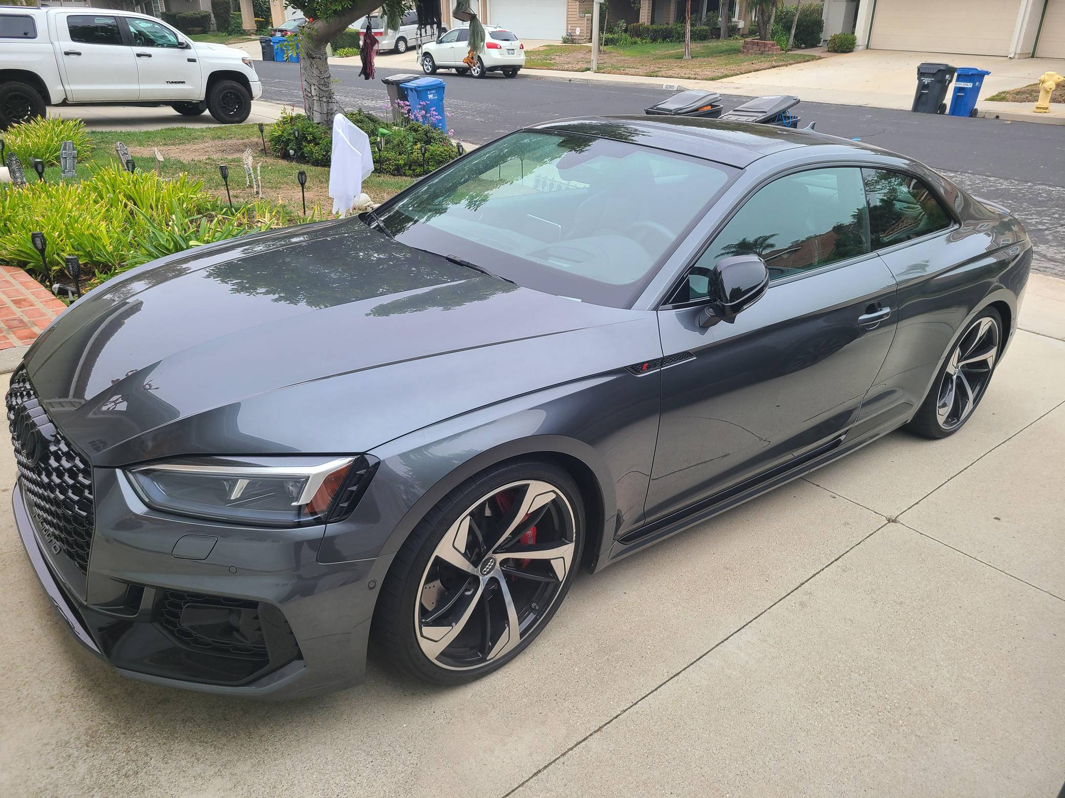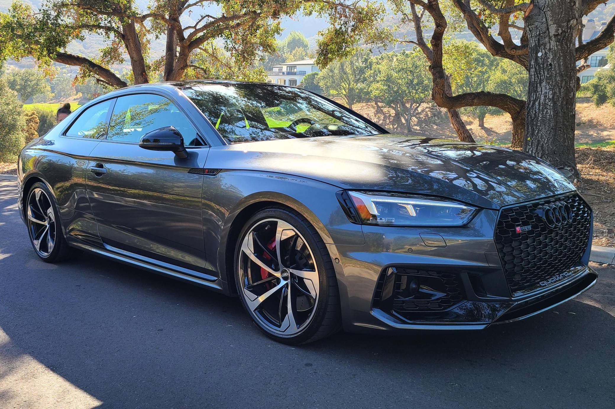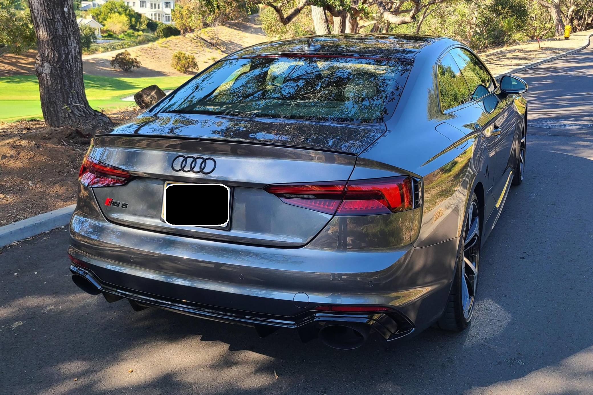 THIS… is a 2019 Audi RS5 Coupe, finished in Daytona Gray Pearl Effect with a black interior. The odometer on this RS5 currently displays approximately 19,500 miles. Factory equipment includes the RS Driver Assistance, Dynamic, Black Optic, and Fine Nappa Leather packages, dynamic steering, a power sunroof, three-zone automatic climate control, Audi virtual cockpit, a navigation system, and a Bang & Olufsen sound system. Modifications reported by the seller include an ARMYTRIX ceramic coated sport cat-pipe with 200 CPSI catalytic converters and a stainless steel Valvetronic cat-back exhaust system, an AWE AirGate carbon fiber intake, an aftermarket tune, and black paint on the exterior badges. Audi released the second-generation RS5 for 2018 as the ultimate evolution of the A5. Offered as a coupe and as a fastback called Sportback, it swapped its predecessor's V8 for a twin-turbocharged V6 but it gained torque in the trade. Huge brakes and a model-specific suspension system helped drivers make the most of the drivetrain, while a more muscular-looking exterior design allowed the RS5 to easily stand out from the S5. It remains available as Audi of America's answer to the BMW M4. Power comes from a twin-turbocharged 2. 9-liter V6, rated at 444 horsepower and 443 lb-ft of torque in stock form. Due to the modifications performed to this RS5, it may produce more power, but a dyno sheet was not provided to confirm. Output is sent to all four wheels via an 8-speed automatic transmission and Audi's permanent Quattro all-wheel drive system.