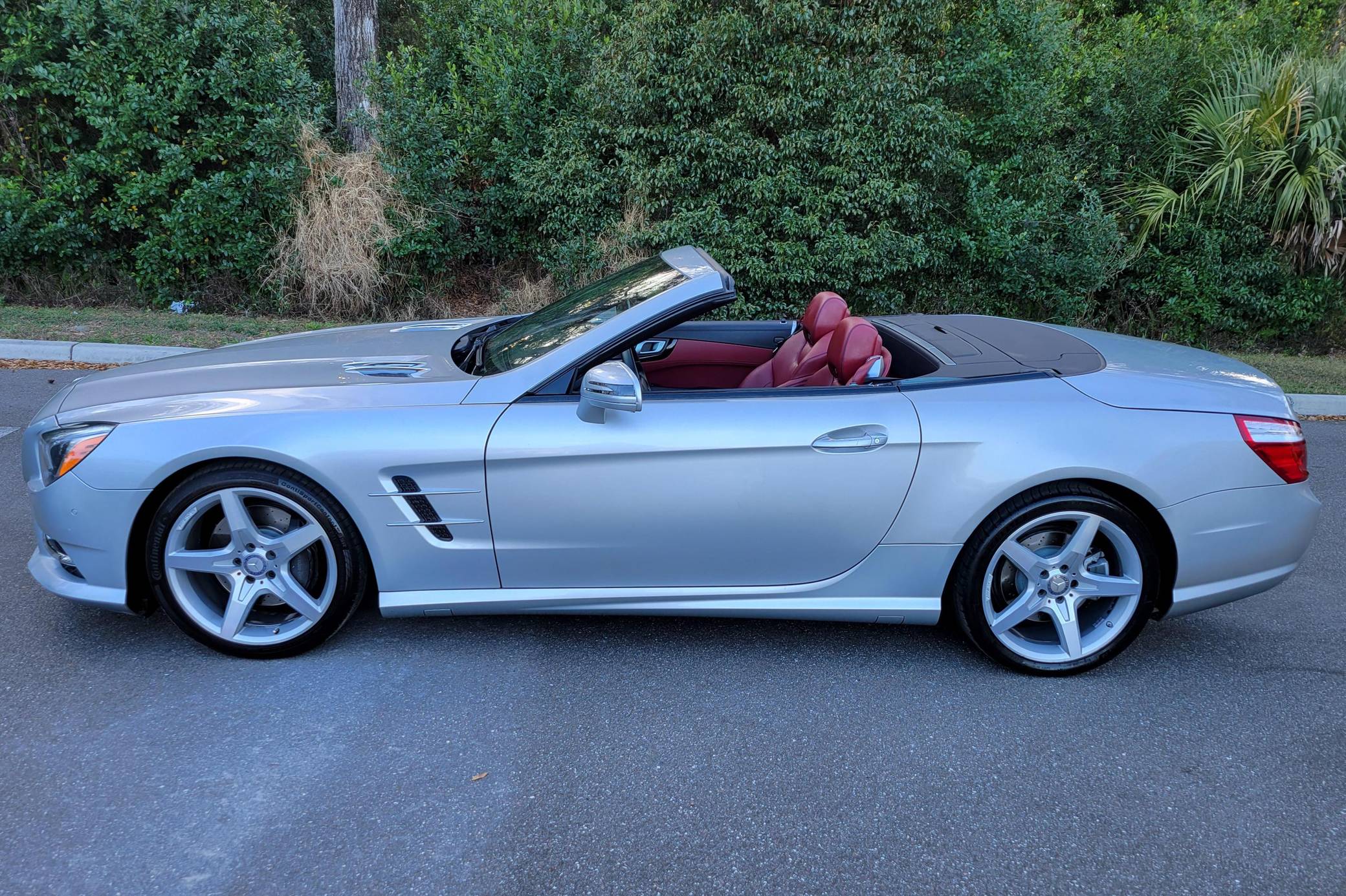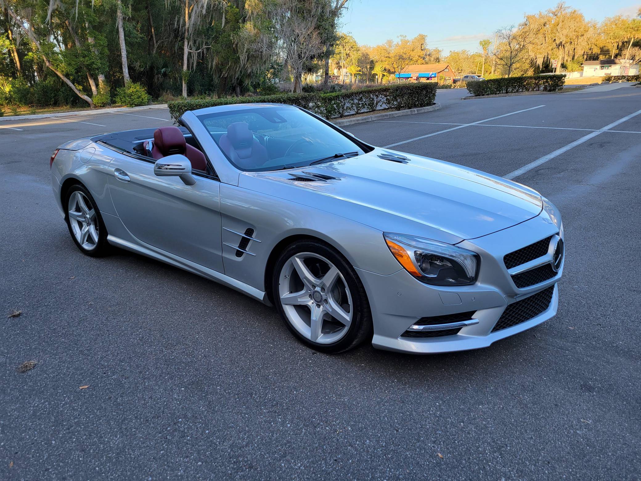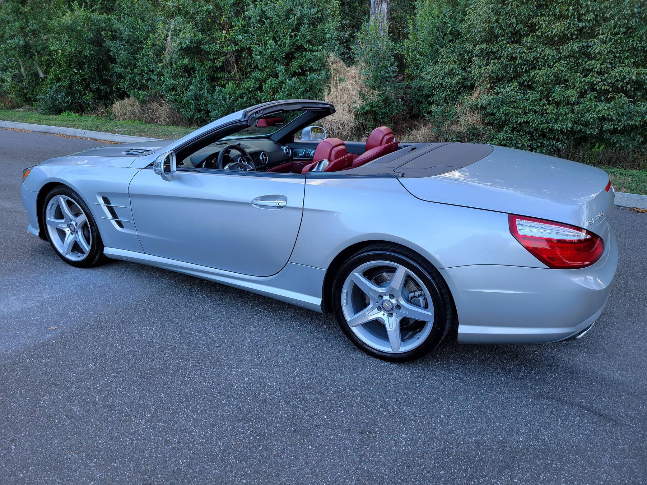 2016 Mercedes-Benz SL400, finished in Iridium Silver Metallic with a red interior. Factory equipment on this SL includes the Sport Wheel, Premium, and Driver Assistance packages, which add features such as 19-inch AMG wheels, the Airscarf neck-level heating system, Distronic Plus, and more as detailed below. The seller reports no modifications. Mercedes-Benz introduced the "R231"-generation SL for the 2013 model year with revised styling and weight savings of 300 pounds versus the previous generation, due to an all-aluminum body. A retractable hardtop was standard, and advanced safety features were offered along with several powertrain options including a twin-turbocharged V6, two twin-turbocharged V8s, and a twin-turbocharged V12 available in the SL65 AMG. Power comes from a 3. 0-liter twin-turbocharged V6, rated at 329 horsepower and 354 lb-ft of torque. Output is sent to the rear wheels via a 7-speed automatic transmission.