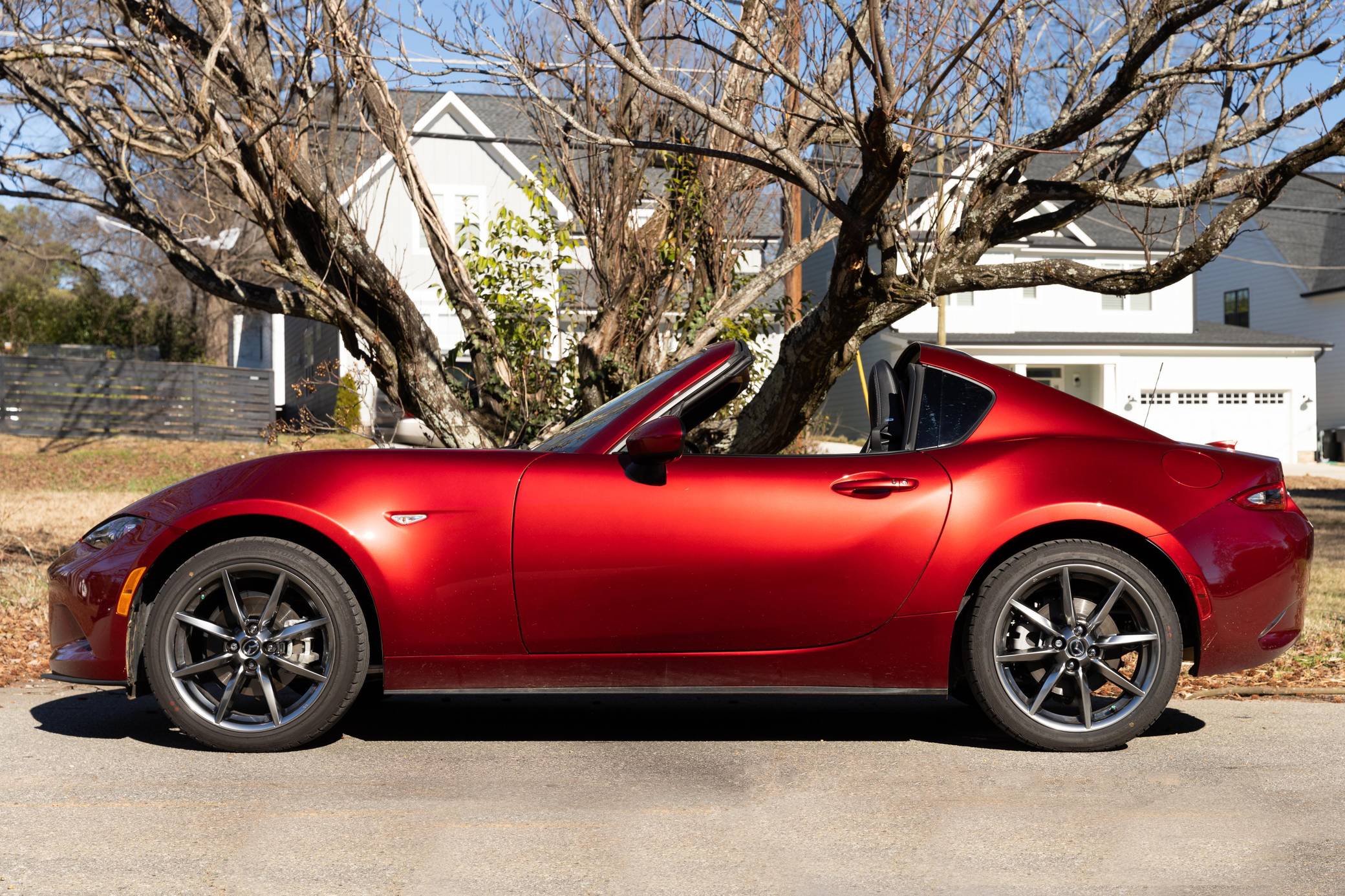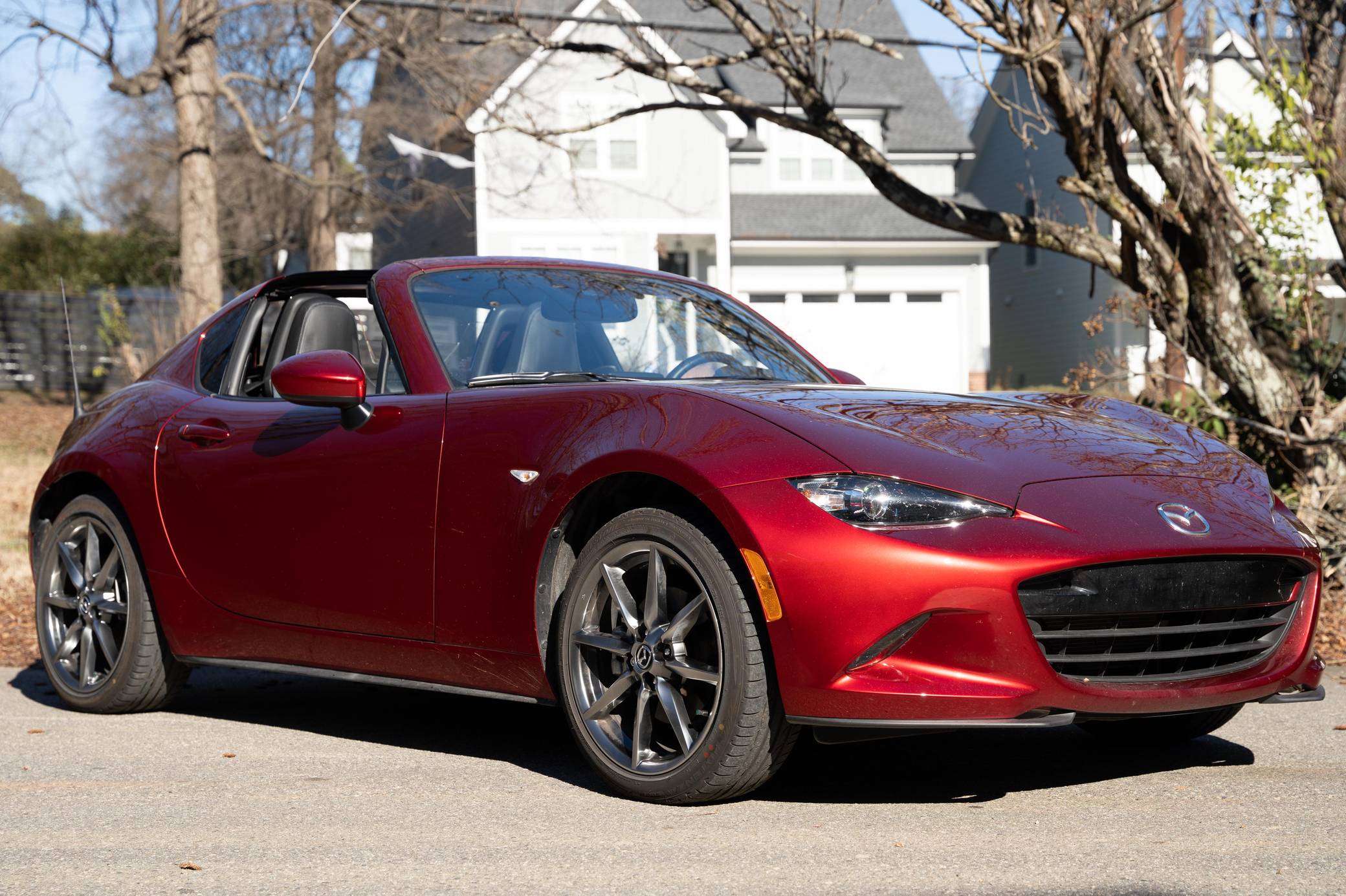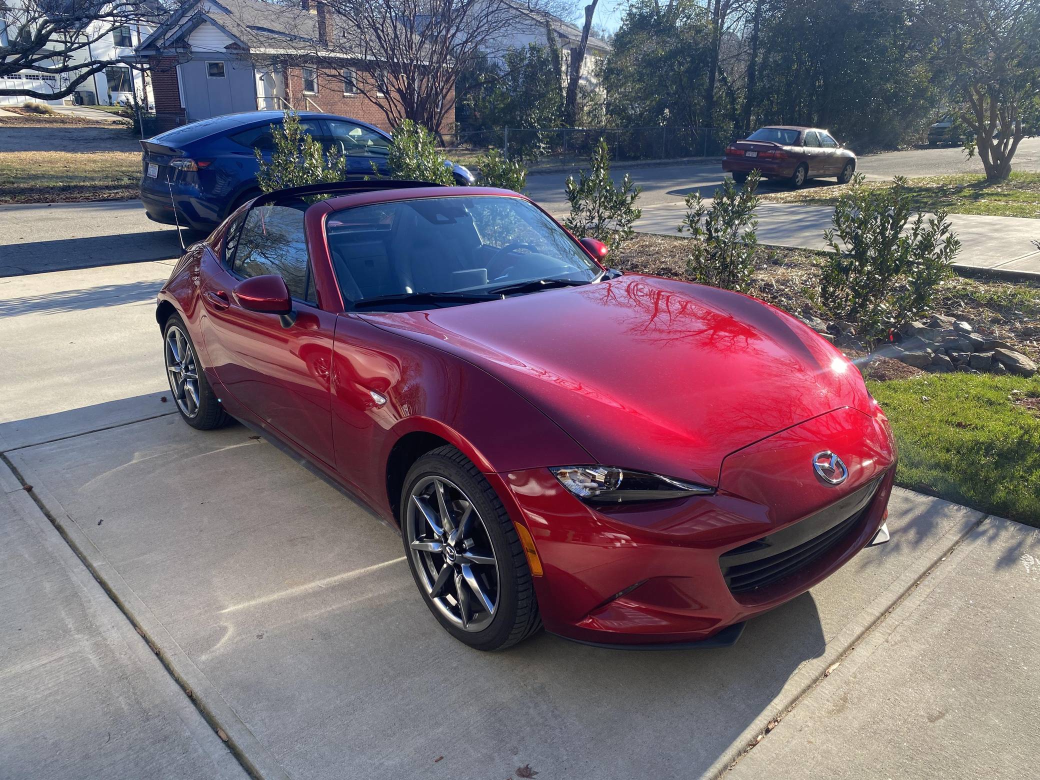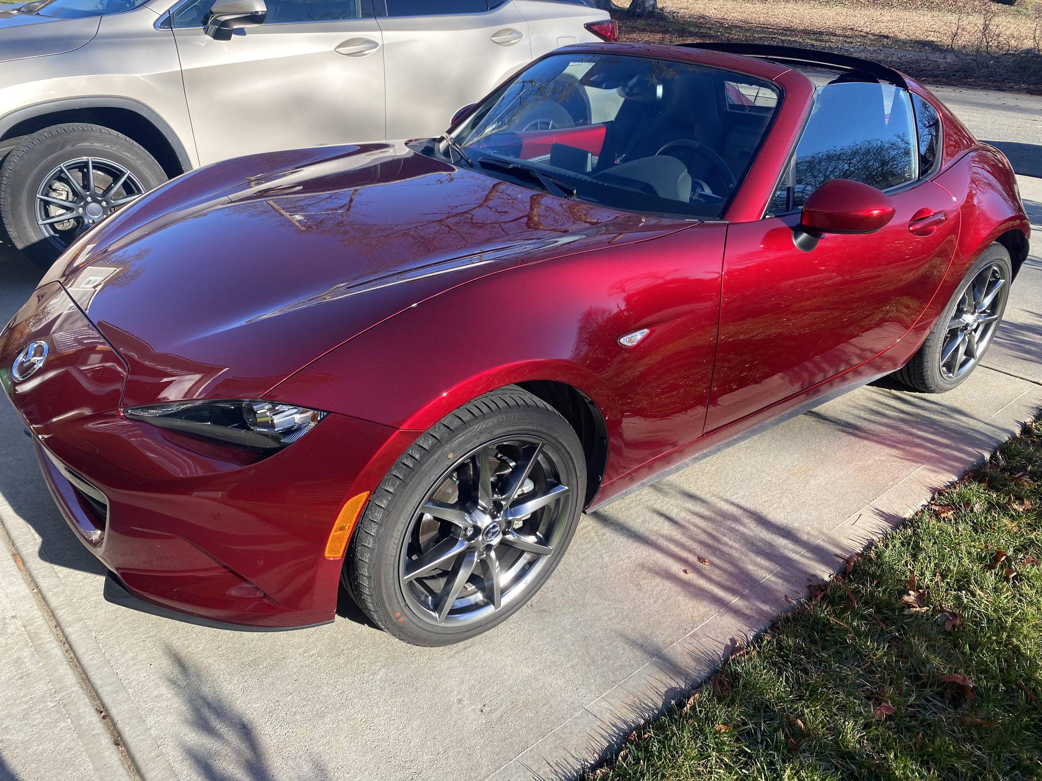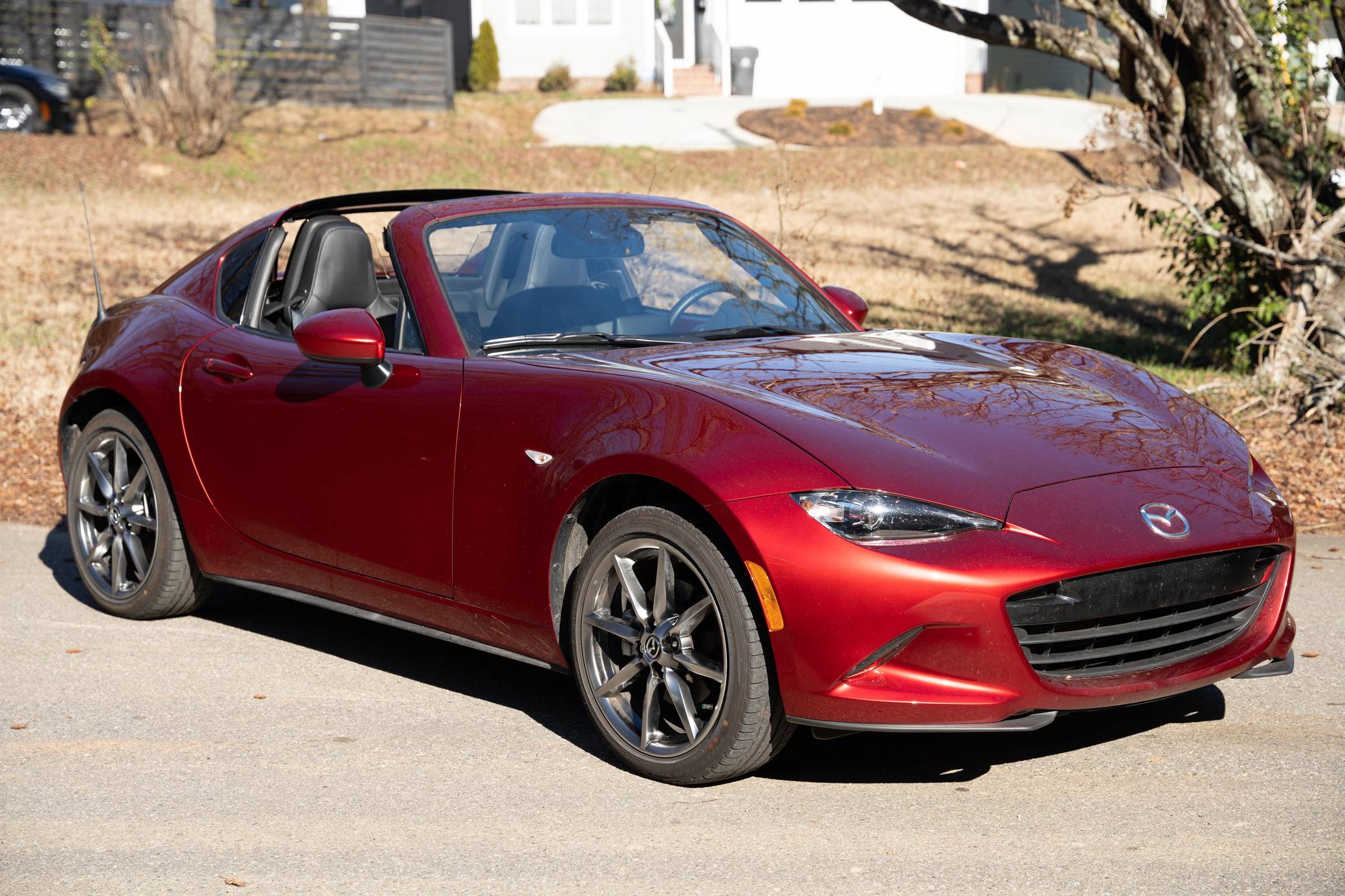 THIS. . . is a 2021 Mazda MX-5 Miata RF Grand Touring, finished in Soul Red Crystal Metallic with a black interior. This MX-5 is equipped with the desirable 6-speed manual transmission and the odometer indicates approximately 4,800 miles. Factory equipment includes 17-inch alloy wheels, a limited-slip differential, sport-tuned suspension with Bilstein shocks, an aluminum hood and trunk lid, a front strut brace, a power retractable hardtop, heated sport seats, a Bose 9-speaker audio system, a navigation system, blind spot monitoring and cross-traffic alert, and a rear-view camera. No modifications have been reported by the seller. The "ND" Miata debuted for the 2016 model year, and it strikes a balance as a modern, nicely-appointed roadster that still maintains the intended nature of a Miata as a fun, uncomplicated, lightweight sports car at an accessible price. The "ND2" model debuted for the 2019 model year and included revisions to the engine with more power and a higher redline, a telescoping steering column, revised seat controls, a new cupholder, a rear-view camera, and a redesigned door handle mechanism. Power comes from a 2. 0-liter inline-4, which produces 181 horsepower and 151 lb-ft of torque. Output is sent to the rear wheels via a 6-speed manual transmission.