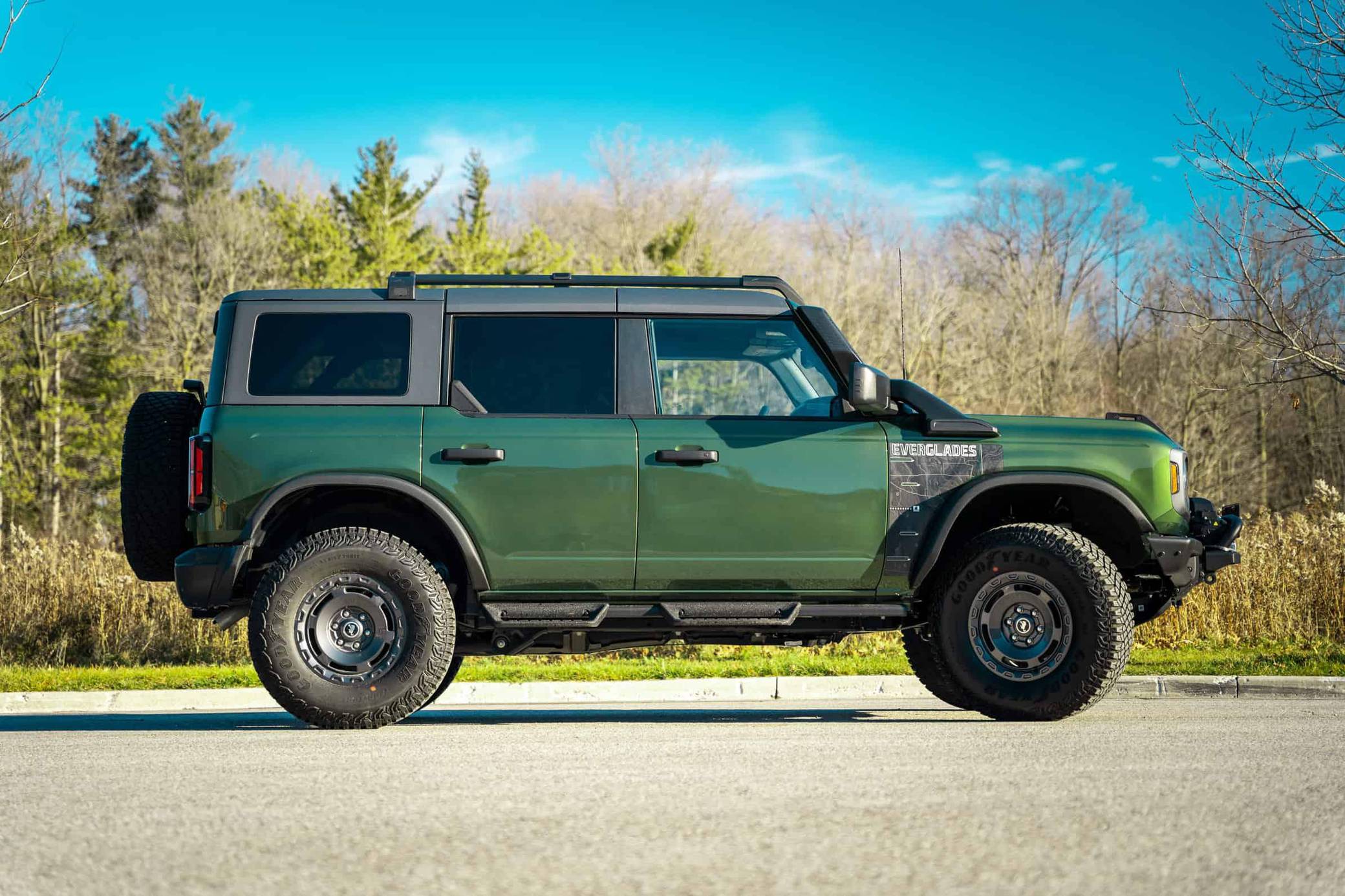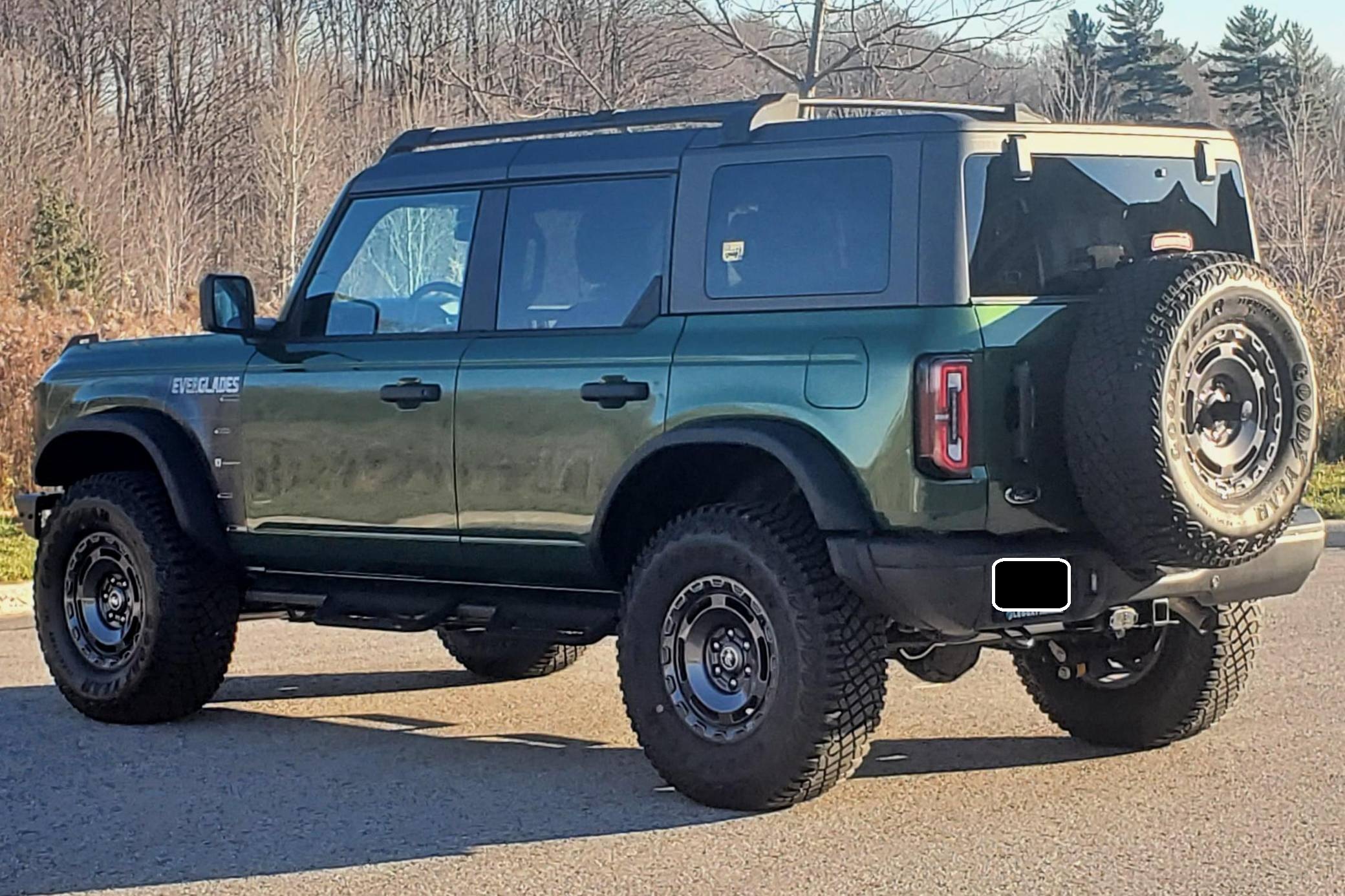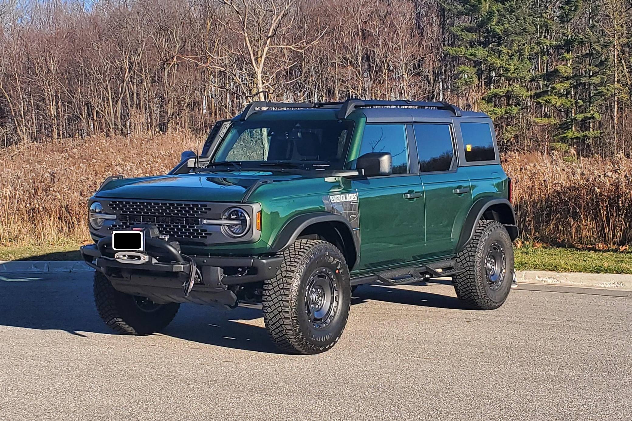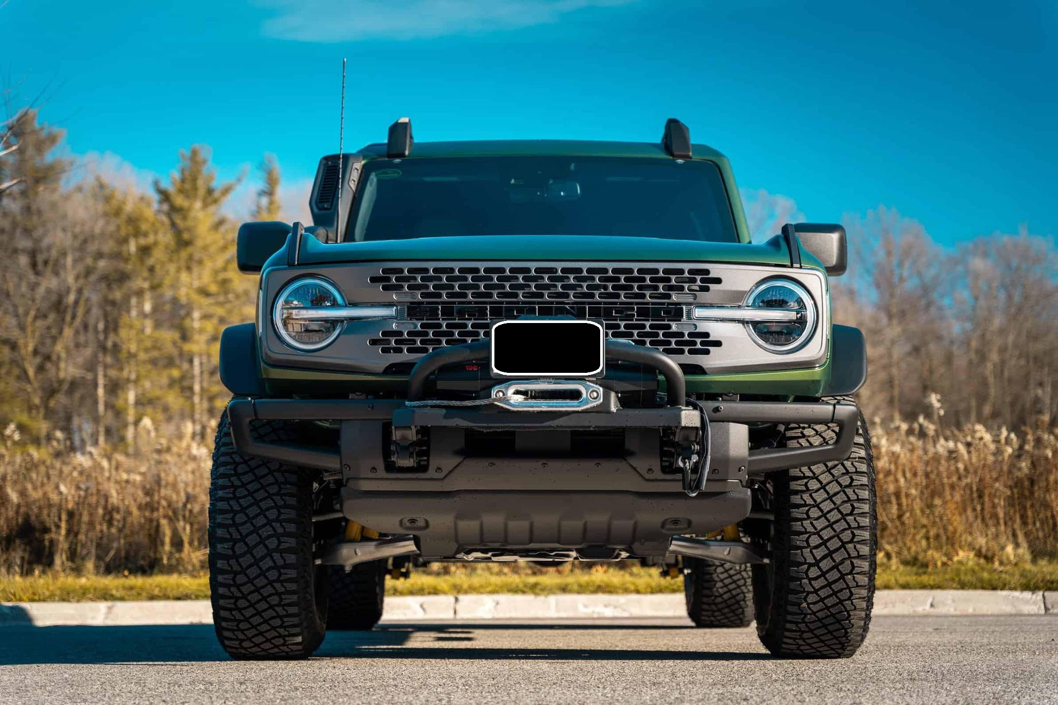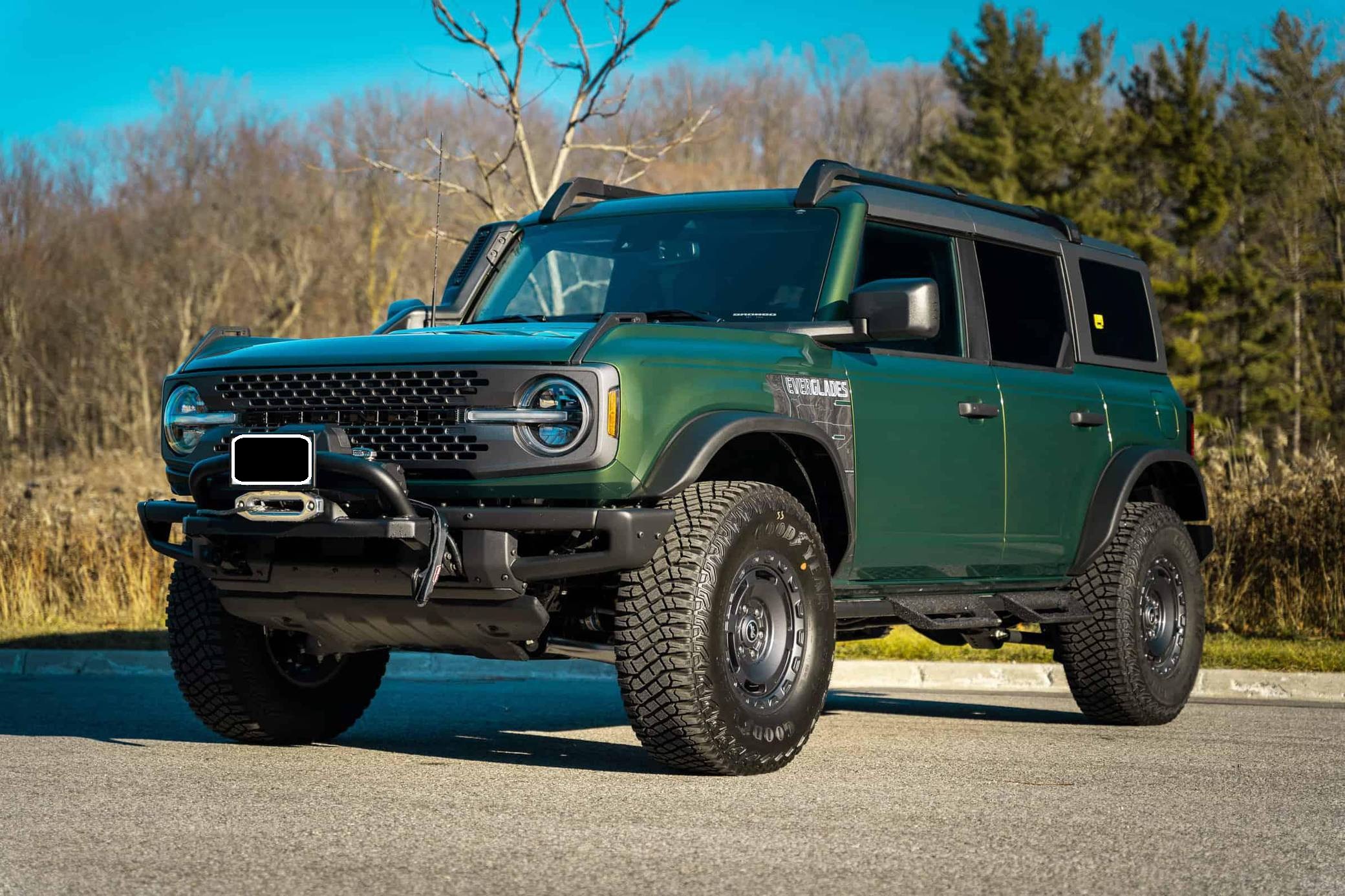 THIS. . . is a 2022 Ford Bronco Everglades, finished in Eruption Green Metallic with a black hardtop and an Onyx interior. It's equipped with a metric instrument cluster that currently displays approximately 80 kilometers or about 50 miles. O. A. T. modes, and more as detailed below. The seller reports no modifications. The sixth-generation Bronco was introduced for 2021, ending a long hiatus and nearly a decade of speculation about its return. Retro styling, body-on-frame construction, and a suite of off-road equipment help ensure this truck lives up to the Bronco name. It's not all old-school, however: available modern features like an available 12-inch touchscreen and a wireless phone charger bring it into the 21st century. Power comes from a 2. 3-liter turbocharged "Ecoboost" inline-four engine, rated at 300 horsepower and 325 lb-ft of torque when using premium fuel, according to Ford. Output is sent to the rear or all four wheels via a 10-speed automatic transmission and a 2-speed transfer case.