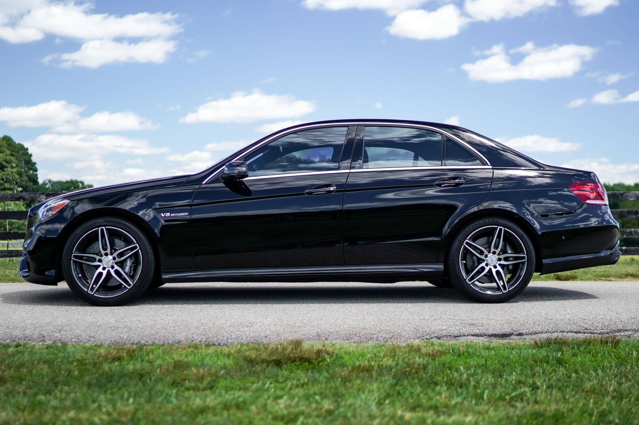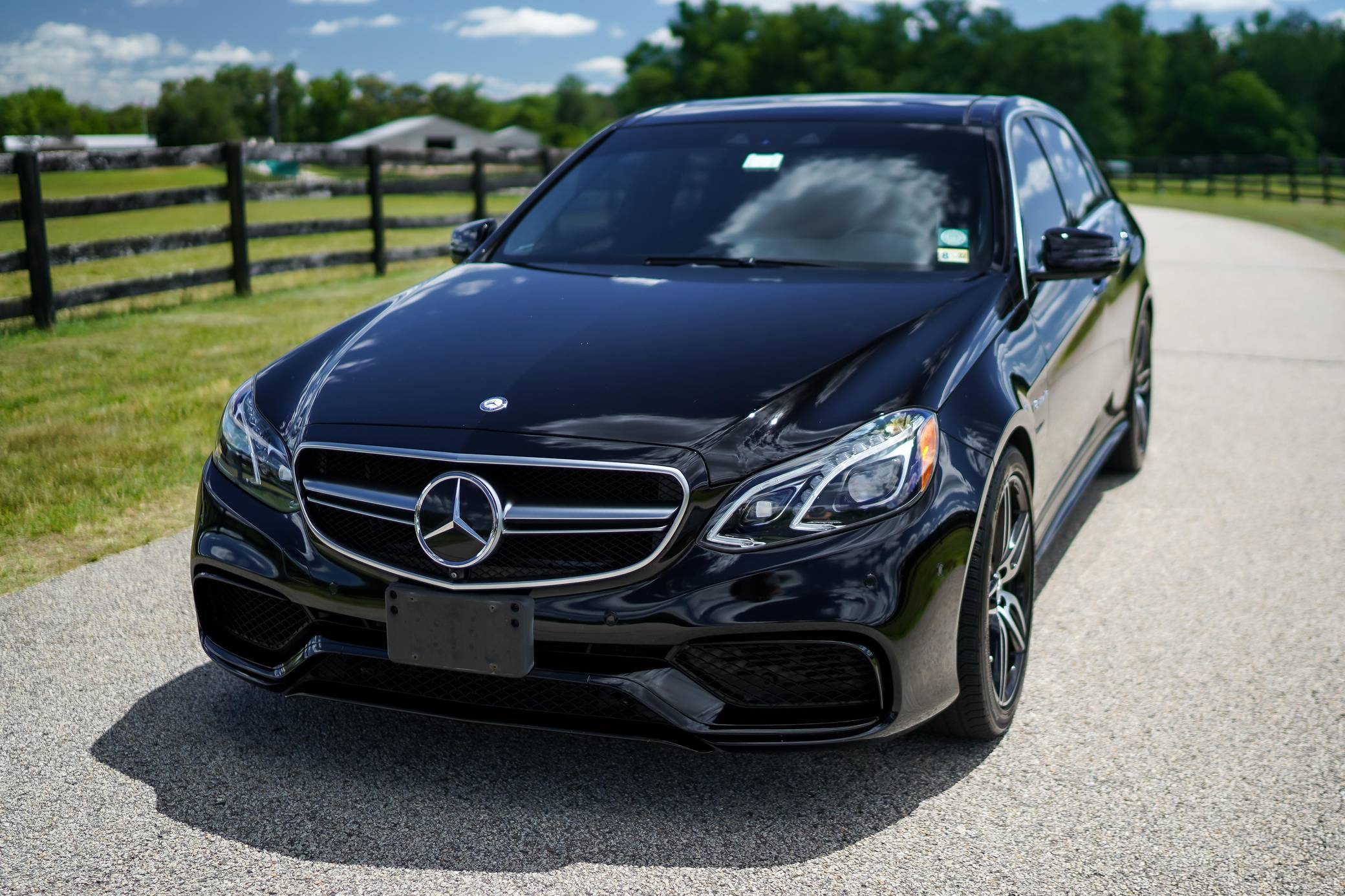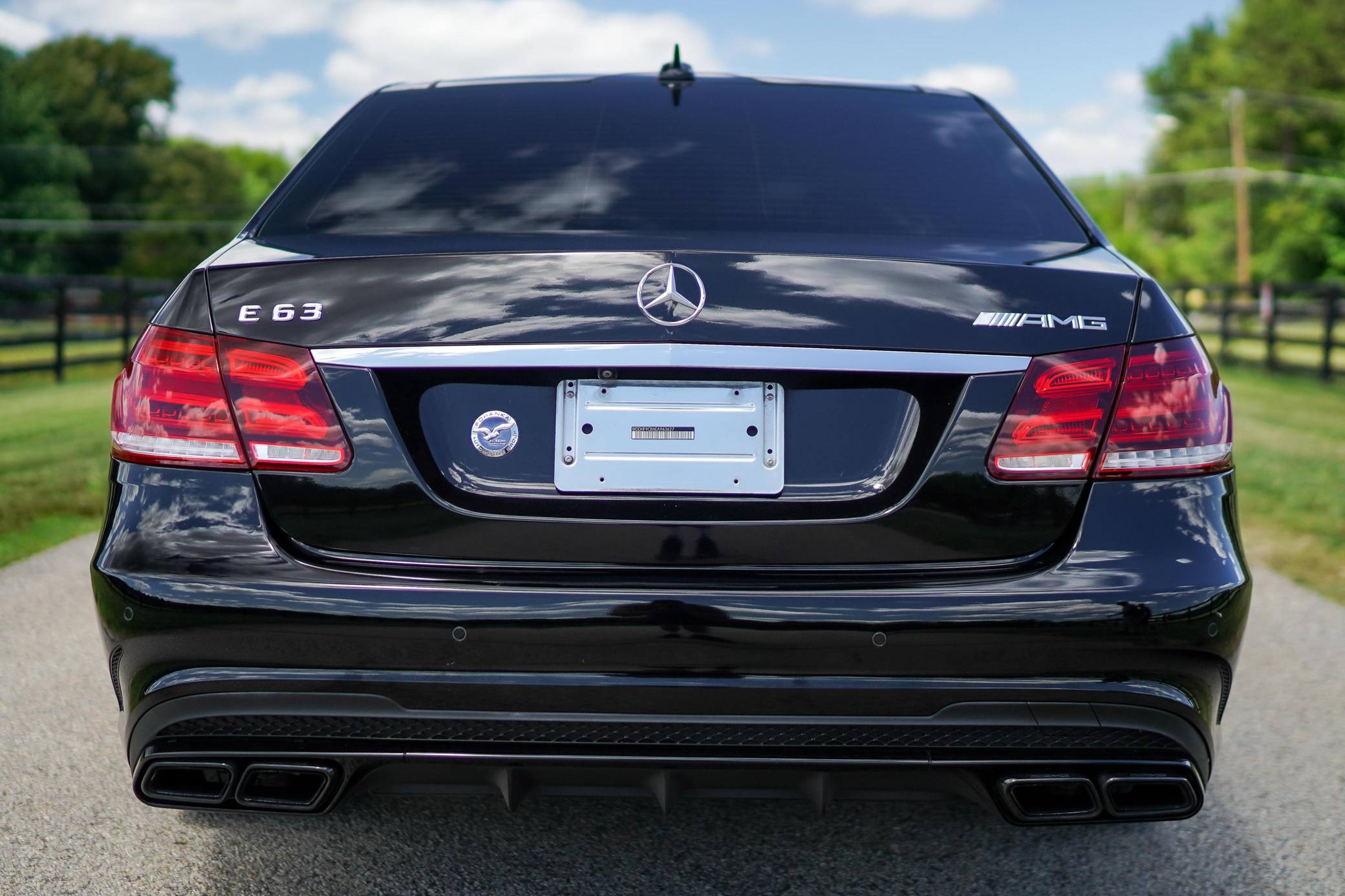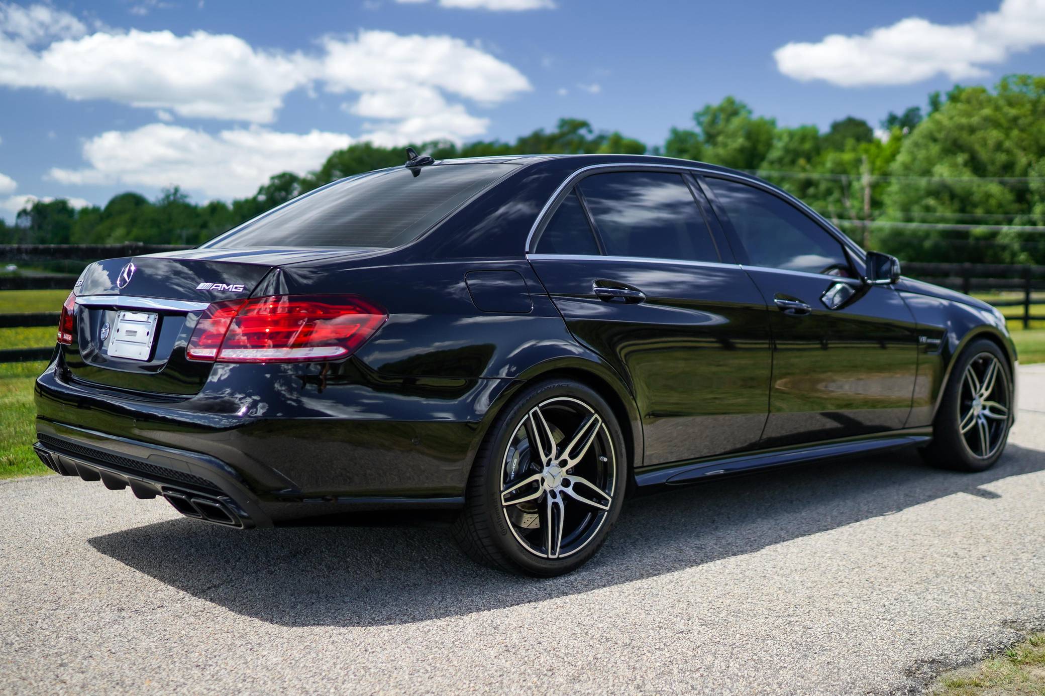 2014 Mercedes-Benz E63 AMG, finished in black with a black interior. Factory equipment includes the AMG Parking Assistance and Driver Assistance packages, LED headlights with Active Curve Illumination, a panoramic sunroof, burl walnut wood interior trim, Nappa leather upholstery, heated, ventilated, and power-adjustable active front seats, a massage function for the driver, ambient lighting, and a Harman Kardon LOGIC7 surround sound system. Modifications reported by the seller include a set of 19-inch AMG wheels from a later model and tinted windows. Mercedes-Benz released the "W212"-based E63 AMG for 2010, and it gave the model a round of significant updates for 2014. The changes included a new-look exterior design, a more powerful V8 available in two states of tune, and a rear-biased 4Matic all-wheel drive system to help route the engine's full output to the pavement. Sedan and wagon models were available until production ended in 2016. Power comes from a 5. 5-liter twin-turbocharged V8, rated at 550 horsepower and 531 lb-ft of torque. Called "M157" internally, it spins the four wheels via a 7-speed automatic transmission and Mercedes-Benz's permanent 4Matic all-wheel drive system.