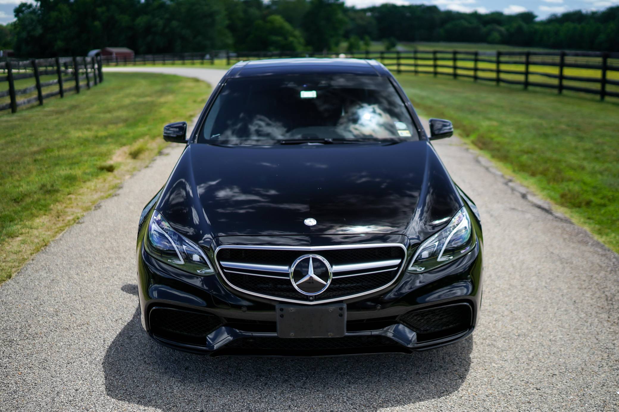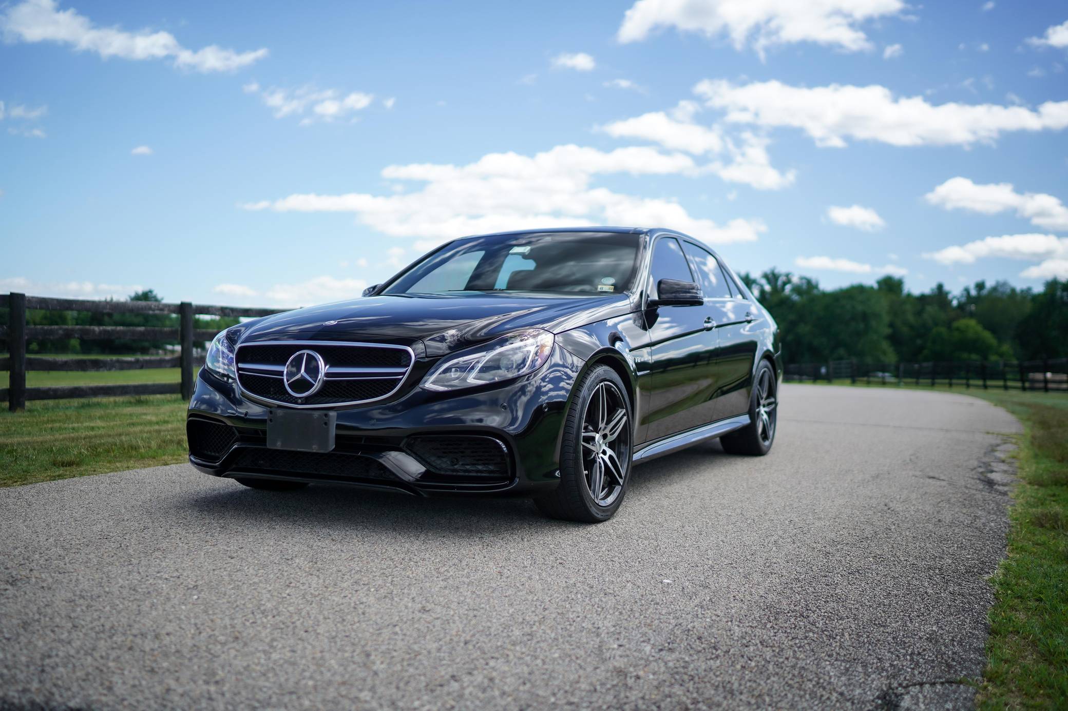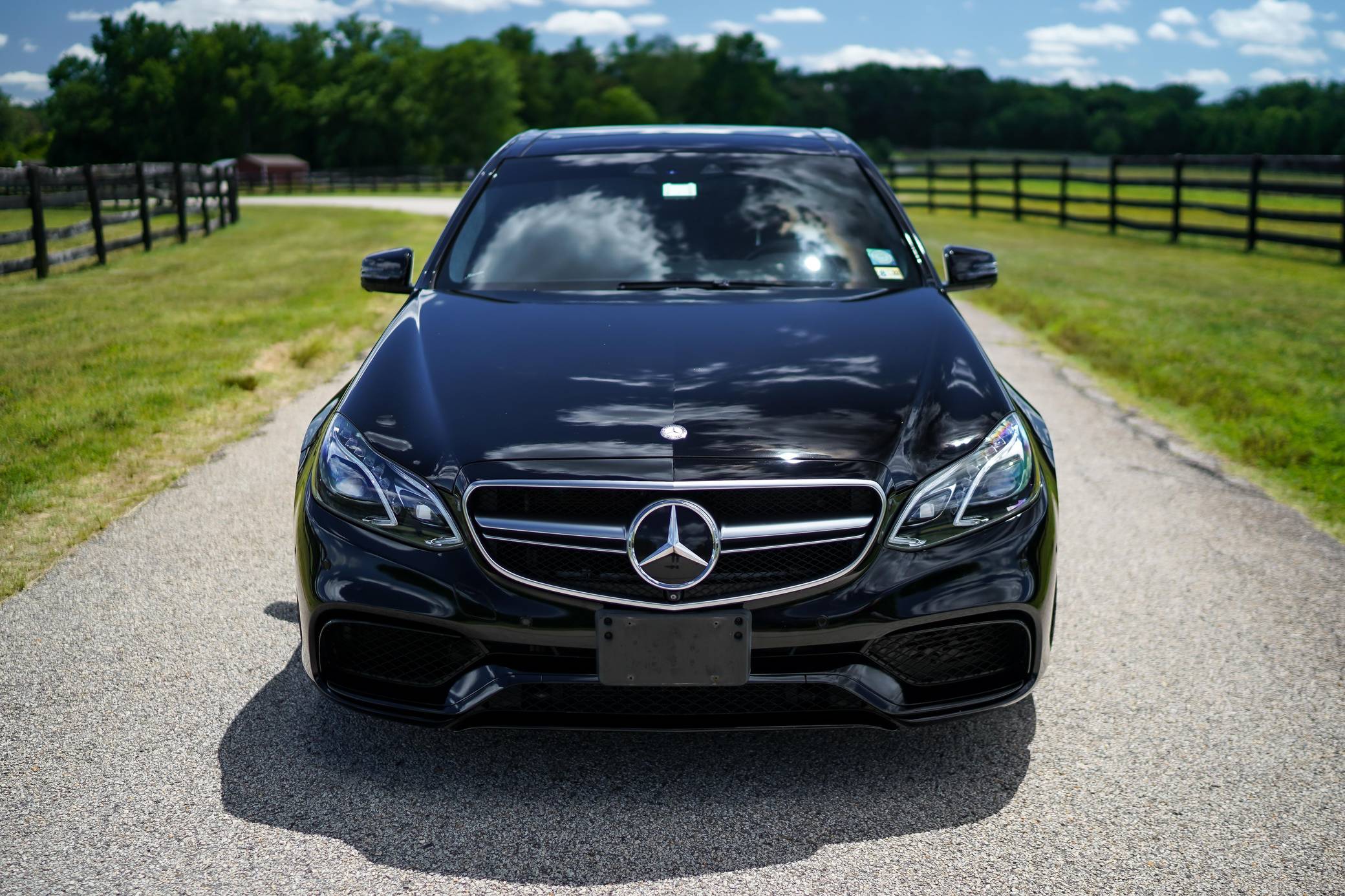 2014 Mercedes-Benz E63 AMG, finished in black with a black interior. Factory equipment includes the AMG Parking Assistance and Driver Assistance packages, LED headlights with Active Curve Illumination, a panoramic sunroof, burl walnut wood interior trim, Nappa leather upholstery, heated, ventilated, and power-adjustable active front seats, a massage function for the driver, ambient lighting, and a Harman Kardon LOGIC7 surround sound system. Modifications reported by the seller include a set of 19-inch AMG wheels from a later model and tinted windows. Mercedes-Benz released the "W212"-based E63 AMG for 2010, and it gave the model a round of significant updates for 2014. The changes included a new-look exterior design, a more powerful V8 available in two states of tune, and a rear-biased 4Matic all-wheel drive system to help route the engine's full output to the pavement. Sedan and wagon models were available until production ended in 2016. Power comes from a 5. 5-liter twin-turbocharged V8, rated at 550 horsepower and 531 lb-ft of torque. Called "M157" internally, it spins the four wheels via a 7-speed automatic transmission and Mercedes-Benz's permanent 4Matic all-wheel drive system.