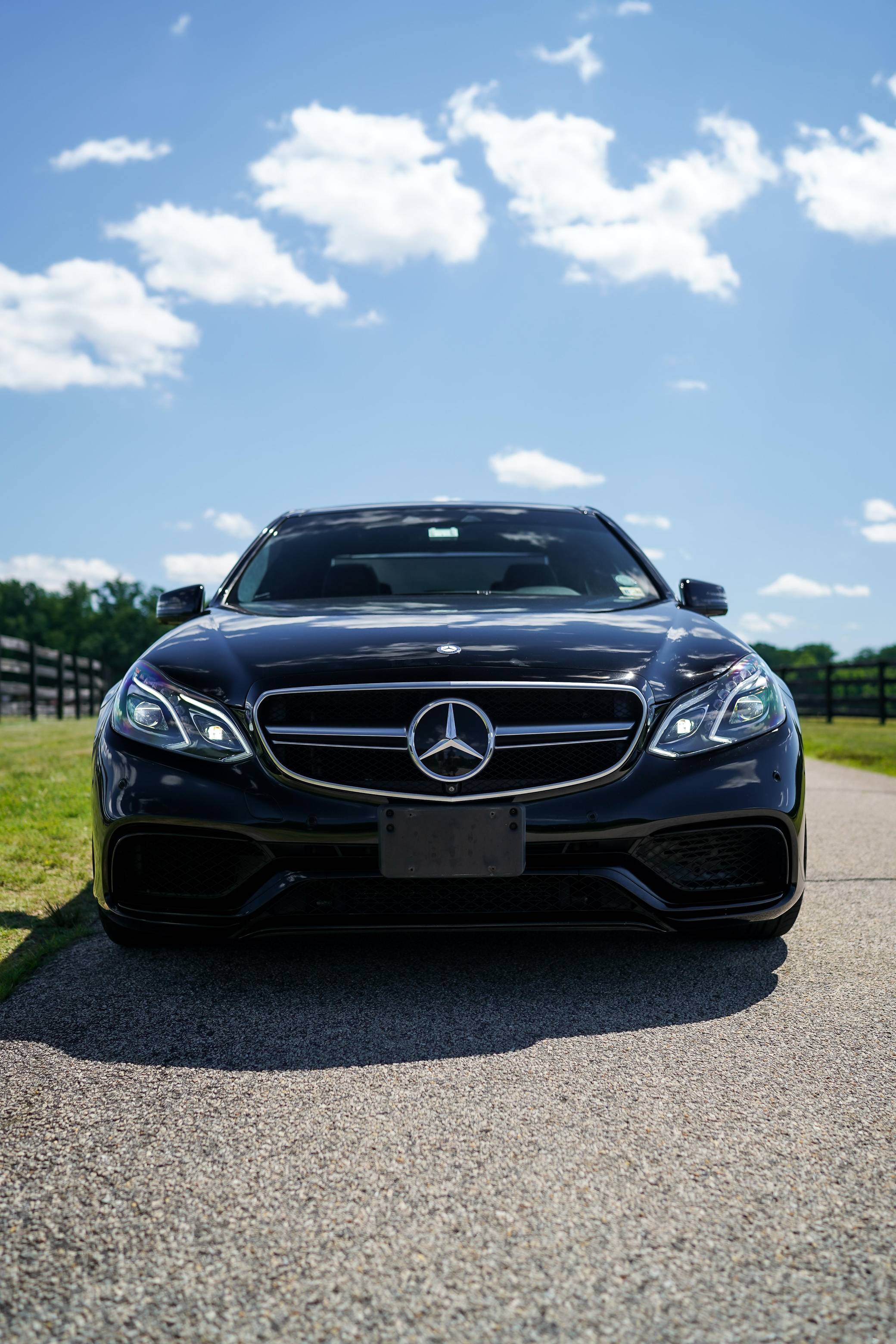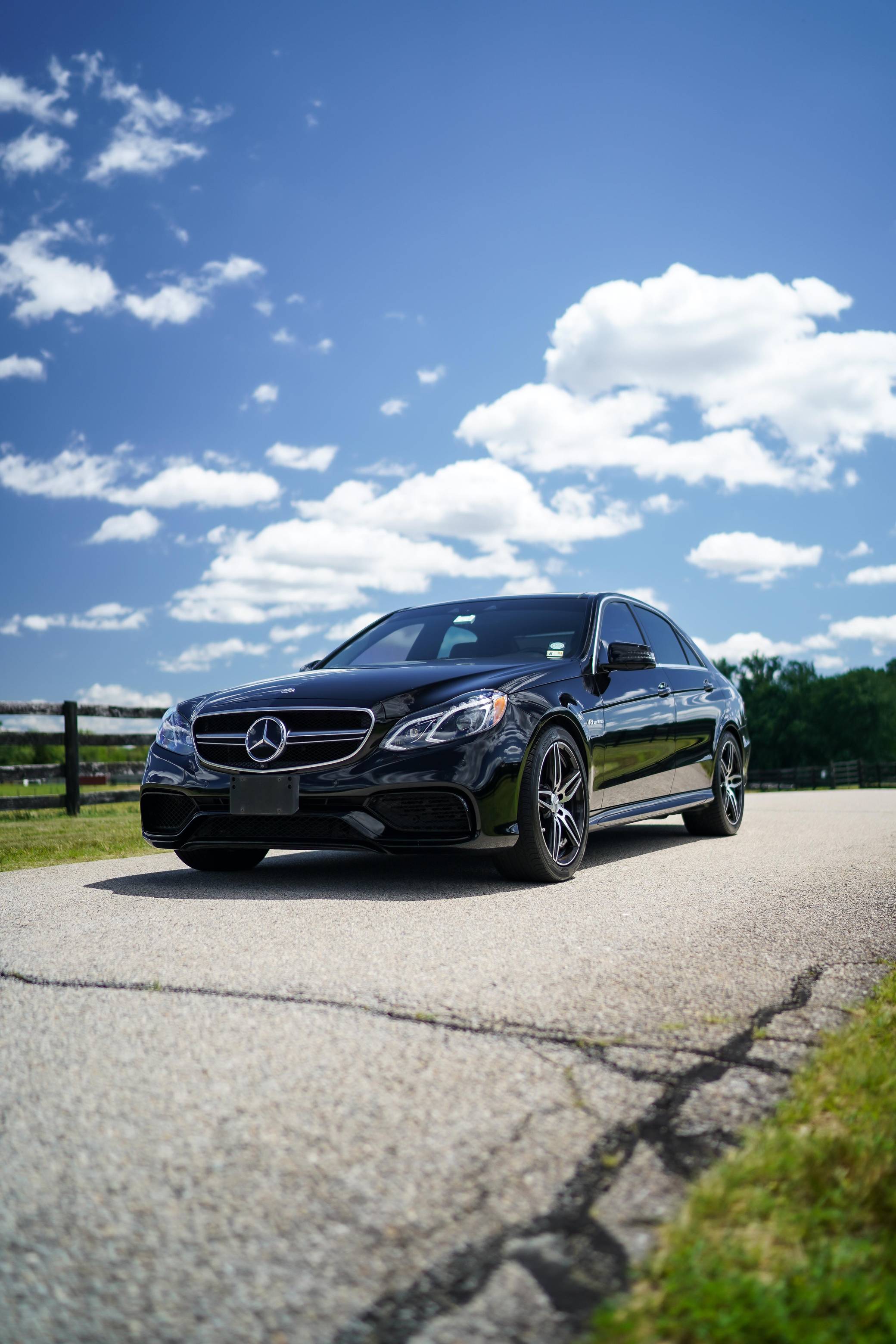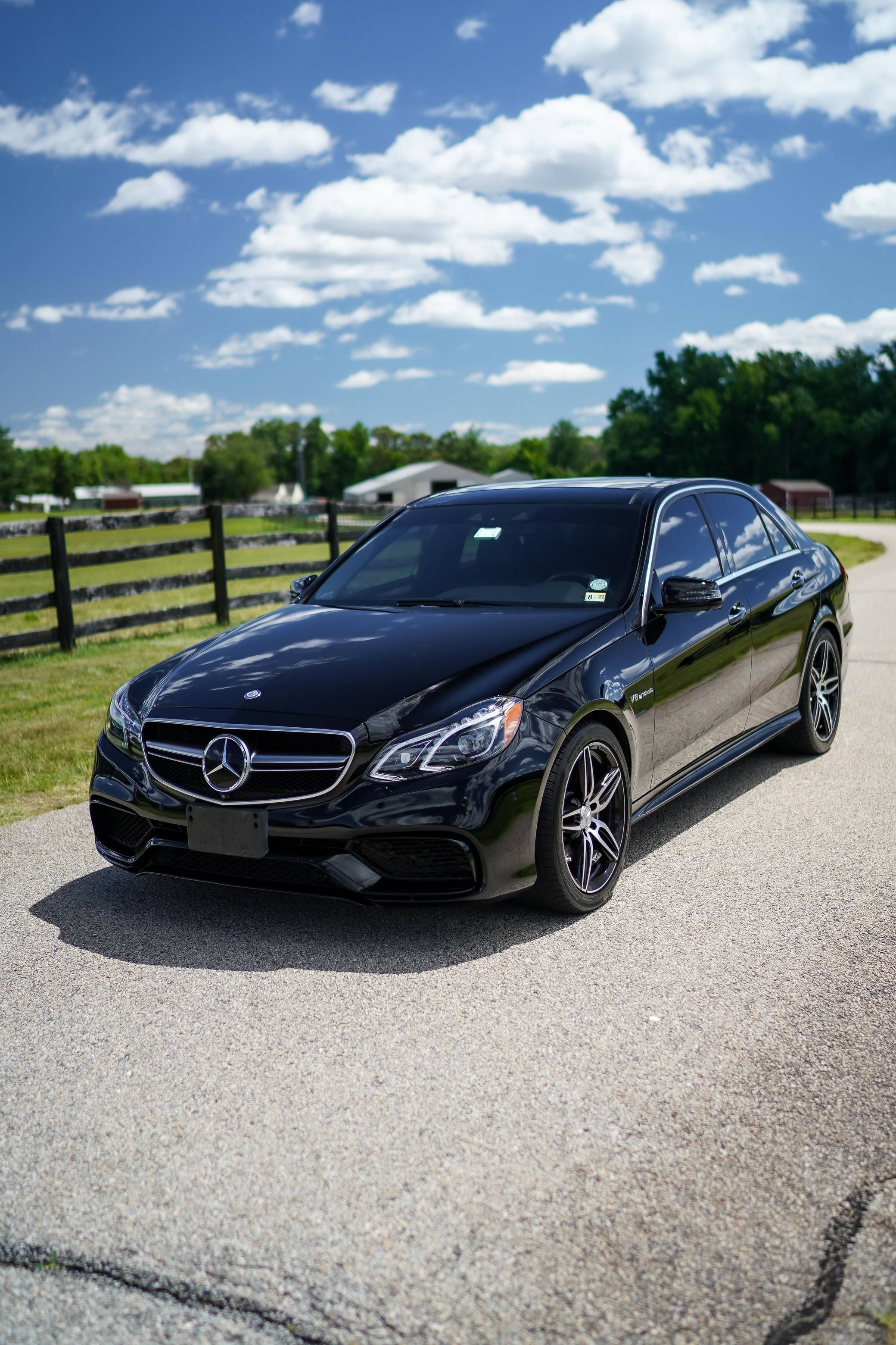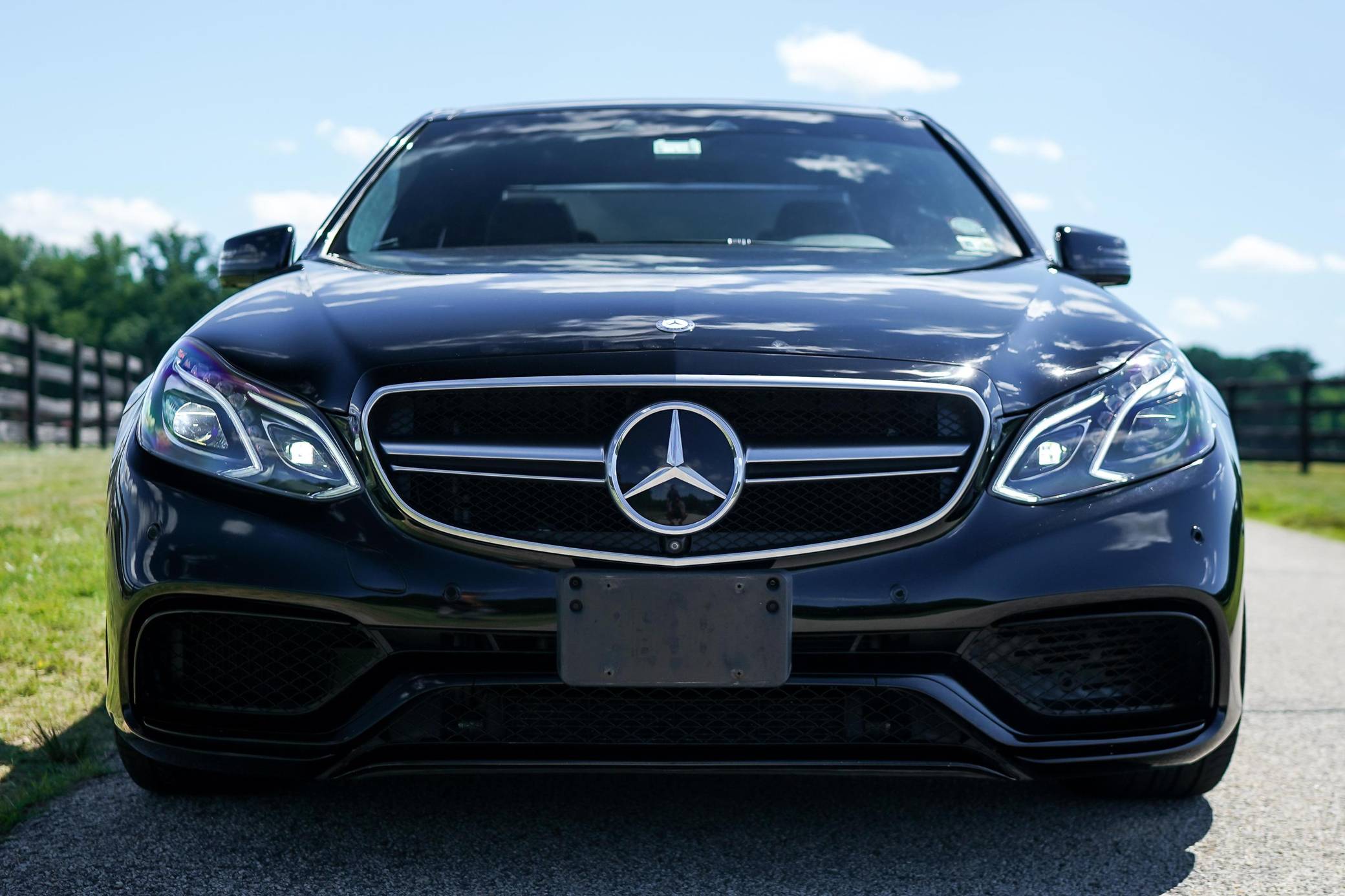 2014 Mercedes-Benz E63 AMG, finished in black with a black interior. Factory equipment includes the AMG Parking Assistance and Driver Assistance packages, LED headlights with Active Curve Illumination, a panoramic sunroof, burl walnut wood interior trim, Nappa leather upholstery, heated, ventilated, and power-adjustable active front seats, a massage function for the driver, ambient lighting, and a Harman Kardon LOGIC7 surround sound system. Modifications reported by the seller include a set of 19-inch AMG wheels from a later model and tinted windows. Mercedes-Benz released the "W212"-based E63 AMG for 2010, and it gave the model a round of significant updates for 2014. The changes included a new-look exterior design, a more powerful V8 available in two states of tune, and a rear-biased 4Matic all-wheel drive system to help route the engine's full output to the pavement. Sedan and wagon models were available until production ended in 2016. Power comes from a 5. 5-liter twin-turbocharged V8, rated at 550 horsepower and 531 lb-ft of torque. Called "M157" internally, it spins the four wheels via a 7-speed automatic transmission and Mercedes-Benz's permanent 4Matic all-wheel drive system.