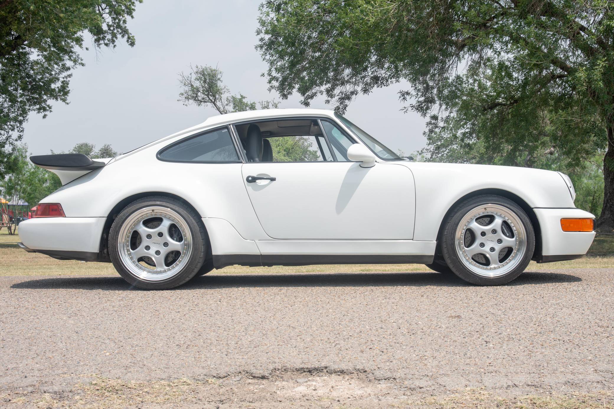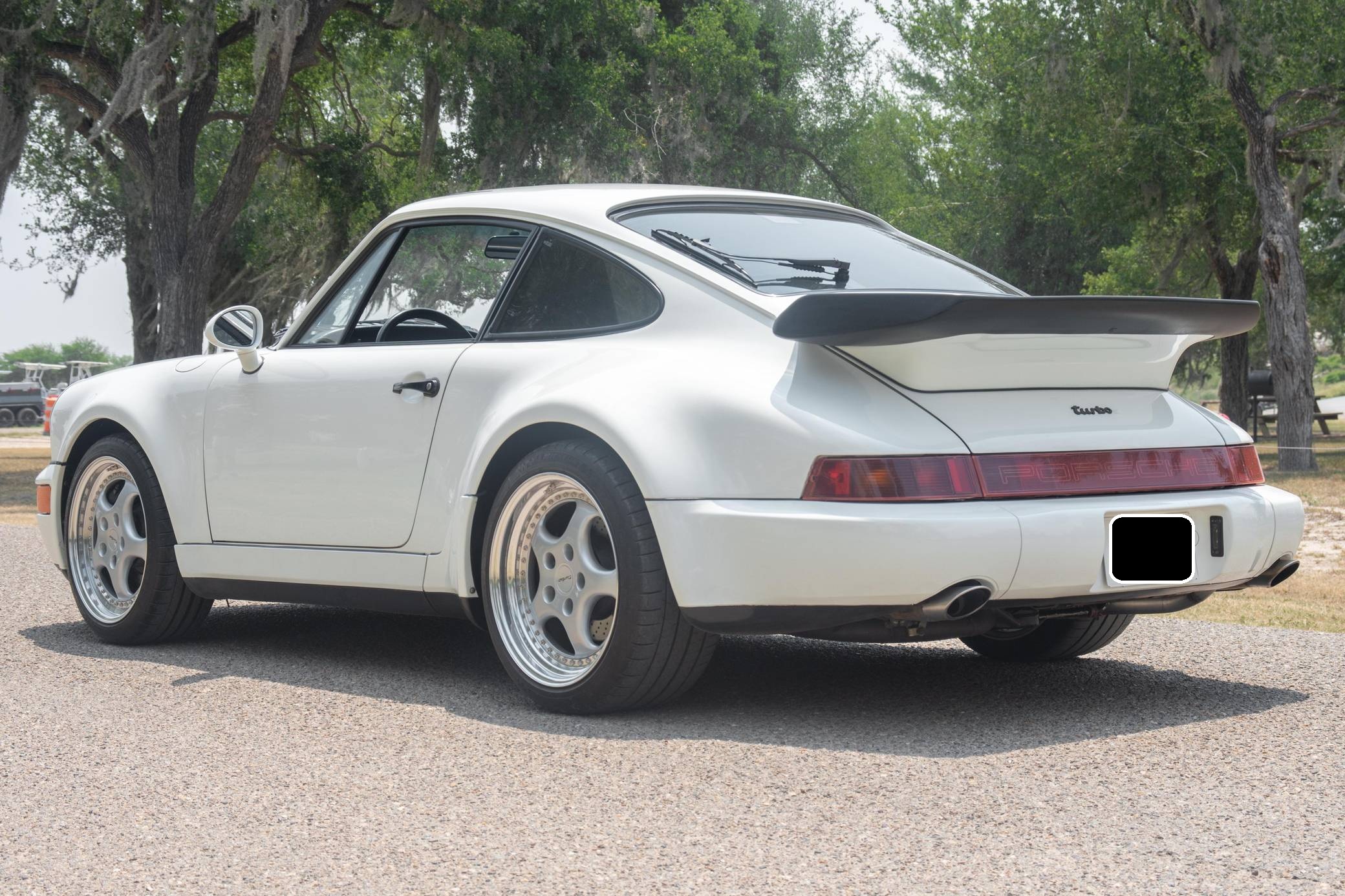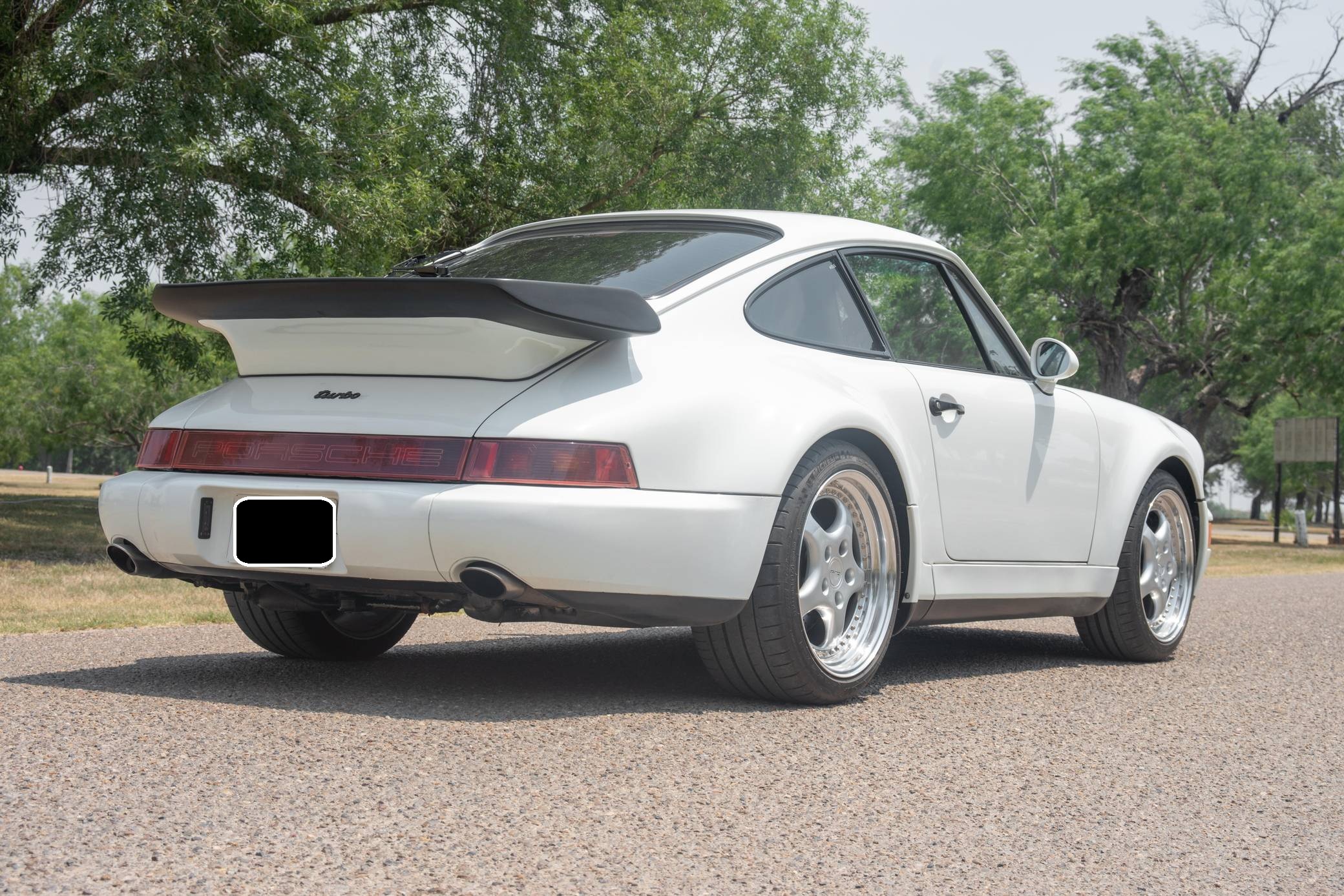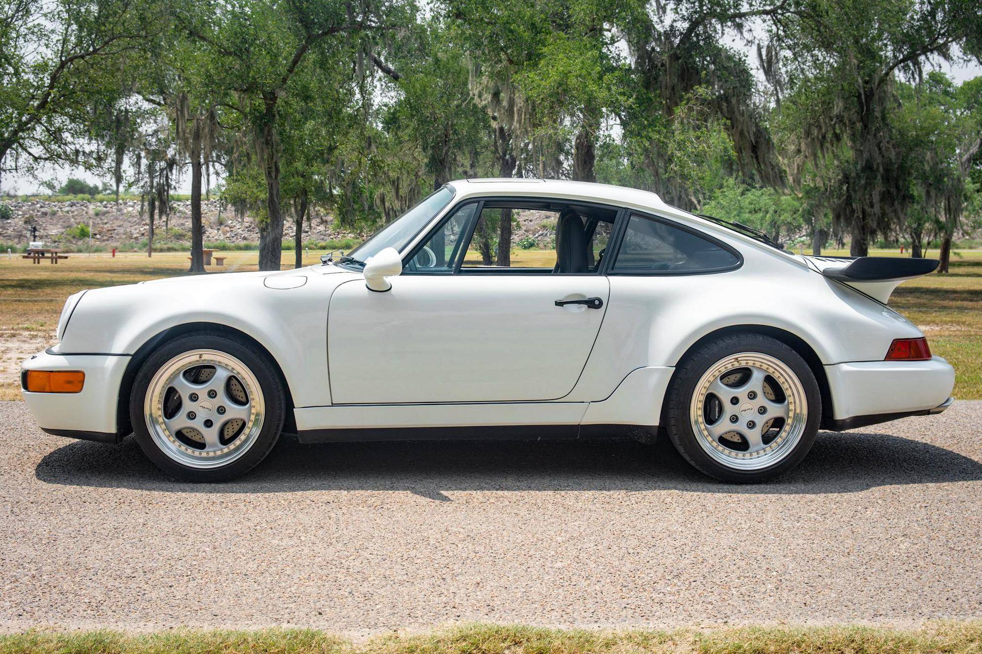 THIS. . . is a 1991 Porsche 911 Turbo, finished in Grand Prix White with a black interior. A build sheet is pictured in the gallery, and notable equipment includes a limited-slip differential, fog lights, a rear wiper, several leather-upholstered parts in the cabin, and power-adjustable door mirrors. Modifications reported by the seller include 18-inch wheels, power-adjustable front seats, and an Alpine CD player. More details about the aftermarket parts installed on this car are provided below. The 964-generation 911 was launched for 1989 and was offered as a coupe, a targa, and a convertible. Compared to the previous generation, the 964 received major design updates, more powerful engines across the board, and a redesigned rear suspension system; it was also the first 911 offered with a power-retractable spoiler, though not all variants received it. Power steering and ABS were made standard as well. Production of the 964 ended in 1993 with the introduction of the 993, Porsche's final air-cooled 911. Power comes from a 3. 3-liter turbocharged flat-6, rated at 315 horsepower and 332 lb-ft of torque. It spins the rear wheels via a 5-speed manual transmission.