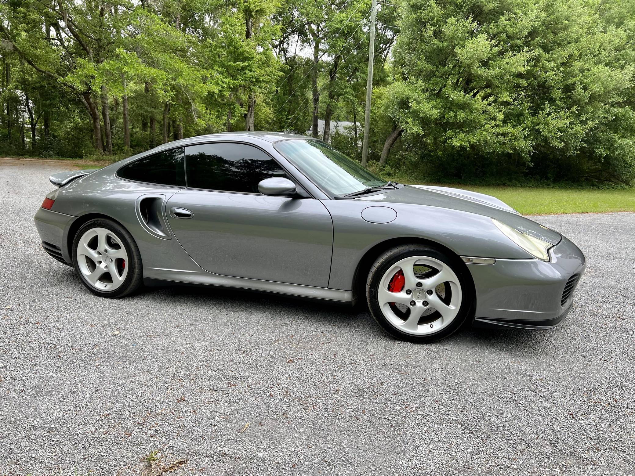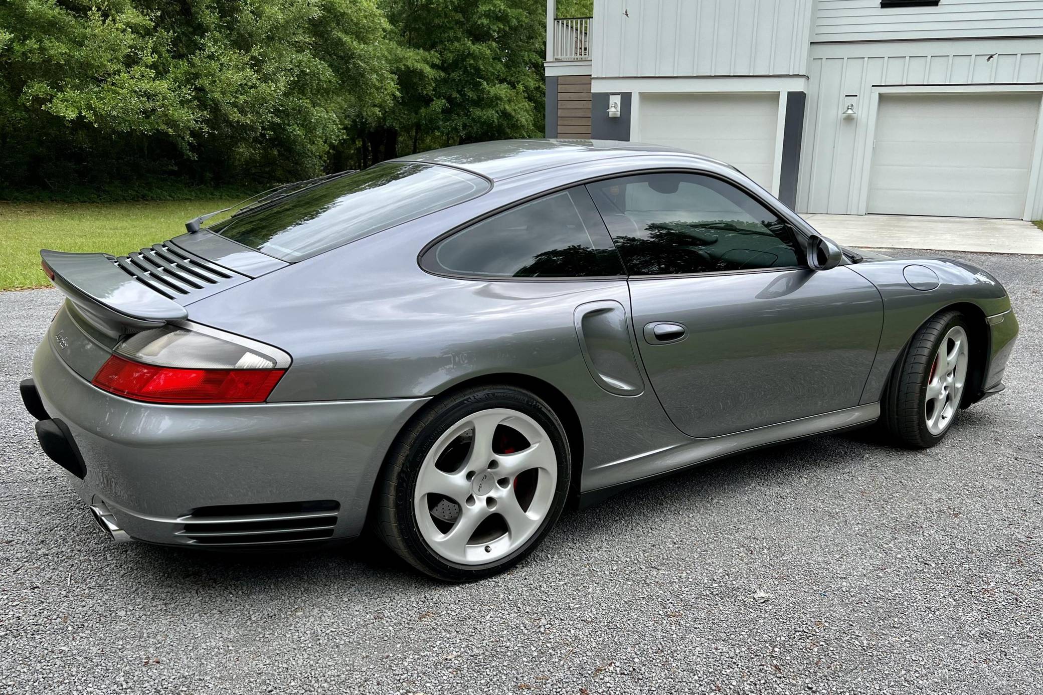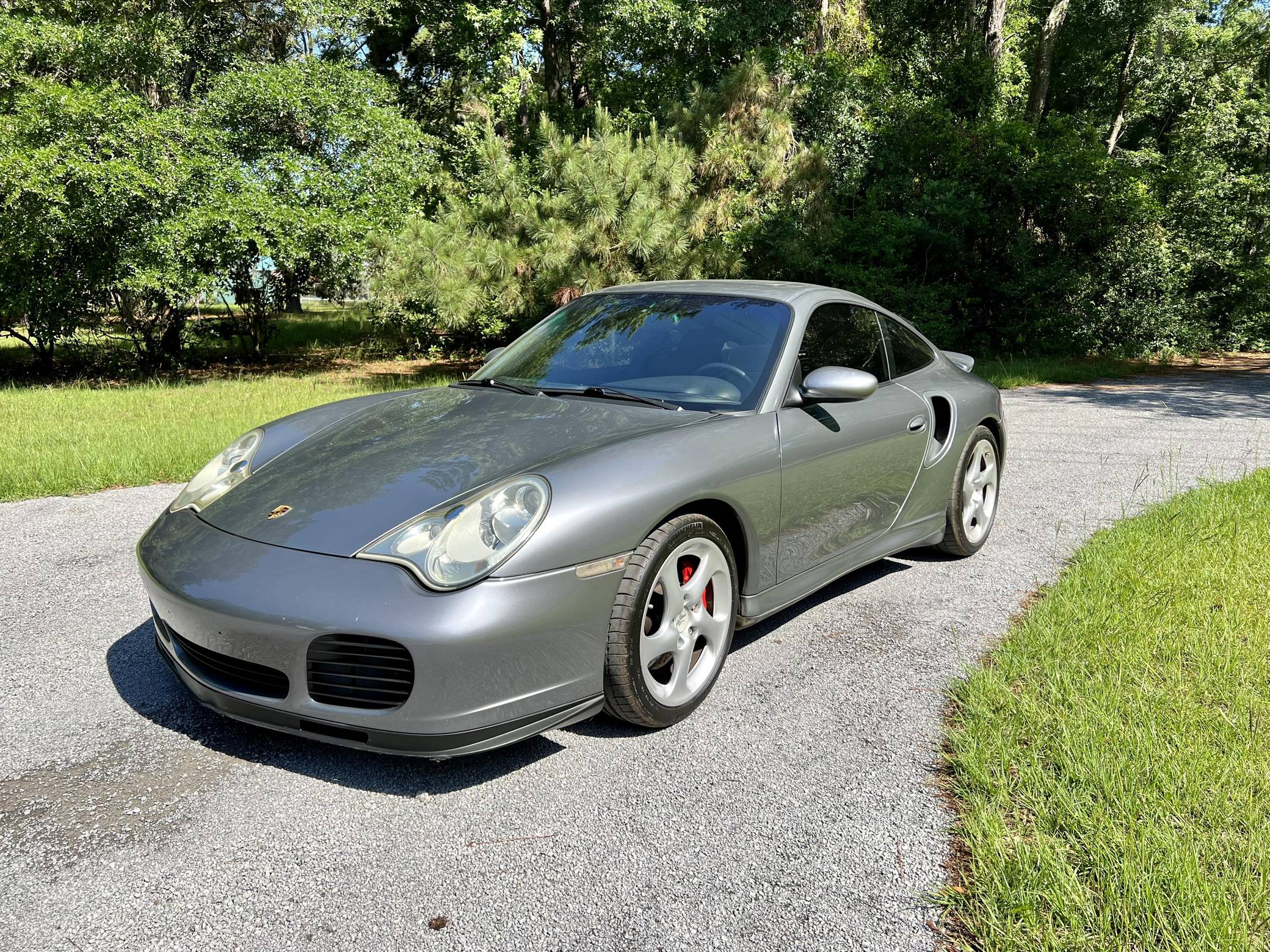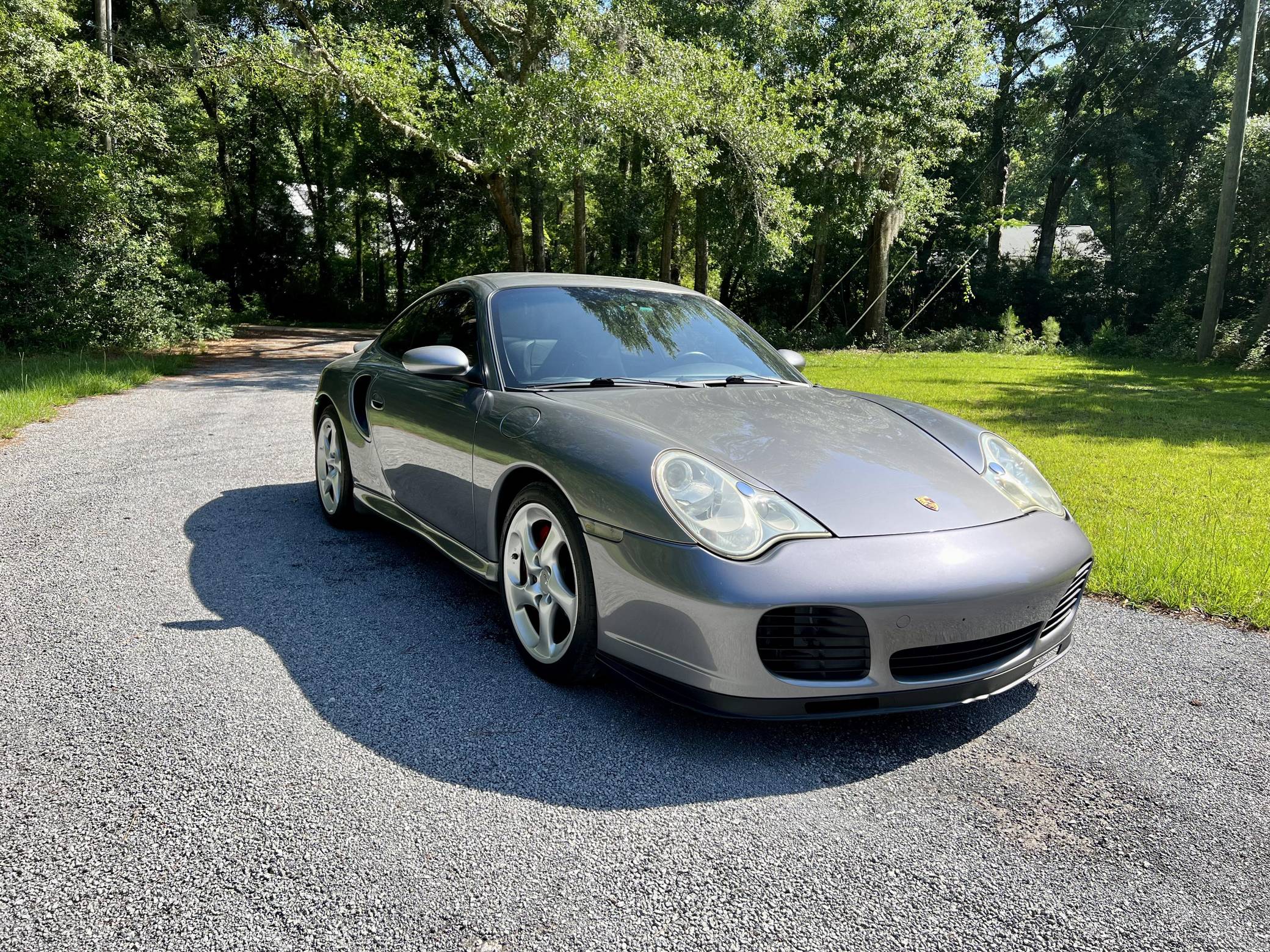 2003 Porsche 911 Turbo coupe, finished in Seal Grey Metallic with a black interior. This 911 Turbo features the desirable 6-speed manual transmission. Factory equipment includes 18-inch Turbo II hollow-spoke alloy wheels, a retractable rear spoiler, bi-xenon headlights, a rear window wiper, a full leather interior, and a Bose sound system. Modifications are limited to clear side marker lights and tinted windows. The fifth-generation 911 was introduced for the 1999 model year, with the long-awaited Turbo variant landing in America for 2001. The "996" was the first 911 to be completely redesigned from its predecessors. While its water-cooled engine and distinctive headlights irked some Porsche purists, the 996 is appreciated by enthusiasts for providing an analog driving experience in a smaller, lighter package than the 911s that followed it. Power comes from a turbocharged 3. 6-liter flat-6 "Mezger" engine, rated at 415 horsepower and 413 lb-ft of torque. Output is sent to all four wheels via a 6-speed manual transmission.
