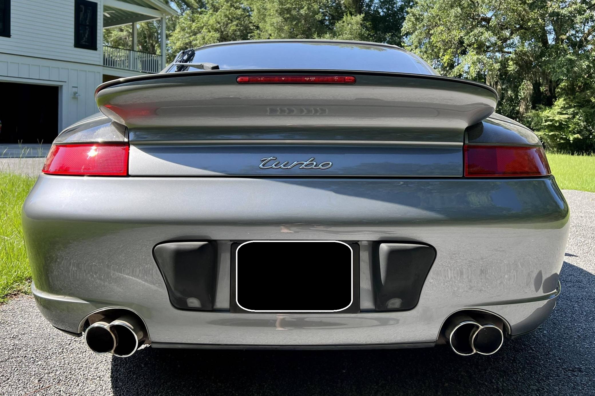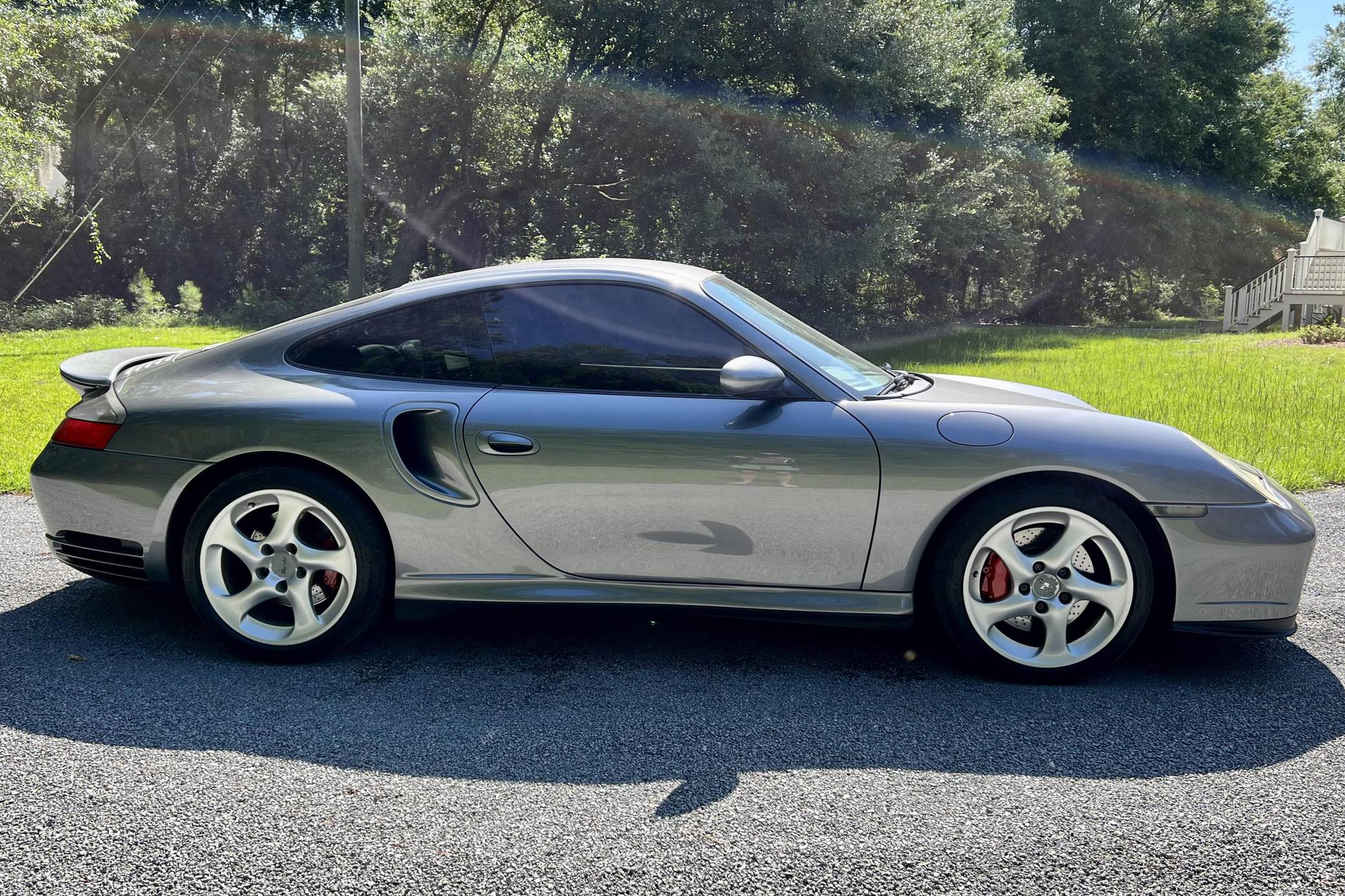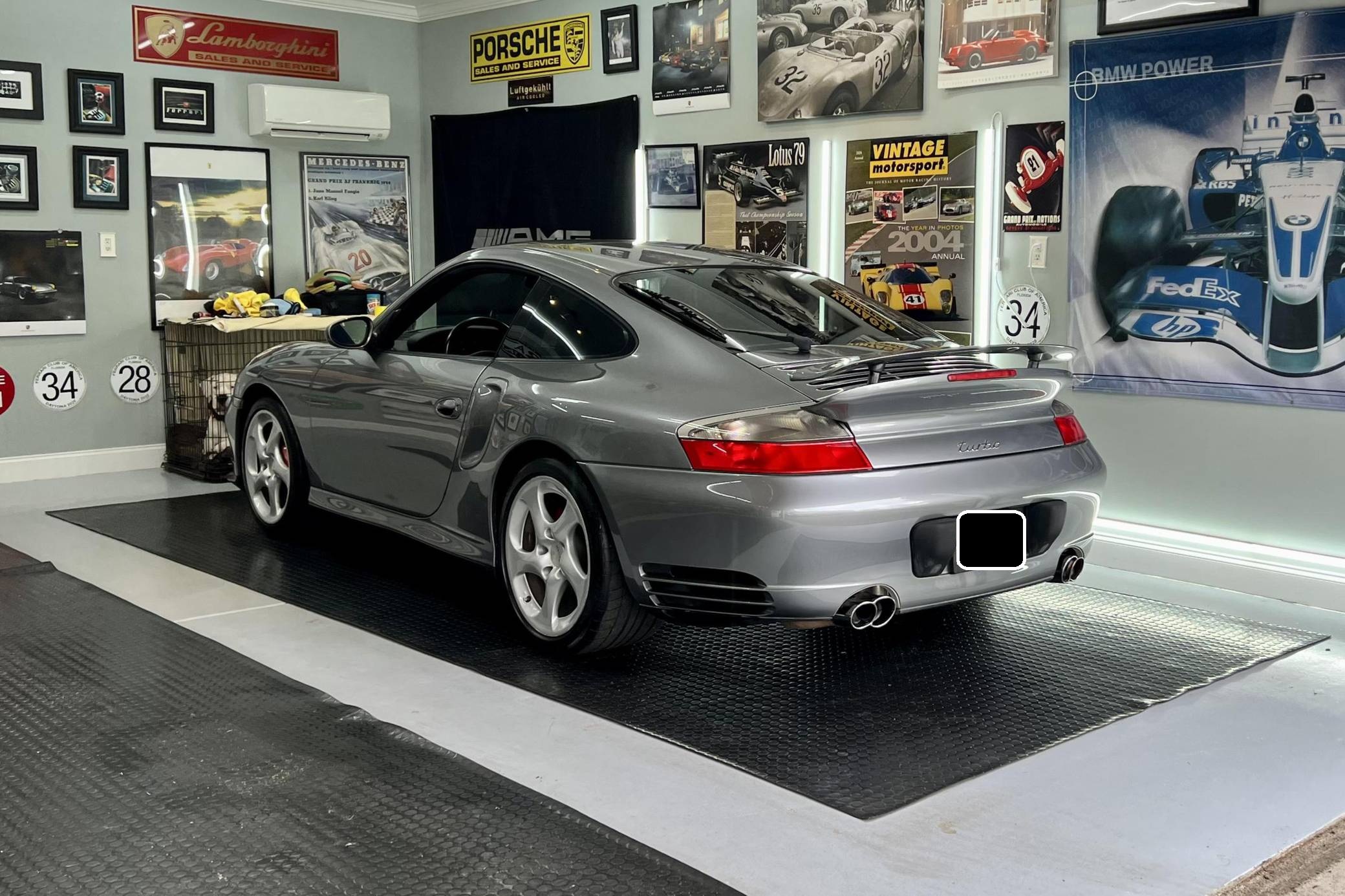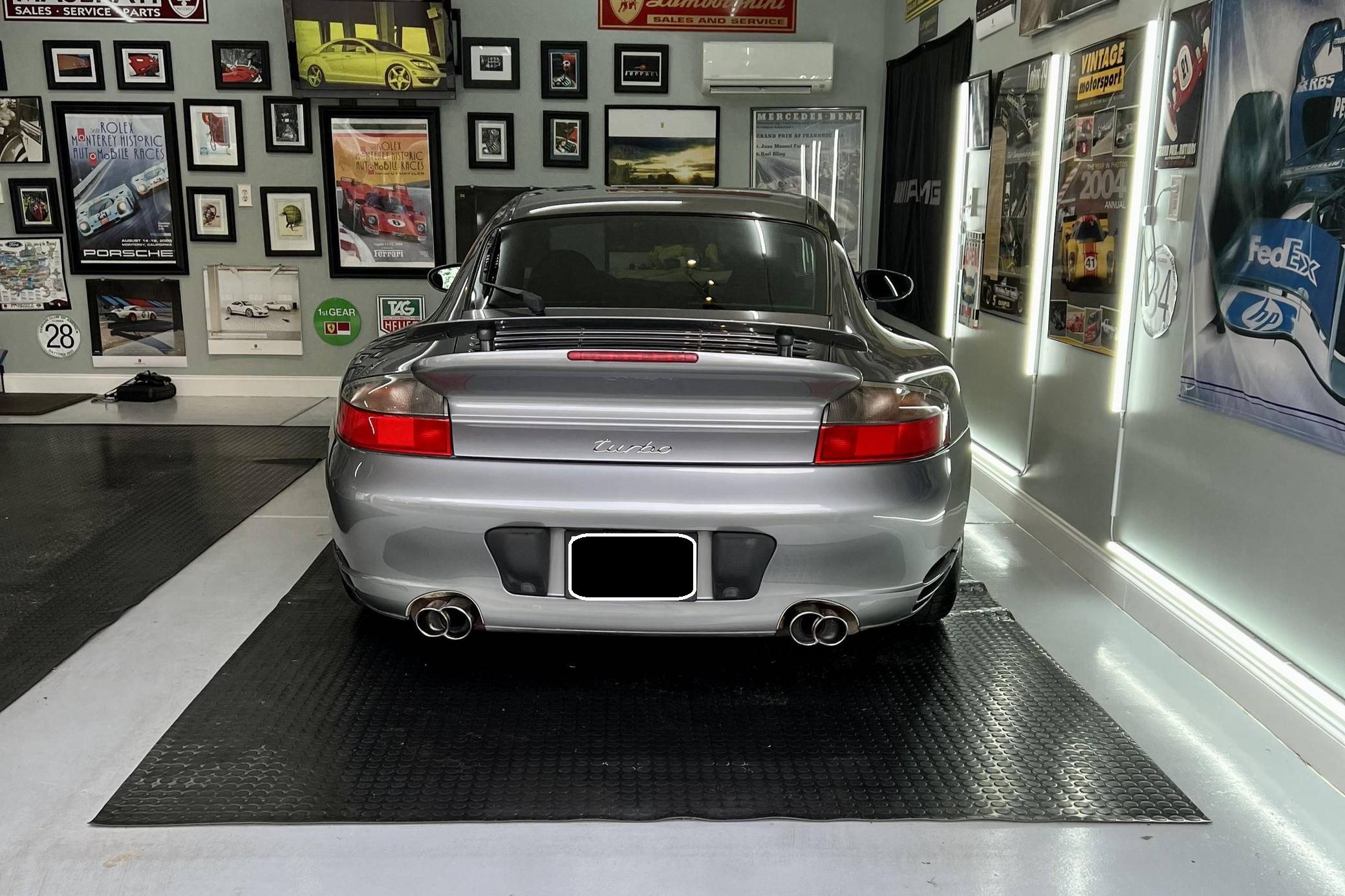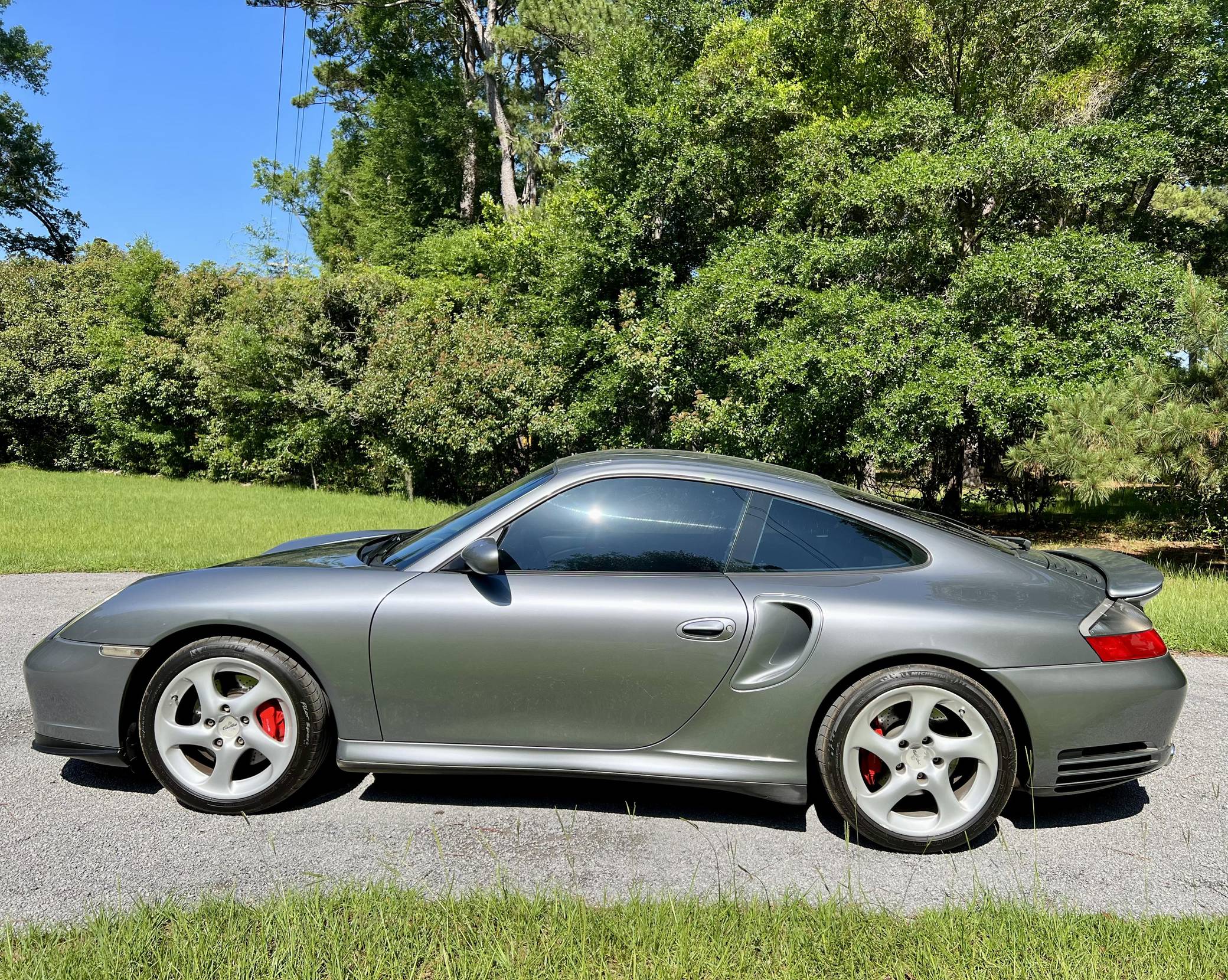 2003 Porsche 911 Turbo coupe, finished in Seal Grey Metallic with a black interior. This 911 Turbo features the desirable 6-speed manual transmission. Factory equipment includes 18-inch Turbo II hollow-spoke alloy wheels, a retractable rear spoiler, bi-xenon headlights, a rear window wiper, a full leather interior, and a Bose sound system. Modifications are limited to clear side marker lights and tinted windows. The fifth-generation 911 was introduced for the 1999 model year, with the long-awaited Turbo variant landing in America for 2001. The "996" was the first 911 to be completely redesigned from its predecessors. While its water-cooled engine and distinctive headlights irked some Porsche purists, the 996 is appreciated by enthusiasts for providing an analog driving experience in a smaller, lighter package than the 911s that followed it. Power comes from a turbocharged 3. 6-liter flat-6 "Mezger" engine, rated at 415 horsepower and 413 lb-ft of torque. Output is sent to all four wheels via a 6-speed manual transmission.