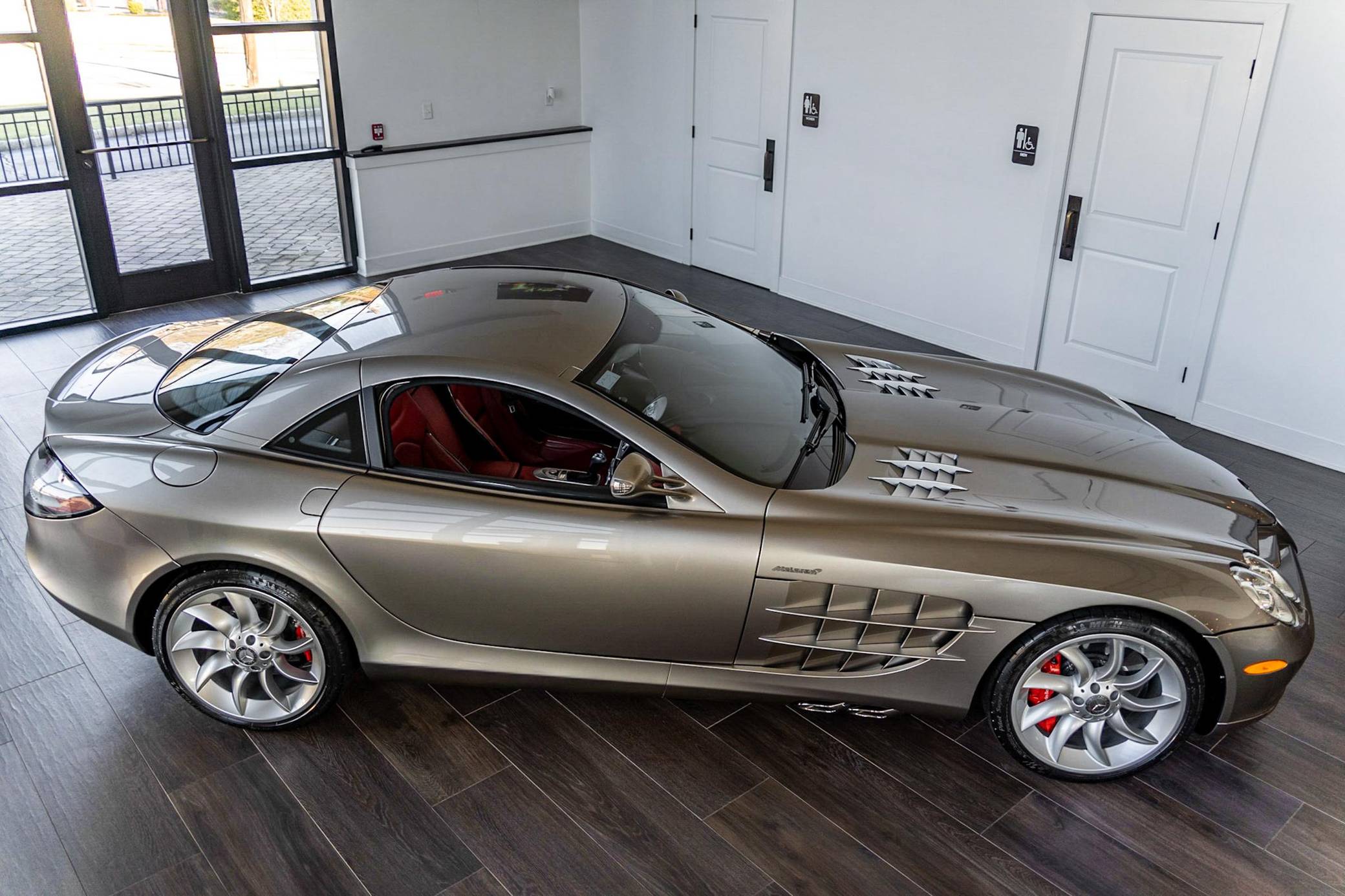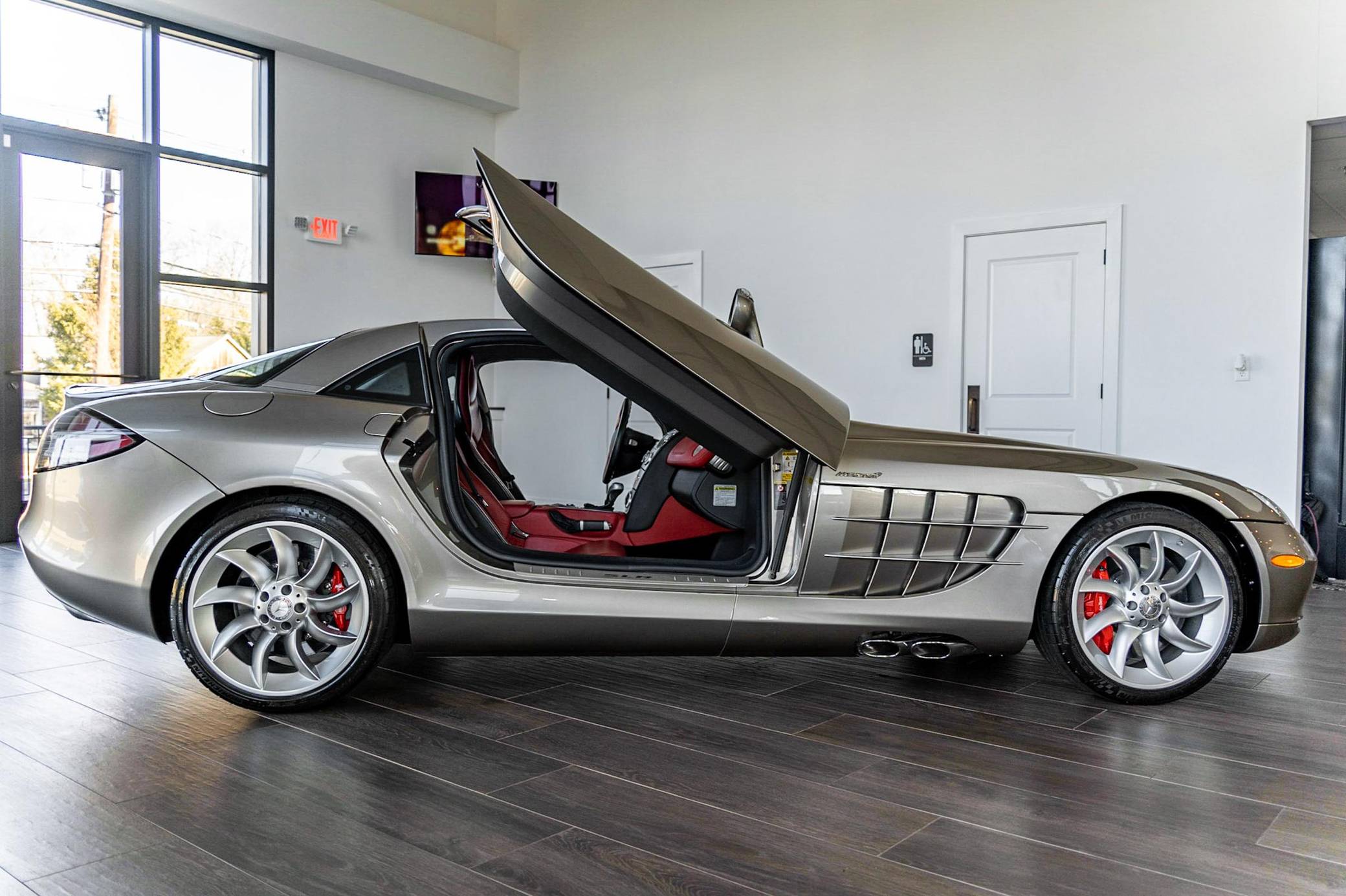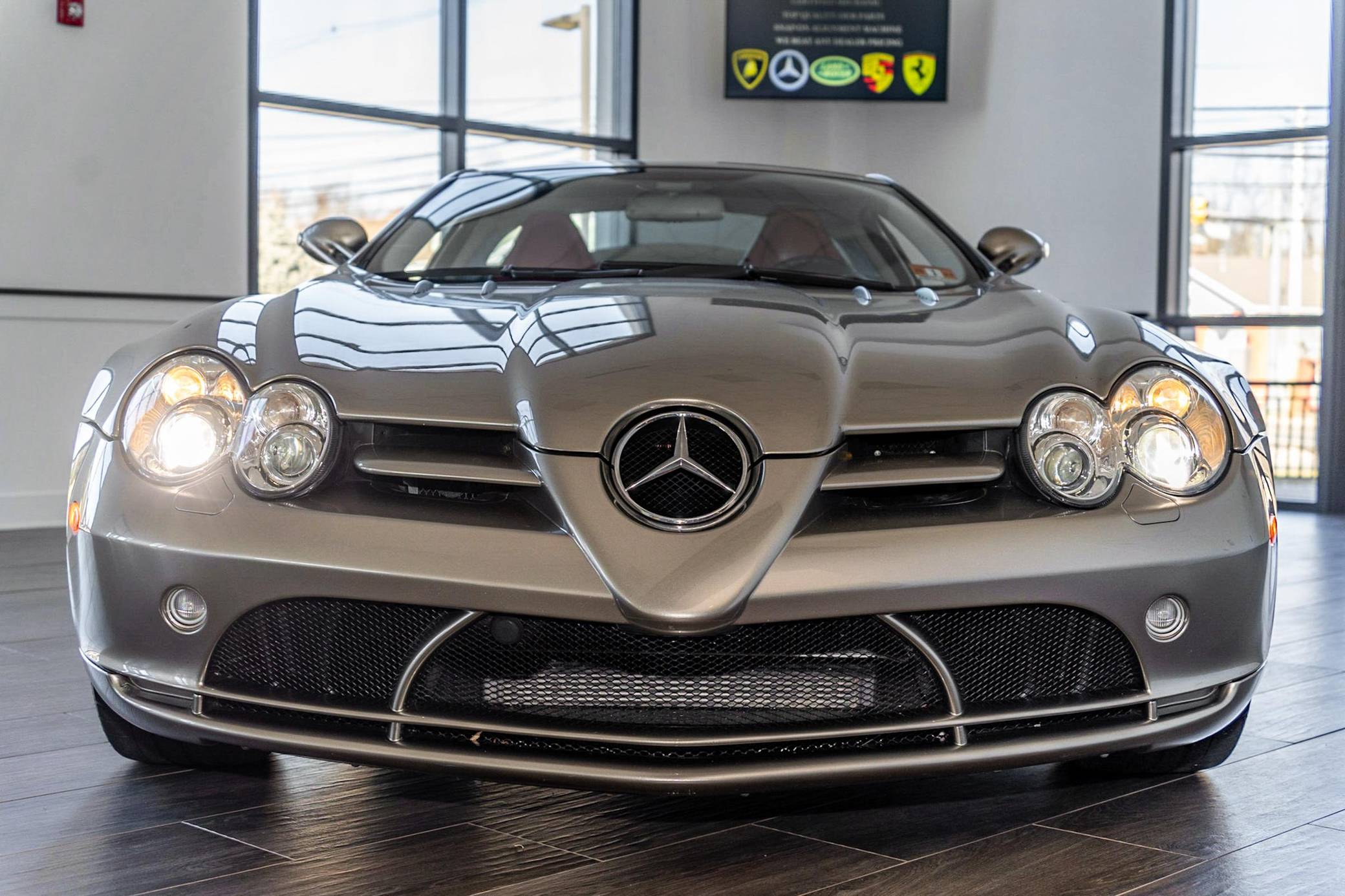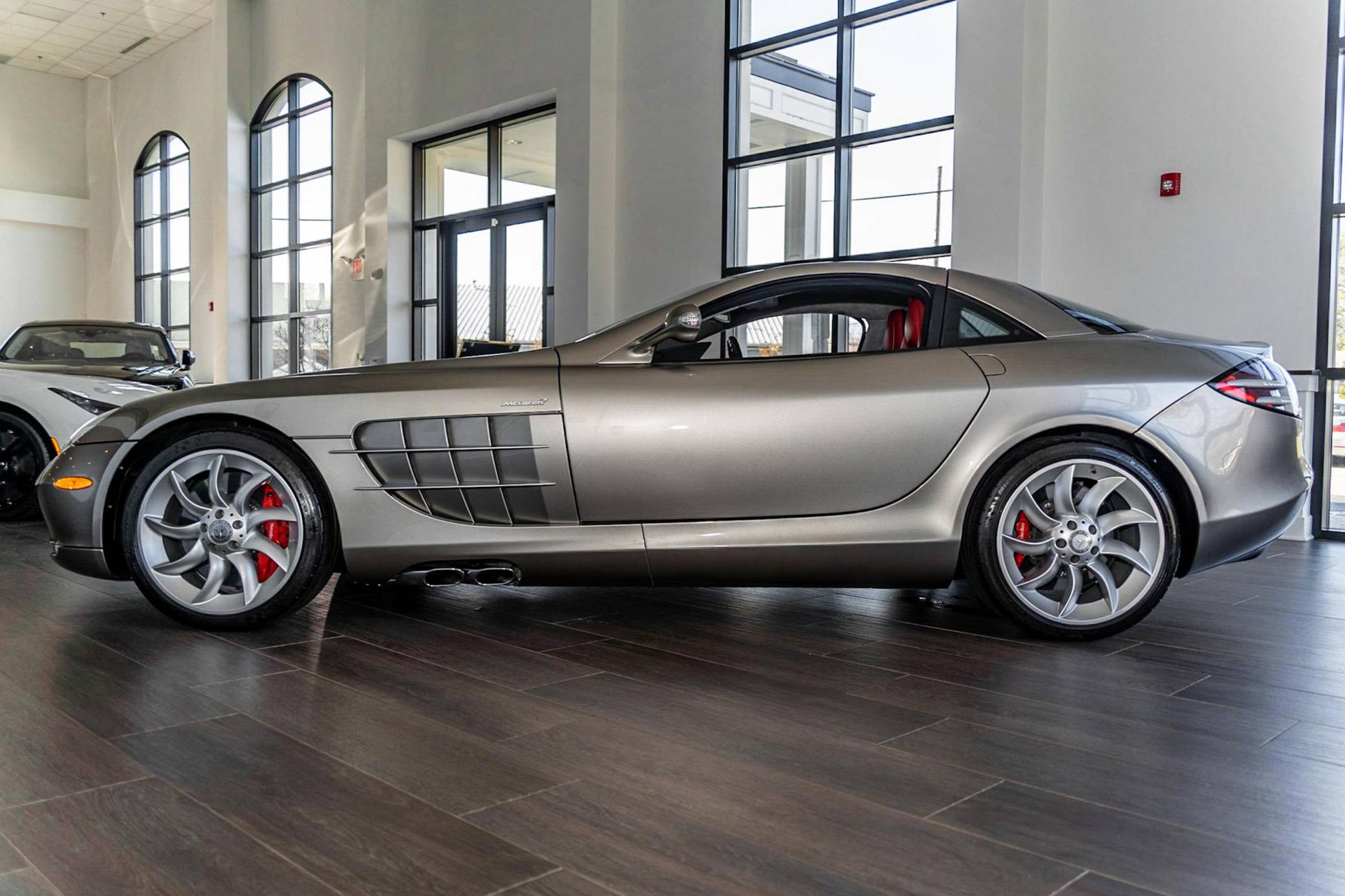 THIS… is a 2006 Mercedes-Benz SLR McLaren Coupe, finished in Crystal Coronadite Grey over a 300SL Red interior. The odometer currently displays approximately 10,900 miles. It also shows that it has been primarily registered in Florida. Modifications reported by the seller are limited to paint protection film on the front end. Born out of a collaboration between Mercedes-Benz and McLaren, the SLR took inspiration from the legendary 300 SLR “Uhlenhaut Coupé” to become the Silver Arrow of the 21st century. Βased on a carbon fiber chassis and a front-mid-mounted supercharged V8 providing a tsunami of torque and a biblical soundtrack, the SLR left its mark as one of the most special Mercedes models in recent history. A total of 2,157 examples were reportedly produced in Coupe, and Roadster body styles, including 75 Stirling Moss speedsters. Power comes from a hand-built “M155” 5. 4-liter supercharged V8, rated at 617 horsepower and 575 lb-ft of torque. Output is sent to the rear wheels via a 5-speed “AMG Speedshift R” automatic transmission.