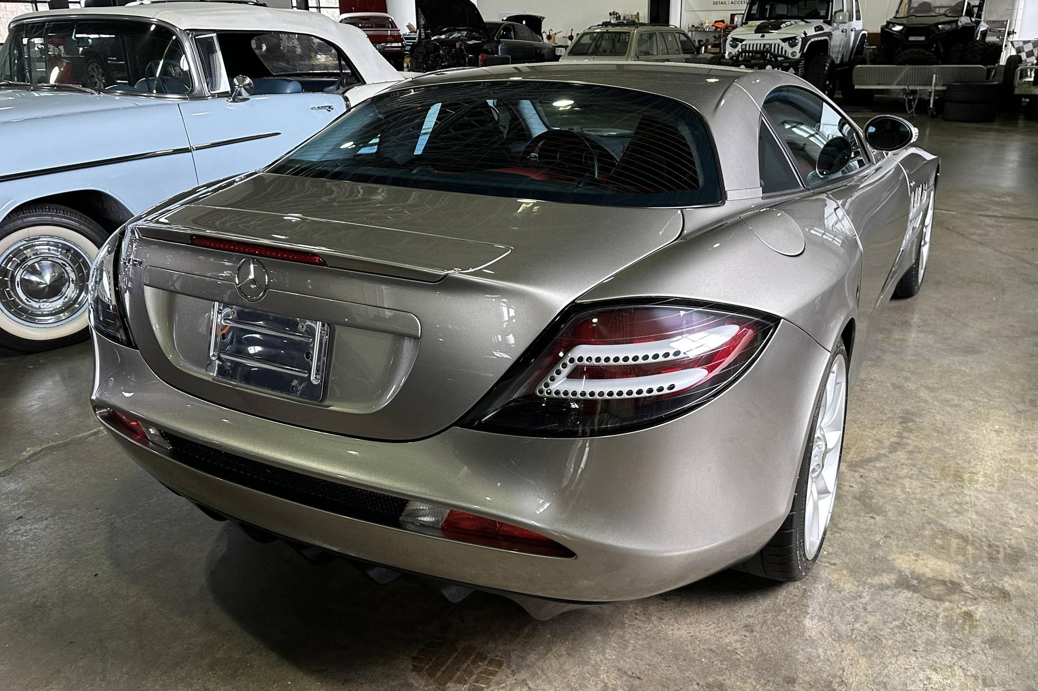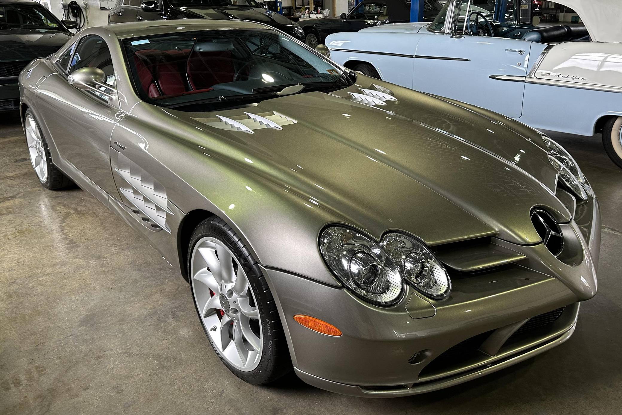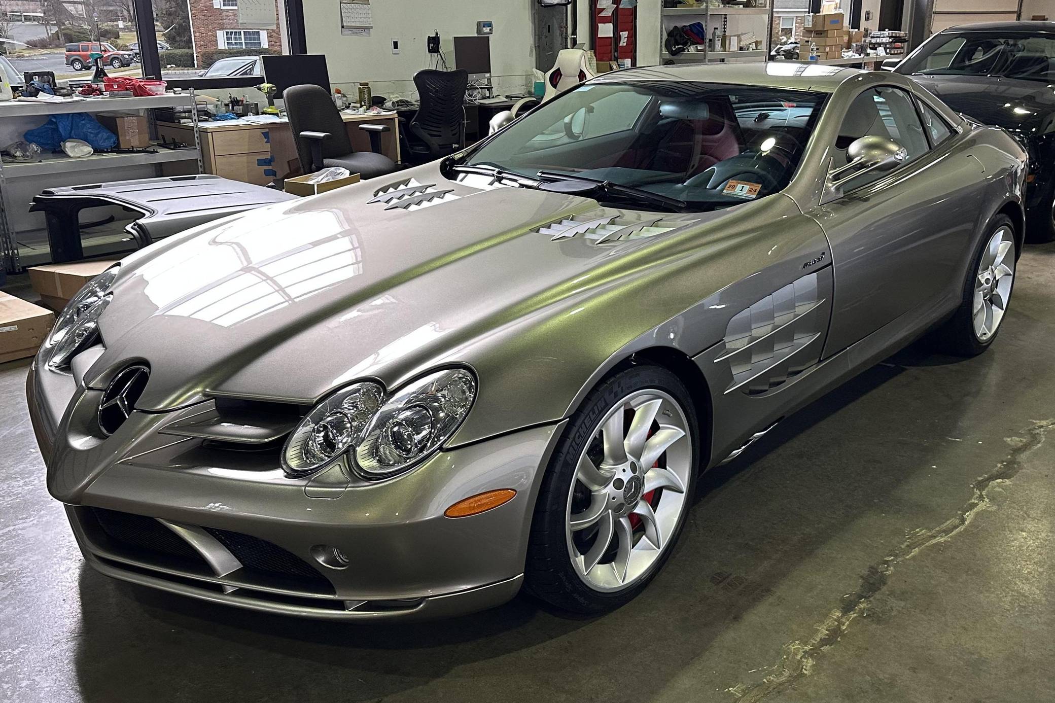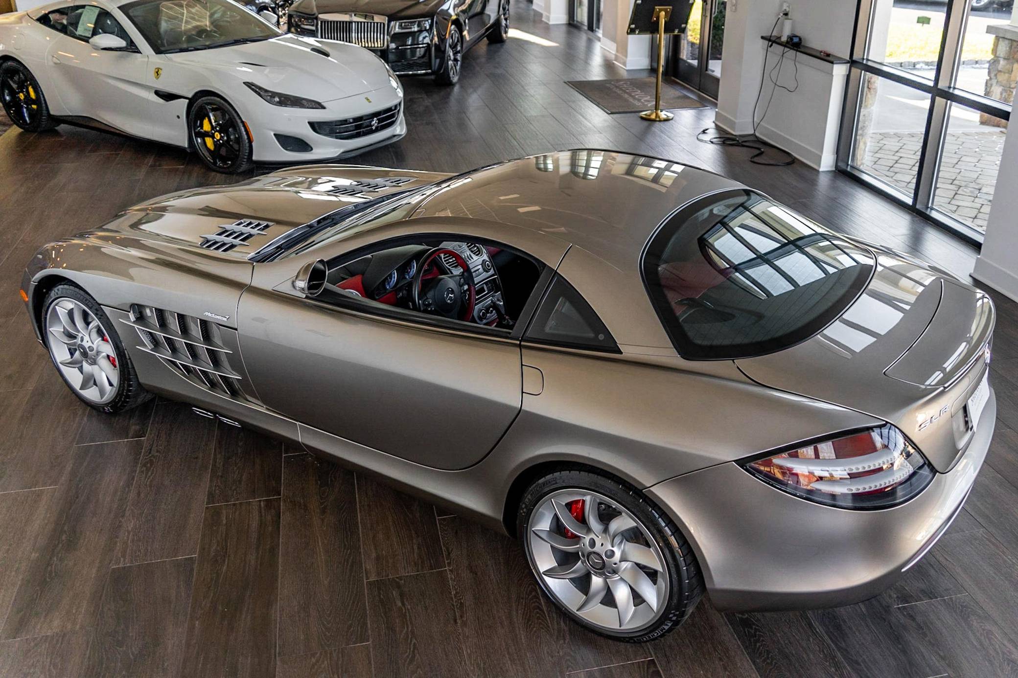 THIS… is a 2006 Mercedes-Benz SLR McLaren Coupe, finished in Crystal Coronadite Grey over a 300SL Red interior. The odometer currently displays approximately 10,900 miles. It also shows that it has been primarily registered in Florida. Modifications reported by the seller are limited to paint protection film on the front end. Born out of a collaboration between Mercedes-Benz and McLaren, the SLR took inspiration from the legendary 300 SLR “Uhlenhaut Coupé” to become the Silver Arrow of the 21st century. Βased on a carbon fiber chassis and a front-mid-mounted supercharged V8 providing a tsunami of torque and a biblical soundtrack, the SLR left its mark as one of the most special Mercedes models in recent history. A total of 2,157 examples were reportedly produced in Coupe, and Roadster body styles, including 75 Stirling Moss speedsters. Power comes from a hand-built “M155” 5. 4-liter supercharged V8, rated at 617 horsepower and 575 lb-ft of torque. Output is sent to the rear wheels via a 5-speed “AMG Speedshift R” automatic transmission.