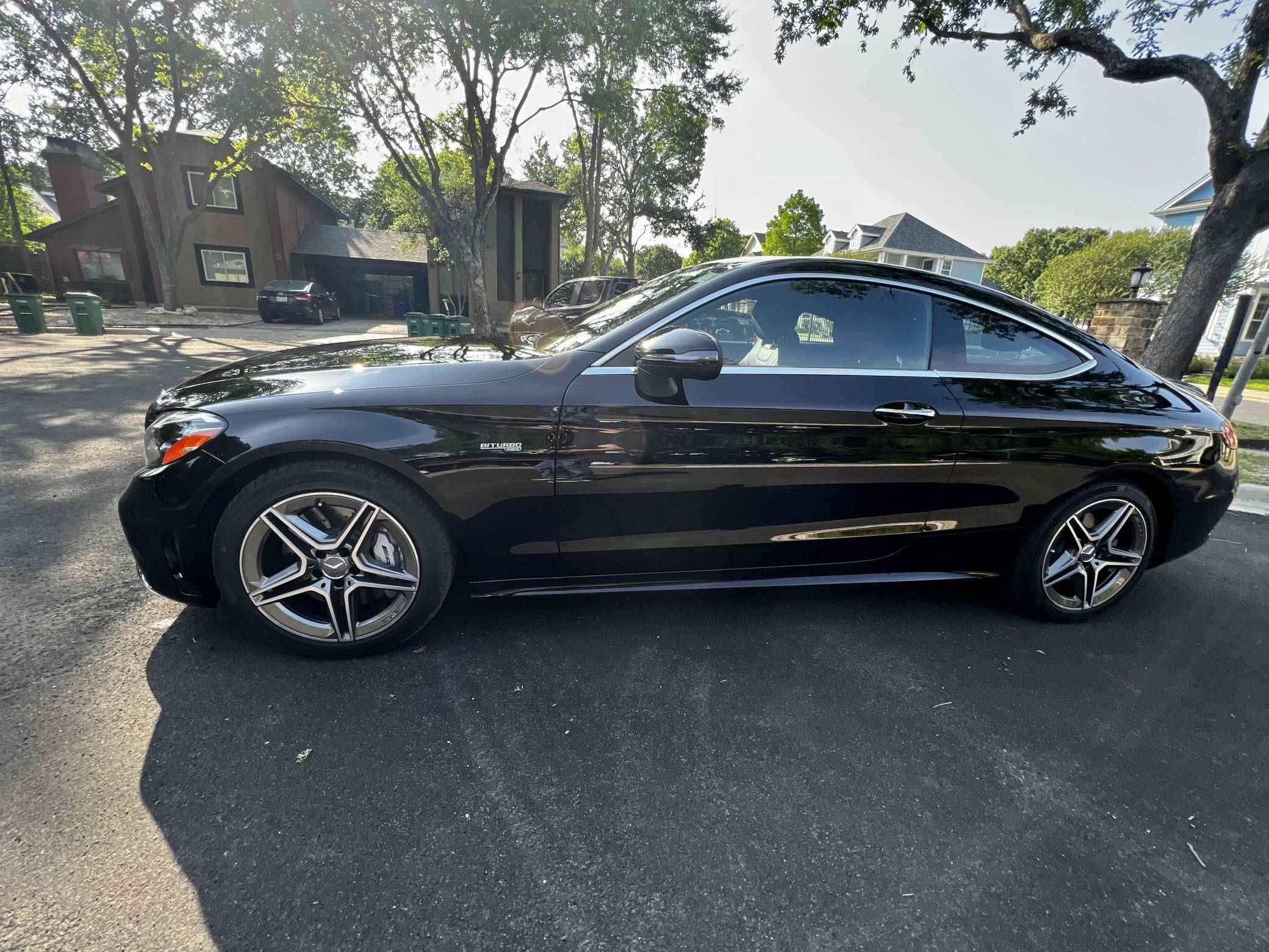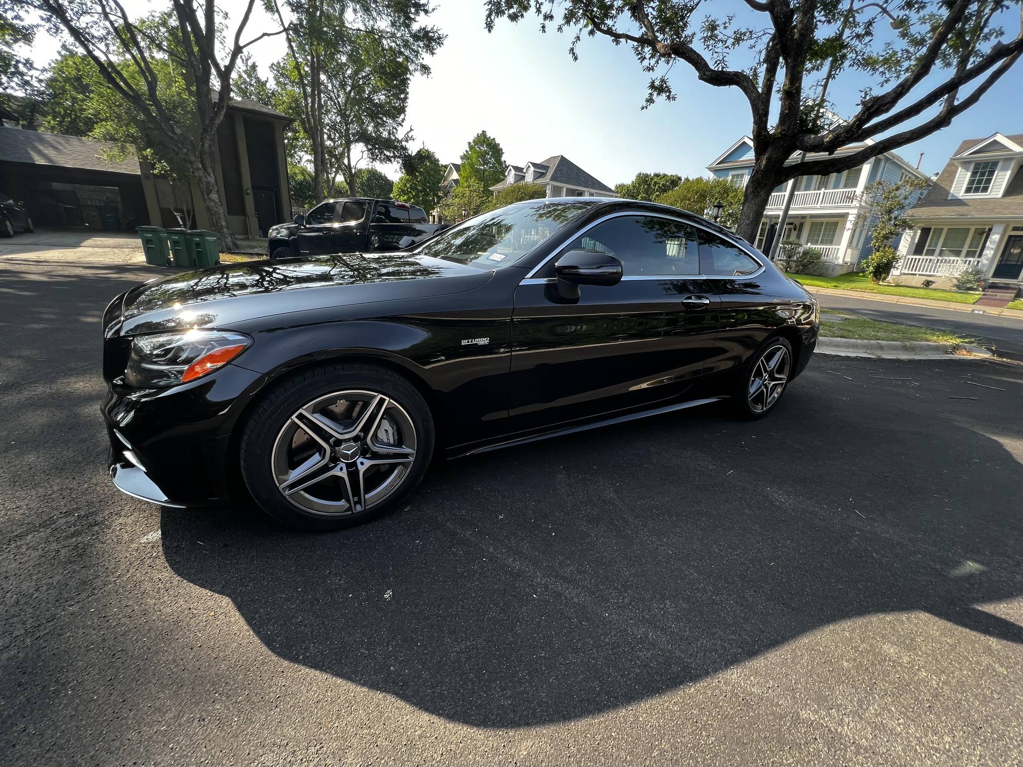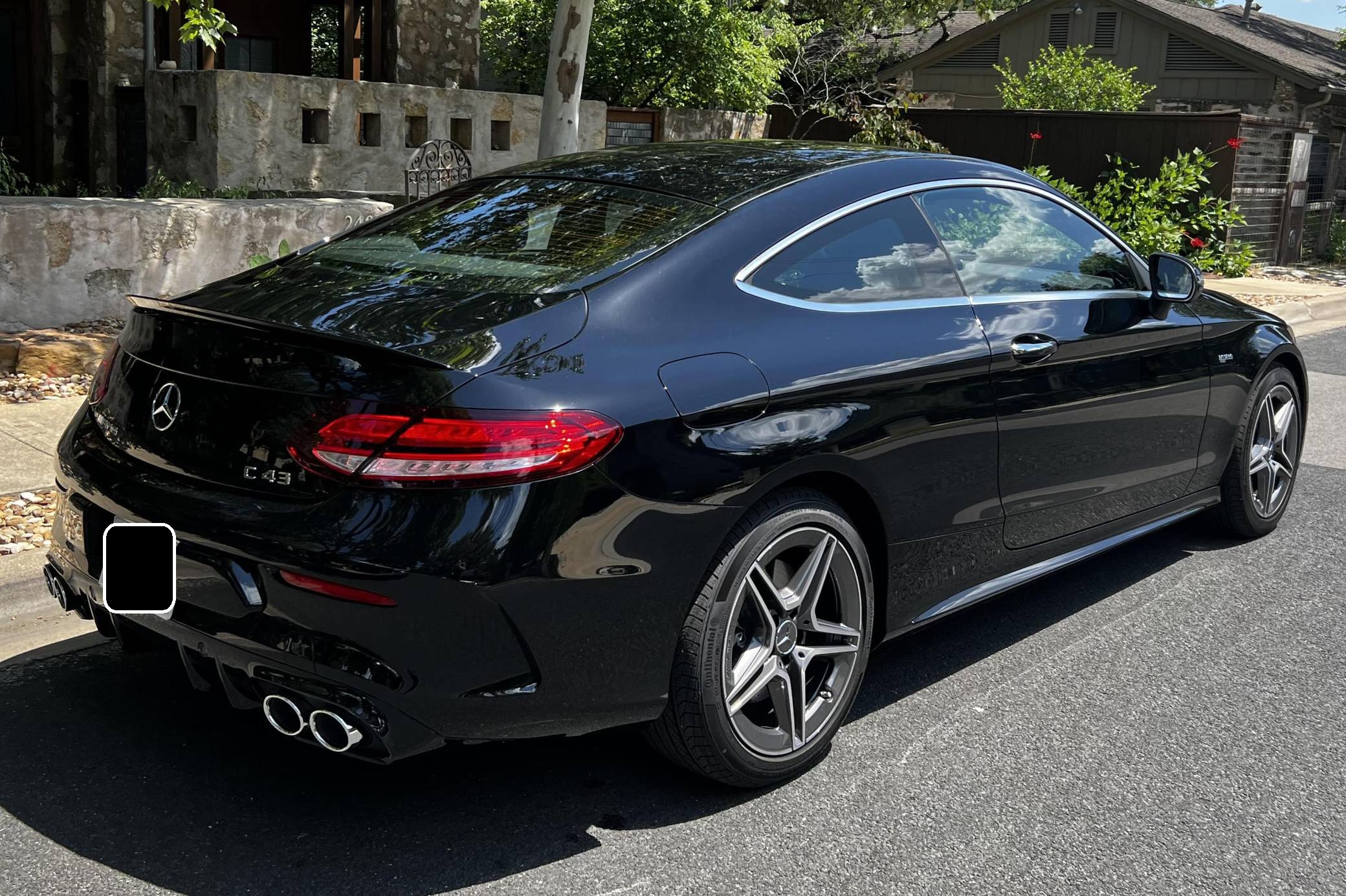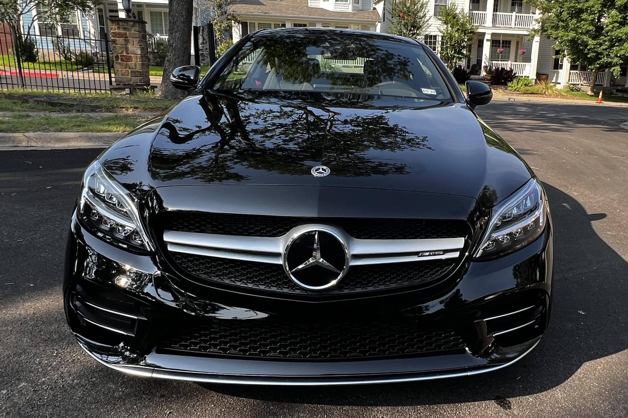 2022 Mercedes-AMG C43 AMG Coupe, finished in black with a black interior. The seller reports no modifications. The "C205" C-Class coupe was launched in 2015, and the AMG variant debuted a year later with a twin-turbocharged engine, adaptive suspension, and a selectable exhaust note. Aimed Squarely at Lexus' RC F, this potent AMG-tuned coupe could make the 0-60 mph dash in just over 4 seconds, according to Car and Driver. Power comes from a twin-turbocharged 3. 0-liter V6, rated at 385 horsepower and 384 lb-ft of torque. It spins all four wheels via a 9-speed automatic transmission and Mercedes-Benz's 4Matic all-wheel-drive system.