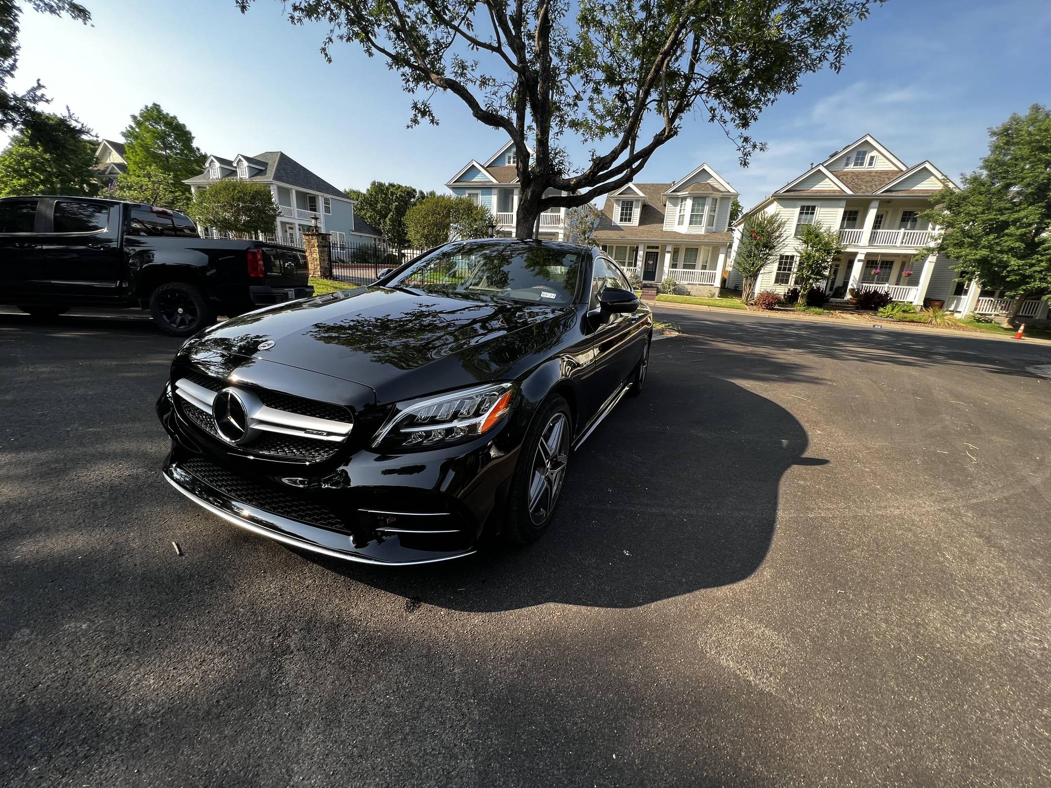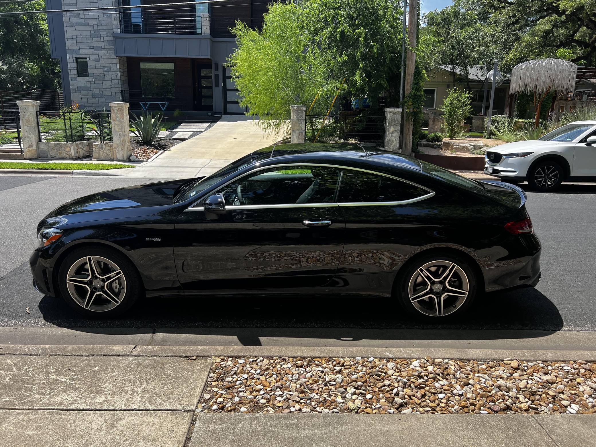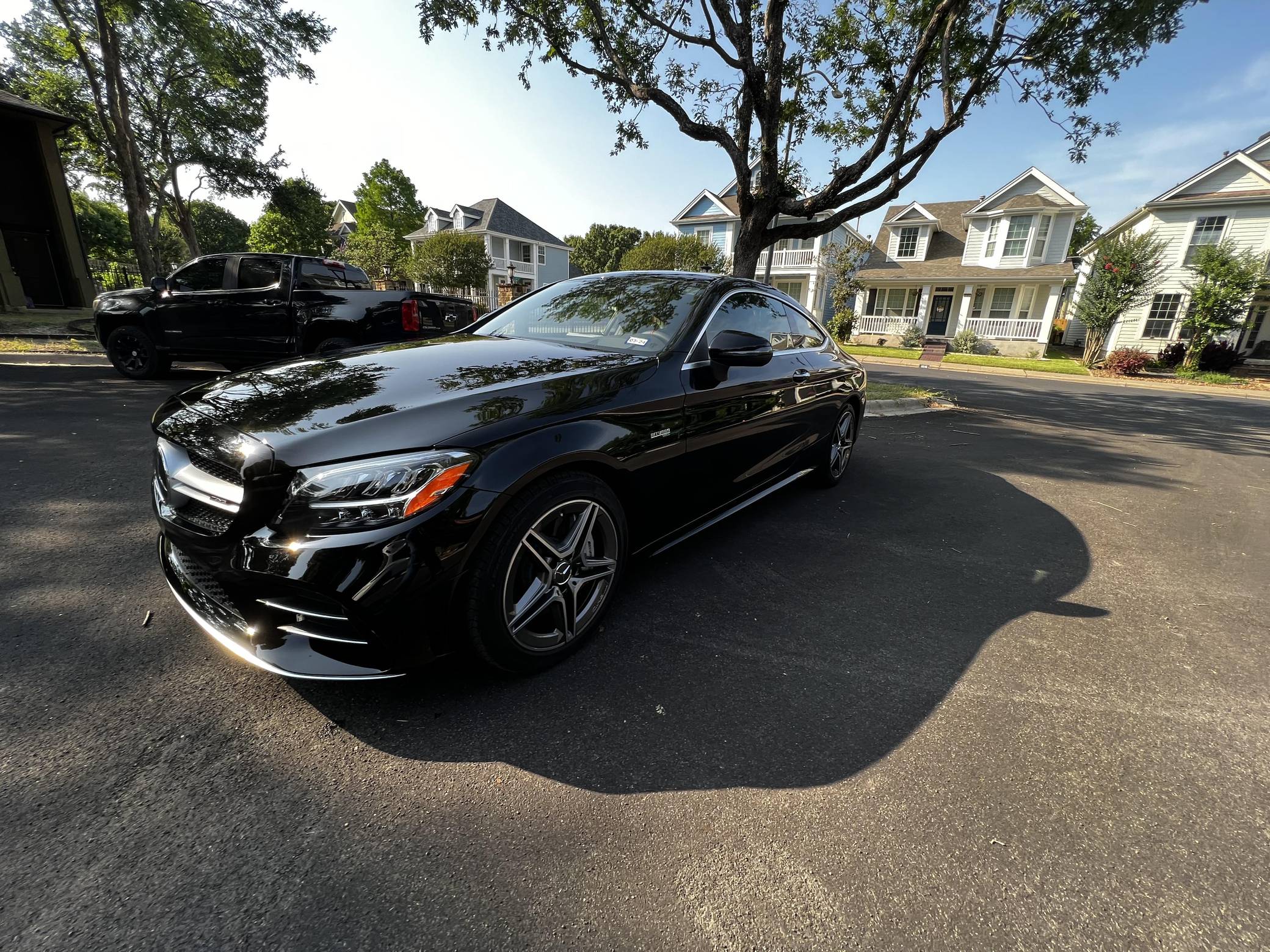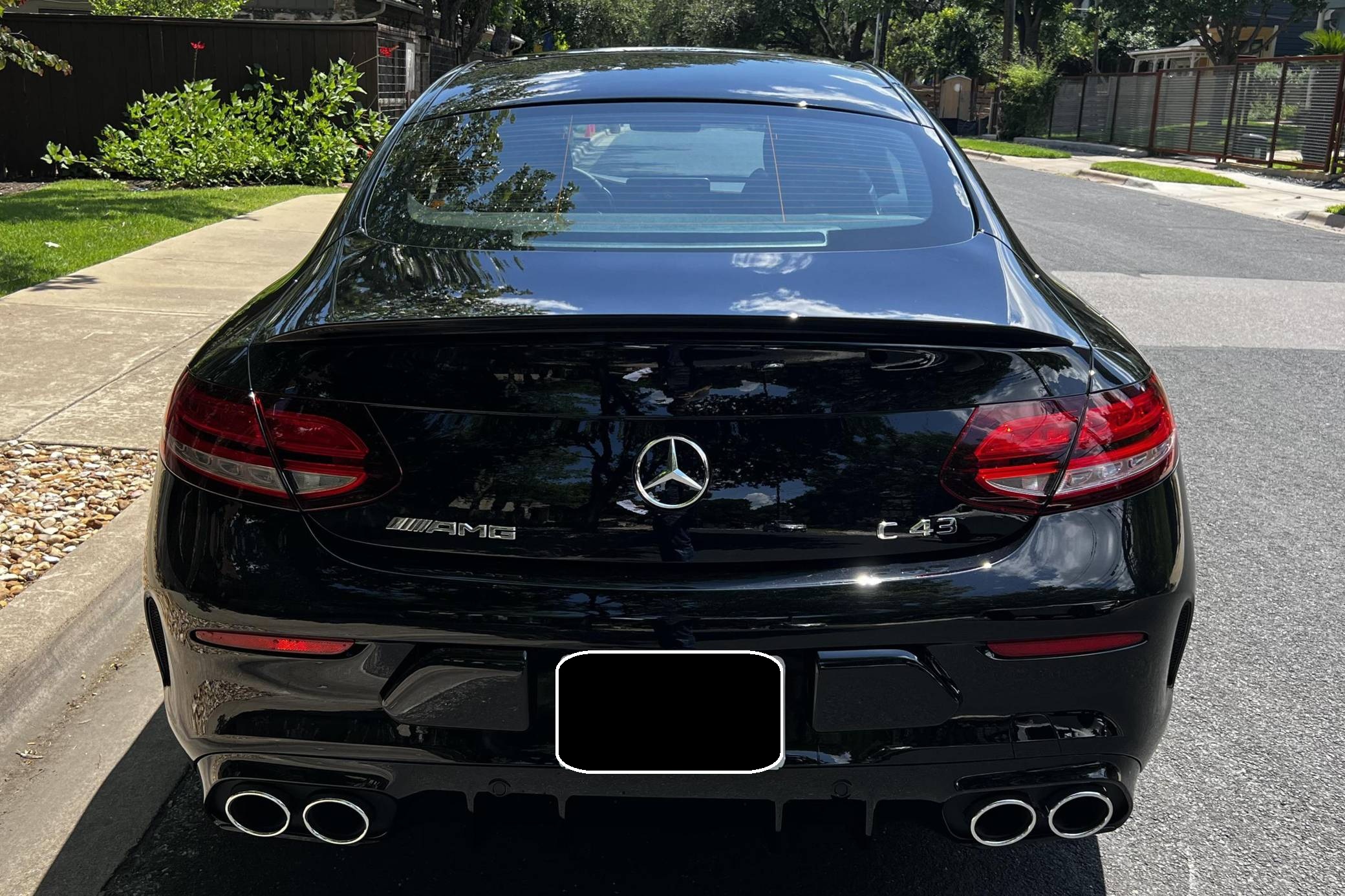 2022 Mercedes-AMG C43 AMG Coupe, finished in black with a black interior. The seller reports no modifications. The "C205" C-Class coupe was launched in 2015, and the AMG variant debuted a year later with a twin-turbocharged engine, adaptive suspension, and a selectable exhaust note. Aimed Squarely at Lexus' RC F, this potent AMG-tuned coupe could make the 0-60 mph dash in just over 4 seconds, according to Car and Driver. Power comes from a twin-turbocharged 3. 0-liter V6, rated at 385 horsepower and 384 lb-ft of torque. It spins all four wheels via a 9-speed automatic transmission and Mercedes-Benz's 4Matic all-wheel-drive system.