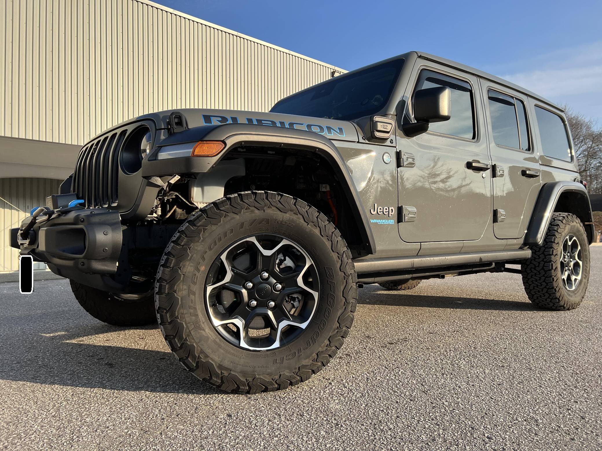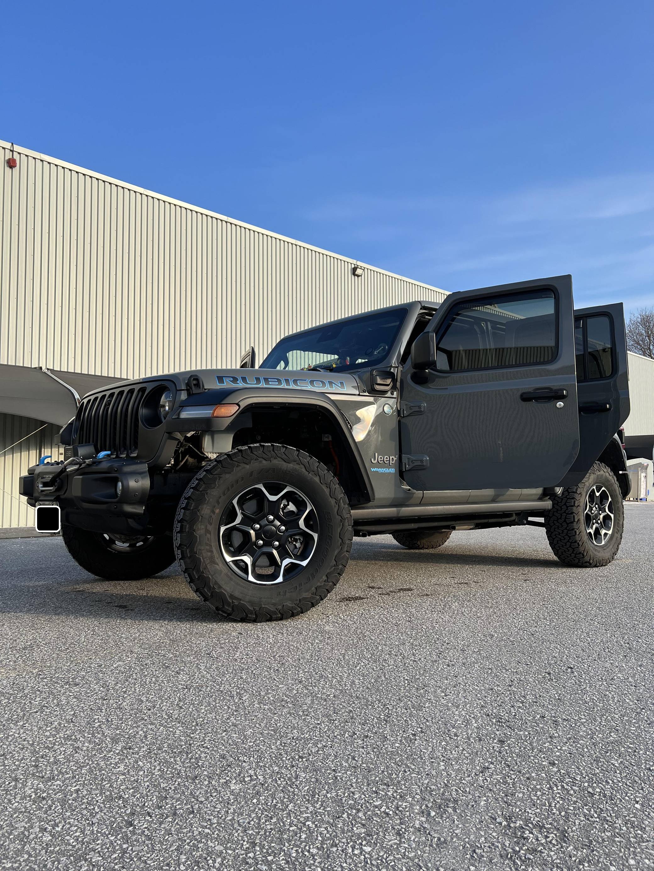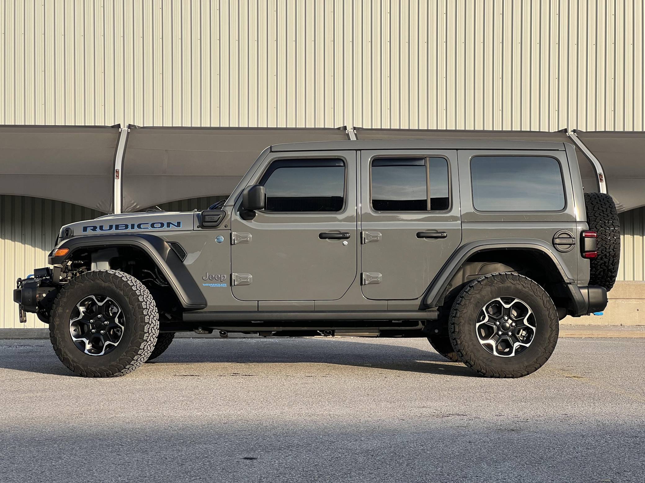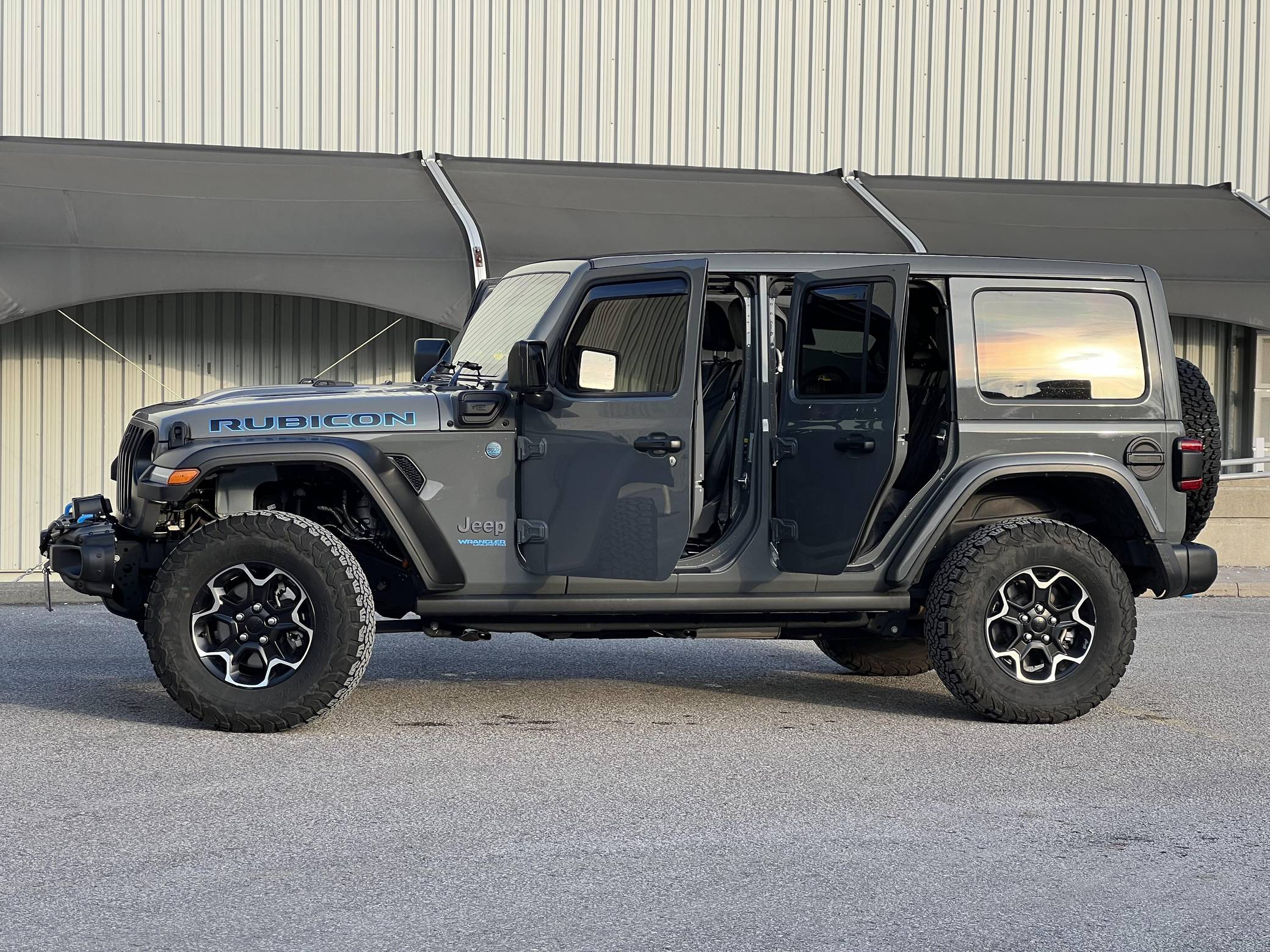 THIS… is a 2021 Jeep Wrangler Unlimited Rubicon 4Xe, finished in Sting-Gray with a black interior. Equipped with a metric instrument cluster, its odometer currently displays around 41,900 kilometers, which represents approximately 26,100 miles. Modifications reported by the seller are limited to a Smittybilt 10,000-lb winch, window air deflectors, and tinted windows. Jeep released the current-generation Wrangler for 2018. Called "JL" internally, the off-roader was at least as capable as its predecessor but it offered a more comfortable ride on the pavement thanks to additional comfort and technology features. 2021 brought two firsts to the line-up: the 4xe, which is the first plug-in hybrid Wrangler, and the 392, which is the first V8-powered Wrangler. Production continues in 2022. Power comes from a 2. 0-liter turbocharged 4-cylinder engine, which works with a pair of electric motors linked to a 17. 3-kilowatt-hour lithium-ion battery pack to develop 375 horsepower and 470 lb-ft of torque. The plug-in hybrid system spins the rear or the four wheels via an 8-speed automatic transmission and a 2-speed transfer case.