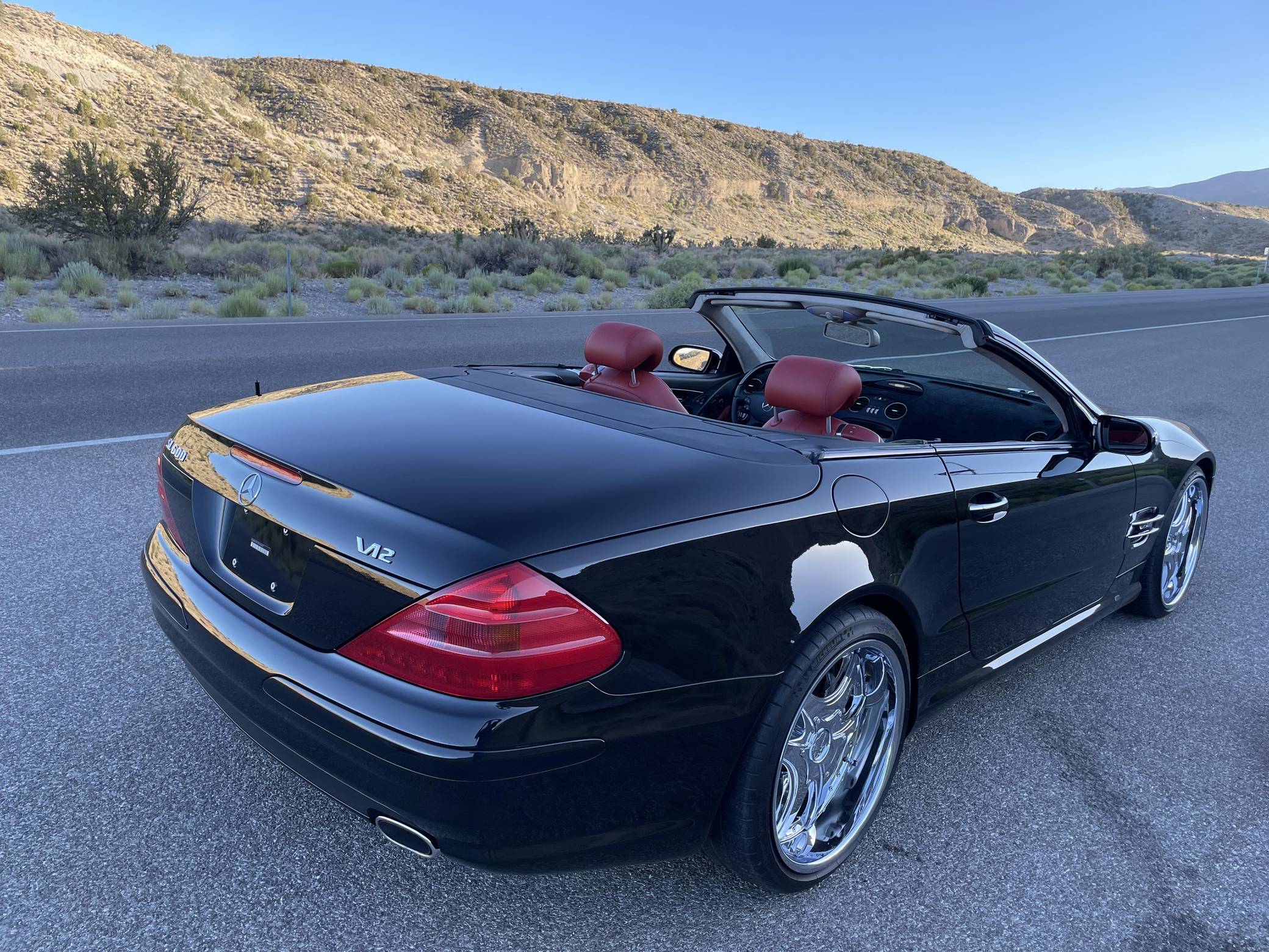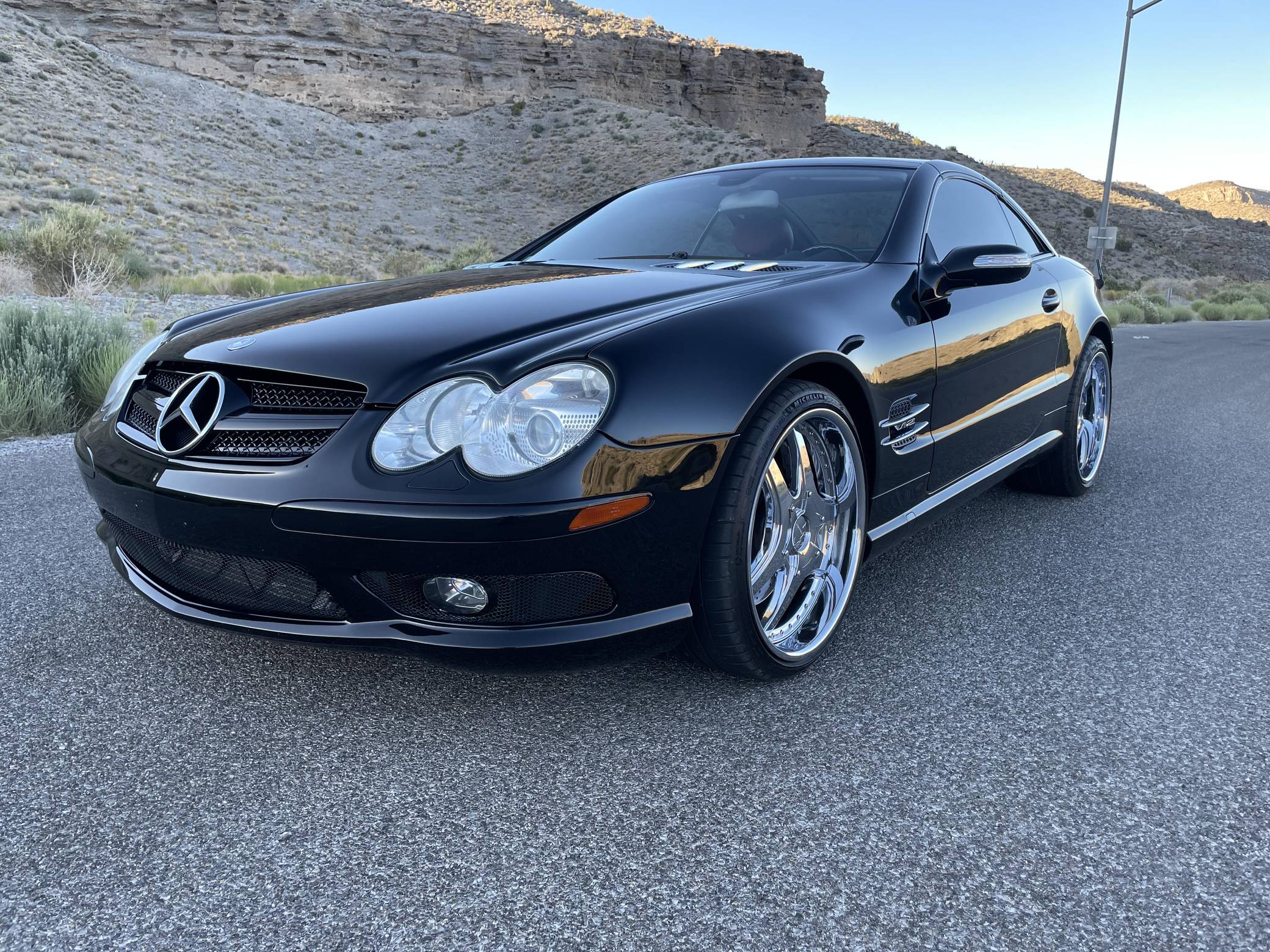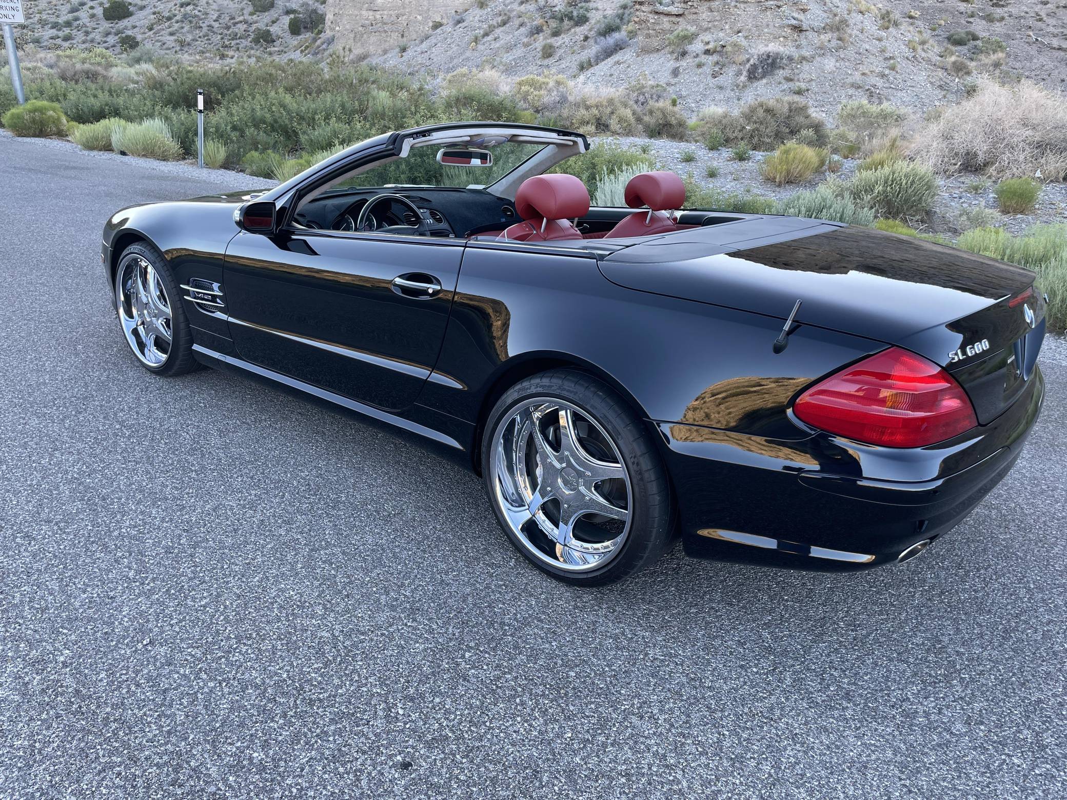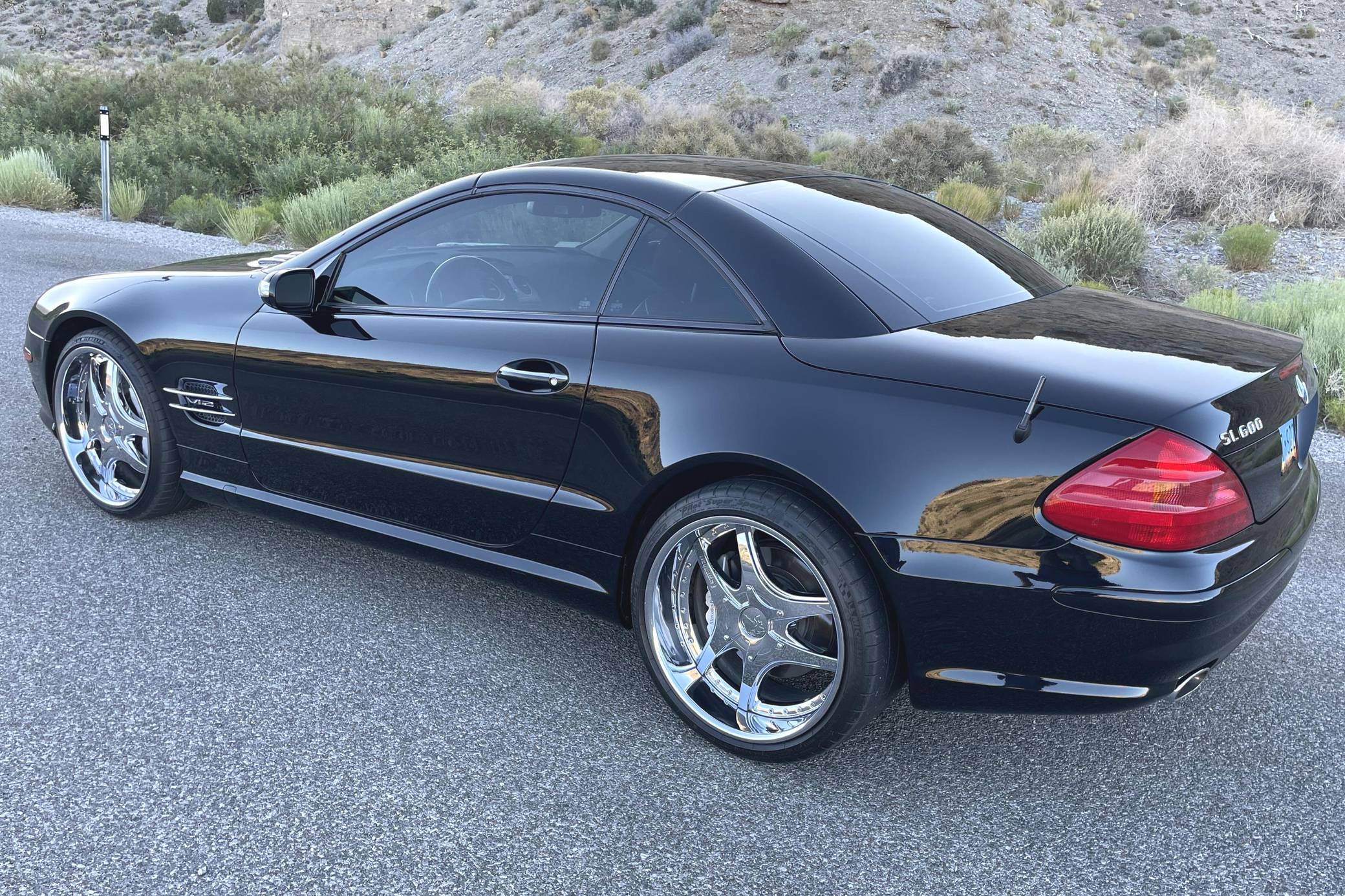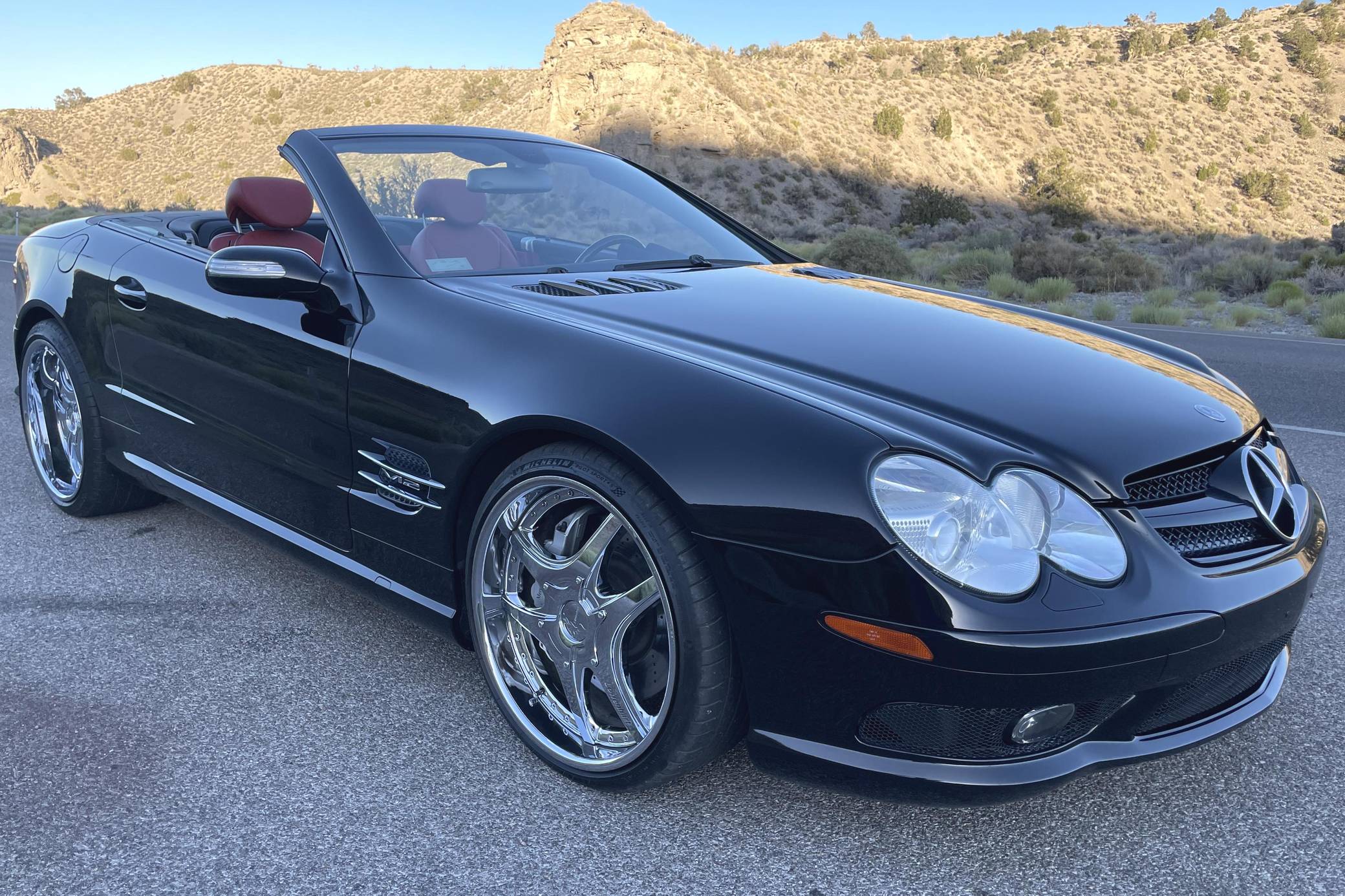 THIS… is a 2005 Mercedes-Benz SL600, finished in black with a Red Berry interior. The odometer on this SL600 currently displays approximately 43,800 miles. Modifications reported by the seller include 20-inch Lowenhart chrome wheels, tinted windows, upgraded transmission programming by BenzNinja, and an aftermarket touchscreen head unit with Apple CarPlay and Android Auto compatibility. Called R230 internally, the first new SL of the 21st century made its debut for the 2003 model year as a replacement for the venerable R129 model. It was appreciably quicker and far more advanced than its predecessor, it ditched the boxy lines for a sleeker and more rounded design, and it came standard with a power-retractable hardtop. Power comes from a 5. 5-liter "M275" twin-turbocharged V12, rated at 493 horsepower and 590 lb-ft of torque. Output is sent to the rear wheels via a 5-speed automatic transmission.