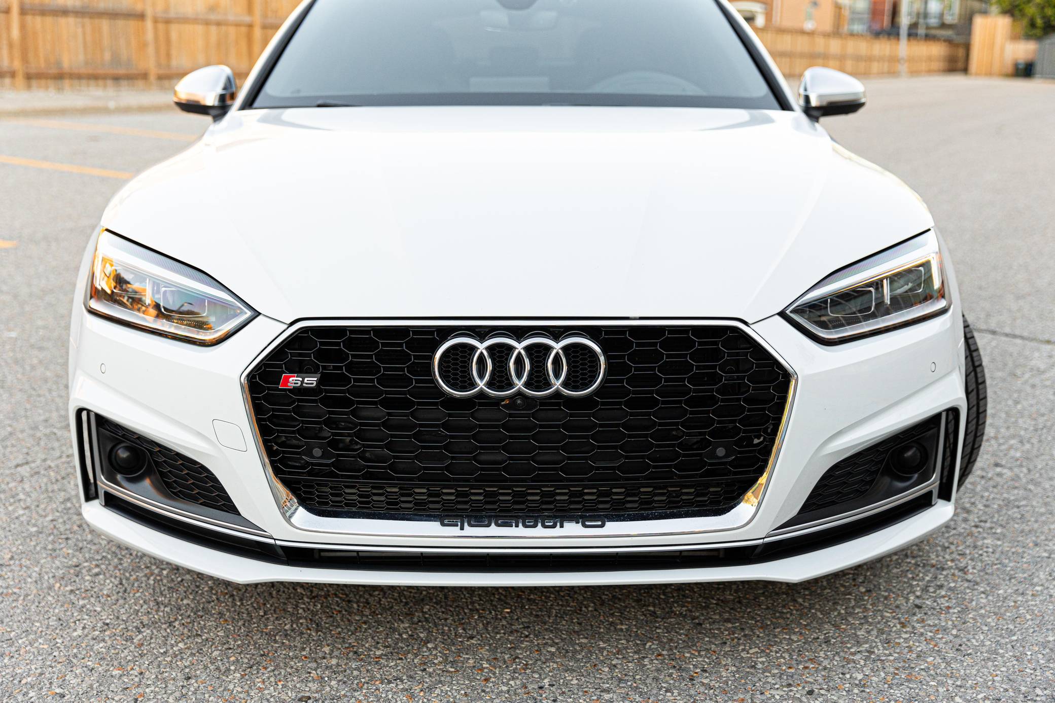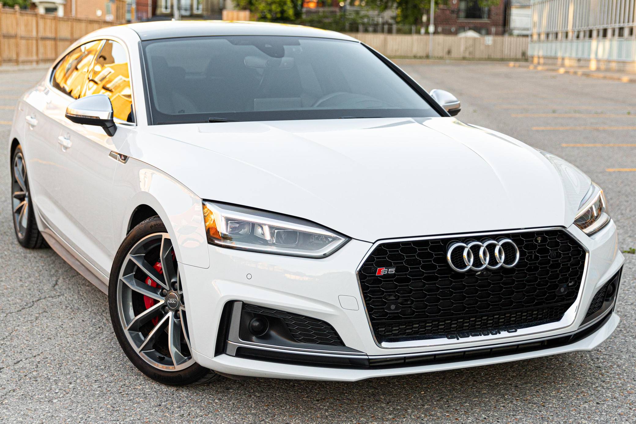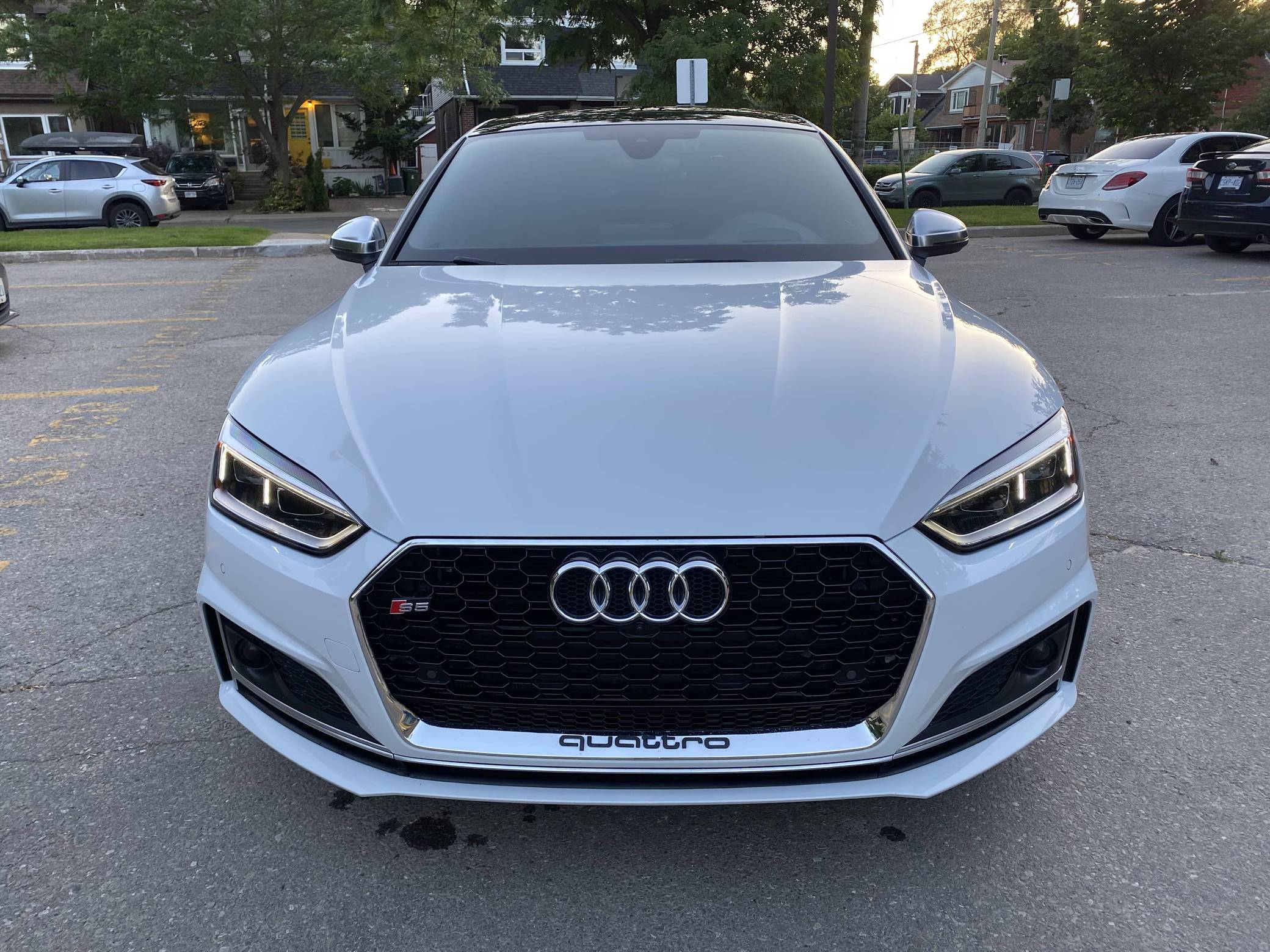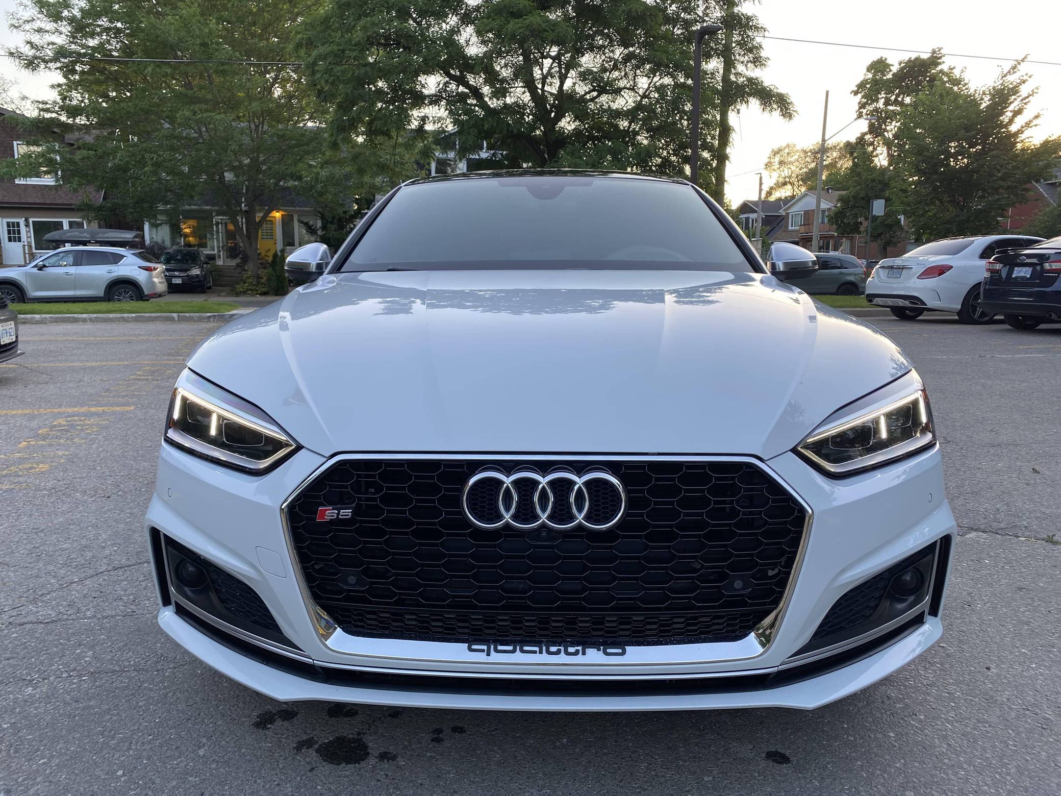 2018 Audi S5 Sportback, finished in Glacier White Metallic with a black interior. This Audi S5 is a Canadian-spec example. The odometer reads in kilometers and displays approximately 49,200 kilometers or roughly 30,600 miles. A build sheet from Audi is provided and indicates that this S5 is a Prestige trim model (Technik, for the Canadian market) that is equipped with the Advanced Driver Assistance Package, 19-inch 5-spoke "Cavo-Design" wheels, sport suspension, a self-locking center differential, Carbon Atlas interior trim, heated front sport seats with a massage function, a Bang & Olufsen sound system, LED headlamps, and more as detailed below. Modifications reported by the seller are limited to a gloss-black honeycomb-style front grille, tinted windows, a Fortin remote-start system, and a VIOFO dash camera. Audi released the Sportback variant of the second-generation S5 for the 2018 model year, and was to the A4 what the A6 was to the A7: it was closely related to its sedan counterpart underneath the sheet metal but it stood out with a swoopy, fastback-like silhouette. The S5 model neatly fills the gap between the base A5 and the full-fat RS5. Power comes from a 3. 0-liter turbocharged "TFSI" V6, rated at 354 horsepower and 369 lb-ft of torque. Output is sent to all four wheels via an 8-speed automatic transmission and Audi's Quattro permanent all-wheel-drive system.