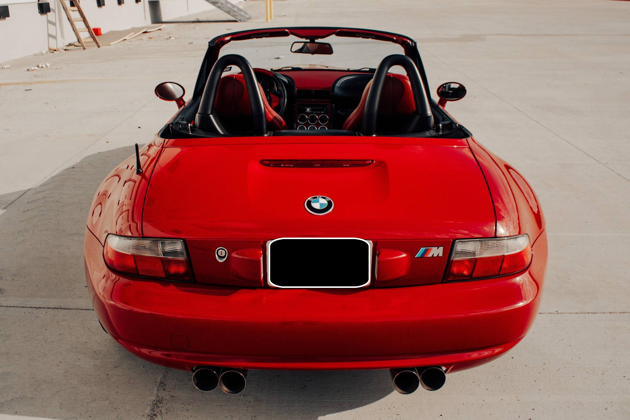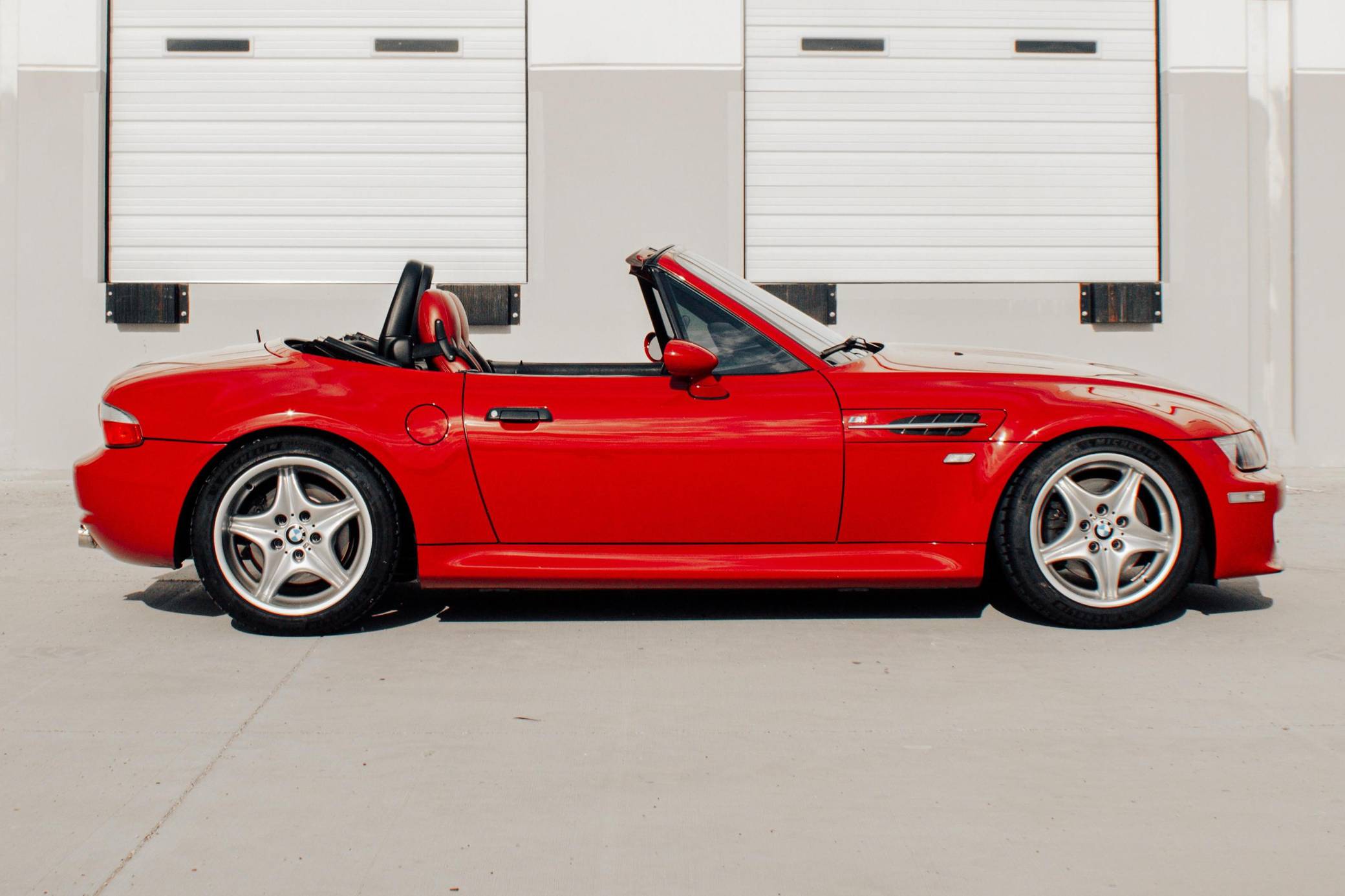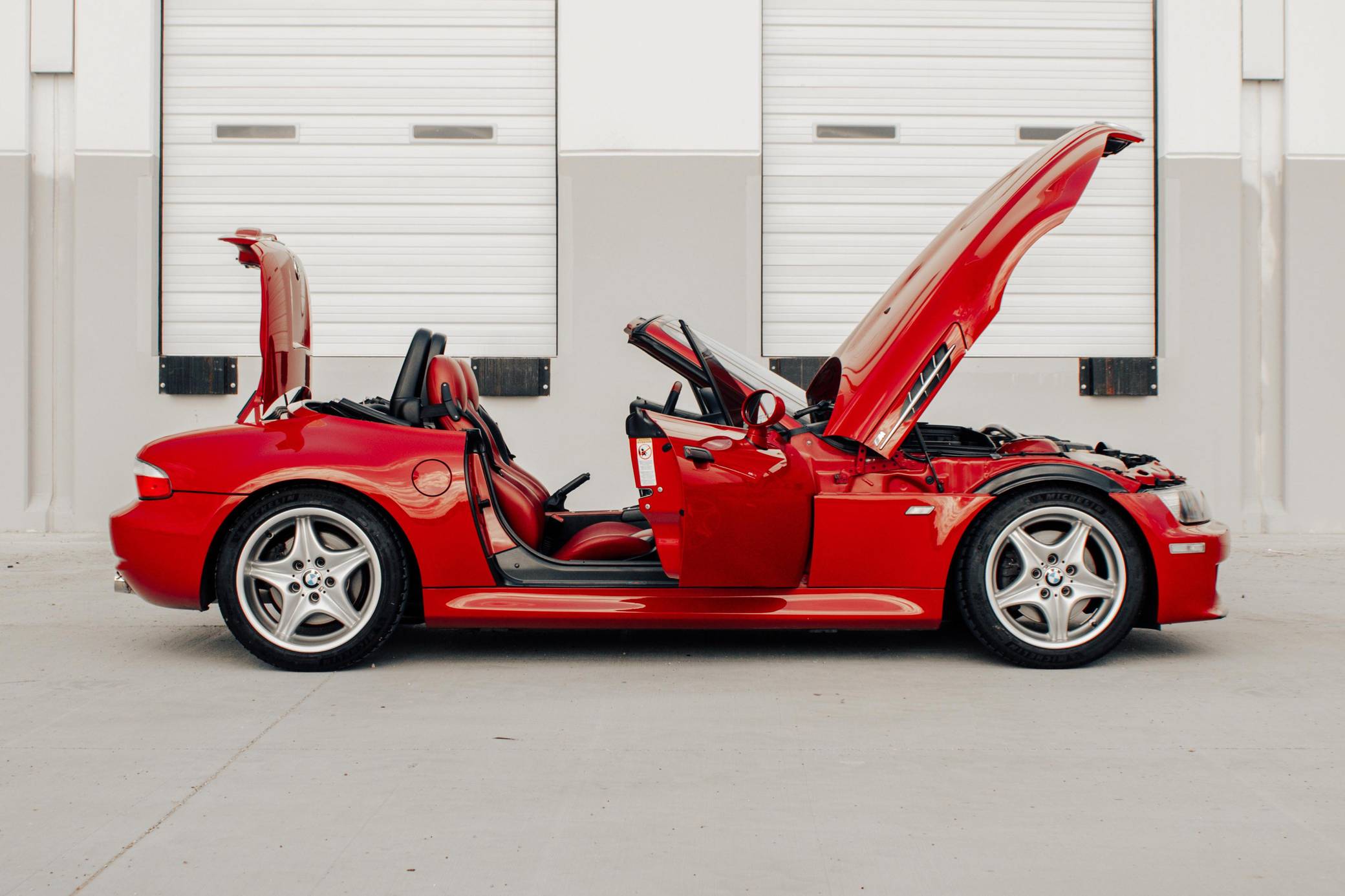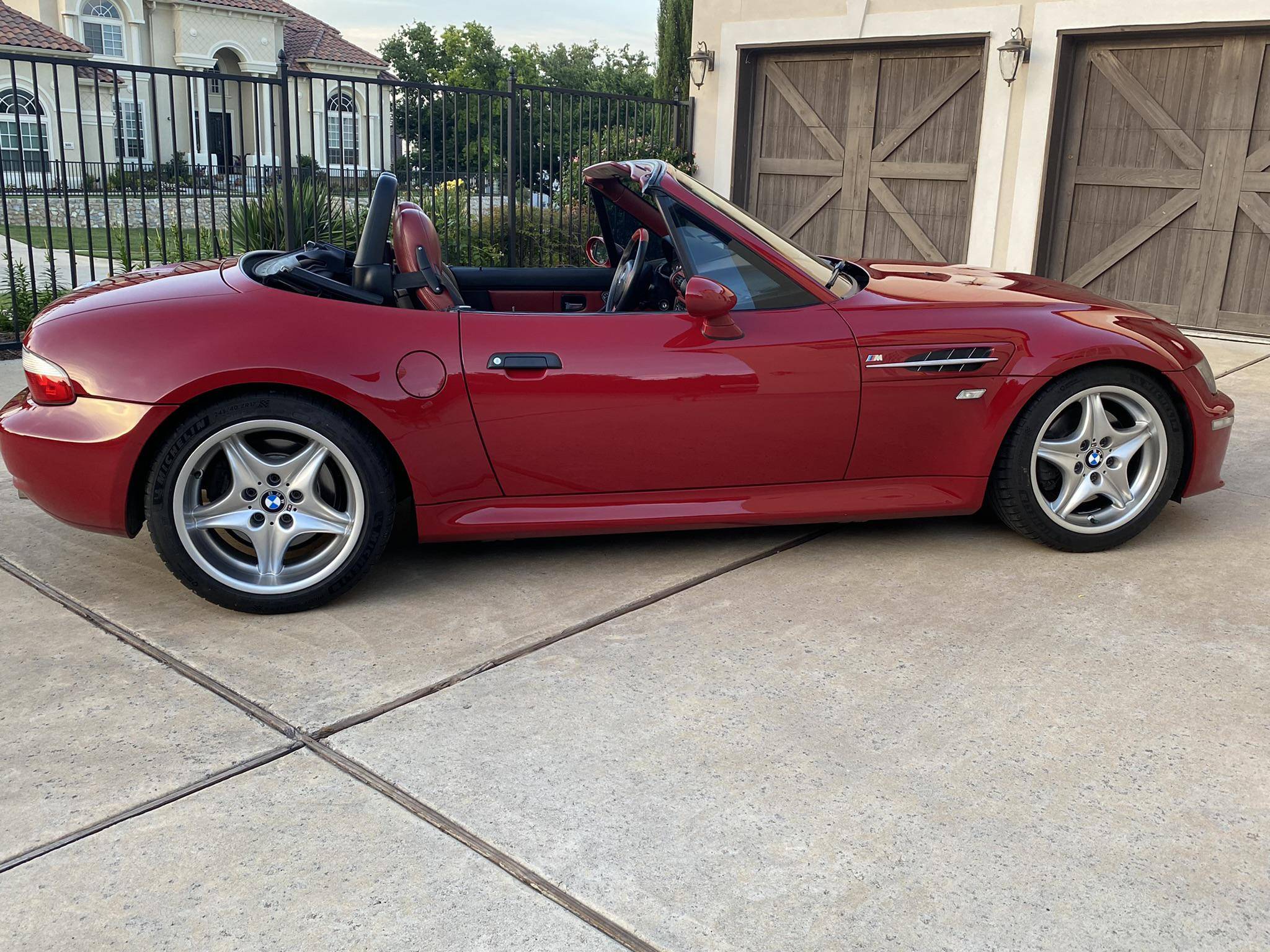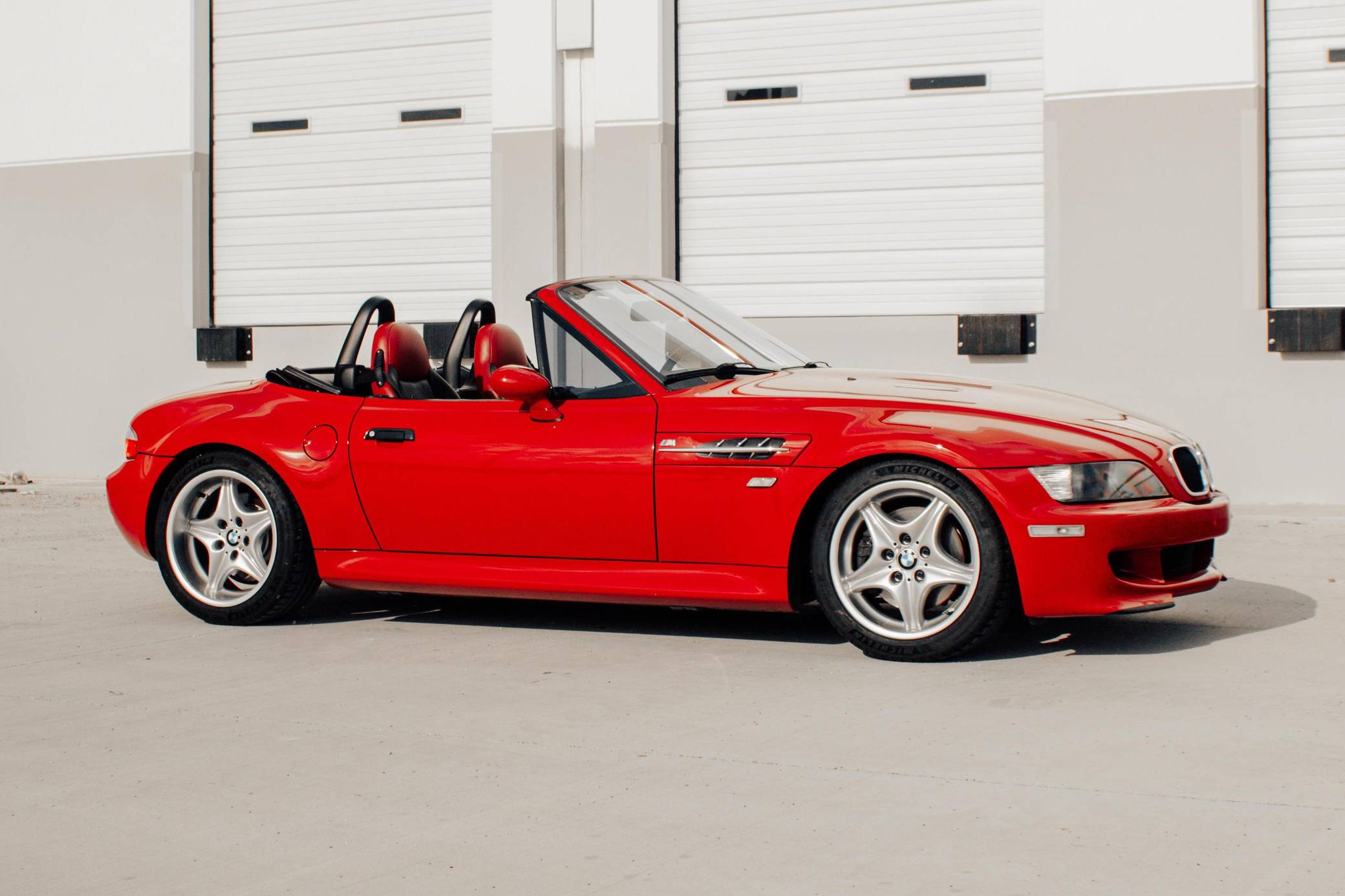 1999 BMW Z3 M Roadster, finished in Imola Red with a black soft top and an Imola Red and black two-tone interior. This Z3 M features the desirable 5-speed manual transmission. According to the build sheet provided in the gallery, factory equipment includes 17-inch Style 40 wheels, a limited-slip differential, a power-retractable soft top, leather upholstery, air conditioning, cruise control, and a Harman/Kardon sound system. Modifications reported by the seller include Ground Control coilovers, an Eisenmann exhaust, and a reinforced rear subframe. Photos detailing the subframe reinforcement are shown in the gallery. Based on the Z3, the M Roadster made its debut in 1998 with a more powerful engine shared with the E36 M3, a sportier suspension system, and wider wheel arches, among other changes. It was immediately hailed as one of the best driver's cars on the market. Power comes from an "S52" 3. 2-liter straight-6, rated at 240 horsepower and 236 lb-ft of torque. Output is sent to the rear wheels via a 5-speed manual transmission.