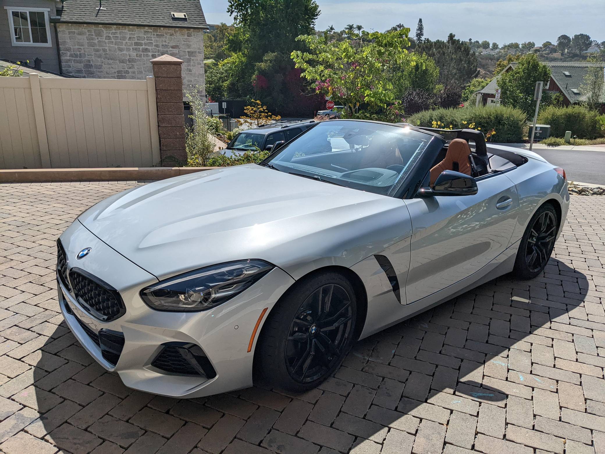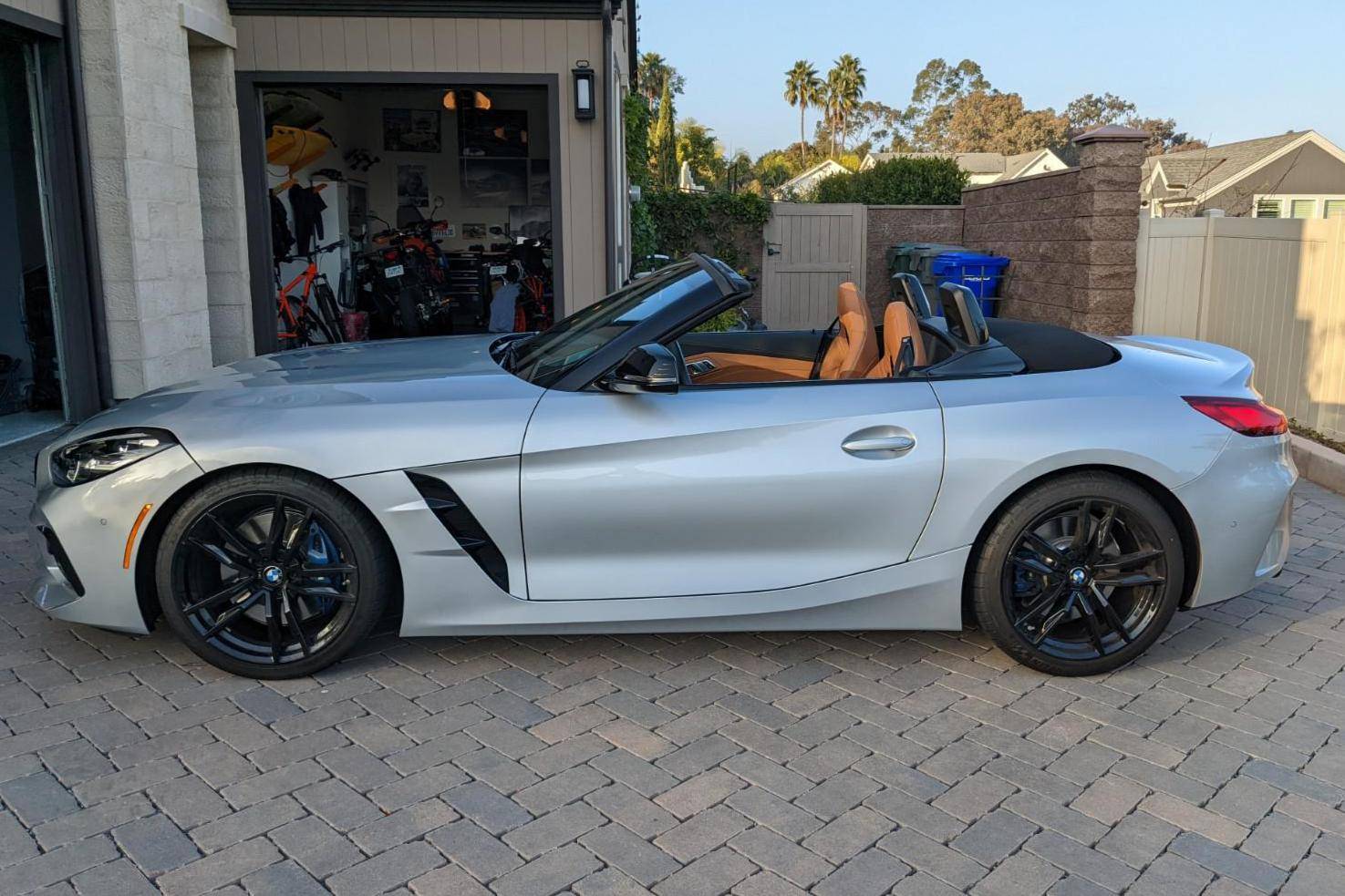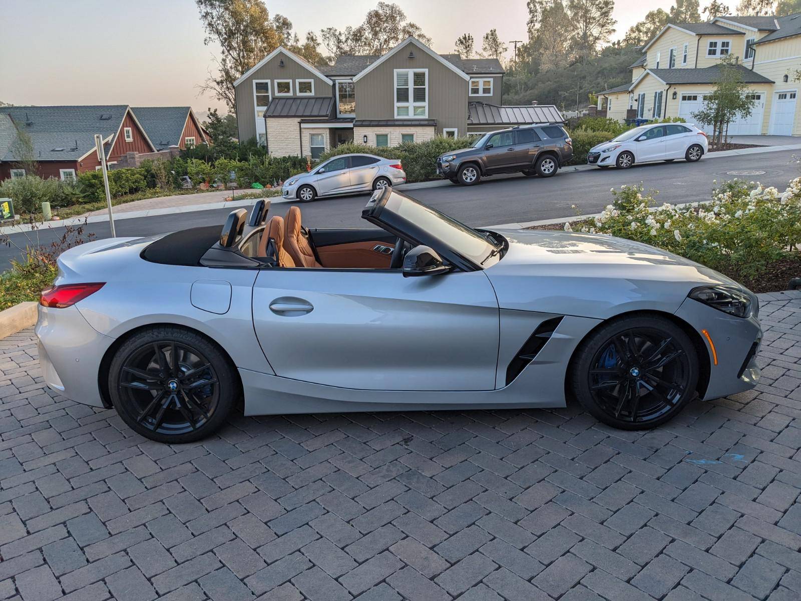THIS… is a 2021 BMW Z4 M40i, finished in Glacier Silver Metallic with a Cognac interior. This BMW's odometer currently displays about 4,500 miles. A partial list of notable equipment includes Driving Assistance, Shadowline, and Executive Packages, 19-inch Style 799M wheels, M Sport differential, adaptive M suspension, Vernasca leather upholstery, heated and power-adjustable M sport front seats, heated steering wheel, dual-zone automatic climate control, Park Assist, and a navigation system. The seller reports no modifications. Called "G29" internally, the third-generation Z4 made its debut for 2018 as a soft top convertible to replace the hardtop-only E89-generation Z4. The G29 Z4 also offered enthusiasts a more sculpted exterior design, a nicer interior, and an available turbocharged straight-6 engine. Built in Austria, the G29-generation Z4 is built alongside the Toyota Supra. Power comes from a 3. 0-liter turbocharged straight-6, rated at 382 horsepower and 369 lb-ft of torque. Called "B58" internally, it spins the rear wheels via an 8-speed automatic transmission.