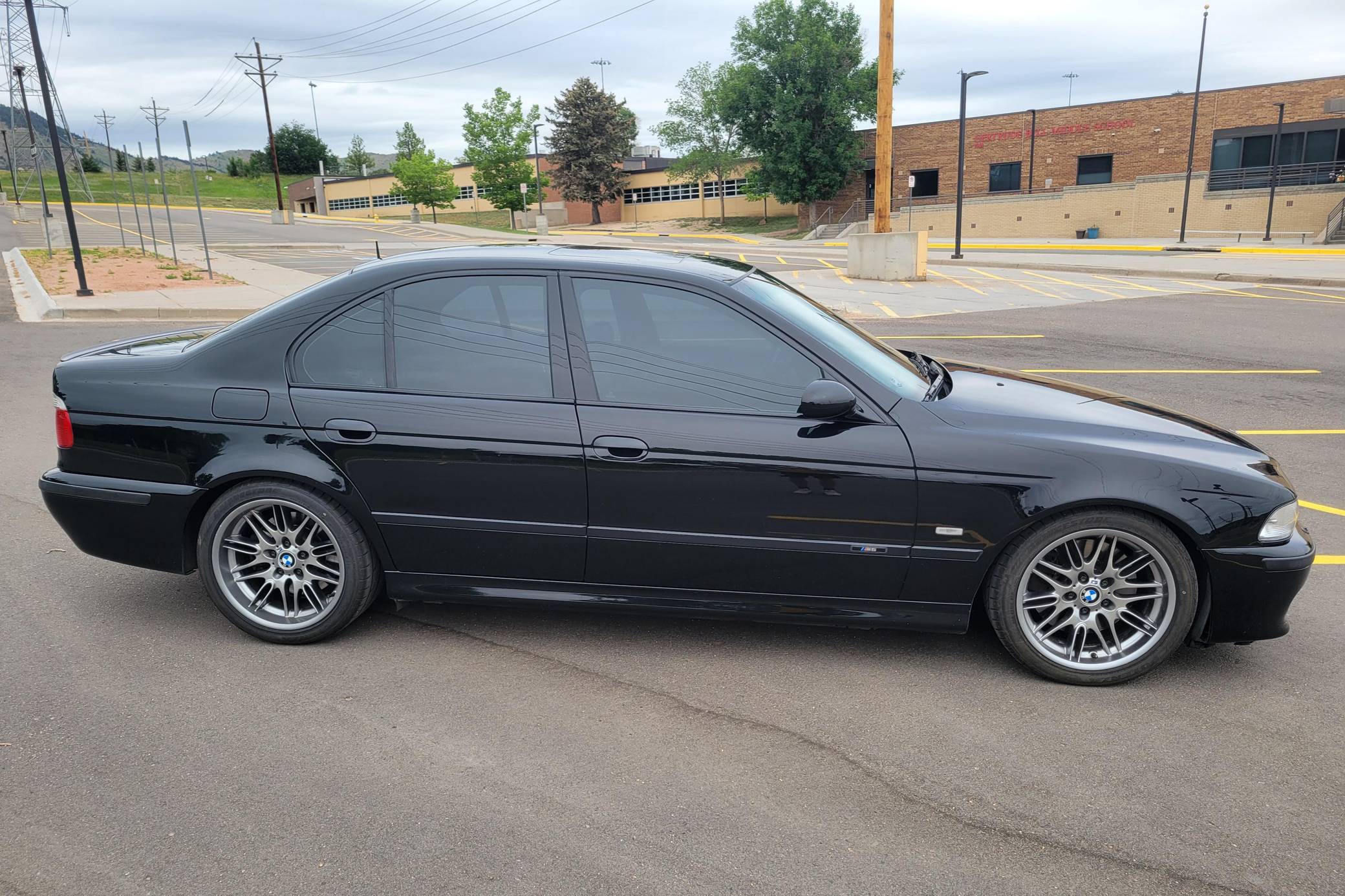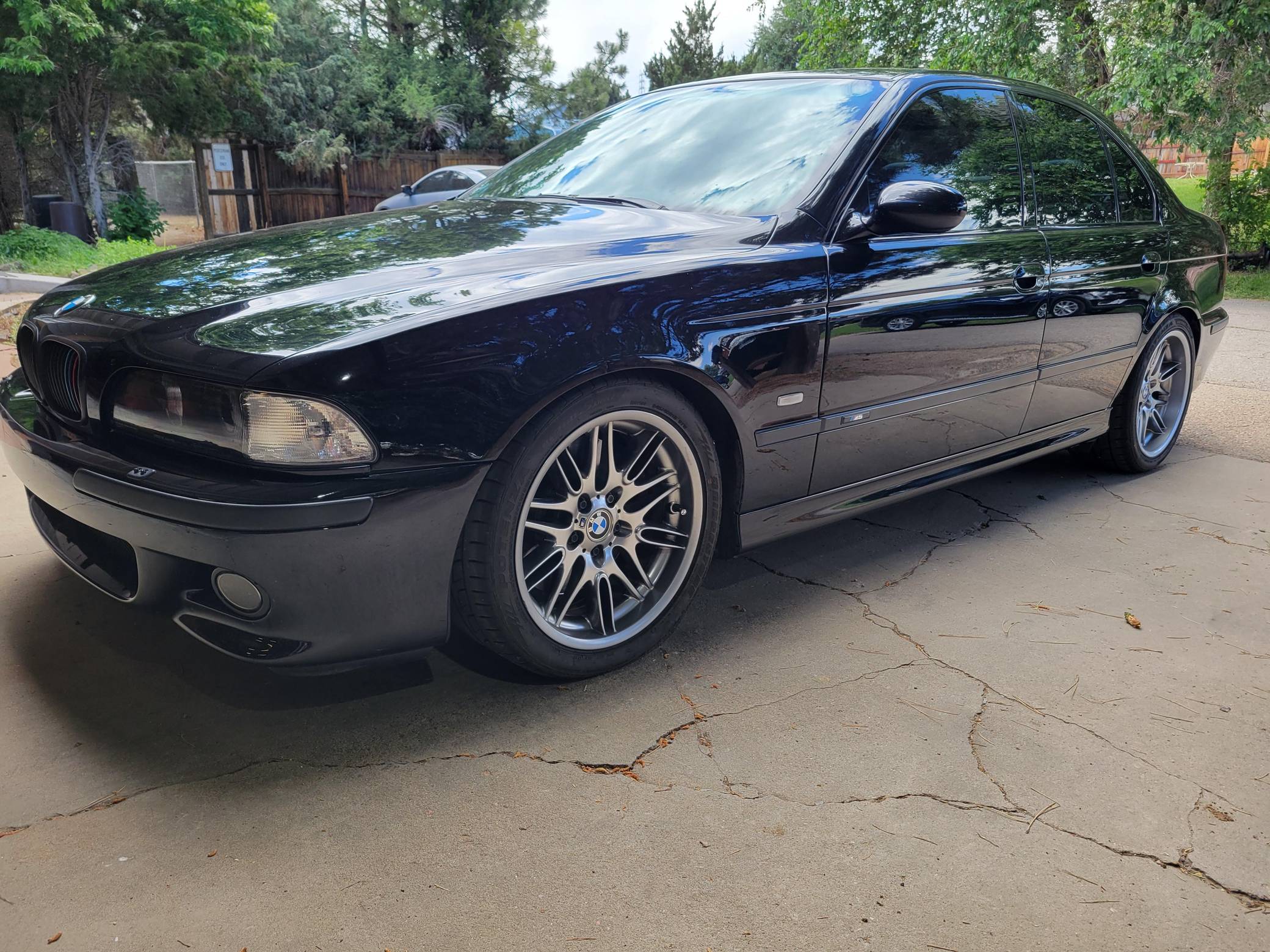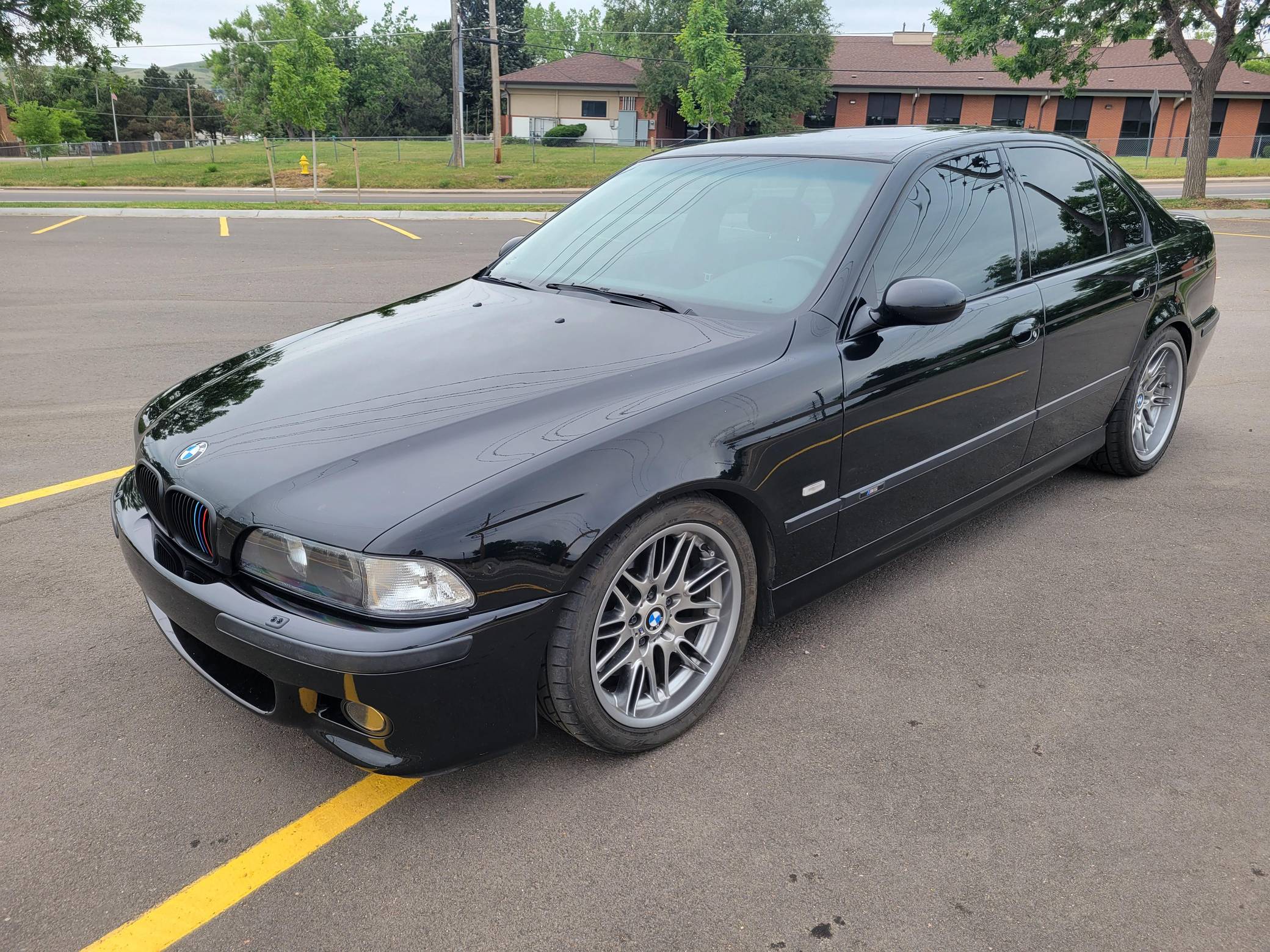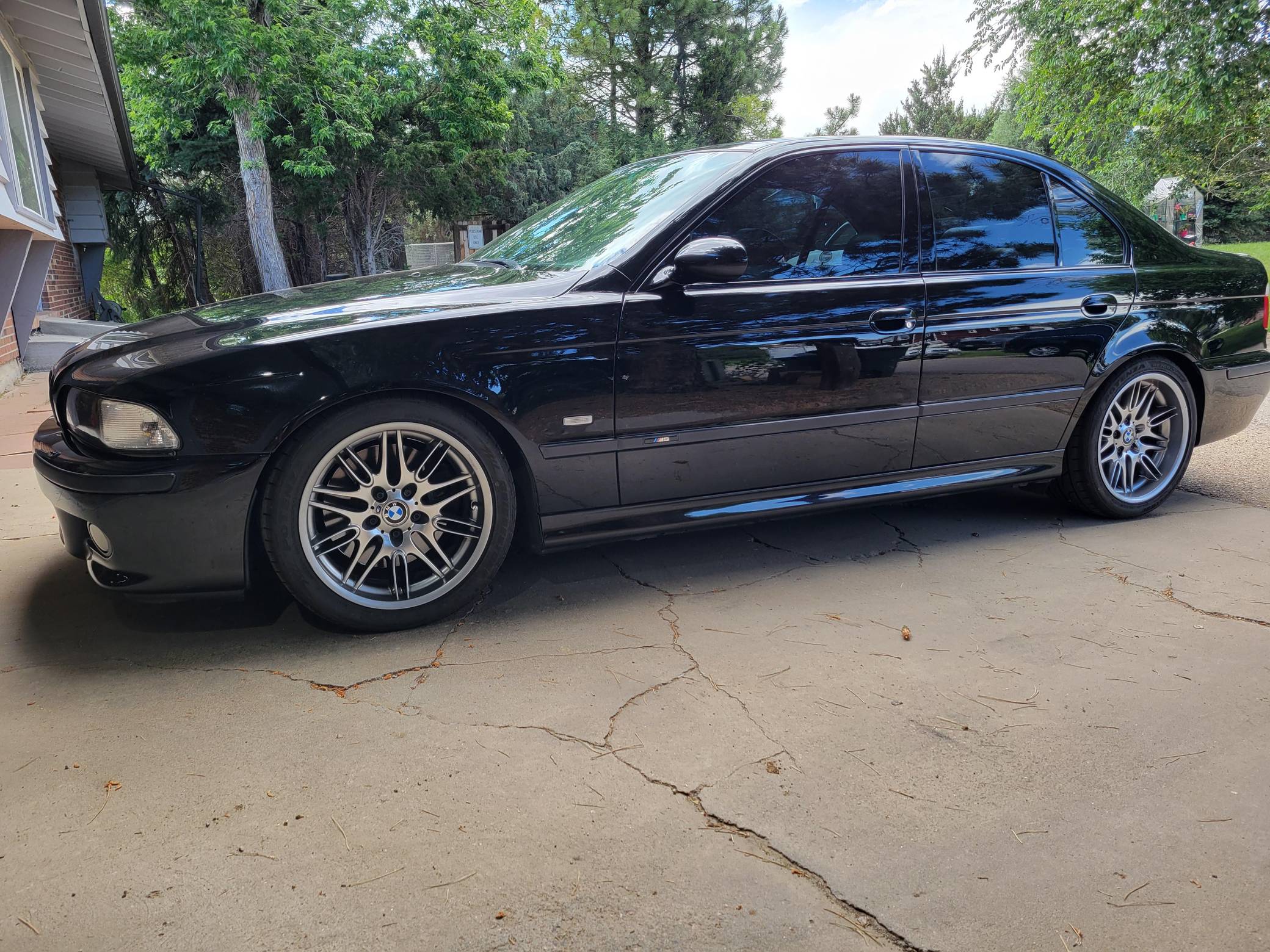 2000 BMW M5, finished in Jet Black with a black interior. This M5 is a Canadian-spec model that was originally purchased in British Columbia, Canada. According to the build sheet provided in the gallery, factory equipment includes 18-inch Style 65 wheels, headlight washers, a power sunroof, heated and power-adjustable front seats with memory, rear sunshades, Park Distance Control (PDC), and a 6-disc CD changer. Modifications reported by the seller include a Dinan exhaust and carbon fiber cold air intake, a gray-faced instrument cluster, and black kidney grilles. Heralded by brand enthusiasts as the best of its breed, the "E39"-generation M5 arrived in America for the 2000 model year. It was the first of several M-developed cars powered by a V8 engine, and it was exclusively available with a 6-speed manual transmission. Car & Driver crowned it "the most desirable sedan in the world" in 2000. Power comes from an "S62" 4. 9-liter V8, rated at 394 horsepower and 369 lb-ft of torque. Output is sent to the rear wheels via a 6-speed manual transmission.