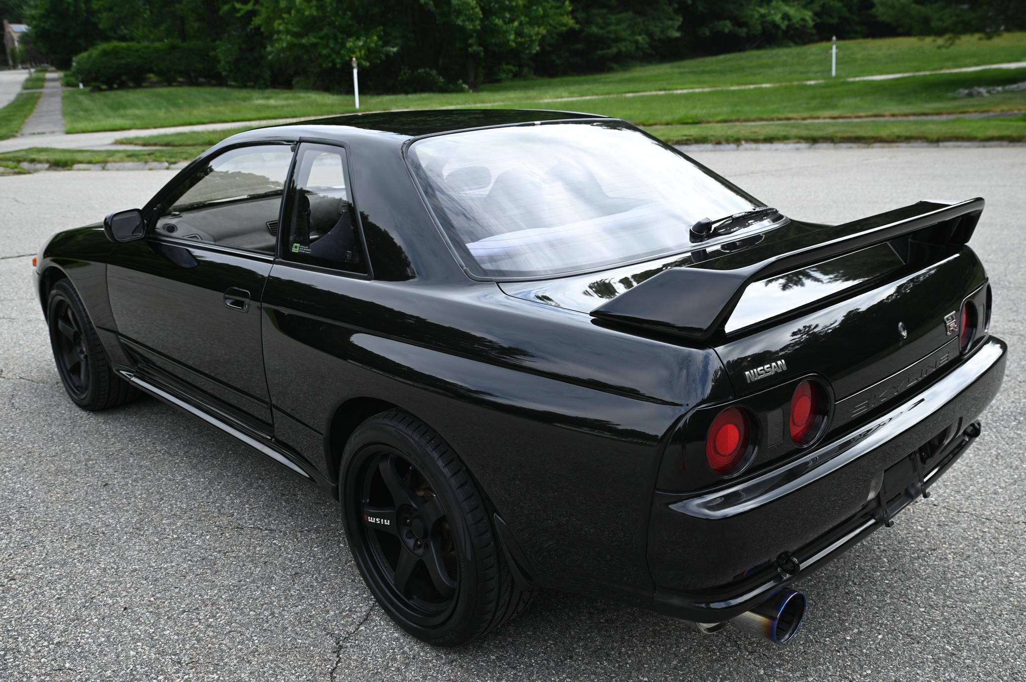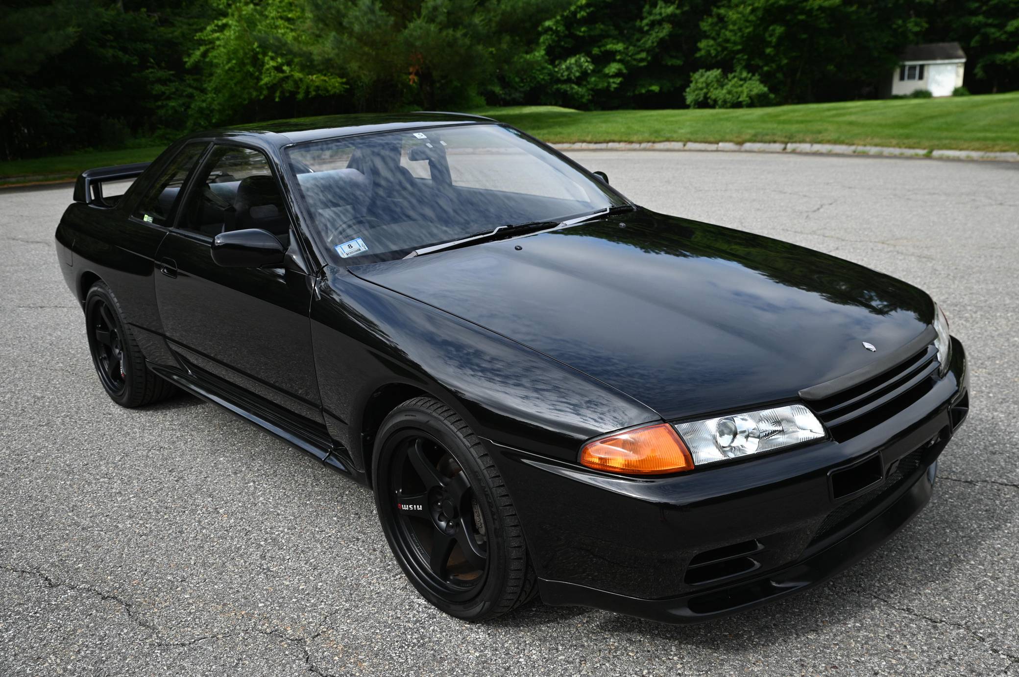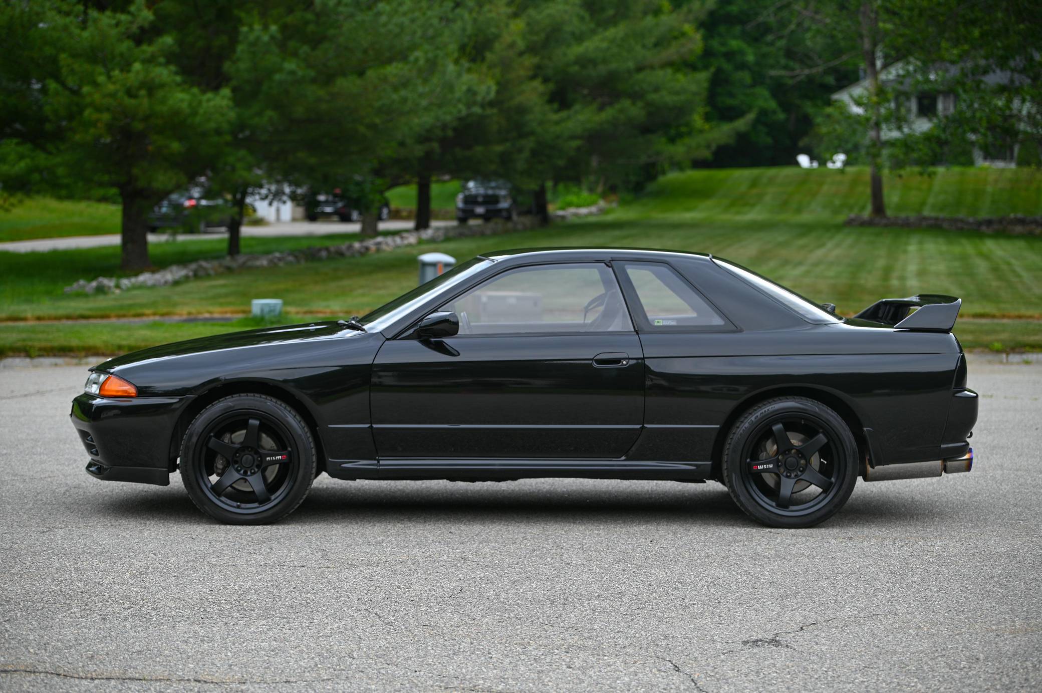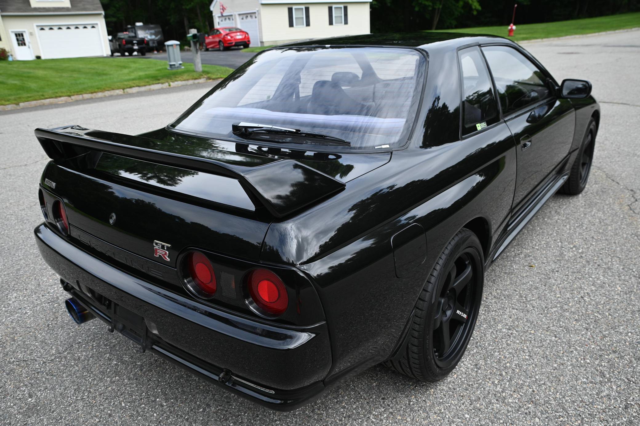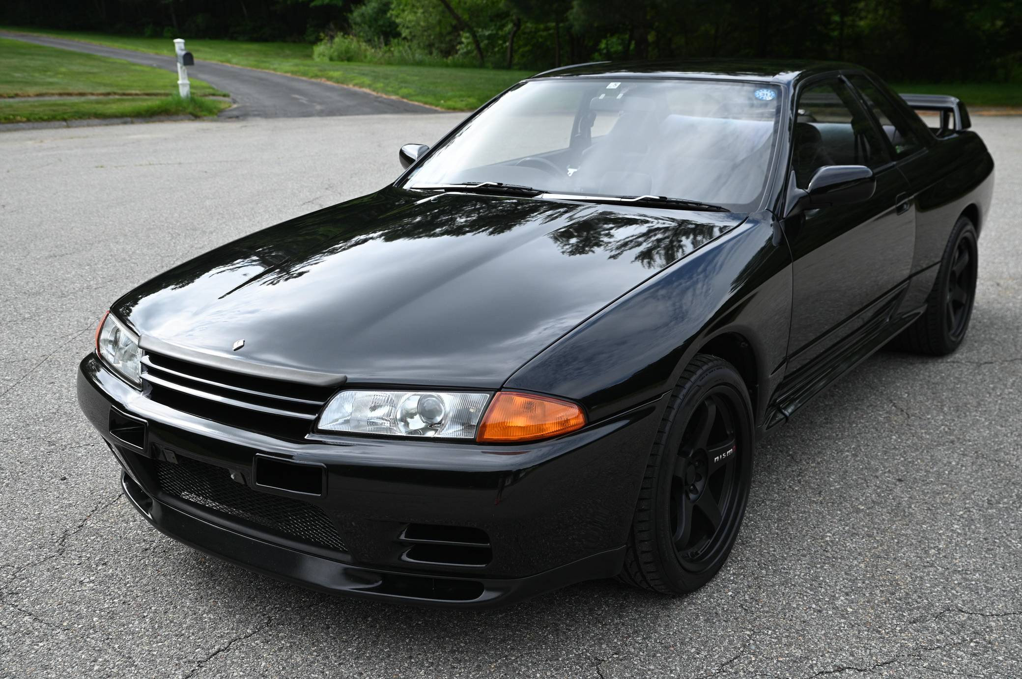 1993 Nissan Skyline GT-R, finished in black with a gray interior. This GT-R is a Japanese-spec, right-hand-drive car that's equipped with a 5-speed manual transmission. It has a metric instrument cluster, and the odometer currently indicates about 90,800 kilometers, which represents approximately 56,400 miles. Factory equipment includes the ATTESA all-wheel-drive system, a GT-R-specific body kit, a rear window wiper, cloth upholstery, front sport seats, and air conditioning, among other features. Modifications reported by the seller include 18-inch NISMO wheels, NISMO down pipes, NISMO exhaust system, an aftermarket catch can, an aftermarket front bumper, carbon fiber interior trim, a Pioneer head unit, and a MOMO steering wheel. A service record in the gallery shows that the timing belt and components, water pump, and thermostat were replaced, a clutch kit was installed, the engine covers were refinished, and the coolant was flushed in June 2022. Called "R32" internally, the 8th-generation Skyline arrived in 1989 with a significantly updated exterior design and a new multi-link front suspension system, among other changes. The big news was the GT-R's long-awaited comeback after a 16-year hiatus with a powerful turbocharged engine, all-wheel-drive (a first in the nameplate's history), and an aggressive-looking body kit. While the GT-R was never officially sold in the United States, it became an icon thanks in part to its role in the Gran Turismo franchise. Power comes from a 2. 6-liter twin-turbocharged straight-6, rated at 276 horsepower and 260 lb-ft of torque. This engine may be making more power as a result of the modifications, though a dyno sheet is not included. It spins the four wheels via a 5-speed manual transmission.
