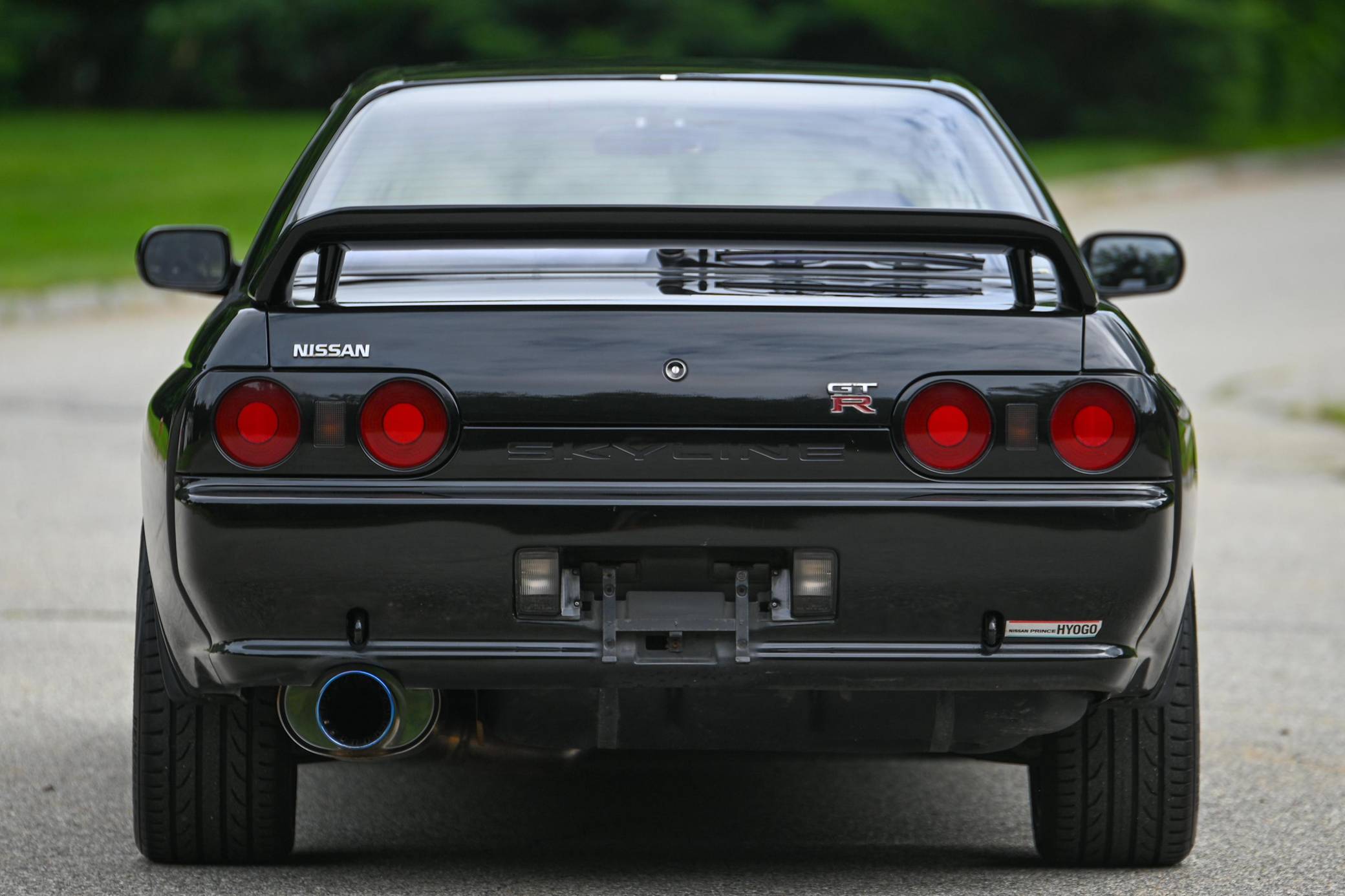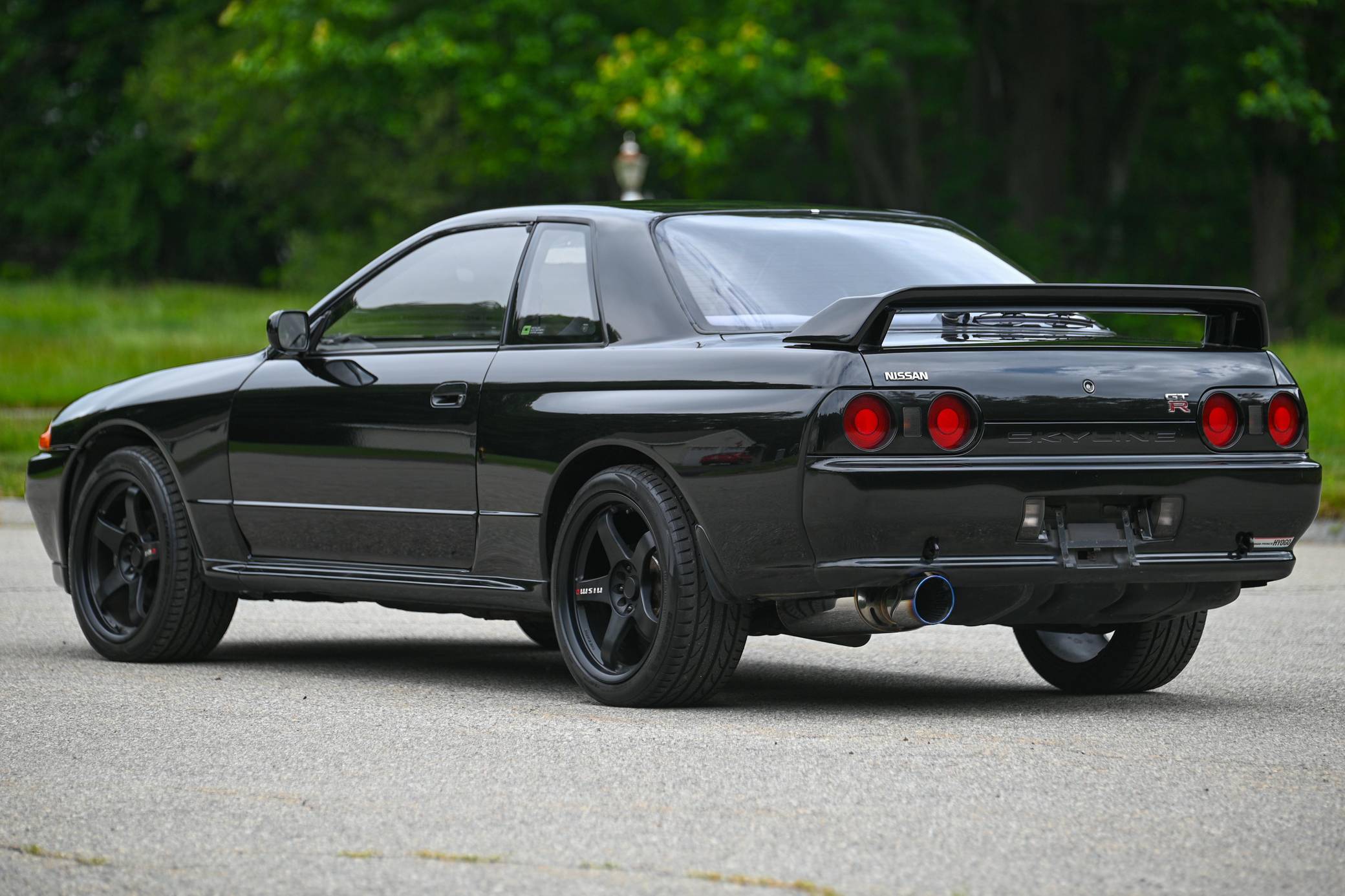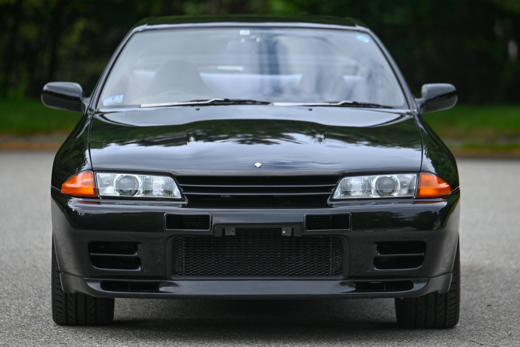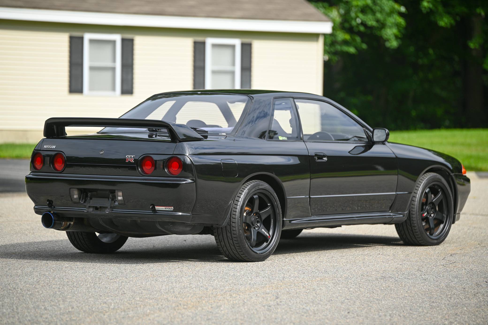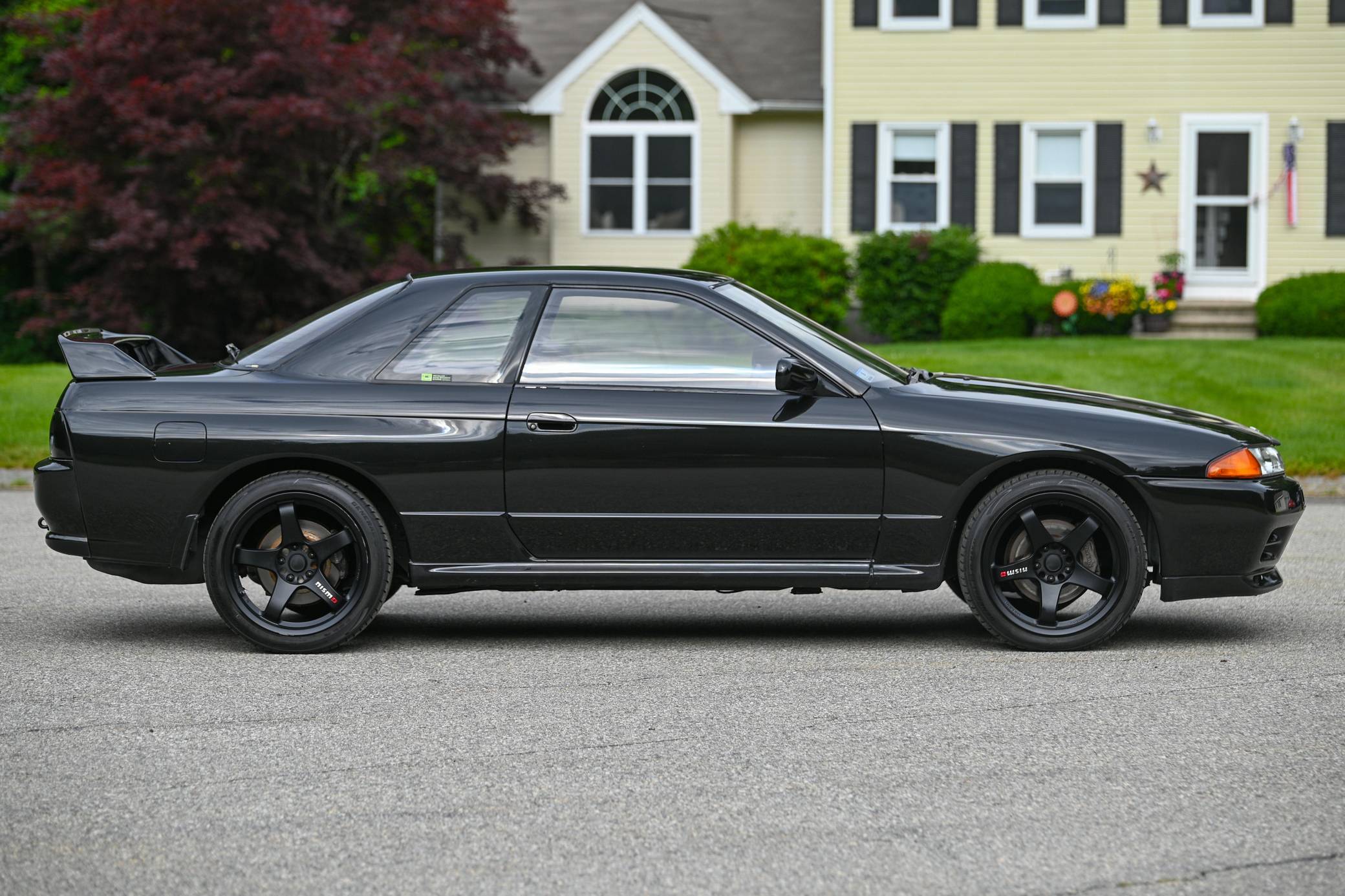 1993 Nissan Skyline GT-R, finished in black with a gray interior. This GT-R is a Japanese-spec, right-hand-drive car that's equipped with a 5-speed manual transmission. It has a metric instrument cluster, and the odometer currently indicates about 90,800 kilometers, which represents approximately 56,400 miles. Factory equipment includes the ATTESA all-wheel-drive system, a GT-R-specific body kit, a rear window wiper, cloth upholstery, front sport seats, and air conditioning, among other features. Modifications reported by the seller include 18-inch NISMO wheels, NISMO down pipes, NISMO exhaust system, an aftermarket catch can, an aftermarket front bumper, carbon fiber interior trim, a Pioneer head unit, and a MOMO steering wheel. A service record in the gallery shows that the timing belt and components, water pump, and thermostat were replaced, a clutch kit was installed, the engine covers were refinished, and the coolant was flushed in June 2022. Called "R32" internally, the 8th-generation Skyline arrived in 1989 with a significantly updated exterior design and a new multi-link front suspension system, among other changes. The big news was the GT-R's long-awaited comeback after a 16-year hiatus with a powerful turbocharged engine, all-wheel-drive (a first in the nameplate's history), and an aggressive-looking body kit. While the GT-R was never officially sold in the United States, it became an icon thanks in part to its role in the Gran Turismo franchise. Power comes from a 2. 6-liter twin-turbocharged straight-6, rated at 276 horsepower and 260 lb-ft of torque. This engine may be making more power as a result of the modifications, though a dyno sheet is not included. It spins the four wheels via a 5-speed manual transmission.