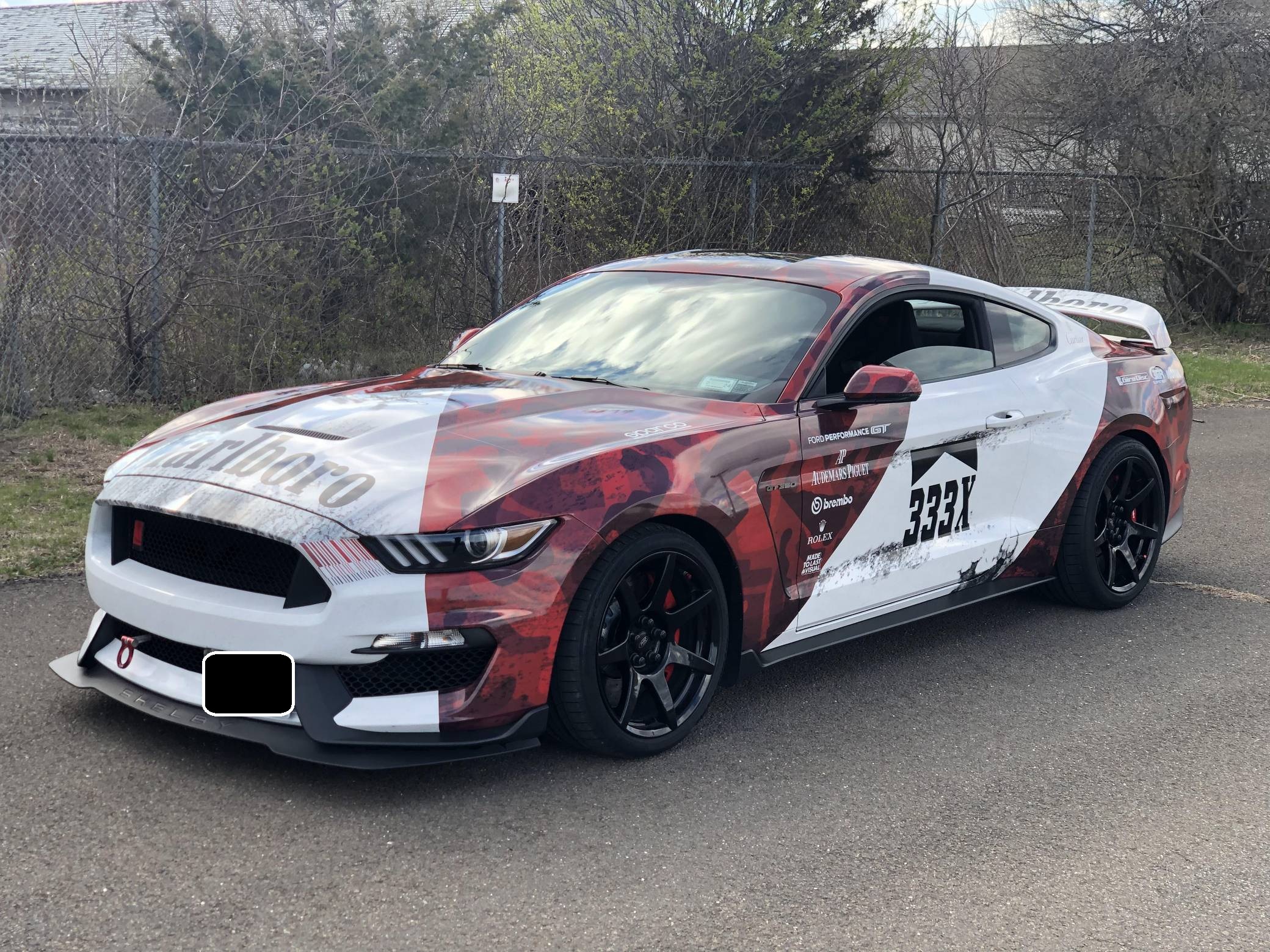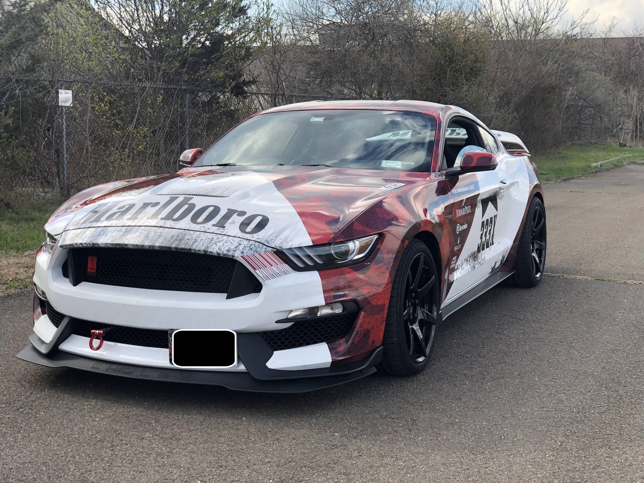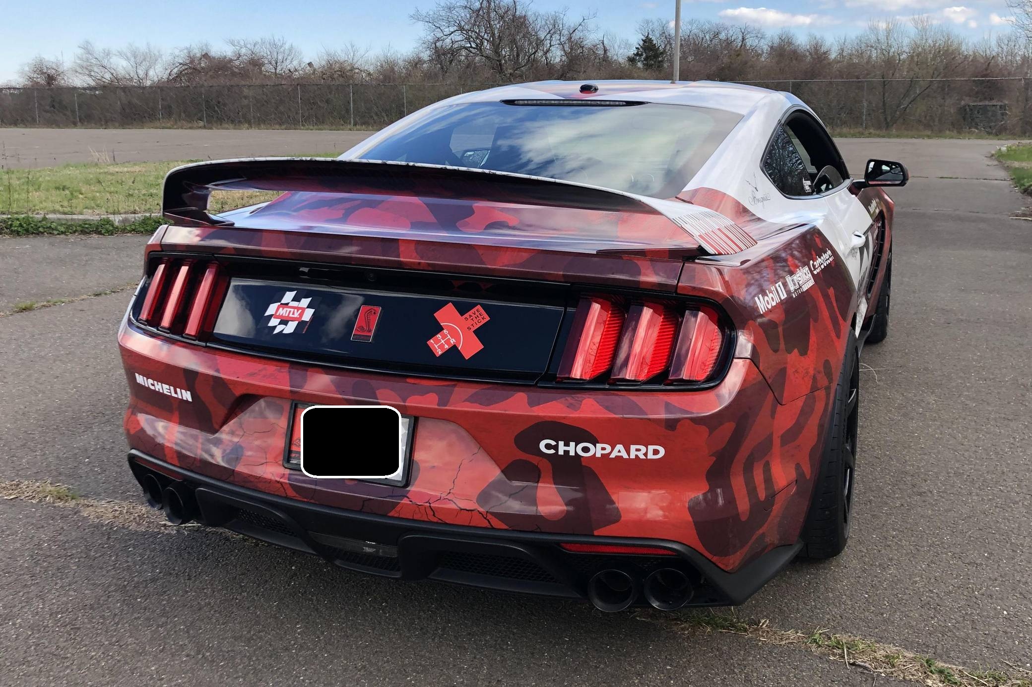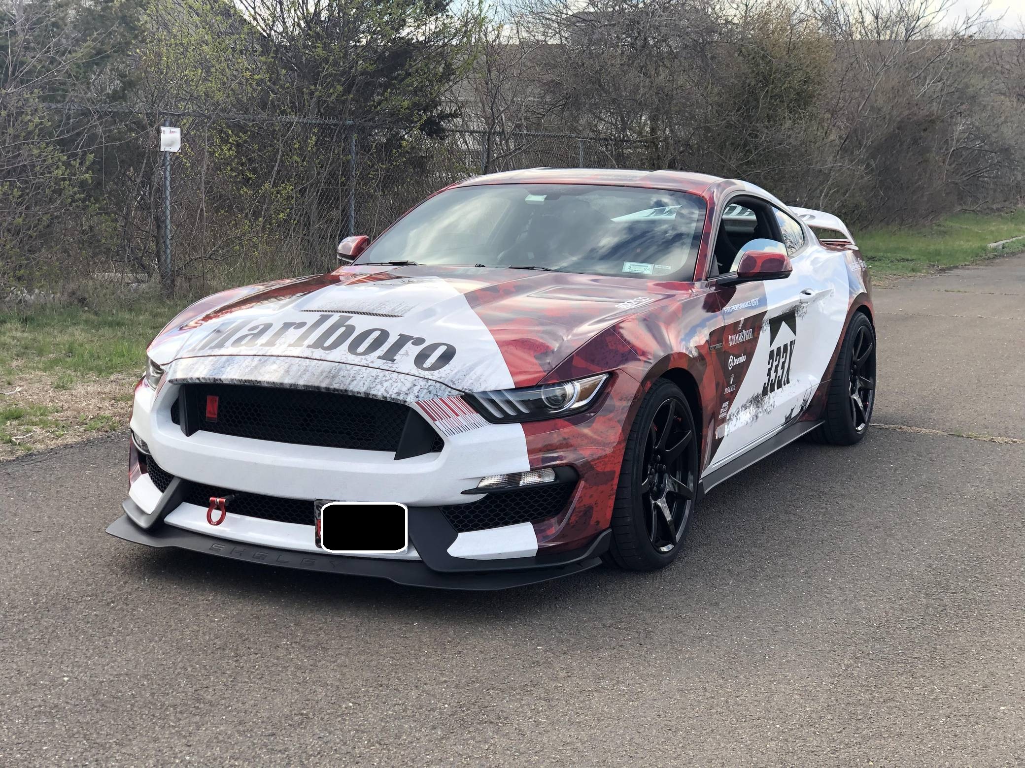 2018 Ford Mustang Shelby GT350R, finished in Shadow Black with a vinyl exterior wrap and an Ebony interior. A partial list of notable equipment includes Equipment Group 920A, the R-Electronics Package, a Torsen rear differential, Magneride adjustable dampers, Brembo brakes, Recaro sport seats, an Alcantara steering wheel, and more as detailed below. The seller reports modifying this Mustang to enhance its performance on the track. Some of these modifications include a Steeda linear clutch spring, a BMR subframe brace, an MGW short-shifter, Ford Performance lowering springs, Vorshlag front camber plates and billet aluminum end links, a Brey-Krause harness bar, Schroth 4-point ASM harnesses, and a vinyl wrap inspired by liveries from past Ferrari F1 cars. The Shelby GT350R variant of the "S550" Ford Mustang is a track-focused performance car benchmarked against competitors like the Chevrolet Camaro Z/28 and the Porsche 911 GT3. Compared to the standard GT350, it has improved grip, less weight, a more aggressive aerodynamic body kit, and it's the first mass-produced road car to come stock with carbon fiber wheels, resulting in a highly competent muscle car for the track. Power for the Shelby GT350R comes from a flat-plane-crank "Voodoo" 5. 2-liter V8 engine, rated at 526 horsepower and 429 lb-ft of torque. Output is sent to the rear wheels via a 6-speed manual transmission.