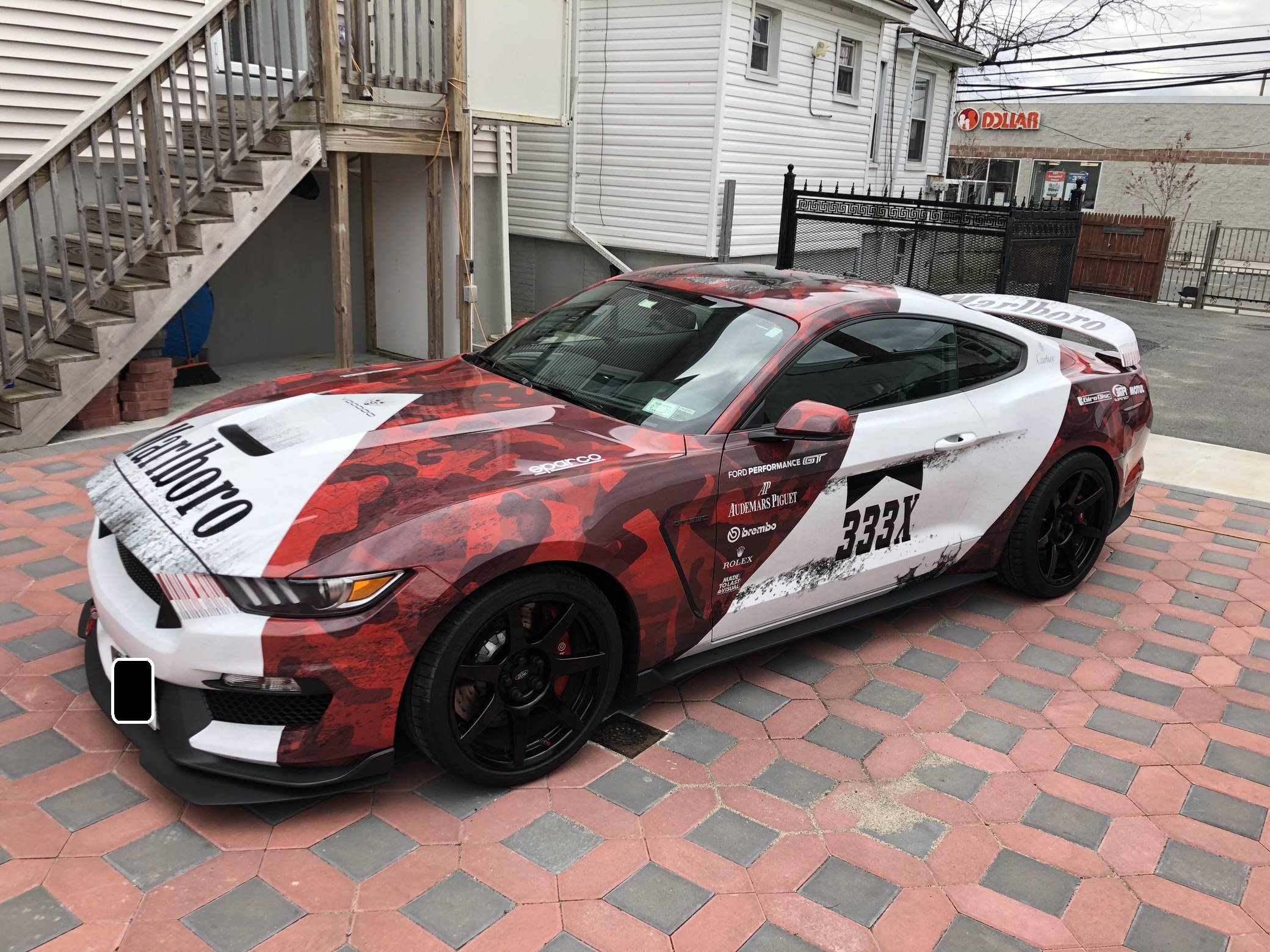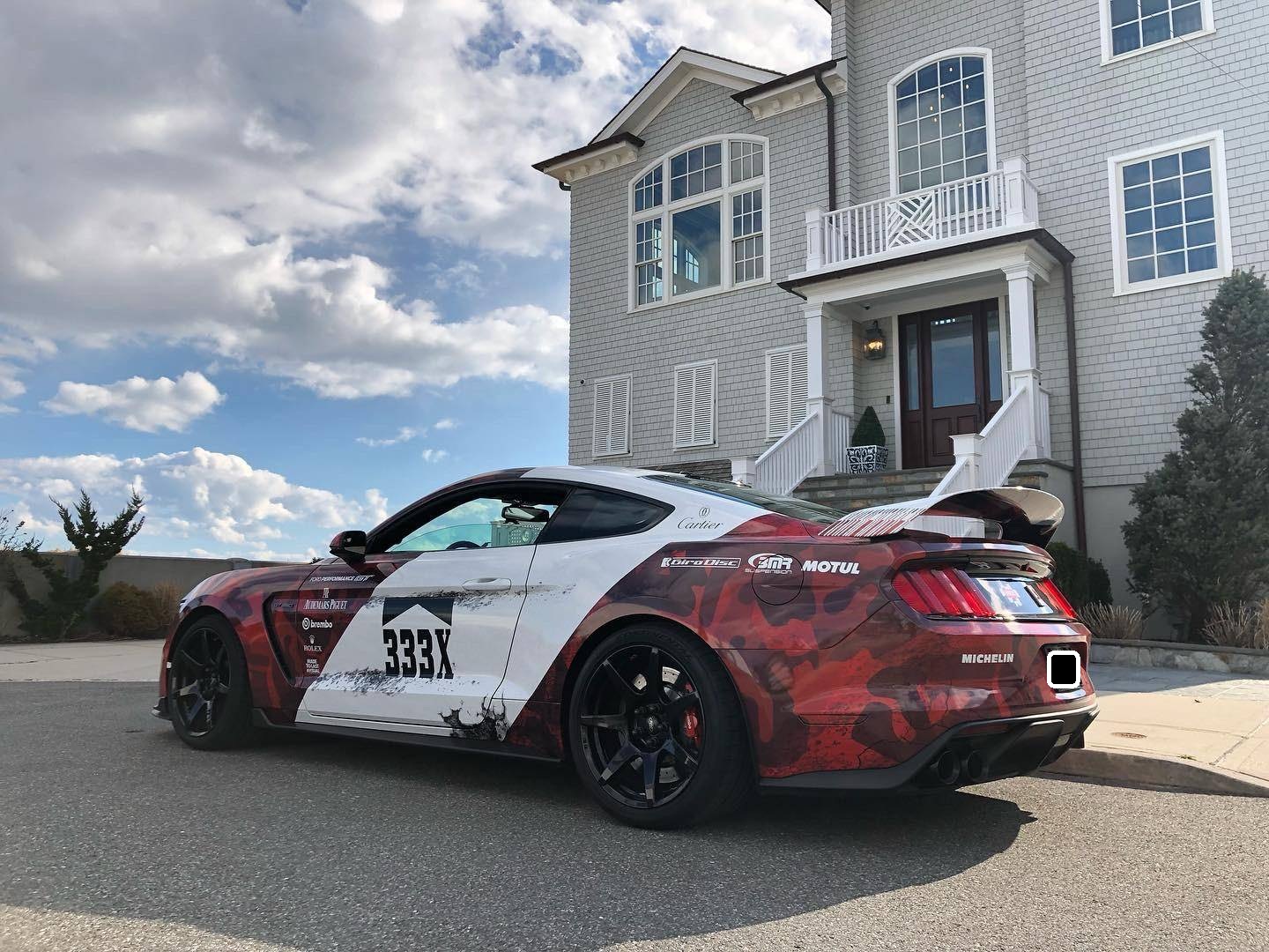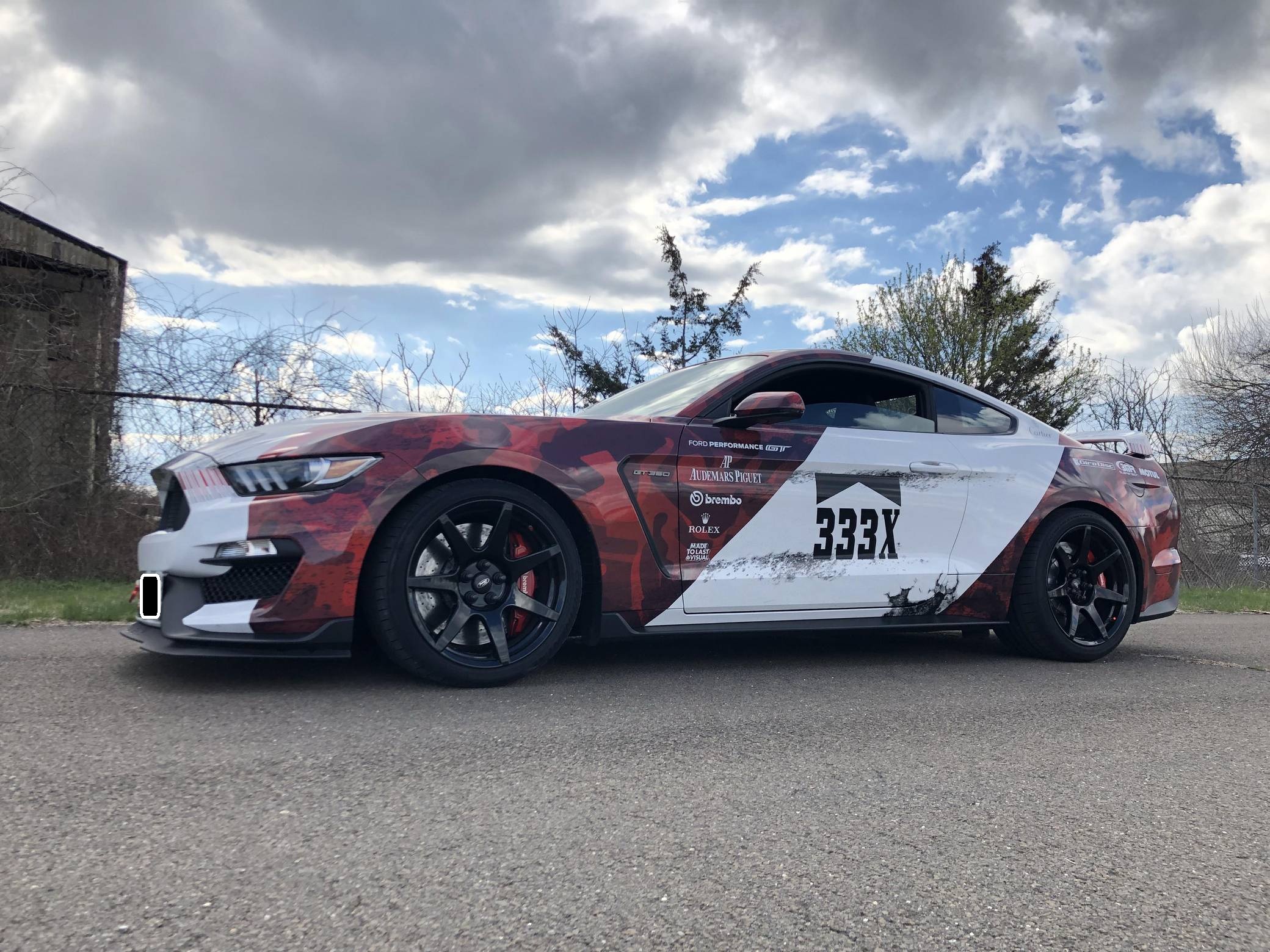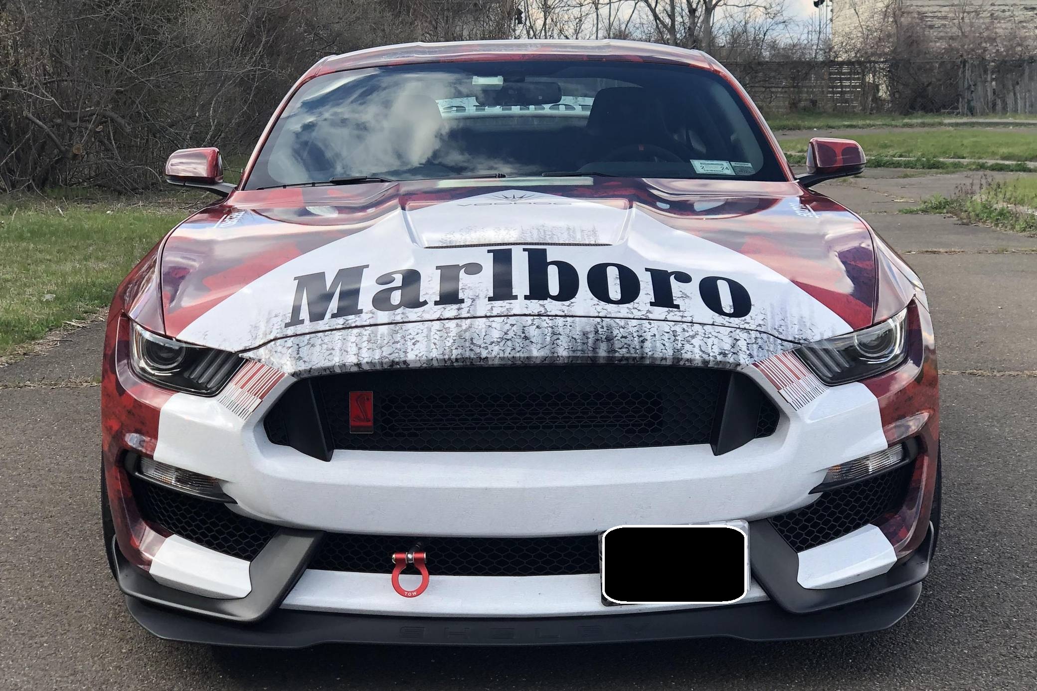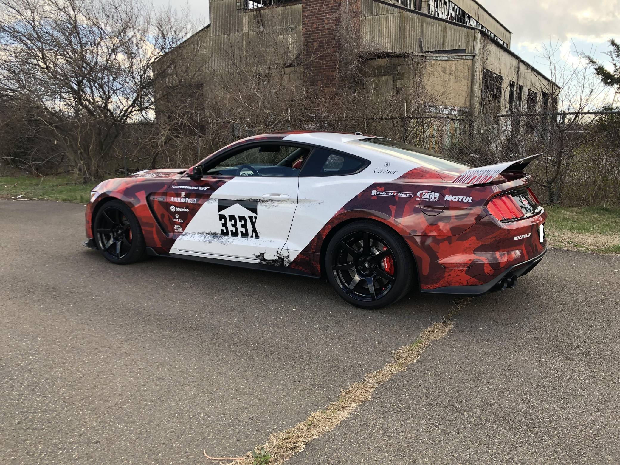 2018 Ford Mustang Shelby GT350R, finished in Shadow Black with a vinyl exterior wrap and an Ebony interior. A partial list of notable equipment includes Equipment Group 920A, the R-Electronics Package, a Torsen rear differential, Magneride adjustable dampers, Brembo brakes, Recaro sport seats, an Alcantara steering wheel, and more as detailed below. The seller reports modifying this Mustang to enhance its performance on the track. Some of these modifications include a Steeda linear clutch spring, a BMR subframe brace, an MGW short-shifter, Ford Performance lowering springs, Vorshlag front camber plates and billet aluminum end links, a Brey-Krause harness bar, Schroth 4-point ASM harnesses, and a vinyl wrap inspired by liveries from past Ferrari F1 cars. The Shelby GT350R variant of the "S550" Ford Mustang is a track-focused performance car benchmarked against competitors like the Chevrolet Camaro Z/28 and the Porsche 911 GT3. Compared to the standard GT350, it has improved grip, less weight, a more aggressive aerodynamic body kit, and it's the first mass-produced road car to come stock with carbon fiber wheels, resulting in a highly competent muscle car for the track. Power for the Shelby GT350R comes from a flat-plane-crank "Voodoo" 5. 2-liter V8 engine, rated at 526 horsepower and 429 lb-ft of torque. Output is sent to the rear wheels via a 6-speed manual transmission.