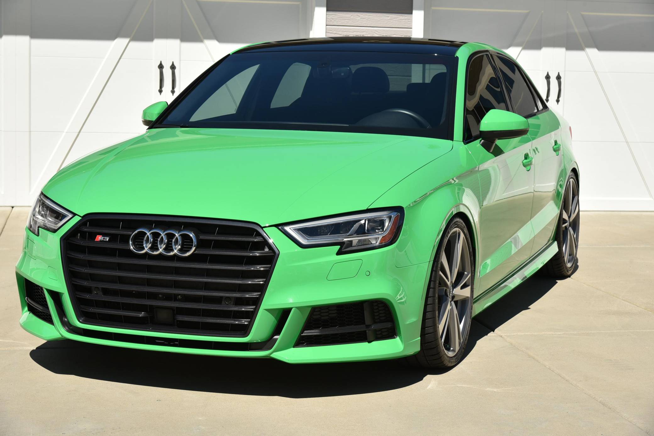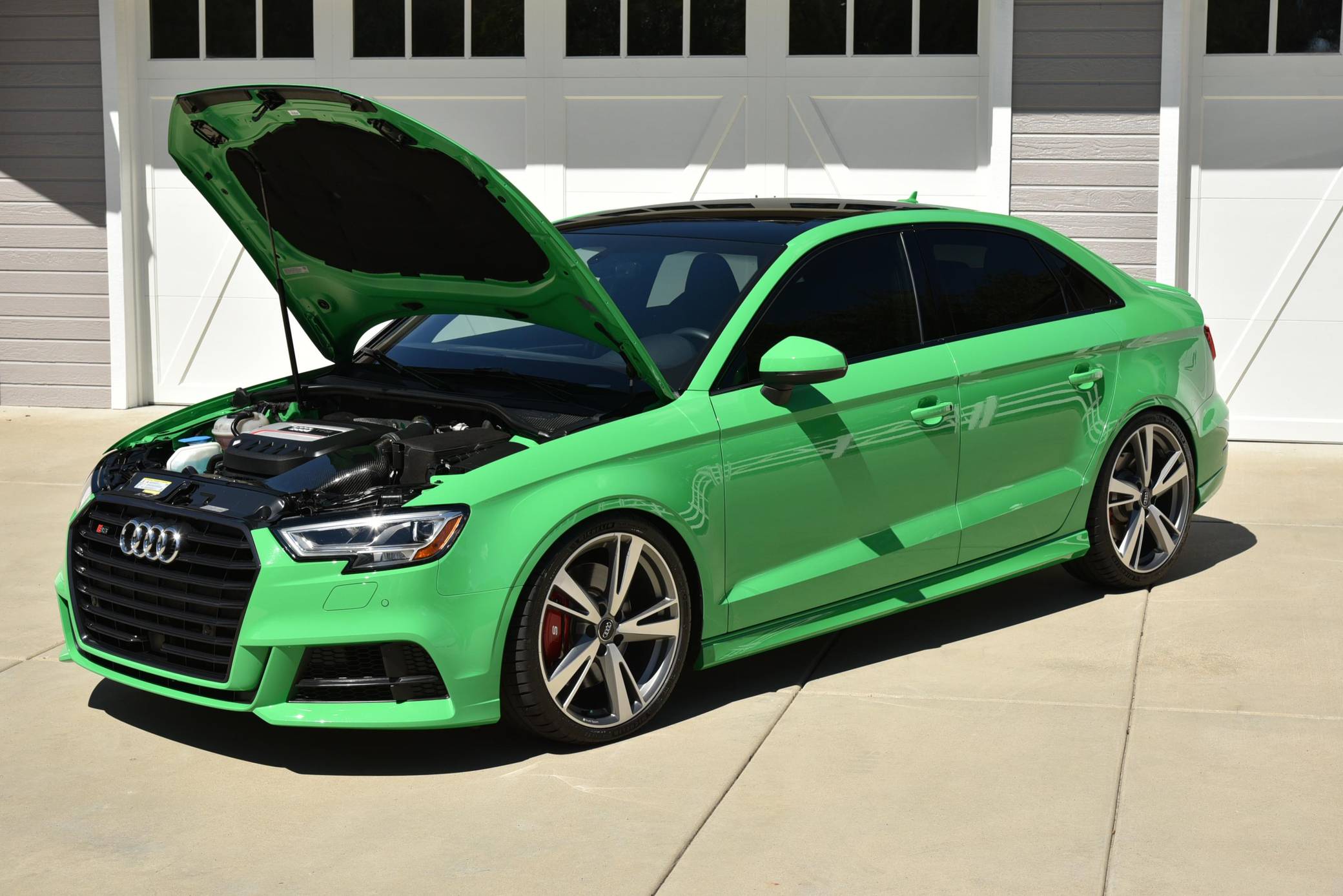 THIS… is a 2018 Audi S3, finished in Audi Exclusive Porsche Green with a black interior. The odometer on this S3 currently displays approximately 26,500 miles. A partial list of other notable features includes full LED headlights, a power-operated panoramic sunroof, brushed aluminum inlays, and more as detailed below. Performance modifications reported by the seller include a CTS Turbo cat-back exhaust system and intercooler, an Integrated Engineering cold air intake and turbo inlet pipe, H&R Super Sport lowering springs, and a Superpro USA sway bar and end links. An email from Audi USA included in the gallery indicates that this is 1 of 4 S3s built in 2018 finished in Audi Exclusive Porsche Green (paint code 2D8). Audi positioned the first-generation A3 Sedan at the bottom of its American range for the 2015 model year, and it simultaneously released the S3 as a sportier alternative. Built on the versatile MQB platform, both models offered the luxury, sharp styling, and performance that Audi is known for in a package that was smaller and more affordable than the A4. Power comes from a 2. 0-liter turbocharged inline-4, rated at 292 horsepower and 280 lb-ft of torque in stock form. Due to the modifications performed to this S3, it likely produces more power, but a dyno sheet was not provided to confirm. Output is sent to all 4 wheels via a 7-speed dual-clutch automatic transmission and Audi's Quattro permanent all-wheel-drive system.