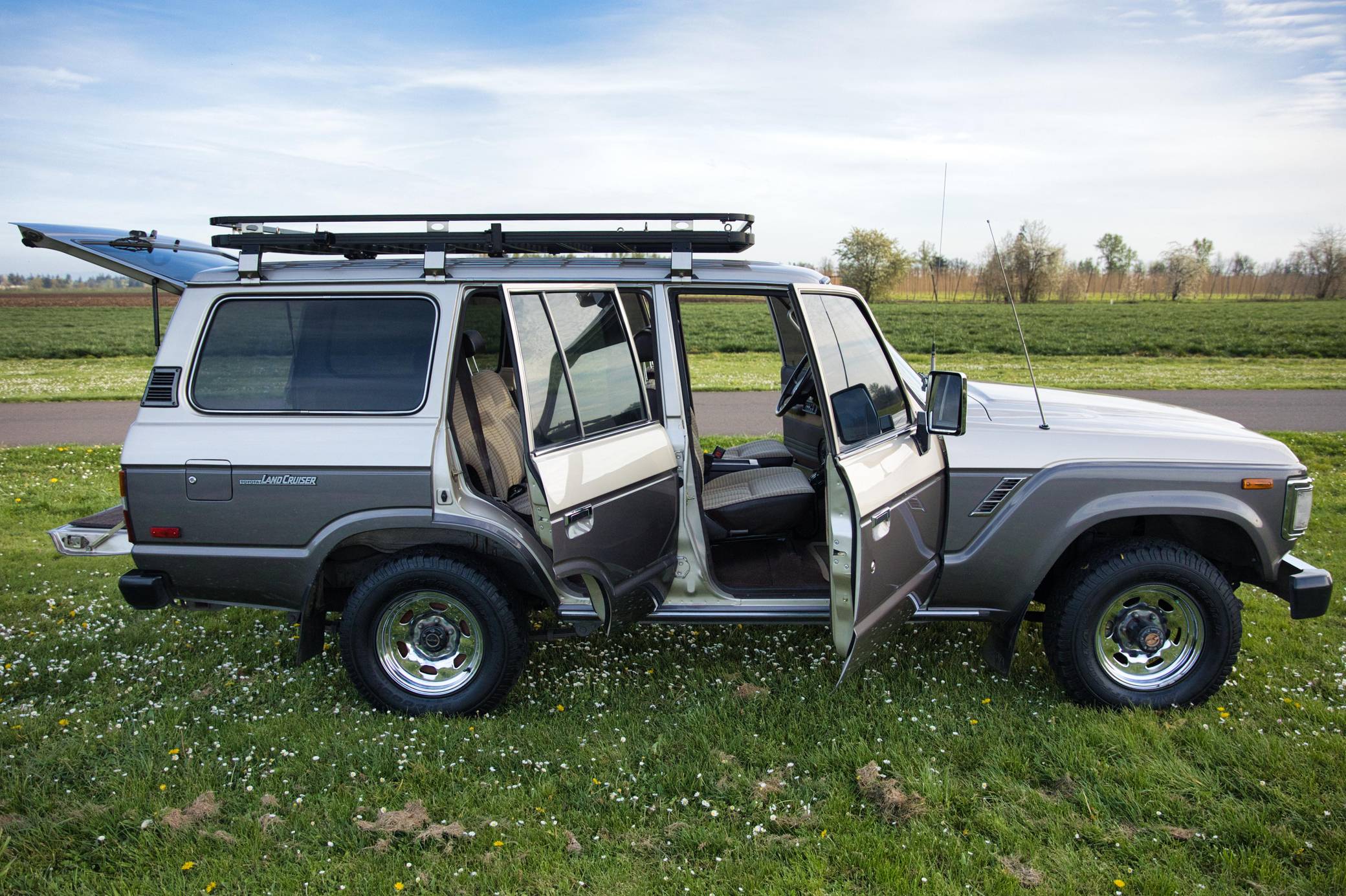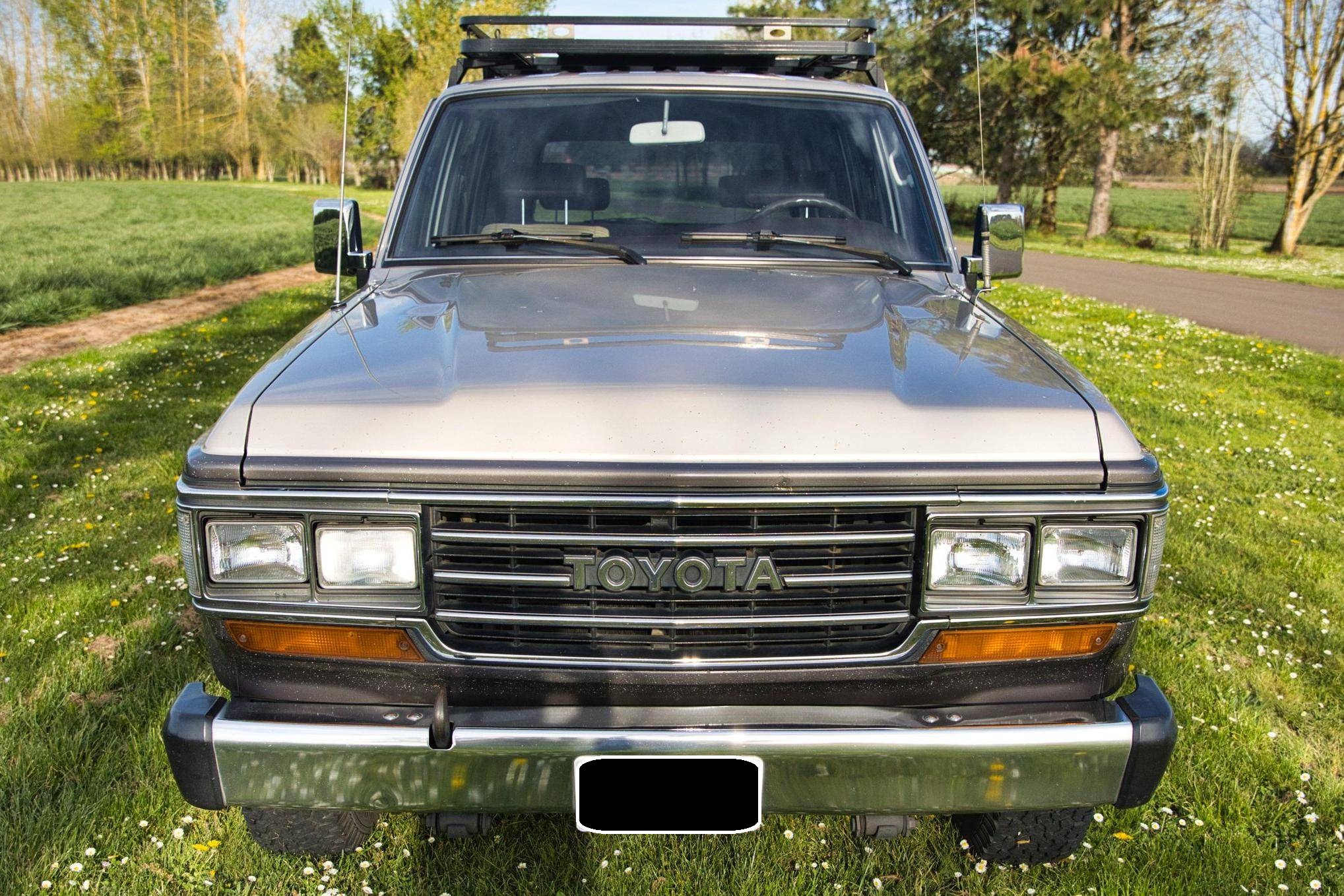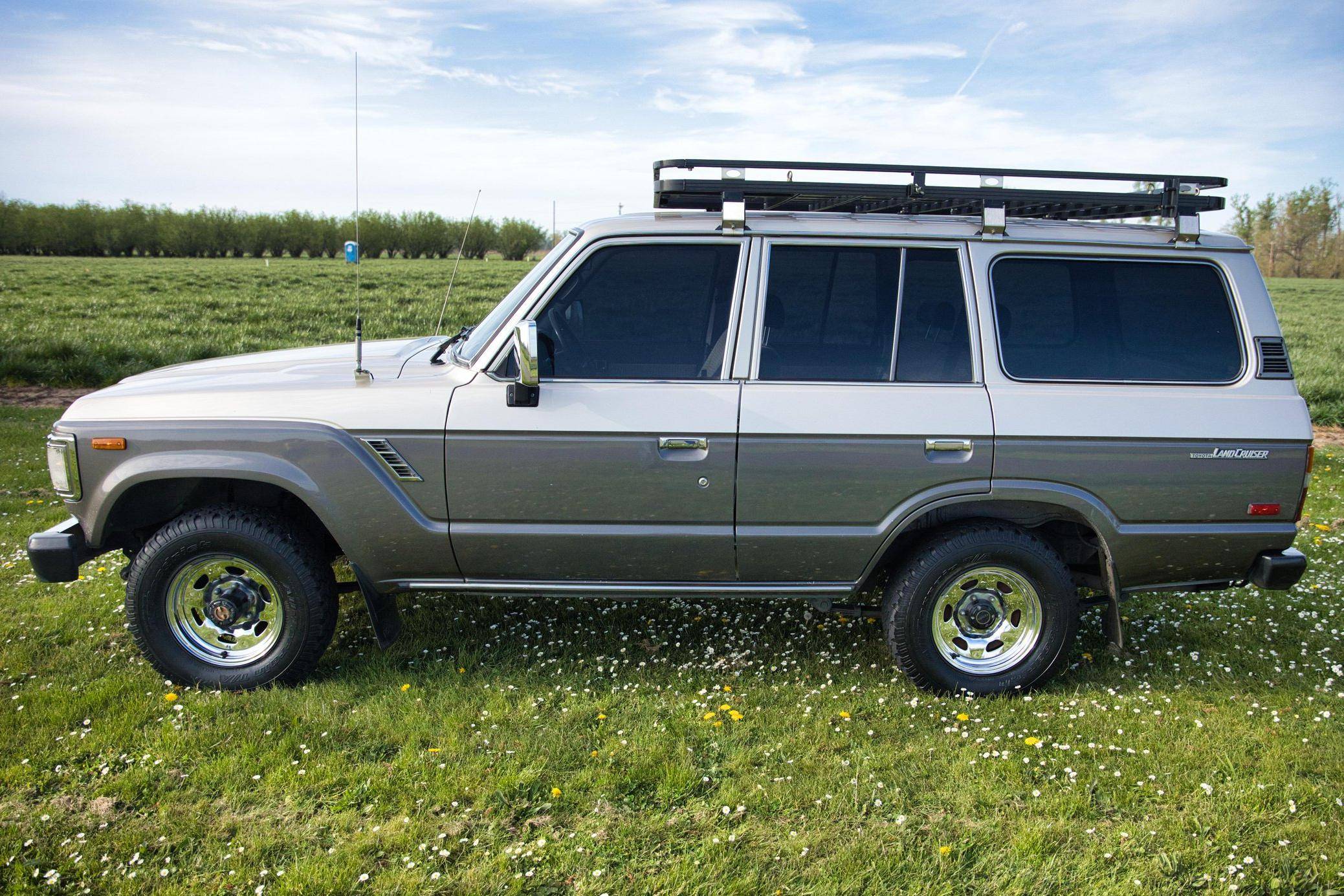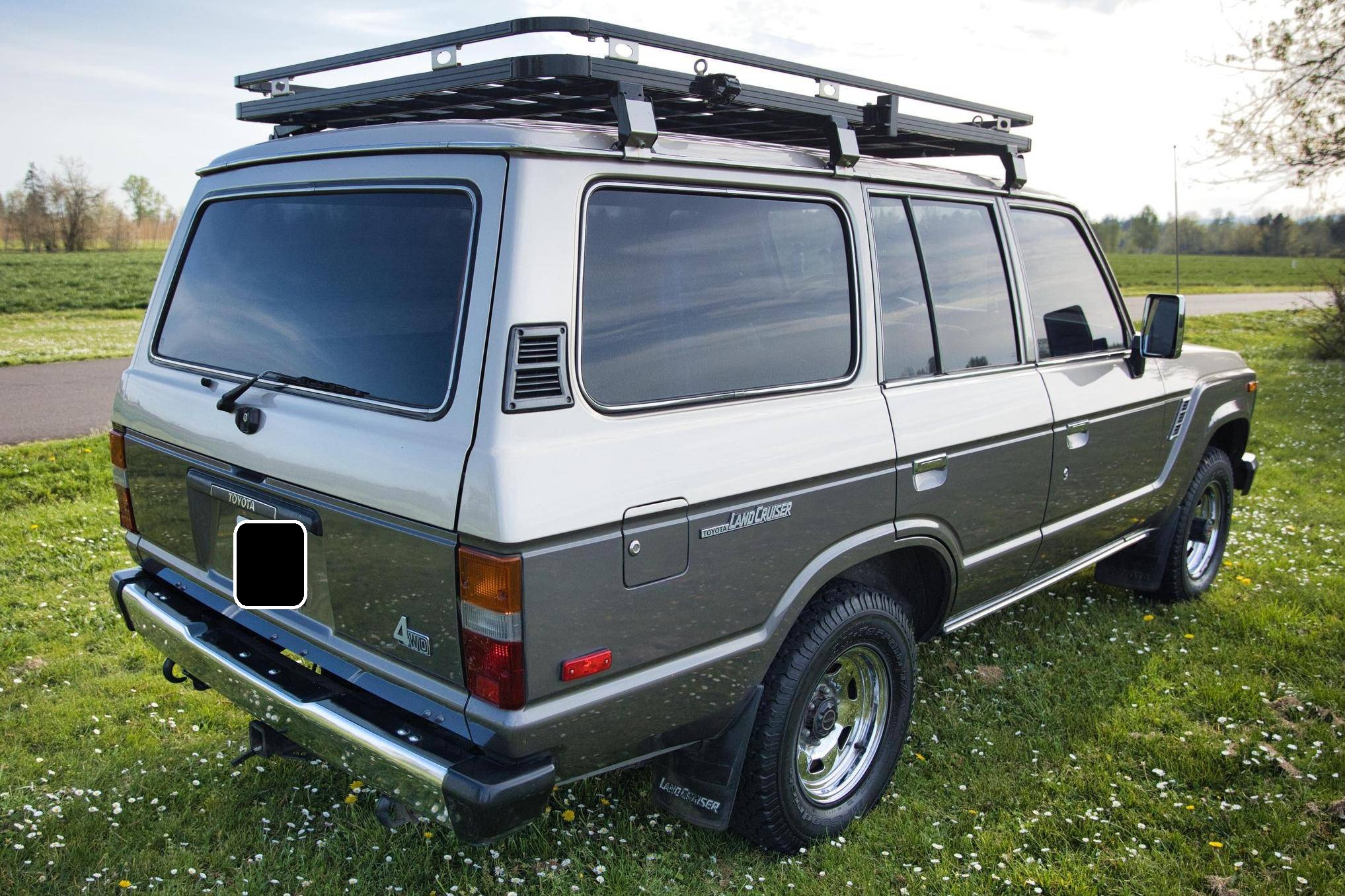 1990 Toyota Land Cruiser, finished in two-tone Metallic Beige and Metallic Gray with a tan interior. Equipment includes 15-inch wheels, manually-locking front hubs, cloth upholstery, a split rear hatch, air conditioning, rear heat, power door locks, exterior mirrors, and windows, and more as detailed below. A partial list of modifications reported by the seller includes an aluminum roof rack with attachment points for recovery gear, a 2-inch towing receiver, 3M window tint, an aftermarket CD stereo and front door speakers, and an Accel ignition system. The 60-Series was Toyota's second generation of Land Cruiser station wagon and was intended to be more comfortable than the earlier FJ55 models while retaining the Land Cruiser's traditional off-road capabilities. The FJ62 succeeded the FJ60 model and was produced from 1988 to 1990 before being replaced by the 80-Series Land Cruiser. Power comes from a fuel-injected "3F-E" 4. 0-liter inline-6, rated at 155 horsepower and 220 lb-ft of torque. Output is sent to the rear or all four wheels through a 4-speed automatic transmission and 2-speed transfer case.